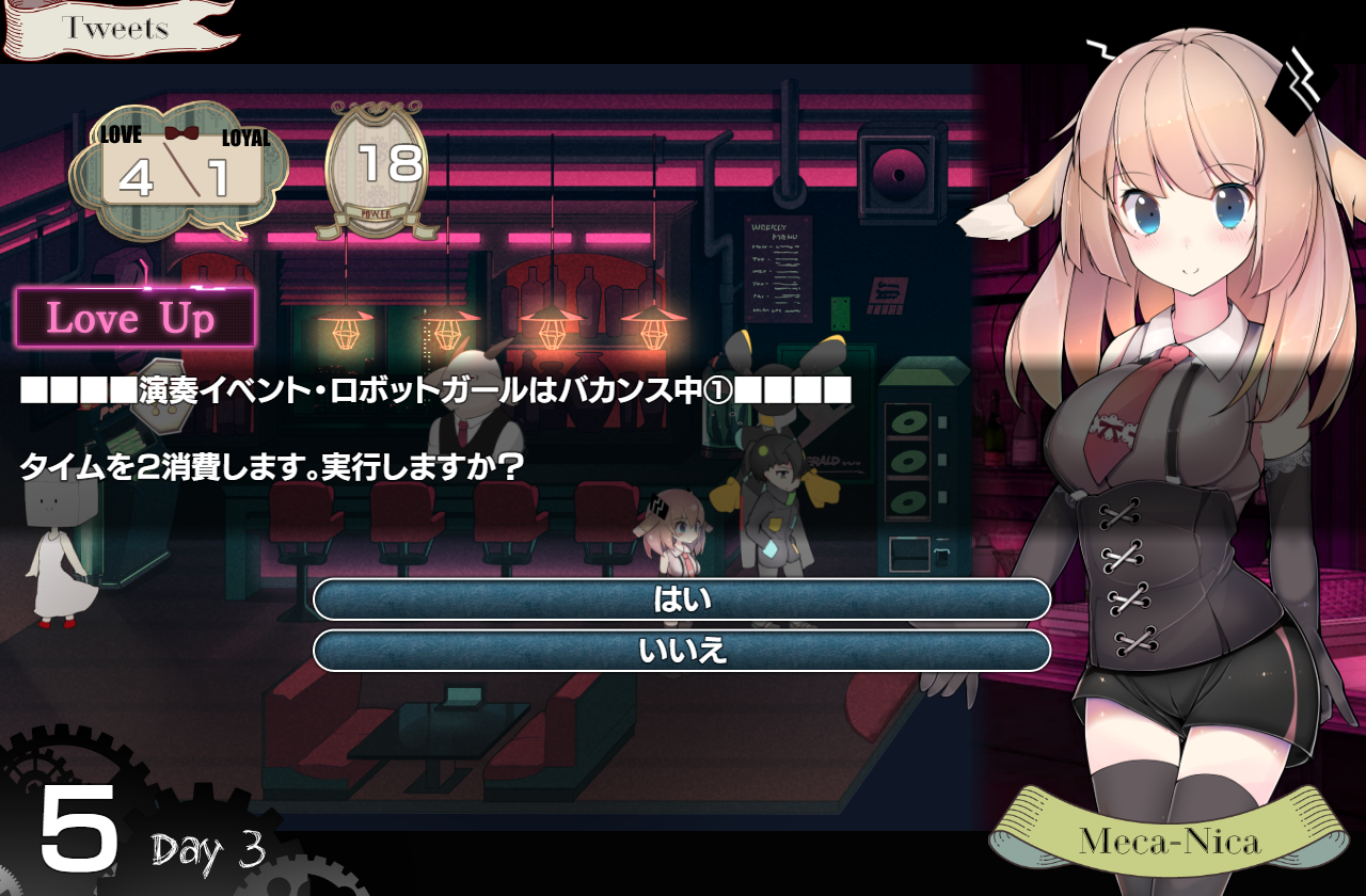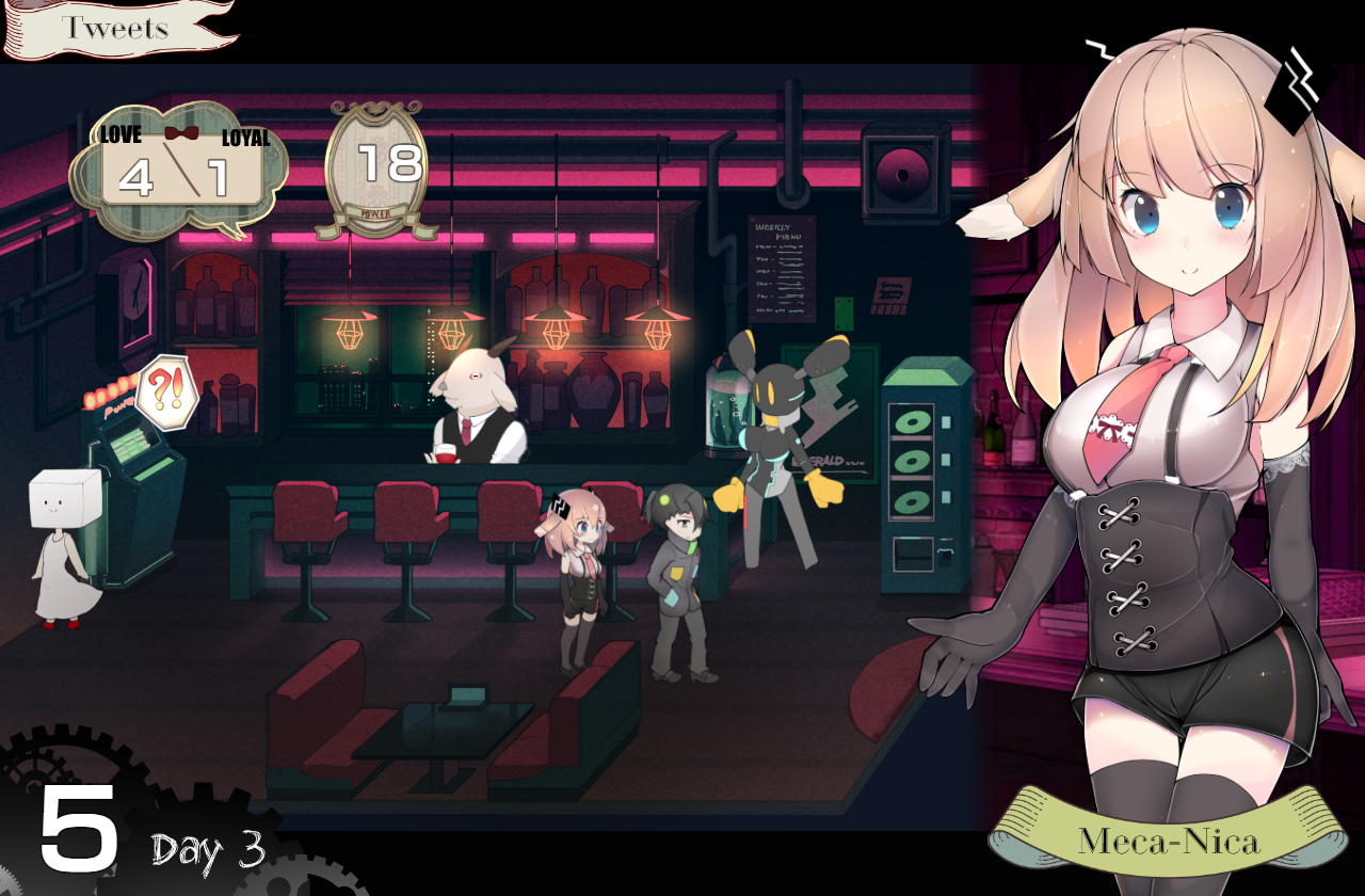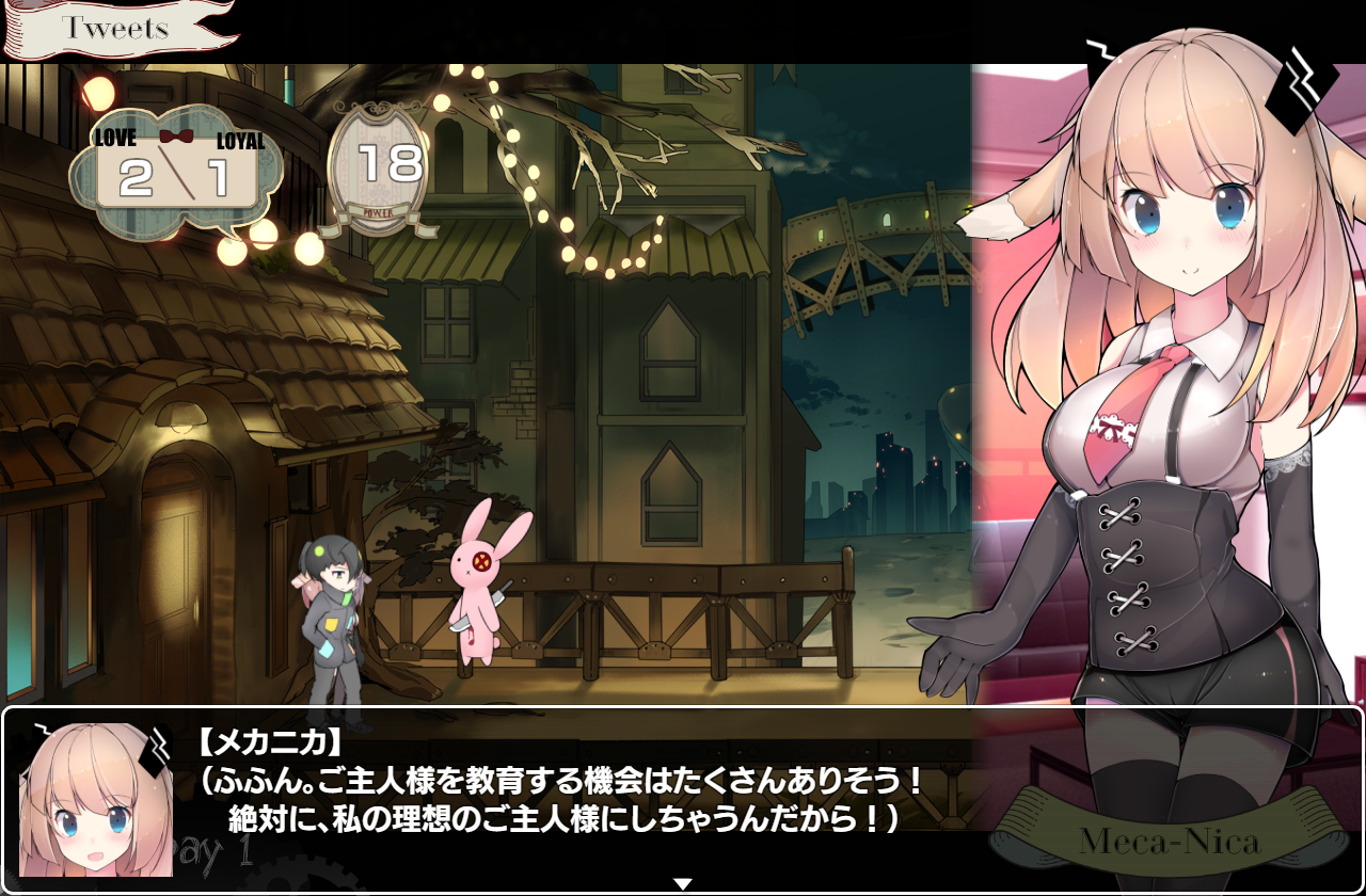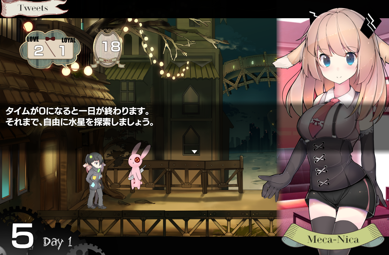 영문 모를 곳에서 부터 시작합니다성에가서 왕과 대화하면뜬금 게임 시작가챠에서 뽑아온 초고성능 안드로이도 메카니카입니다길막하는 사람을치워주고이곳 저곳 구경합시다상점도 구경포탈을 타고 이곳 저곳 놀러 갈 수 있습니다서브씬을 볼 수 있는 지식을 얻을 수 있습니다이 마을의 명물 인과시계입니다 과학으로 속칭 신을 물리치고 많은 미래를 만들었다는 군요안쪽에는 일에 대한 튜토리얼 입니다악기는 팔아버려서 메카니카가 악기가 됩니다연출모드에 대한 설명숫자만큼 악기를 칠때마다 파워가 소모됩니다악보의 좌상의 숫자가 코스트고 4개의 음으로 코스트를 맞추면 해당 음악이 흘러나옵니다고객이 편안하게 있을 수 있도록 음악을 연주하랍니다가끔씩 직접적으로 알려주지만 대부분 저렇게 추상적이게 알려줍니다 따뜻함을 뜻하는 음악을 연주해줍시다올바른 음악을 연주해주면 됩니다다음은 겨울느낌이 나는 음악곡의 명 곡의 특성 곡의 설명 이 3개를 통해 고객이 원하는 음악을 유추해 내면 됩니다 이건 바로 겨울의 음악을 연주해줍시다성공적인 라이브였습니다주인공이 볼품없기에 메카니카가 더 좋은 주인님에게 가길 원했지만 메카니카는 주인을 자신에 맞게 교육시킬려고 합니다아무튼 선물도 받고옷은 평상복이 더 예쁘더군요호감도=최대충성심이랍니다나오면 인과계가 2로 줄어있습니다 은근 소름일단은 다음날이상의 주인님으로 만들려는 메카니카시간이 0이되면 강제종료1노래 첫날 여기에 러브굿이 있습니다 딱히 현재는 중요하진 않습니다대화하면먹을걸 줍니다1단계는 죽죽 다들 말을 걸어 줍시다포탈은 스토리진행과 관련은 없습니다호감도가 10이되면 오라는데 1회차에 3일안에 가능한진 모르겠네요카드키를 읽어버린 로봇펭귄은 퀴즈대결이 가능합니다여기를 구경하고 턴엔드시간과 호감도에 따라 서브이벤트도 일어납니다 엔간하면 자연스레 보게 되어있습니다추천하는 오므라이스를 먹었습니다일을 도와줘서 충성심을 회복한다던가 추억을 쌓을 수 있습니다시간을 소비하는데 각각 일정 호감도일때 이벤트가 있더군요 시간나면 봐줍시다이쪽에서배수구에서 카드키를 주울 수 있습니다 지금생각해보면 이런거 안하고 호감도만 올리면 가능도 해 보이네요아무튼 카드기획득심심하니 옆에도 말을 걸어 줍시다이 인연을 축복해줄 노래이걸 불러줍시다이분도 대화가 가능하더군요 초반 튜토리얼 말해주길래 아닌듯여기도 첨에 뭔가 의미심장한 말인줄 알았는데 전작이야기더군요 까먹어서 모른다고 답했습니다 ㅋㅋ죽 와서카드키를 주면다른 이벤트가 생깁니다 이런식으로 대략 3번정도 다들 가지고 있습니다메카니카의 새로운 친구를 축복하기 위한 노래이걸 불러 줍시다 아래쪽들은 보시면 속성이 두갠데 비용이 비싼만큼 다른 부가효과가 있더군요 전 비싸서 안했습니다포탈의 위치도 새로 생깁니다이건 시간을 써서 돈을 낚는건데 비추합니다포탈구경이전에 얻은 메이드력과 지식들을 소비해서 이런저런걸 얻을 수 있습니다상점은 일단 휴대전화는 꼭 사줘야 합니다추억도 잘 쌓아줍시다 이거 귀찮다고 안했는데 이벤트를 해금할려면 꼭 해야하더군요시간은 소비가 안되지만 충성심을 회복하는 이벤트가 많기 때문에 사용한뒤 이벤트를 봅시다수성의 3일째의 마지막날 하늘에서 건물들이 쏟아져 내리며 수성을 종말을 맞이 합니다영문모를 사망 후 영문모를 곳죽 따라갑시다나와서 성으로 들어가면 다시 원상복귀이상한 꿈을 꾸었다고 생각하는 메카니카하지만 사실은 3일간동안 타임루프를 하는 것이였습니다나가서바로가면마스터대신 스즈키가 있습니다이곳 저곳 둘러보면서 모두와 대화를 합시다켈피에겐 우리가 지금 타임루프를 하고 있다고 이야기해 줍니다 다행히 기록은 되어있다는 군요다 둘러보았다면 탐정사무소로 갑시다대화알고보니 전작에 나오신분우리들이 탐정이 되어서 누군가가 이 우주를 멸망시키려는 것을 막아야 합니다믿어줍시다대충 공략들을 알려줍니다일단 진짜로 수성이 멸망하는지 확인하자고 합니다할 것도 없으니 이곳저곳 정보를 모아줍시다여기도 정보를 얻어줍시다고민거리가 있으신분에게이노래를 선물을 해줍시다이렇게 정보를 얻을 수 있습니다이미 보았던 이벤트는 타임과 파워를 소비해서 넘길 수 있습니다 넘기는게 이득입니다다음날부터 아침마다 음악을 바꿔 틀 수 있습니다종류는 3개이며 3곡다 나오는 주민들이 다릅니다이렇게 다릅니다주위를 둘러보죠이분에겐이 노래를 선물로특제단팥빵을 얻습니다이분은헛소리를 하니 누군가 끼어듭니다일단 이게임의 목표는 범행방법 범인 동기를 찾아 밝혀내는 것 입니다전작은 기억안나서 모른다고한 ㅋㅋ