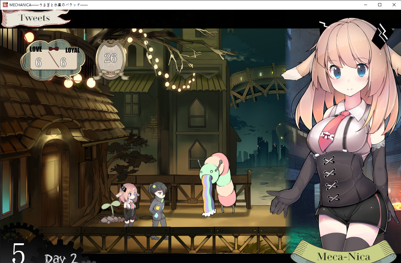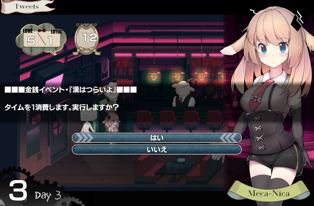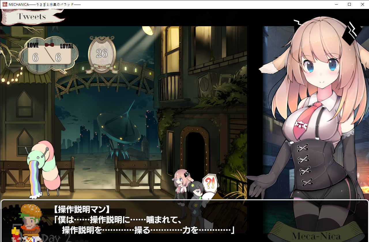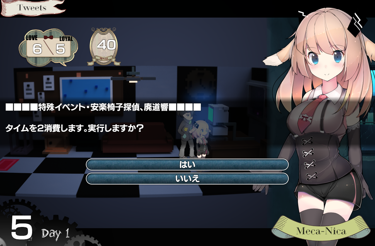 영문 모를 곳에서 부터 시작합니다성에가서 왕과 대화하면뜬금 게임 시작가챠에서 뽑아온 초고성능 안드로이도 메카니카입니다길막하는 사람을치워주고이곳 저곳 구경합시다상점도 구경포탈을 타고 이곳 저곳 놀러 갈 수 있습니다서브씬을 볼 수 있는 지식을 얻을 수 있습니다이 마을의 명물 인과시계입니다 과학으로 속칭 신을 물리치고 많은 미래를 만들었다는 군요안쪽에는 일에 대한 튜토리얼 입니다악기는 팔아버려서 메카니카가 악기가 됩니다연출모드에 대한 설명숫자만큼 악기를 칠때마다 파워가 소모됩니다악보의 좌상의 숫자가 코스트고 4개의 음으로 코스트를 맞추면 해당 음악이 흘러나옵니다고객이 편안하게 있을 수 있도록 음악을 연주하랍니다가끔씩 직접적으로 알려주지만 대부분 저렇게 추상적이게 알려줍니다 따뜻함을 뜻하는 음악을 연주해줍시다올바른 음악을 연주해주면 됩니다다음은 겨울느낌이 나는 음악곡의 명 곡의 특성 곡의 설명 이 3개를 통해 고객이 원하는 음악을 유추해 내면 됩니다 이건 바로 겨울의 음악을 연주해줍시다성공적인 라이브였습니다주인공이 볼품없기에 메카니카가 더 좋은 주인님에게 가길 원했지만 메카니카는 주인을 자신에 맞게 교육시킬려고 합니다아무튼 선물도 받고옷은 평상복이 더 예쁘더군요호감도=최대충성심이랍니다나오면 인과계가 2로 줄어있습니다 은근 소름일단은 다음날이상의 주인님으로 만들려는 메카니카시간이 0이되면 강제종료1노래 첫날 여기에 러브굿이 있습니다 딱히 현재는 중요하진 않습니다대화하면먹을걸 줍니다1단계는 죽죽 다들 말을 걸어 줍시다포탈은 스토리진행과 관련은 없습니다호감도가 10이되면 오라는데 1회차에 3일안에 가능한진 모르겠네요카드키를 읽어버린 로봇펭귄은 퀴즈대결이 가능합니다여기를 구경하고 턴엔드시간과 호감도에 따라 서브이벤트도 일어납니다 엔간하면 자연스레 보게 되어있습니다추천하는 오므라이스를 먹었습니다일을 도와줘서 충성심을 회복한다던가 추억을 쌓을 수 있습니다시간을 소비하는데 각각 일정 호감도일때 이벤트가 있더군요 시간나면 봐줍시다이쪽에서배수구에서 카드키를 주울 수 있습니다 지금생각해보면 이런거 안하고 호감도만 올리면 가능도 해 보이네요아무튼 카드기획득심심하니 옆에도 말을 걸어 줍시다이 인연을 축복해줄 노래이걸 불러줍시다이분도 대화가 가능하더군요 초반 튜토리얼 말해주길래 아닌듯여기도 첨에 뭔가 의미심장한 말인줄 알았는데 전작이야기더군요 까먹어서 모른다고 답했습니다 ㅋㅋ죽 와서카드키를 주면다른 이벤트가 생깁니다 이런식으로 대략 3번정도 다들 가지고 있습니다메카니카의 새로운 친구를 축복하기 위한 노래이걸 불러 줍시다 아래쪽들은 보시면 속성이 두갠데 비용이 비싼만큼 다른 부가효과가 있더군요 전 비싸서 안했습니다포탈의 위치도 새로 생깁니다이건 시간을 써서 돈을 낚는건데 비추합니다포탈구경이전에 얻은 메이드력과 지식들을 소비해서 이런저런걸 얻을 수 있습니다상점은 일단 휴대전화는 꼭 사줘야 합니다추억도 잘 쌓아줍시다 이거 귀찮다고 안했는데 이벤트를 해금할려면 꼭 해야하더군요시간은 소비가 안되지만 충성심을 회복하는 이벤트가 많기 때문에 사용한뒤 이벤트를 봅시다수성의 3일째의 마지막날 하늘에서 건물들이 쏟아져 내리며 수성을 종말을 맞이 합니다영문모를 사망 후 영문모를 곳죽 따라갑시다나와서 성으로 들어가면 다시 원상복귀이상한 꿈을 꾸었다고 생각하는 메카니카하지만 사실은 3일간동안 타임루프를 하는 것이였습니다나가서바로가면마스터대신 스즈키가 있습니다이곳 저곳 둘러보면서 모두와 대화를 합시다켈피에겐 우리가 지금 타임루프를 하고 있다고 이야기해 줍니다 다행히 기록은 되어있다는 군요다 둘러보았다면 탐정사무소로 갑시다대화알고보니 전작에 나오신분우리들이 탐정이 되어서 누군가가 이 우주를 멸망시키려는 것을 막아야 합니다믿어줍시다대충 공략들을 알려줍니다일단 진짜로 수성이 멸망하는지 확인하자고 합니다할 것도 없으니 이곳저곳 정보를 모아줍시다여기도 정보를 얻어줍시다고민거리가 있으신분에게이노래를 선물을 해줍시다이렇게 정보를 얻을 수 있습니다이미 보았던 이벤트는 타임과 파워를 소비해서 넘길 수 있습니다 넘기는게 이득입니다다음날부터 아침마다 음악을 바꿔 틀 수 있습니다종류는 3개이며 3곡다 나오는 주민들이 다릅니다이렇게 다릅니다주위를 둘러보죠이분에겐이 노래를 선물로특제단팥빵을 얻습니다이분은헛소리를 하니 누군가 끼어듭니다일단 이게임의 목표는 범행방법 범인 동기를 찾아 밝혀내는 것 입니다전작은 기억안나서 모른다고한 ㅋㅋ