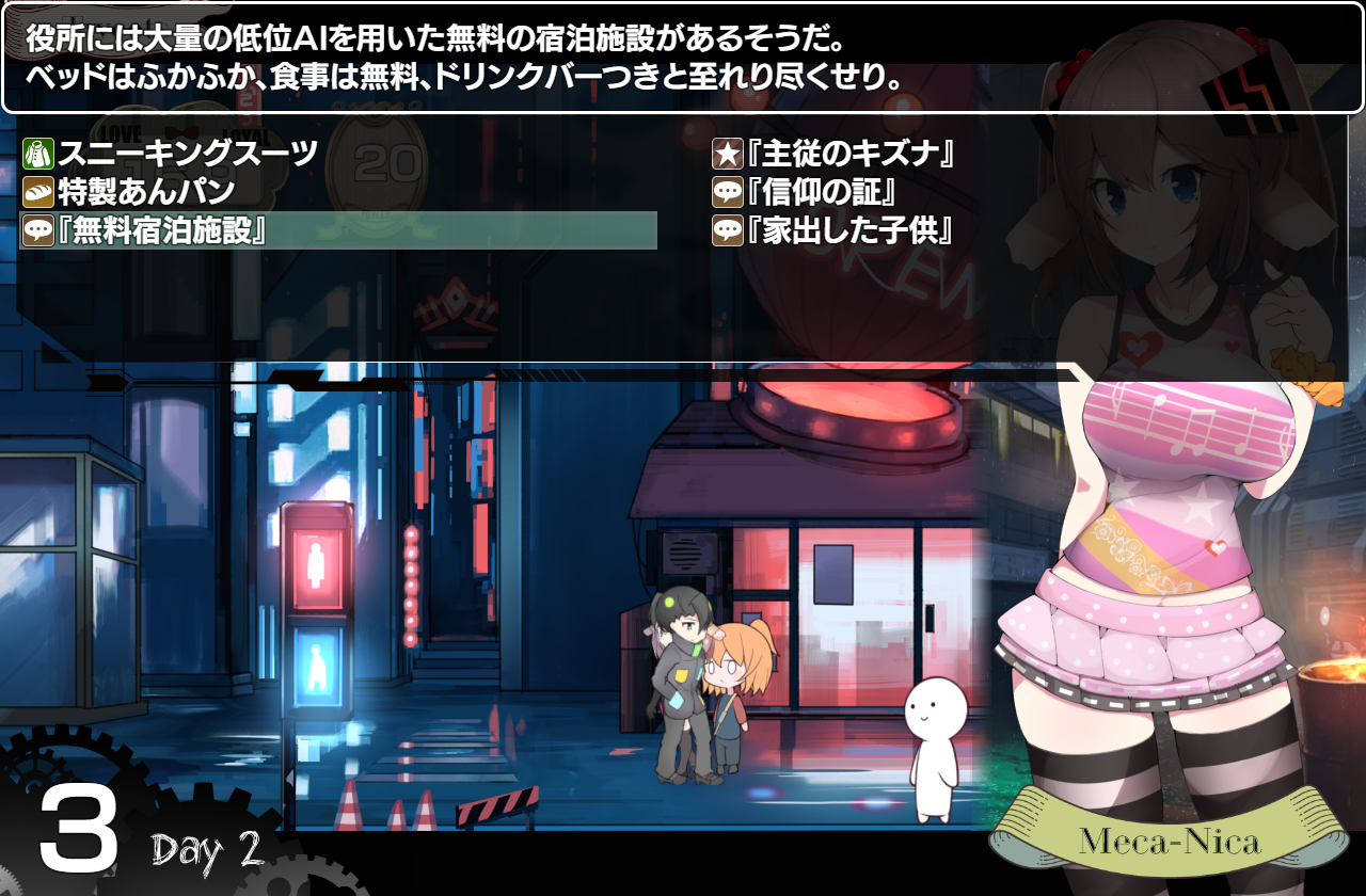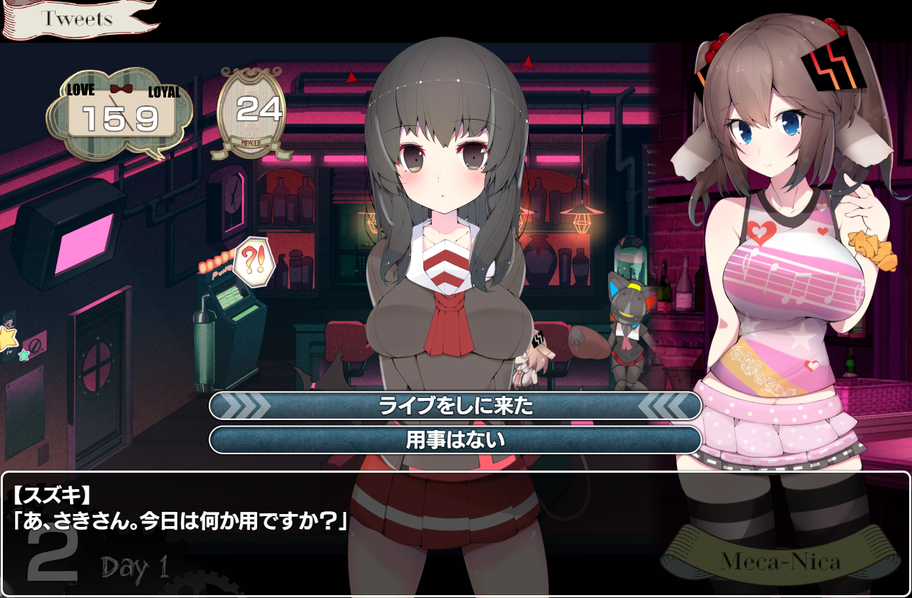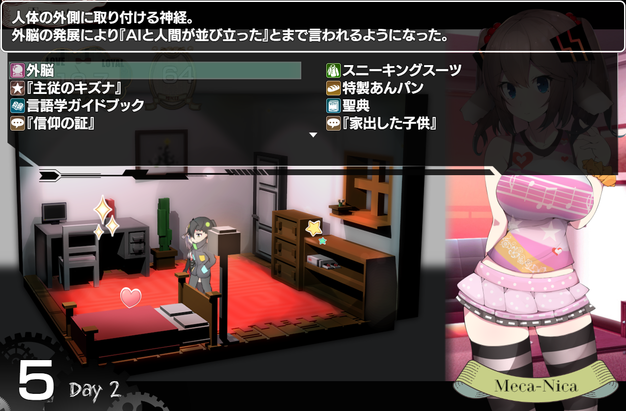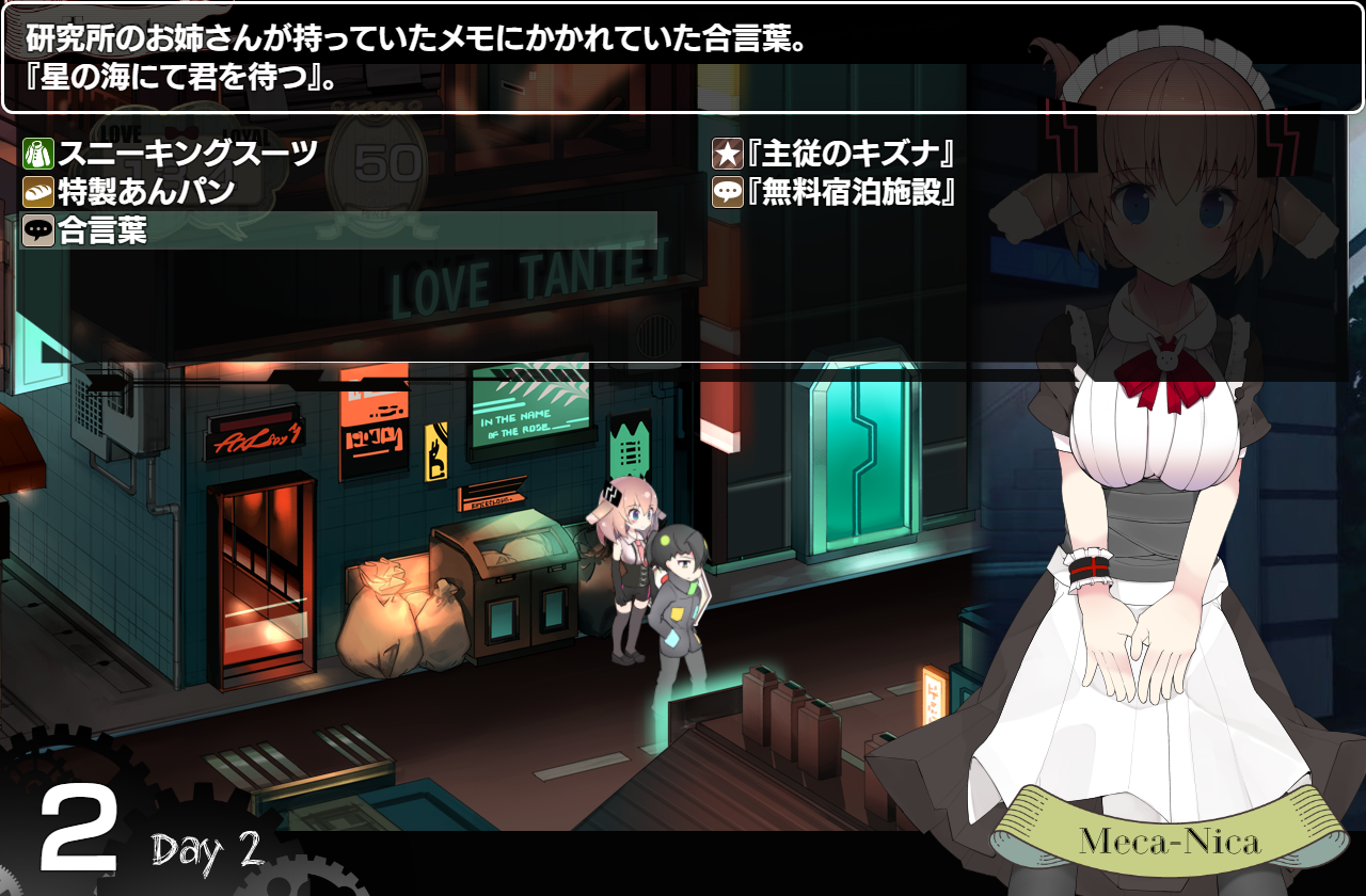 죽죽 들어가보니 러브굿이 있더군요기계머리의 정체를 알아야 대화가 가능하군요바도 이벤트가 있네요 스즈키 호감도 이벤트입니다바에서 공연이 가능해집니다해결하면 호감도도 오릅니다일단은 첫노래로 가겠습니다아까얻은아바타를 이용해 스토리를 진행했습니다노래는이걸 불러주었습니다두부들이 보여서 말을 걸어 봤더니다른 곳 부터 하고 오라는 군요바도 해줍시다이것공연료도 가끔 받습니다바의 왼쪽아래에서 어느날에 노래를 불렀는지 확인 할 수 있습니다처음에는 수성에 문제가 있는 줄 알았지만 여기서 다시 확인해 본 상태론 거대한 포탈을 이용해 이쪽을 공격한 것이였습니다다시 루프 EDM으로 시작했습니다이벤트 후 정보도 얻고여기도 이벤트러브굿은 당장은 대화할 필요는 없습니다이분은 외뇌를 모아오는 이벤트 입니다이곳에서 두부소녀와 갬블이 가능합니다일단 그전에 바에서 연주부터 했습니다 이 노래를 연주하면 됩니다다시 루프해서 갬블이건 다 정해져있으니 그냥 진 다음 상대의 패를 확인하고 다시 로드해서 플레이 하면 쉽습니다이기면 돈을 얻으니 유용하게 쓸 수 있습니다여기도 연주이걸 연주하면 됩니다EDM의 이곳에서 외뇌를 300엔에 살 수 있습니다나와서 이분에게이 노래를 연주해주고무료숙박시설의 정보를 얻습니다여기서이걸 말하면꼬마가 나옵니다연주는 이것누군가 연락할 방법돈이 없어 못산 휴대전화입니다꽃은 물을 주면 이곳저곳 이동해 있는데 졸졸 따라다니면서 물을 주면그냥 땅아래서 휴식을 취하고 있던 여자였습니다포탈연구자군요이번엔 하드보일드로따라가면 포탈추가이분은 아직은 못합니다두부에게선 갬블라이브도 다 해줍시다답은 아래쪽입니다뭔가 약간 기억은 남아있는듯한이분과도 이벤트이 노래를 연주해주면 됩니다 신앙의 증거획득이걸 사용해주면 됩니다 일단 시간이 넘어가기에 바에서 라이브부터 했습니다일단 더 들어가면 러브굿이 있고 아직은 이벤트 진행이 불가능 합니다라이브도 모아주고돌아와서 아까의 여행객에게이 노래를 연주해주면성전을 얻습니다3일째도 노래를 연주해줍시다다시 하드보일드척봐도 크툴루이신분과 이벤트를 봅시다노래는 이것외뇌를 주더군요다시 여기로 와서 증거를 주면시계를 러브굿의 부모가 만들었단걸 알게 됩니다템도 좀 사야되고 정보도 좀 사야됩니다500엔으로 샵 1000엔으로 전뢰를 살 수 있습니다말을걸고 부부를 제시하면정보를 하나 더 얻을 수 있습니다뭔가 숨기는게 있지만 아직은 밝혀낼 수 없습니다외뇌를 로봇에게 주도록 합시다