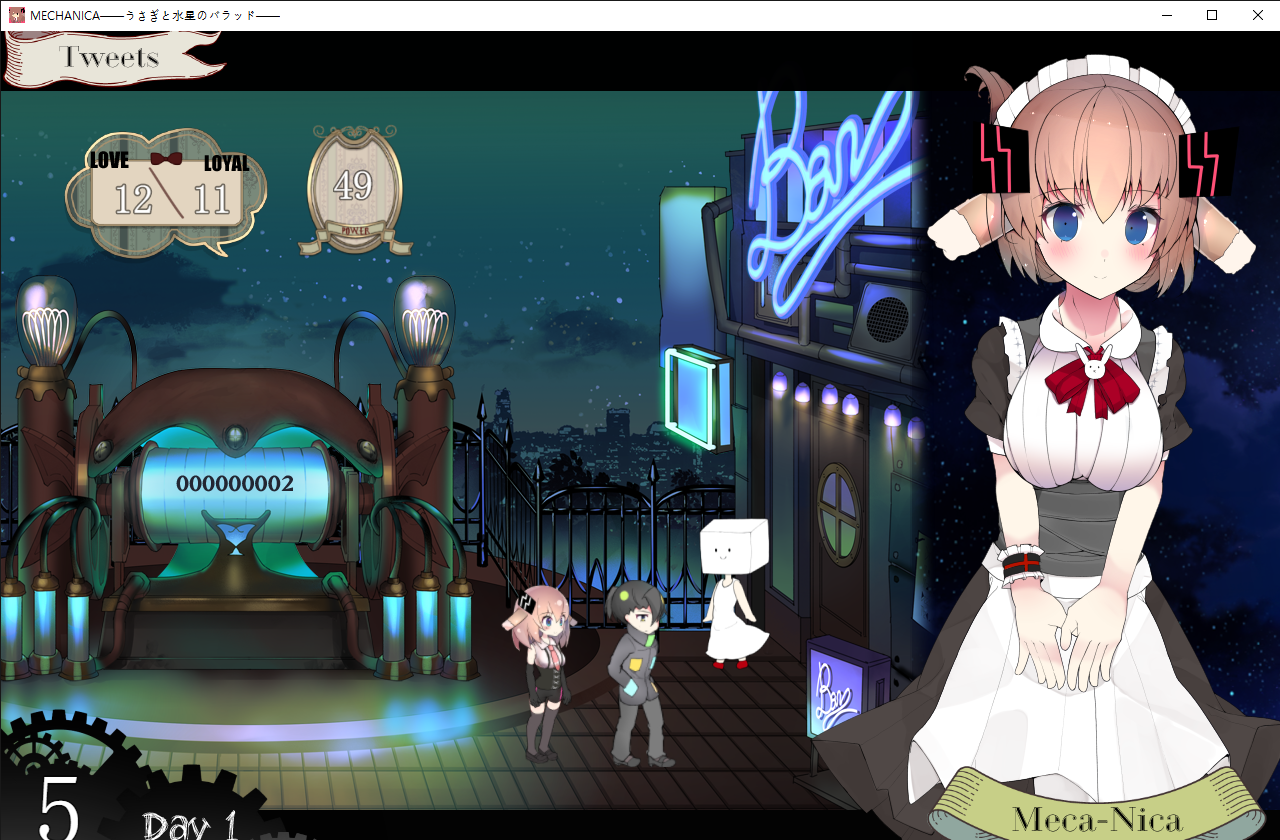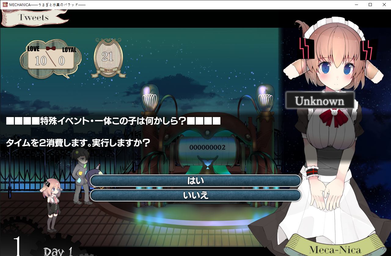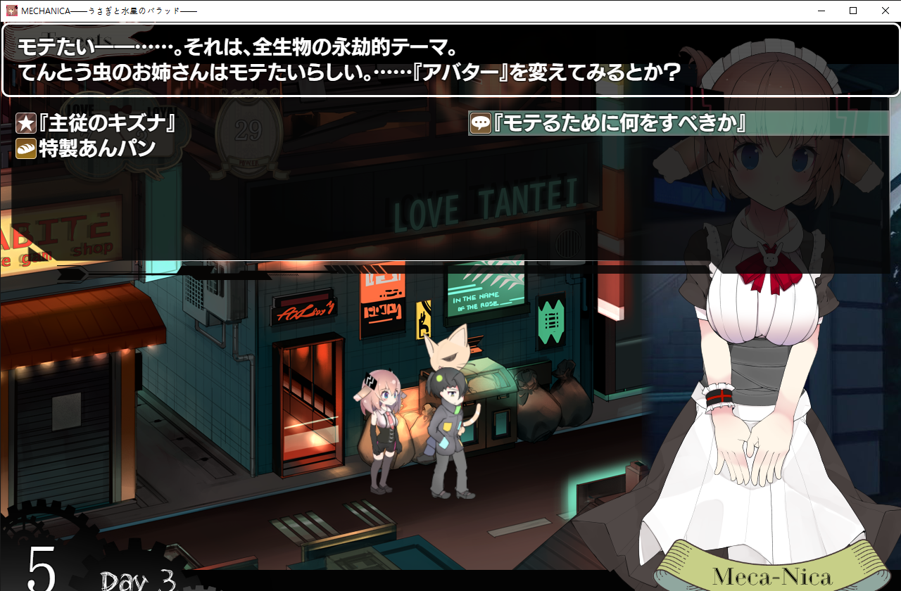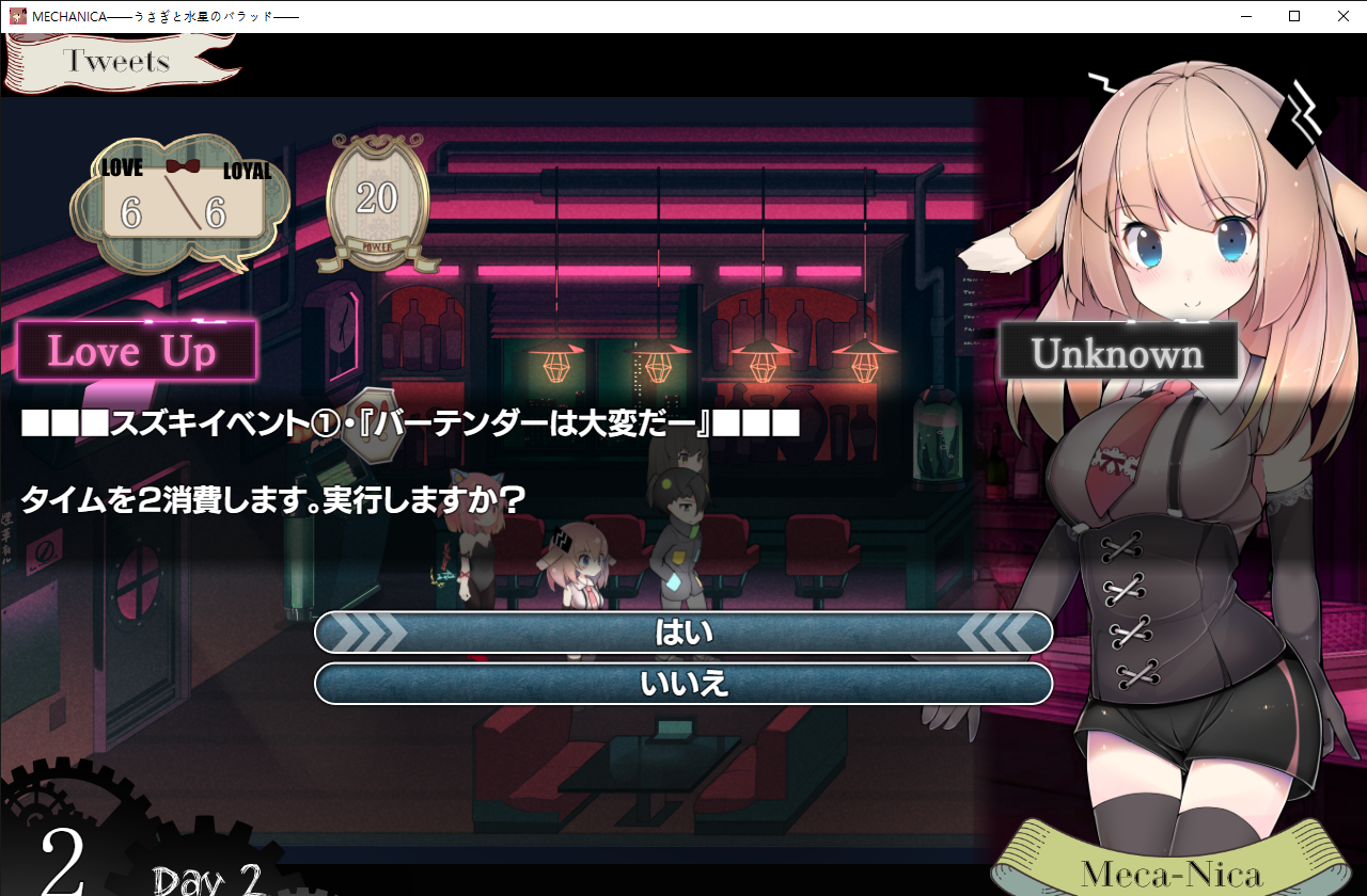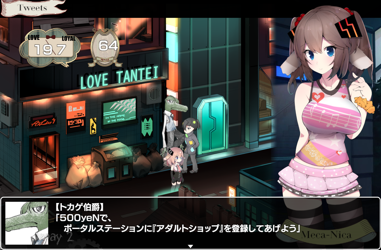 죽죽 들어가보니 러브굿이 있더군요기계머리의 정체를 알아야 대화가 가능하군요바도 이벤트가 있네요 스즈키 호감도 이벤트입니다바에서 공연이 가능해집니다해결하면 호감도도 오릅니다일단은 첫노래로 가겠습니다아까얻은아바타를 이용해 스토리를 진행했습니다노래는이걸 불러주었습니다두부들이 보여서 말을 걸어 봤더니다른 곳 부터 하고 오라는 군요바도 해줍시다이것공연료도 가끔 받습니다바의 왼쪽아래에서 어느날에 노래를 불렀는지 확인 할 수 있습니다처음에는 수성에 문제가 있는 줄 알았지만 여기서 다시 확인해 본 상태론 거대한 포탈을 이용해 이쪽을 공격한 것이였습니다다시 루프 EDM으로 시작했습니다이벤트 후 정보도 얻고여기도 이벤트러브굿은 당장은 대화할 필요는 없습니다이분은 외뇌를 모아오는 이벤트 입니다이곳에서 두부소녀와 갬블이 가능합니다일단 그전에 바에서 연주부터 했습니다 이 노래를 연주하면 됩니다다시 루프해서 갬블이건 다 정해져있으니 그냥 진 다음 상대의 패를 확인하고 다시 로드해서 플레이 하면 쉽습니다이기면 돈을 얻으니 유용하게 쓸 수 있습니다여기도 연주이걸 연주하면 됩니다EDM의 이곳에서 외뇌를 300엔에 살 수 있습니다나와서 이분에게이 노래를 연주해주고무료숙박시설의 정보를 얻습니다여기서이걸 말하면꼬마가 나옵니다연주는 이것누군가 연락할 방법돈이 없어 못산 휴대전화입니다꽃은 물을 주면 이곳저곳 이동해 있는데 졸졸 따라다니면서 물을 주면그냥 땅아래서 휴식을 취하고 있던 여자였습니다포탈연구자군요이번엔 하드보일드로따라가면 포탈추가이분은 아직은 못합니다두부에게선 갬블라이브도 다 해줍시다답은 아래쪽입니다뭔가 약간 기억은 남아있는듯한이분과도 이벤트이 노래를 연주해주면 됩니다 신앙의 증거획득이걸 사용해주면 됩니다 일단 시간이 넘어가기에 바에서 라이브부터 했습니다일단 더 들어가면 러브굿이 있고 아직은 이벤트 진행이 불가능 합니다라이브도 모아주고돌아와서 아까의 여행객에게이 노래를 연주해주면성전을 얻습니다3일째도 노래를 연주해줍시다다시 하드보일드척봐도 크툴루이신분과 이벤트를 봅시다노래는 이것외뇌를 주더군요다시 여기로 와서 증거를 주면시계를 러브굿의 부모가 만들었단걸 알게 됩니다템도 좀 사야되고 정보도 좀 사야됩니다500엔으로 샵 1000엔으로 전뢰를 살 수 있습니다말을걸고 부부를 제시하면정보를 하나 더 얻을 수 있습니다뭔가 숨기는게 있지만 아직은 밝혀낼 수 없습니다외뇌를 로봇에게 주도록 합시다