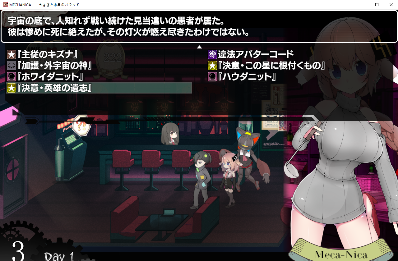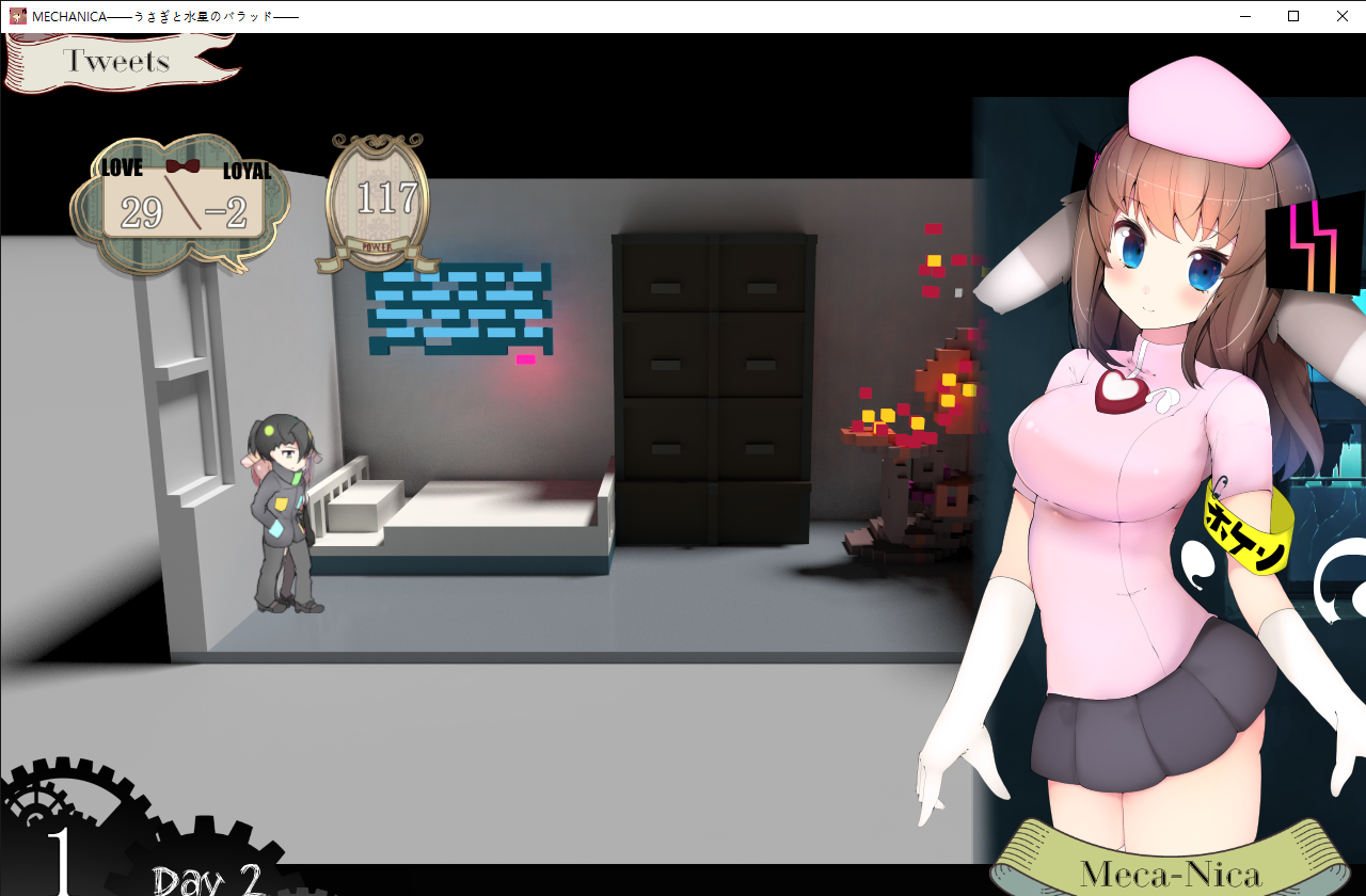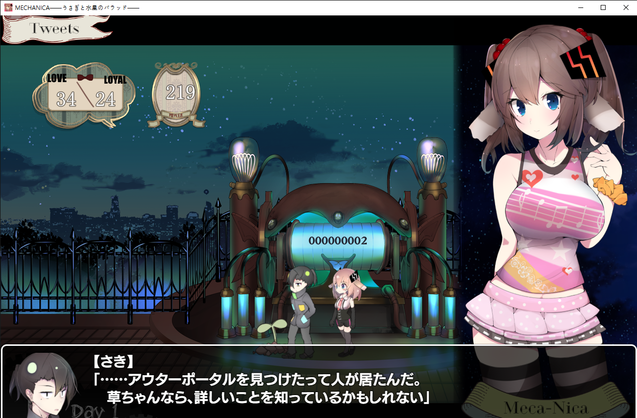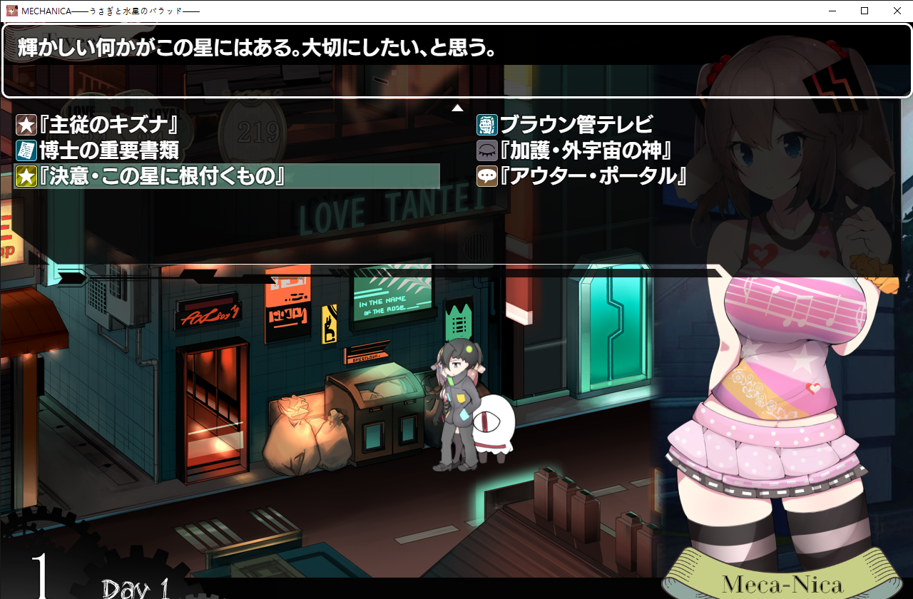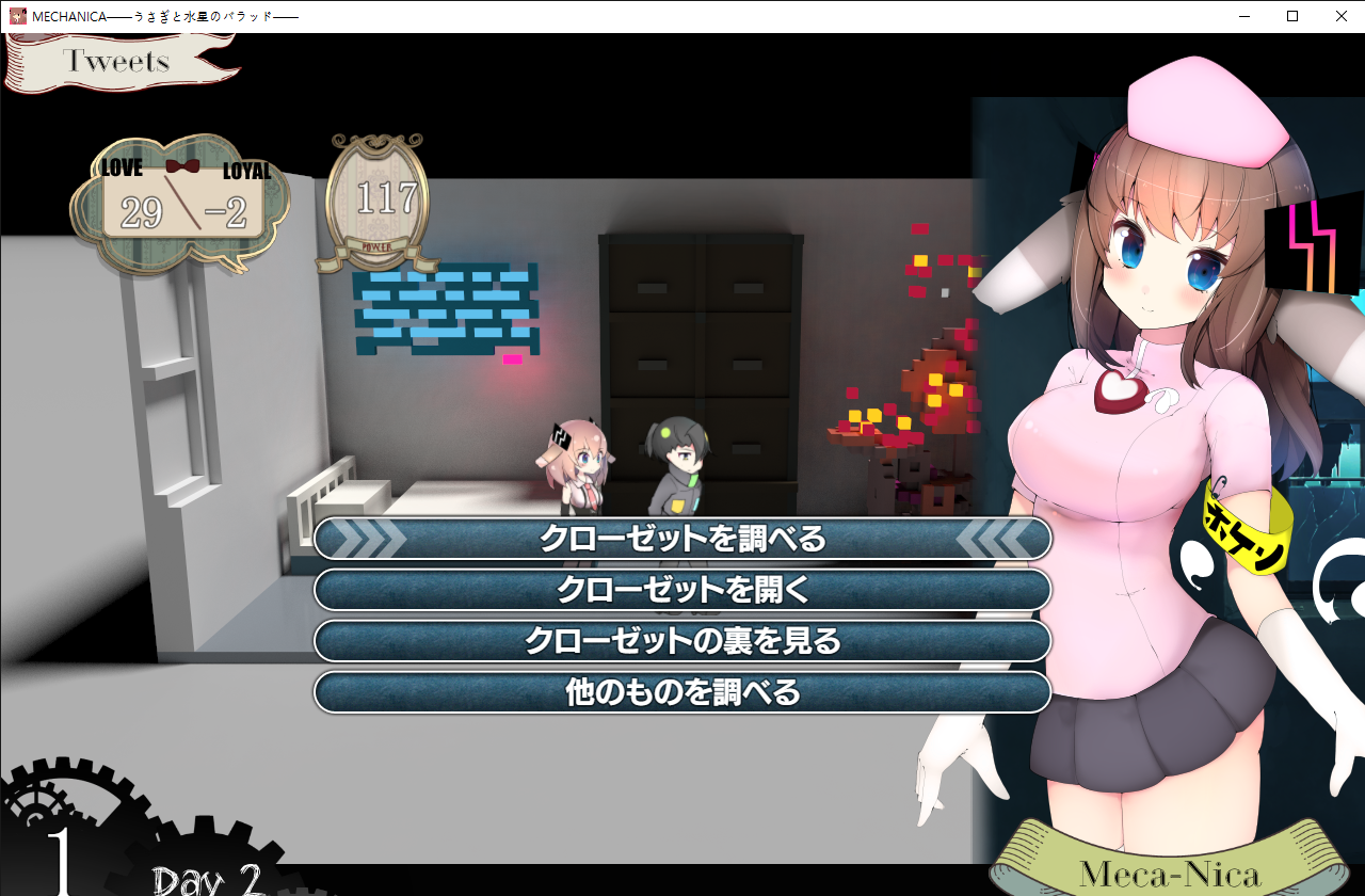다시가서이분과의 퀘스트노래는 이것으로3일째 바에서 러브굿과 대화 이걸 사용하면패스워드를 해킹합니다내려와서 이곳저곳 조사합시다장롱뒤에서위험무기 홀건을 발견할 수 있습니다이곳저곳 다 뒤져야 합니다이곳 저곳 다 뒤지면 알 수 있는건 러브굿이 자신의 부모의 복수를 하려고 했단 것 입니다나갈려고 하면 말을 거는 기계가 있는데러브굿의 언니의 카피입니다러브굿은 복수를 꿈꾸고 있고 기계를 이요해 시뮬레이션을 돌리고 있었습니다다시 이야기를 해볼려는 주인공여기서 막혀서 힌트를 봤습니다아니 이걸 어캐알아몰랐는데 이것도 하다보면 더 친해지는군요신경쓰이는 주인님으로 바꼇습니다하드보일드에서 바에 갑시다그전에 전뇌도 죄다 던져줍시다기계안에 우주가 있다는 의미심장한 이야기바의 종이를 조사해줍시다이곳도 슬슬 마무리를 지어줍시다우정을 손에 넣습니다다시 가서 곤충소녀에게 팜플렛을 주고노래를 불러줍시다산책코스를 얻습니다다시 이 노래로 가서여기와서계획을 까발려줍시다상태가 한단계 더 진행됩니다이분도 산책코스에 대해 이야기를 해주고노래를 불러주고얻은 정보로 벌레에게 말을 겁시다노래를 불러줍시다3일 후반 러브굿의 아지트로 다시 가면러브굿이 죽어가고 있습니다각오 검은 의지를 얻고 루프끝에 러브굿의 복수를 대신 해서 러브굿을 살립니다여기로 가서이걸 제시합시다노래를 연주해주고이 때의 대화를 통해아웃 포탈에 대한 정보를 얻을 수 있습니다결의를 얻습니다이 것을 이용해 이분과 대화뭔가 일이 생기면 쓰라고메모리를 줍니다내일도 다시 오자고 합니다여기도 관계진행오프닝의 그 장소군요드디어 메카니카와 사귈 수 있습니다시키는대로 다시 갑시다예전에 받은 박사의 중요한 문서를 주고풀의 집에 갈 수 있게 되었습니다비켜봐요 좀갑시다이곳을 조사해줍시다딴건 별거없더군요록이 걸려 있는데이걸 써줍시다풀의 탐험기록입니다이 침략자는 우리들의 차원을 붕괴가 목적이며정신오염기술을 가지고 있습니다드디어 해결방법을 알아냈습니다클론을 보내는 철두철미함범인은 육체를 가지지 않았을 것이라는 군요그렇기에 활동하기 위해서는 불법적인 아바타를 쓰고 있을거라 생각합니다즉 올바른 지문 클로리아문이 없을 거라고 합니다3일에 바에 가서러브굿과 이야기를 해줍시다암살계획을 짯는데 이미 상대가 죽어버렸습니다 그래서 러브굿은 드디어 과거를 청산하고 미래를 볼 수 있게 되었습니다옆의 갱에게도 아바타를 주고 노래를 불러줍시다바로 라운드티비를 주고 진입가능티비모양의 포탈이였습니다그때의 그곳내려가서 대화후포탈키를 얻은 다음성으로 들어가서조사드디어 이 현상에 대한 이야기를 들을 수 있습니다시계는 사실 기원차원의 수를 나타내는 거였습니다근데 이 기원을 부숴버려서 미래가 처리불가능한 속도로 늘어가니 시작했습니다 그래서 우주를 지키기 위해 다른 차원을 부쉈습니다방식은 상위존재를 이용해서즉 플레이어를 이용한 것입니다이 작업을 도운 동료들이 나오는데 모두 전작의 인물들입니다이렇게 플레이어의 힘을 이용해 메카니카를 제왜한 전 차원을 부정시켜 다시 하나로 만들려고 했습니다하지만 이를 이미 예측하고 오히려 역공을 가할려는 차원이 하나 있습니다 이것이 시계가 2를 가르킨 이유입니다그쪽세계는 상대를 죽이고 흡수하는 세계라서 인구가 108인밖에 없습니다저쪽보단 그래도 이쪽이 좋으니 이쪽에 힘을 실어줍니다범인을 검은 토끼를 막아달라고 부탁합니다주인공도 이제 플레이어를 인식하기 시작합니다돌아가서 대화이 마법사 누군가했더니바의 마스터였습니다 루프시작후 어디갔나 했습니다영웅의 의지를 얻습니다외뇌도 어딧나 했더만하드보일드의 바닷가 해안에 있었습니다우주를 넓힐것인가 우주를 멸망시킬것인가의 실험을 했는데그 그릇이 청소로봇입니다 결국은 그릇에 넘치기 때문에 우주를 줄이는 쪽으로 가닥을 잡았습니다멸망을 막기위해 다시 자기에게 락을 걸어 완전한 청소로봇으로 돌아갑니다심심하면 퀴즈도 해줍시다여기서 대죄인의 정보를 얻고이것을 집앞의 토끼에게 써줍시다이걸 불러주고결의를 얻습니다상급도 심심하면 해보세요모든 일을 해결하면 다시 여기로 오라는데 해결하면 바로 엔딩이라 잘 모르겠습니다와서 아바타코드에 대해 물으면드디어 진범의 얼굴을 알 수 있게 됩니다노래도 불러줍시다탐정사무소로 가서 각각제시해주고범인을 밝혀냈습니다추리성공이야기를 해줍시다드디어 만난 인레의 검은토끼4억5천만의 고차원생물의 집합체입니다각자의 차원을 걸고 분홍토끼와 검은 토끼와의 싸움이 시작됩니다메카니카에게 힘을 줍시다 음악은 막눌러도 되더군요영웅의 유지로 메카니카에게 힘을 옆의 글도 읽어주면 재미있습니다주인공을 노리는 공격은 고대신의 힘으로 막습니다정신오염으로 공격당하지만내일은 분명 좋은 날이 될거라는 의지로 해결합니다포탈을 열어 공격을 해오지만 다른 친구들의 도움으로 막아냅니다다시 포탈을 기동 병기를 꺼내지만마스터를 불러 이를 막아냅니다마지
