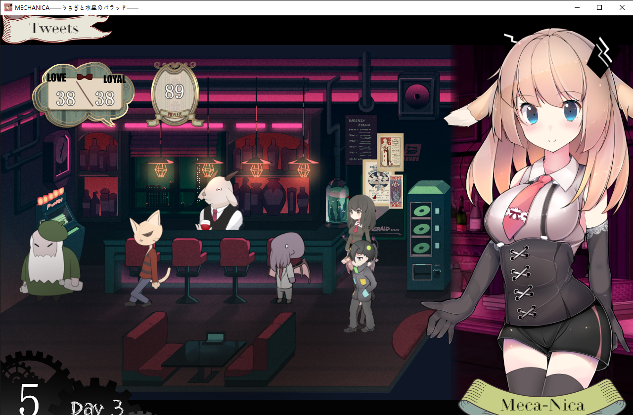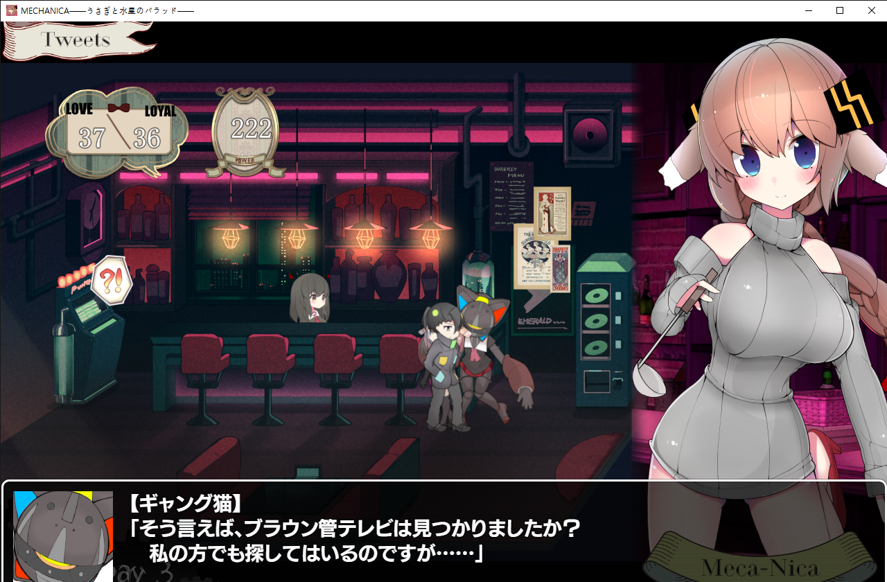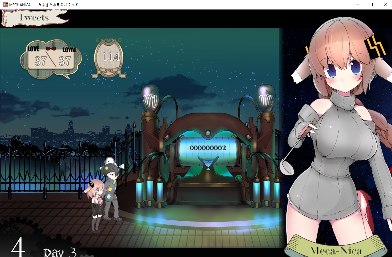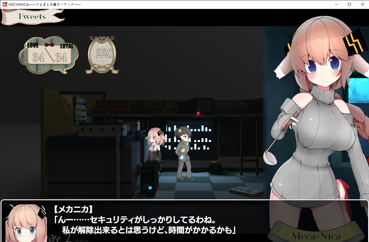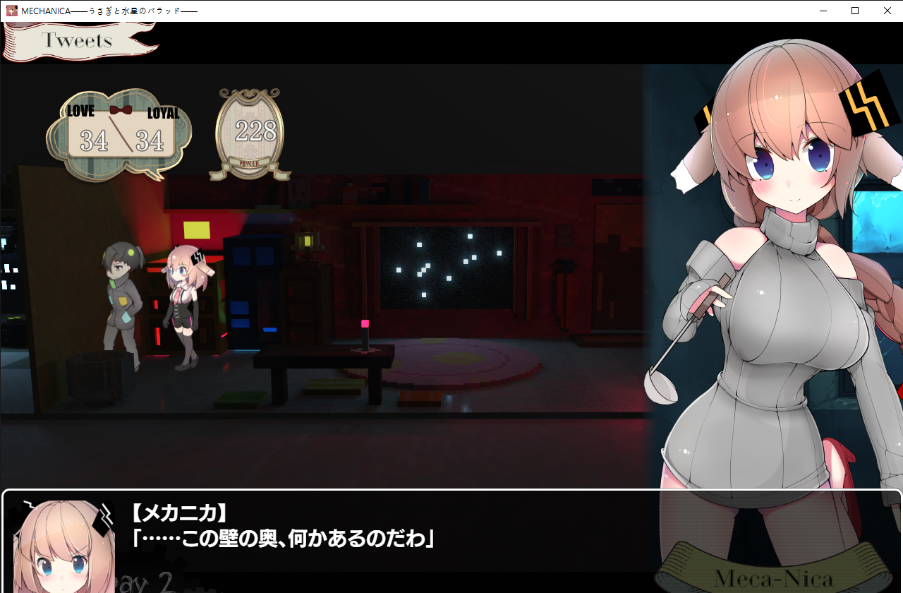 다시가서이분과의 퀘스트노래는 이것으로3일째 바에서 러브굿과 대화 이걸 사용하면패스워드를 해킹합니다내려와서 이곳저곳 조사합시다장롱뒤에서위험무기 홀건을 발견할 수 있습니다이곳저곳 다 뒤져야 합니다이곳 저곳 다 뒤지면 알 수 있는건 러브굿이 자신의 부모의 복수를 하려고 했단 것 입니다나갈려고 하면 말을 거는 기계가 있는데러브굿의 언니의 카피입니다러브굿은 복수를 꿈꾸고 있고 기계를 이요해 시뮬레이션을 돌리고 있었습니다다시 이야기를 해볼려는 주인공여기서 막혀서 힌트를 봤습니다아니 이걸 어캐알아몰랐는데 이것도 하다보면 더 친해지는군요신경쓰이는 주인님으로 바꼇습니다하드보일드에서 바에 갑시다그전에 전뇌도 죄다 던져줍시다기계안에 우주가 있다는 의미심장한 이야기바의 종이를 조사해줍시다이곳도 슬슬 마무리를 지어줍시다우정을 손에 넣습니다다시 가서 곤충소녀에게 팜플렛을 주고노래를 불러줍시다산책코스를 얻습니다다시 이 노래로 가서여기와서계획을 까발려줍시다상태가 한단계 더 진행됩니다이분도 산책코스에 대해 이야기를 해주고노래를 불러주고얻은 정보로 벌레에게 말을 겁시다노래를 불러줍시다3일 후반 러브굿의 아지트로 다시 가면러브굿이 죽어가고 있습니다각오 검은 의지를 얻고 루프끝에 러브굿의 복수를 대신 해서 러브굿을 살립니다여기로 가서이걸 제시합시다노래를 연주해주고이 때의 대화를 통해아웃 포탈에 대한 정보를 얻을 수 있습니다결의를 얻습니다이 것을 이용해 이분과 대화뭔가 일이 생기면 쓰라고메모리를 줍니다내일도 다시 오자고 합니다여기도 관계진행오프닝의 그 장소군요드디어 메카니카와 사귈 수 있습니다시키는대로 다시 갑시다예전에 받은 박사의 중요한 문서를 주고풀의 집에 갈 수 있게 되었습니다비켜봐요 좀갑시다이곳을 조사해줍시다딴건 별거없더군요록이 걸려 있는데이걸 써줍시다풀의 탐험기록입니다이 침략자는 우리들의 차원을 붕괴가 목적이며정신오염기술을 가지고 있습니다드디어 해결방법을 알아냈습니다클론을 보내는 철두철미함범인은 육체를 가지지 않았을 것이라는 군요그렇기에 활동하기 위해서는 불법적인 아바타를 쓰고 있을거라 생각합니다즉 올바른 지문 클로리아문이 없을 거라고 합니다3일에 바에 가서러브굿과 이야기를 해줍시다암살계획을 짯는데 이미 상대가 죽어버렸습니다 그래서 러브굿은 드디어 과거를 청산하고 미래를 볼 수 있게 되었습니다옆의 갱에게도 아바타를 주고 노래를 불러줍시다바로 라운드티비를 주고 진입가능티비모양의 포탈이였습니다그때의 그곳내려가서 대화후포탈키를 얻은 다음성으로 들어가서조사드디어 이 현상에 대한 이야기를 들을 수 있습니다시계는 사실 기원차원의 수를 나타내는 거였습니다근데 이 기원을 부숴버려서 미래가 처리불가능한 속도로 늘어가니 시작했습니다 그래서 우주를 지키기 위해 다른 차원을 부쉈습니다방식은 상위존재를 이용해서즉 플레이어를 이용한 것입니다이 작업을 도운 동료들이 나오는데 모두 전작의 인물들입니다이렇게 플레이어의 힘을 이용해 메카니카를 제왜한 전 차원을 부정시켜 다시 하나로 만들려고 했습니다하지만 이를 이미 예측하고 오히려 역공을 가할려는 차원이 하나 있습니다 이것이 시계가 2를 가르킨 이유입니다그쪽세계는 상대를 죽이고 흡수하는 세계라서 인구가 108인밖에 없습니다저쪽보단 그래도 이쪽이 좋으니 이쪽에 힘을 실어줍니다범인을 검은 토끼를 막아달라고 부탁합니다주인공도 이제 플레이어를 인식하기 시작합니다돌아가서 대화이 마법사 누군가했더니바의 마스터였습니다 루프시작후 어디갔나 했습니다영웅의 의지를 얻습니다외뇌도 어딧나 했더만하드보일드의 바닷가 해안에 있었습니다우주를 넓힐것인가 우주를 멸망시킬것인가의 실험을 했는데그 그릇이 청소로봇입니다 결국은 그릇에 넘치기 때문에 우주를 줄이는 쪽으로 가닥을 잡았습니다멸망을 막기위해 다시 자기에게 락을 걸어 완전한 청소로봇으로 돌아갑니다심심하면 퀴즈도 해줍시다여기서 대죄인의 정보를 얻고이것을 집앞의 토끼에게 써줍시다이걸 불러주고결의를 얻습니다상급도 심심하면 해보세요모든 일을 해결하면 다시 여기로 오라는데 해결하면 바로 엔딩이라 잘 모르겠습니다와서 아바타코드에 대해 물으면드디어 진범의 얼굴을 알 수 있게 됩니다노래도 불러줍시다탐정사무소로 가서 각각제시해주고범인을 밝혀냈습니다추리성공이야기를 해줍시다드디어 만난 인레의 검은토끼4억5천만의 고차원생물의 집합체입니다각자의 차원을 걸고 분홍토끼와 검은 토끼와의 싸움이 시작됩니다메카니카에게 힘을 줍시다 음악은 막눌러도 되더군요영웅의 유지로 메카니카에게 힘을 옆의 글도 읽어주면 재미있습니다주인공을 노리는 공격은 고대신의 힘으로 막습니다정신오염으로 공격당하지만내일은 분명 좋은 날이 될거라는 의지로 해결합니다포탈을 열어 공격을 해오지만 다른 친구들의 도움으로 막아냅니다다시 포탈을 기동 병기를 꺼내지만마스터를 불러 이를 막아냅니다마지