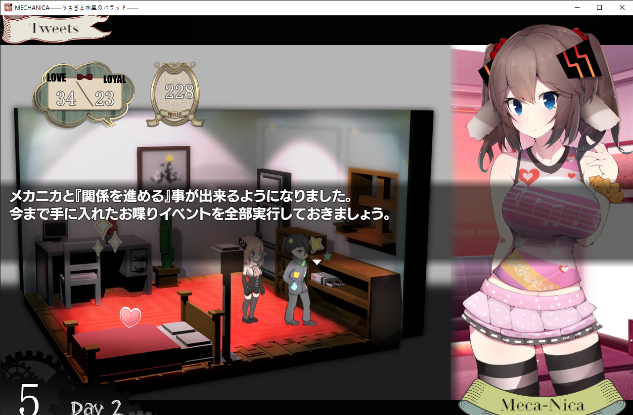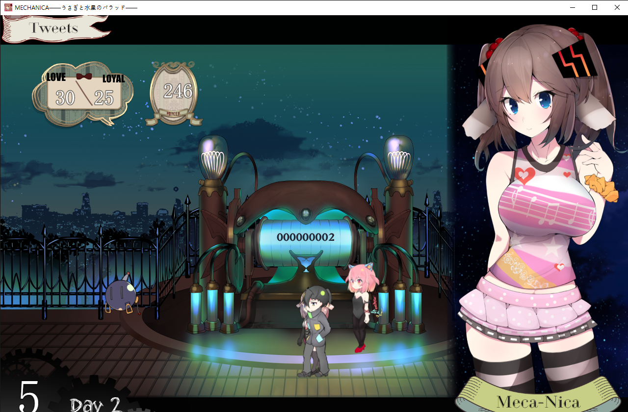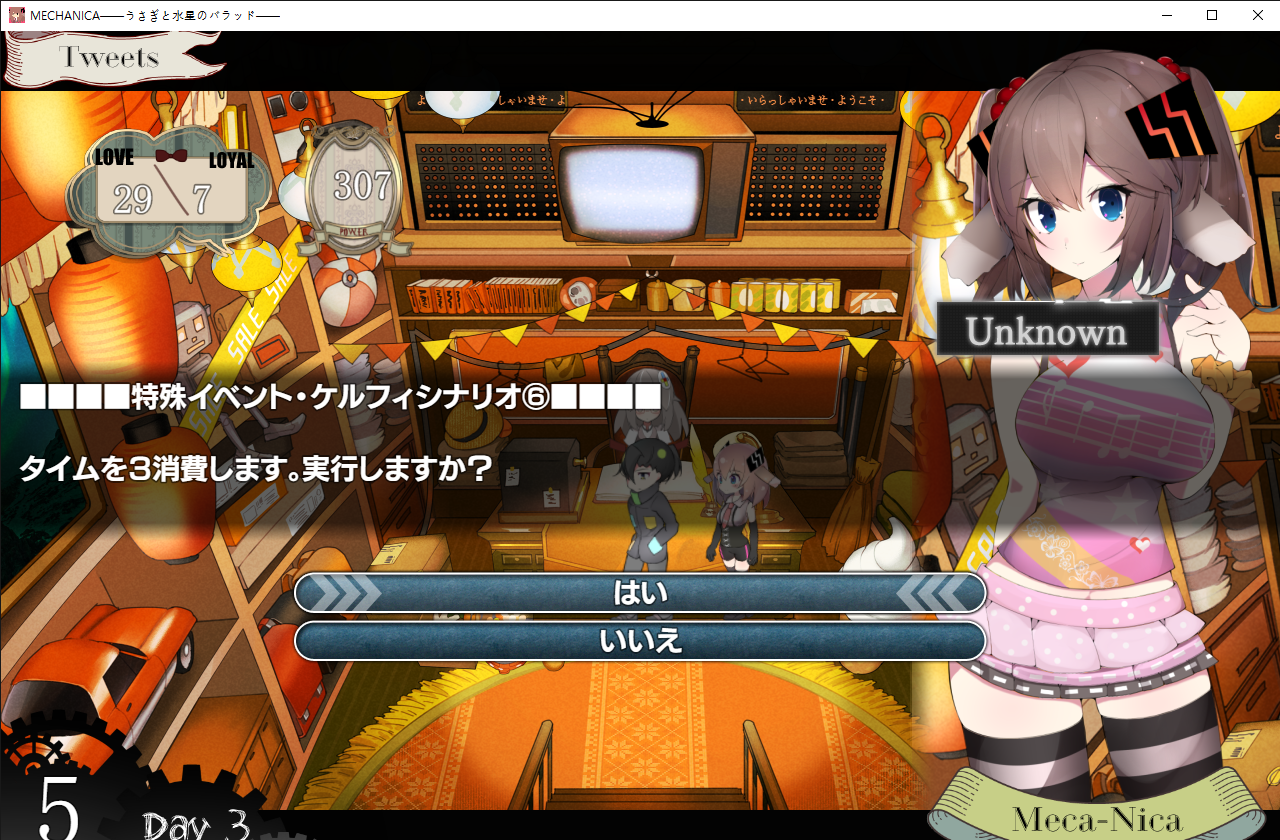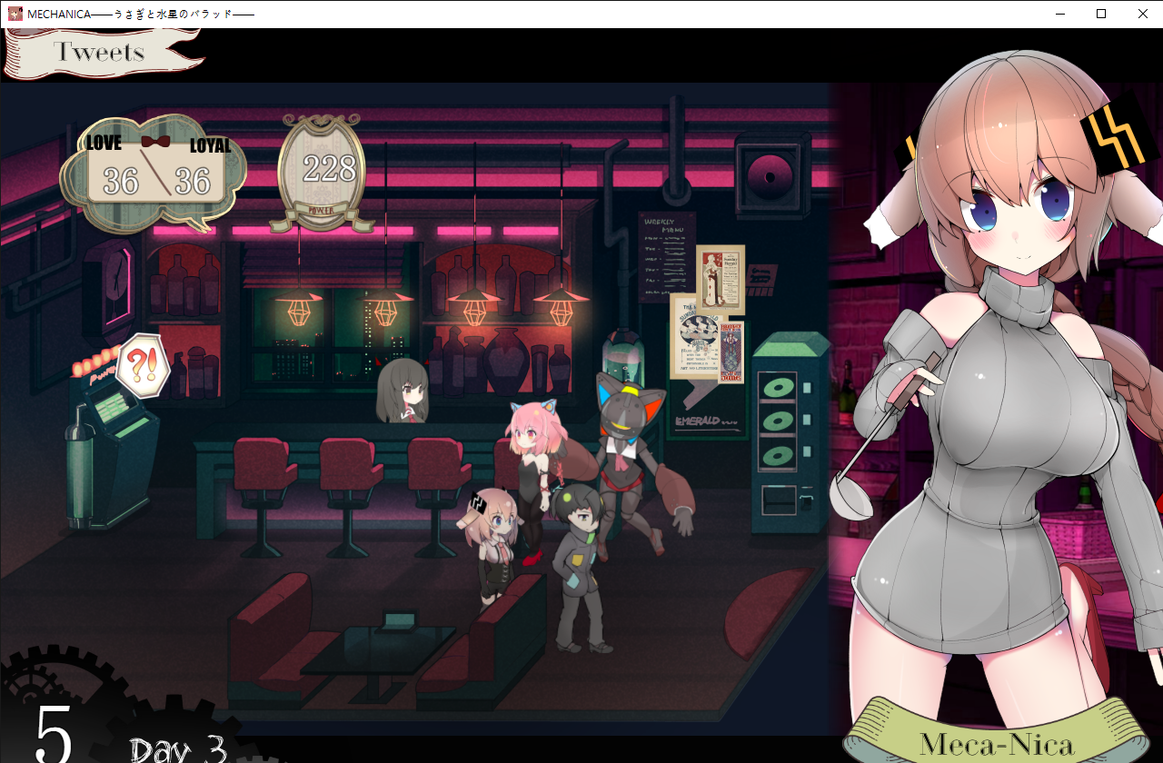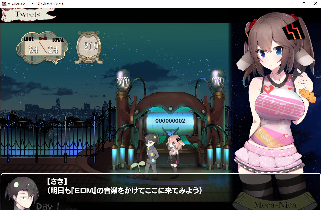 다시가서이분과의 퀘스트노래는 이것으로3일째 바에서 러브굿과 대화 이걸 사용하면패스워드를 해킹합니다내려와서 이곳저곳 조사합시다장롱뒤에서위험무기 홀건을 발견할 수 있습니다이곳저곳 다 뒤져야 합니다이곳 저곳 다 뒤지면 알 수 있는건 러브굿이 자신의 부모의 복수를 하려고 했단 것 입니다나갈려고 하면 말을 거는 기계가 있는데러브굿의 언니의 카피입니다러브굿은 복수를 꿈꾸고 있고 기계를 이요해 시뮬레이션을 돌리고 있었습니다다시 이야기를 해볼려는 주인공여기서 막혀서 힌트를 봤습니다아니 이걸 어캐알아몰랐는데 이것도 하다보면 더 친해지는군요신경쓰이는 주인님으로 바꼇습니다하드보일드에서 바에 갑시다그전에 전뇌도 죄다 던져줍시다기계안에 우주가 있다는 의미심장한 이야기바의 종이를 조사해줍시다이곳도 슬슬 마무리를 지어줍시다우정을 손에 넣습니다다시 가서 곤충소녀에게 팜플렛을 주고노래를 불러줍시다산책코스를 얻습니다다시 이 노래로 가서여기와서계획을 까발려줍시다상태가 한단계 더 진행됩니다이분도 산책코스에 대해 이야기를 해주고노래를 불러주고얻은 정보로 벌레에게 말을 겁시다노래를 불러줍시다3일 후반 러브굿의 아지트로 다시 가면러브굿이 죽어가고 있습니다각오 검은 의지를 얻고 루프끝에 러브굿의 복수를 대신 해서 러브굿을 살립니다여기로 가서이걸 제시합시다노래를 연주해주고이 때의 대화를 통해아웃 포탈에 대한 정보를 얻을 수 있습니다결의를 얻습니다이 것을 이용해 이분과 대화뭔가 일이 생기면 쓰라고메모리를 줍니다내일도 다시 오자고 합니다여기도 관계진행오프닝의 그 장소군요드디어 메카니카와 사귈 수 있습니다시키는대로 다시 갑시다예전에 받은 박사의 중요한 문서를 주고풀의 집에 갈 수 있게 되었습니다비켜봐요 좀갑시다이곳을 조사해줍시다딴건 별거없더군요록이 걸려 있는데이걸 써줍시다풀의 탐험기록입니다이 침략자는 우리들의 차원을 붕괴가 목적이며정신오염기술을 가지고 있습니다드디어 해결방법을 알아냈습니다클론을 보내는 철두철미함범인은 육체를 가지지 않았을 것이라는 군요그렇기에 활동하기 위해서는 불법적인 아바타를 쓰고 있을거라 생각합니다즉 올바른 지문 클로리아문이 없을 거라고 합니다3일에 바에 가서러브굿과 이야기를 해줍시다암살계획을 짯는데 이미 상대가 죽어버렸습니다 그래서 러브굿은 드디어 과거를 청산하고 미래를 볼 수 있게 되었습니다옆의 갱에게도 아바타를 주고 노래를 불러줍시다바로 라운드티비를 주고 진입가능티비모양의 포탈이였습니다그때의 그곳내려가서 대화후포탈키를 얻은 다음성으로 들어가서조사드디어 이 현상에 대한 이야기를 들을 수 있습니다시계는 사실 기원차원의 수를 나타내는 거였습니다근데 이 기원을 부숴버려서 미래가 처리불가능한 속도로 늘어가니 시작했습니다 그래서 우주를 지키기 위해 다른 차원을 부쉈습니다방식은 상위존재를 이용해서즉 플레이어를 이용한 것입니다이 작업을 도운 동료들이 나오는데 모두 전작의 인물들입니다이렇게 플레이어의 힘을 이용해 메카니카를 제왜한 전 차원을 부정시켜 다시 하나로 만들려고 했습니다하지만 이를 이미 예측하고 오히려 역공을 가할려는 차원이 하나 있습니다 이것이 시계가 2를 가르킨 이유입니다그쪽세계는 상대를 죽이고 흡수하는 세계라서 인구가 108인밖에 없습니다저쪽보단 그래도 이쪽이 좋으니 이쪽에 힘을 실어줍니다범인을 검은 토끼를 막아달라고 부탁합니다주인공도 이제 플레이어를 인식하기 시작합니다돌아가서 대화이 마법사 누군가했더니바의 마스터였습니다 루프시작후 어디갔나 했습니다영웅의 의지를 얻습니다외뇌도 어딧나 했더만하드보일드의 바닷가 해안에 있었습니다우주를 넓힐것인가 우주를 멸망시킬것인가의 실험을 했는데그 그릇이 청소로봇입니다 결국은 그릇에 넘치기 때문에 우주를 줄이는 쪽으로 가닥을 잡았습니다멸망을 막기위해 다시 자기에게 락을 걸어 완전한 청소로봇으로 돌아갑니다심심하면 퀴즈도 해줍시다여기서 대죄인의 정보를 얻고이것을 집앞의 토끼에게 써줍시다이걸 불러주고결의를 얻습니다상급도 심심하면 해보세요모든 일을 해결하면 다시 여기로 오라는데 해결하면 바로 엔딩이라 잘 모르겠습니다와서 아바타코드에 대해 물으면드디어 진범의 얼굴을 알 수 있게 됩니다노래도 불러줍시다탐정사무소로 가서 각각제시해주고범인을 밝혀냈습니다추리성공이야기를 해줍시다드디어 만난 인레의 검은토끼4억5천만의 고차원생물의 집합체입니다각자의 차원을 걸고 분홍토끼와 검은 토끼와의 싸움이 시작됩니다메카니카에게 힘을 줍시다 음악은 막눌러도 되더군요영웅의 유지로 메카니카에게 힘을 옆의 글도 읽어주면 재미있습니다주인공을 노리는 공격은 고대신의 힘으로 막습니다정신오염으로 공격당하지만내일은 분명 좋은 날이 될거라는 의지로 해결합니다포탈을 열어 공격을 해오지만 다른 친구들의 도움으로 막아냅니다다시 포탈을 기동 병기를 꺼내지만마스터를 불러 이를 막아냅니다마지