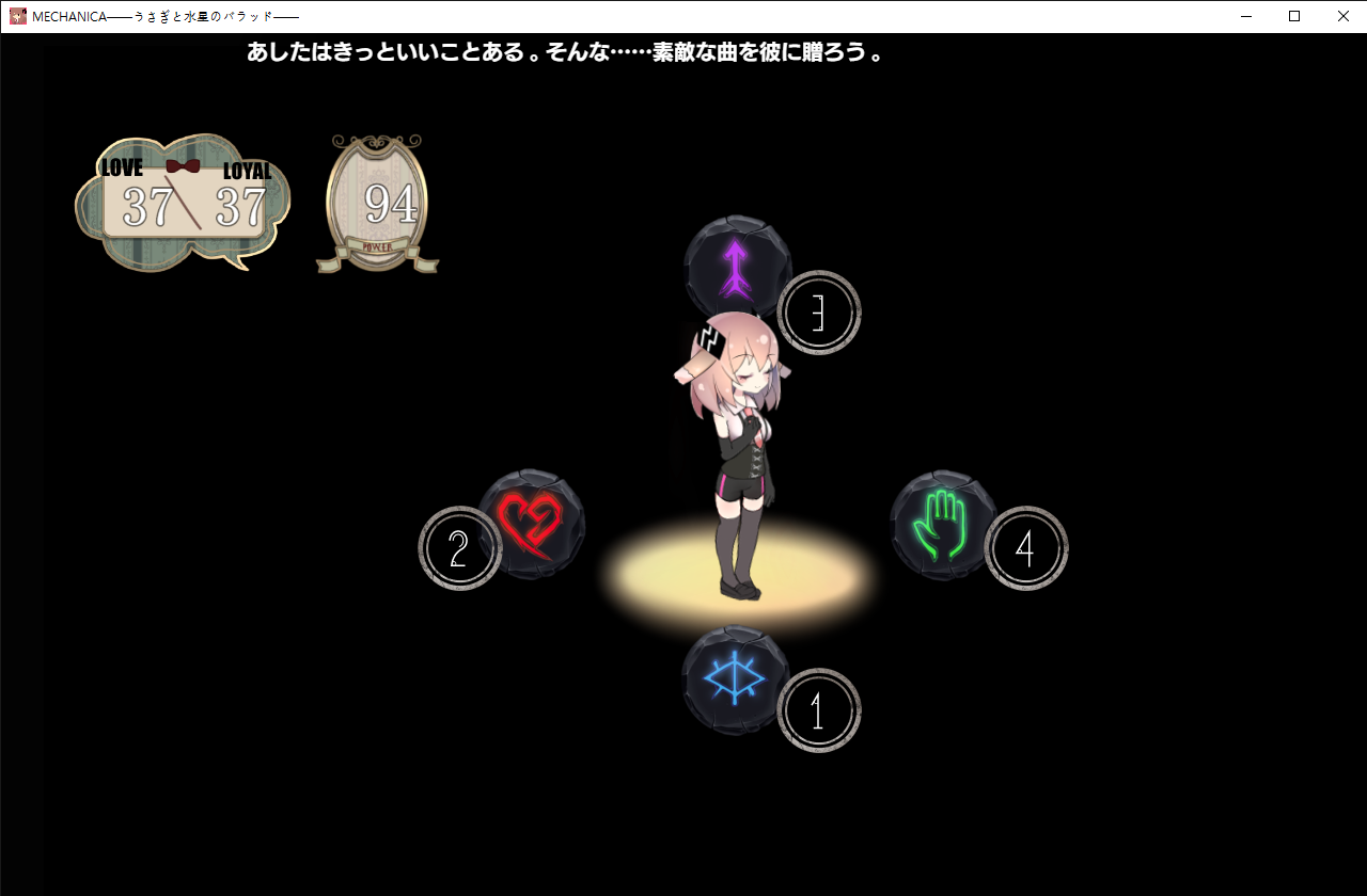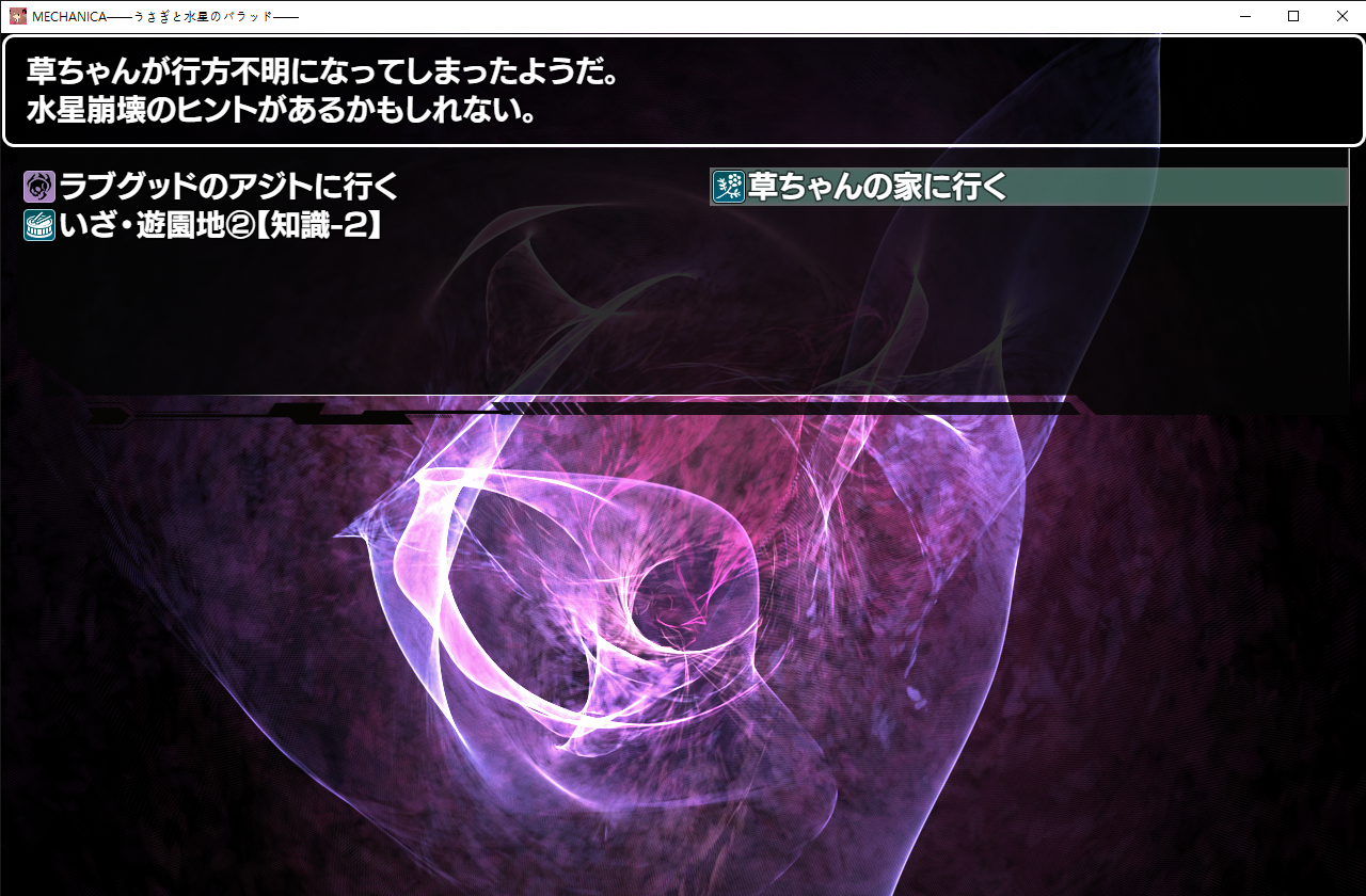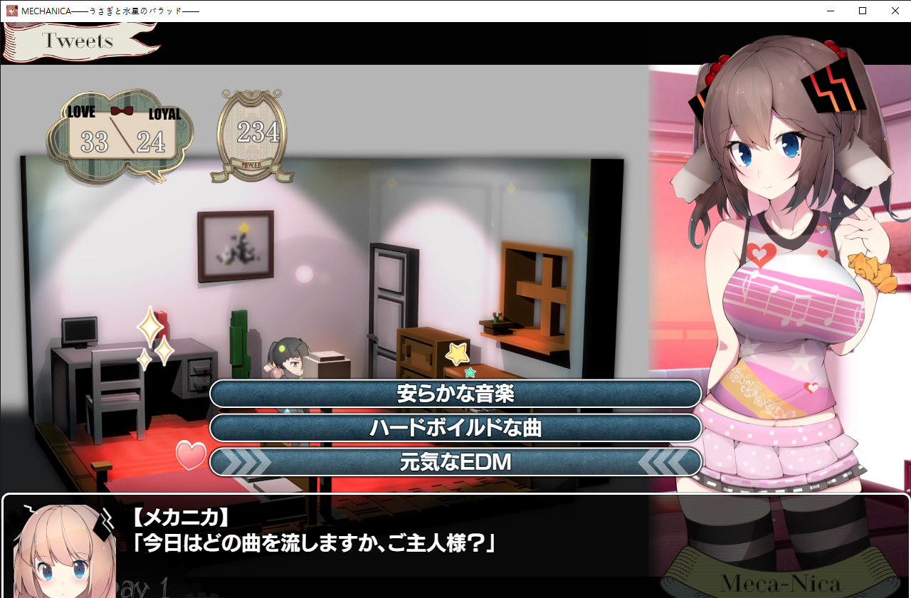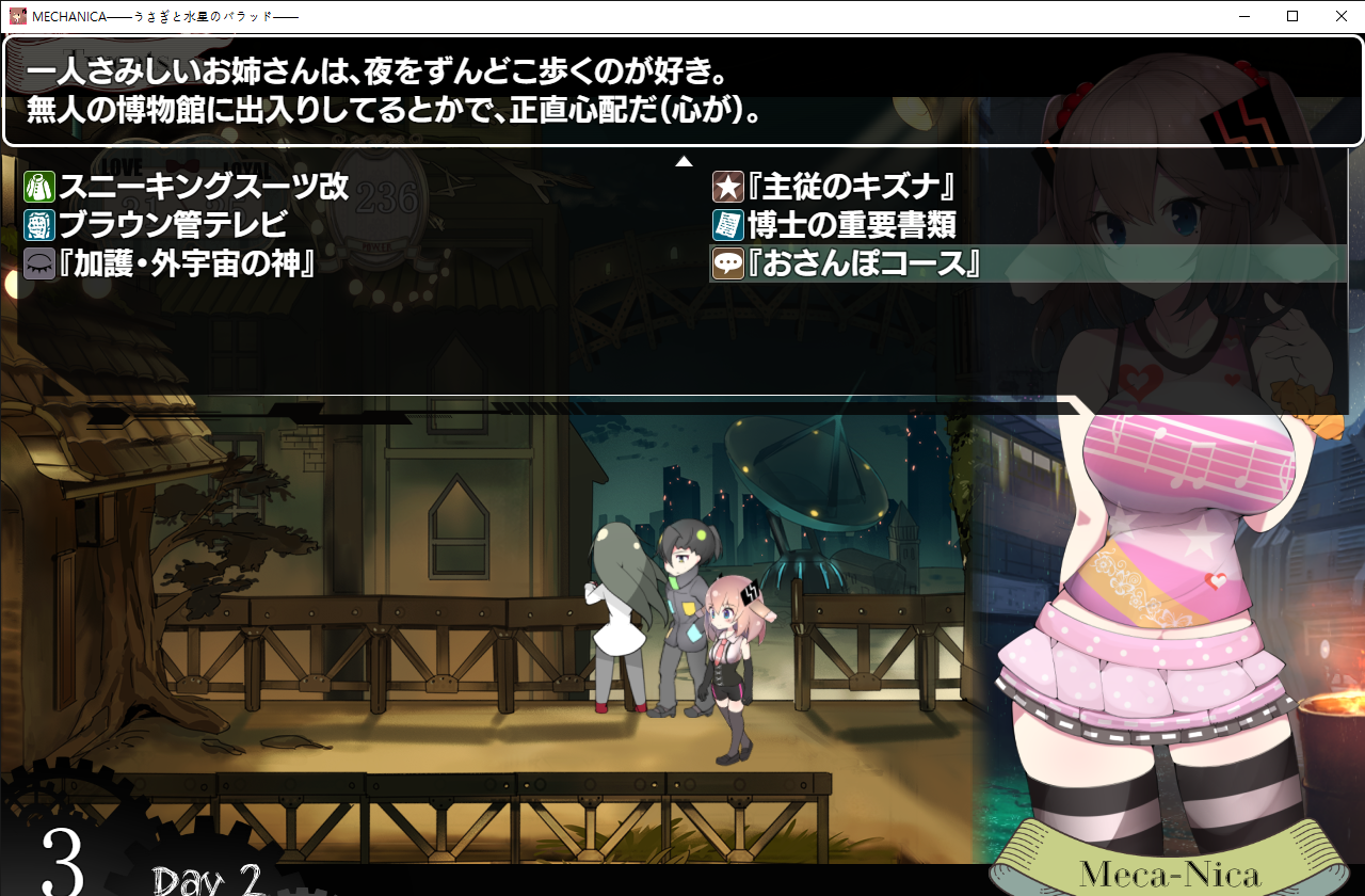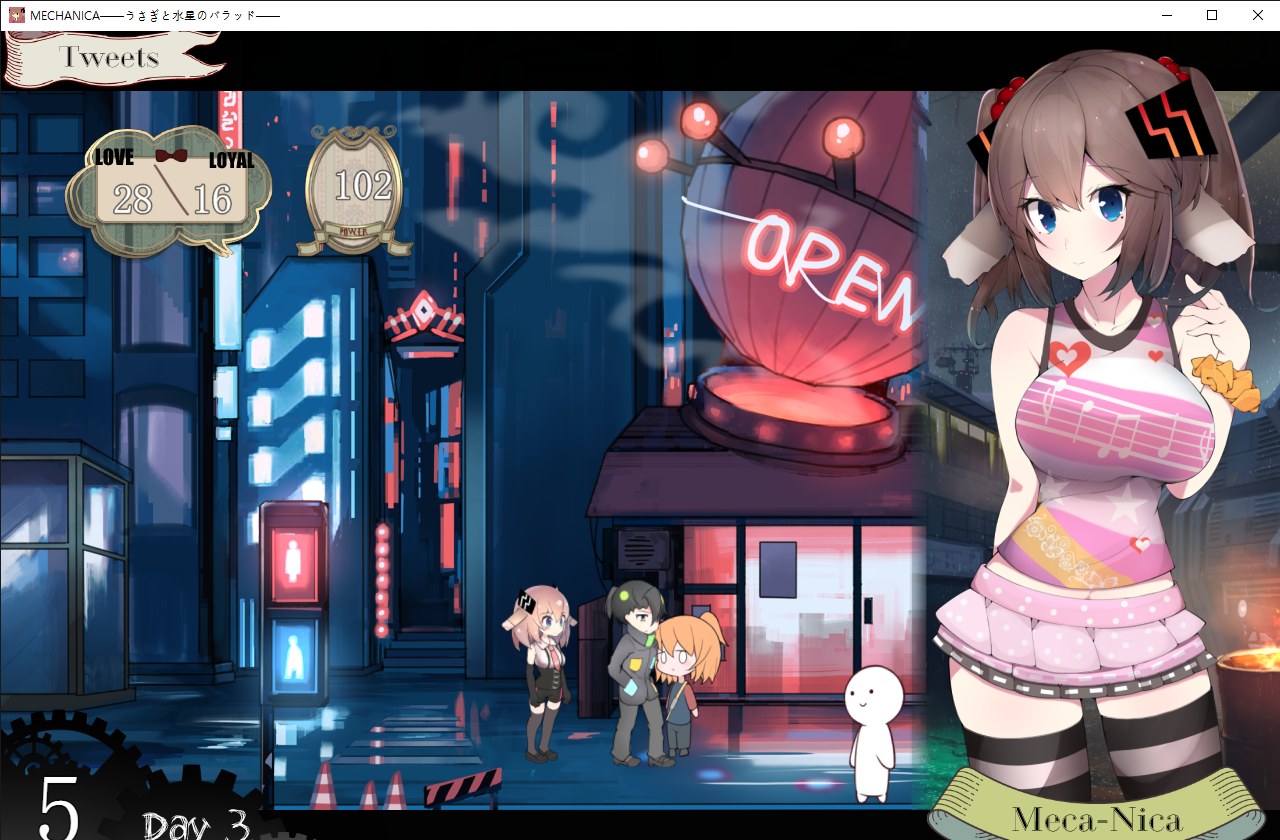 다시가서이분과의 퀘스트노래는 이것으로3일째 바에서 러브굿과 대화 이걸 사용하면패스워드를 해킹합니다내려와서 이곳저곳 조사합시다장롱뒤에서위험무기 홀건을 발견할 수 있습니다이곳저곳 다 뒤져야 합니다이곳 저곳 다 뒤지면 알 수 있는건 러브굿이 자신의 부모의 복수를 하려고 했단 것 입니다나갈려고 하면 말을 거는 기계가 있는데러브굿의 언니의 카피입니다러브굿은 복수를 꿈꾸고 있고 기계를 이요해 시뮬레이션을 돌리고 있었습니다다시 이야기를 해볼려는 주인공여기서 막혀서 힌트를 봤습니다아니 이걸 어캐알아몰랐는데 이것도 하다보면 더 친해지는군요신경쓰이는 주인님으로 바꼇습니다하드보일드에서 바에 갑시다그전에 전뇌도 죄다 던져줍시다기계안에 우주가 있다는 의미심장한 이야기바의 종이를 조사해줍시다이곳도 슬슬 마무리를 지어줍시다우정을 손에 넣습니다다시 가서 곤충소녀에게 팜플렛을 주고노래를 불러줍시다산책코스를 얻습니다다시 이 노래로 가서여기와서계획을 까발려줍시다상태가 한단계 더 진행됩니다이분도 산책코스에 대해 이야기를 해주고노래를 불러주고얻은 정보로 벌레에게 말을 겁시다노래를 불러줍시다3일 후반 러브굿의 아지트로 다시 가면러브굿이 죽어가고 있습니다각오 검은 의지를 얻고 루프끝에 러브굿의 복수를 대신 해서 러브굿을 살립니다여기로 가서이걸 제시합시다노래를 연주해주고이 때의 대화를 통해아웃 포탈에 대한 정보를 얻을 수 있습니다결의를 얻습니다이 것을 이용해 이분과 대화뭔가 일이 생기면 쓰라고메모리를 줍니다내일도 다시 오자고 합니다여기도 관계진행오프닝의 그 장소군요드디어 메카니카와 사귈 수 있습니다시키는대로 다시 갑시다예전에 받은 박사의 중요한 문서를 주고풀의 집에 갈 수 있게 되었습니다비켜봐요 좀갑시다이곳을 조사해줍시다딴건 별거없더군요록이 걸려 있는데이걸 써줍시다풀의 탐험기록입니다이 침략자는 우리들의 차원을 붕괴가 목적이며정신오염기술을 가지고 있습니다드디어 해결방법을 알아냈습니다클론을 보내는 철두철미함범인은 육체를 가지지 않았을 것이라는 군요그렇기에 활동하기 위해서는 불법적인 아바타를 쓰고 있을거라 생각합니다즉 올바른 지문 클로리아문이 없을 거라고 합니다3일에 바에 가서러브굿과 이야기를 해줍시다암살계획을 짯는데 이미 상대가 죽어버렸습니다 그래서 러브굿은 드디어 과거를 청산하고 미래를 볼 수 있게 되었습니다옆의 갱에게도 아바타를 주고 노래를 불러줍시다바로 라운드티비를 주고 진입가능티비모양의 포탈이였습니다그때의 그곳내려가서 대화후포탈키를 얻은 다음성으로 들어가서조사드디어 이 현상에 대한 이야기를 들을 수 있습니다시계는 사실 기원차원의 수를 나타내는 거였습니다근데 이 기원을 부숴버려서 미래가 처리불가능한 속도로 늘어가니 시작했습니다 그래서 우주를 지키기 위해 다른 차원을 부쉈습니다방식은 상위존재를 이용해서즉 플레이어를 이용한 것입니다이 작업을 도운 동료들이 나오는데 모두 전작의 인물들입니다이렇게 플레이어의 힘을 이용해 메카니카를 제왜한 전 차원을 부정시켜 다시 하나로 만들려고 했습니다하지만 이를 이미 예측하고 오히려 역공을 가할려는 차원이 하나 있습니다 이것이 시계가 2를 가르킨 이유입니다그쪽세계는 상대를 죽이고 흡수하는 세계라서 인구가 108인밖에 없습니다저쪽보단 그래도 이쪽이 좋으니 이쪽에 힘을 실어줍니다범인을 검은 토끼를 막아달라고 부탁합니다주인공도 이제 플레이어를 인식하기 시작합니다돌아가서 대화이 마법사 누군가했더니바의 마스터였습니다 루프시작후 어디갔나 했습니다영웅의 의지를 얻습니다외뇌도 어딧나 했더만하드보일드의 바닷가 해안에 있었습니다우주를 넓힐것인가 우주를 멸망시킬것인가의 실험을 했는데그 그릇이 청소로봇입니다 결국은 그릇에 넘치기 때문에 우주를 줄이는 쪽으로 가닥을 잡았습니다멸망을 막기위해 다시 자기에게 락을 걸어 완전한 청소로봇으로 돌아갑니다심심하면 퀴즈도 해줍시다여기서 대죄인의 정보를 얻고이것을 집앞의 토끼에게 써줍시다이걸 불러주고결의를 얻습니다상급도 심심하면 해보세요모든 일을 해결하면 다시 여기로 오라는데 해결하면 바로 엔딩이라 잘 모르겠습니다와서 아바타코드에 대해 물으면드디어 진범의 얼굴을 알 수 있게 됩니다노래도 불러줍시다탐정사무소로 가서 각각제시해주고범인을 밝혀냈습니다추리성공이야기를 해줍시다드디어 만난 인레의 검은토끼4억5천만의 고차원생물의 집합체입니다각자의 차원을 걸고 분홍토끼와 검은 토끼와의 싸움이 시작됩니다메카니카에게 힘을 줍시다 음악은 막눌러도 되더군요영웅의 유지로 메카니카에게 힘을 옆의 글도 읽어주면 재미있습니다주인공을 노리는 공격은 고대신의 힘으로 막습니다정신오염으로 공격당하지만내일은 분명 좋은 날이 될거라는 의지로 해결합니다포탈을 열어 공격을 해오지만 다른 친구들의 도움으로 막아냅니다다시 포탈을 기동 병기를 꺼내지만마스터를 불러 이를 막아냅니다마지