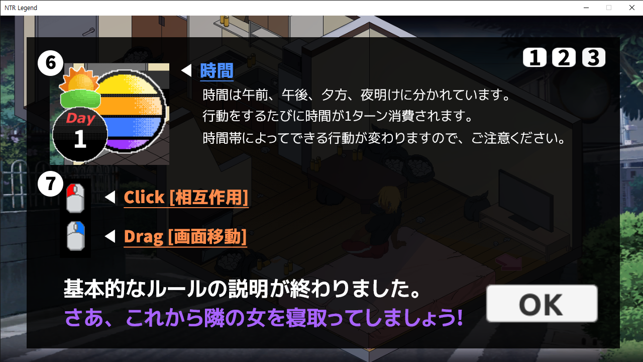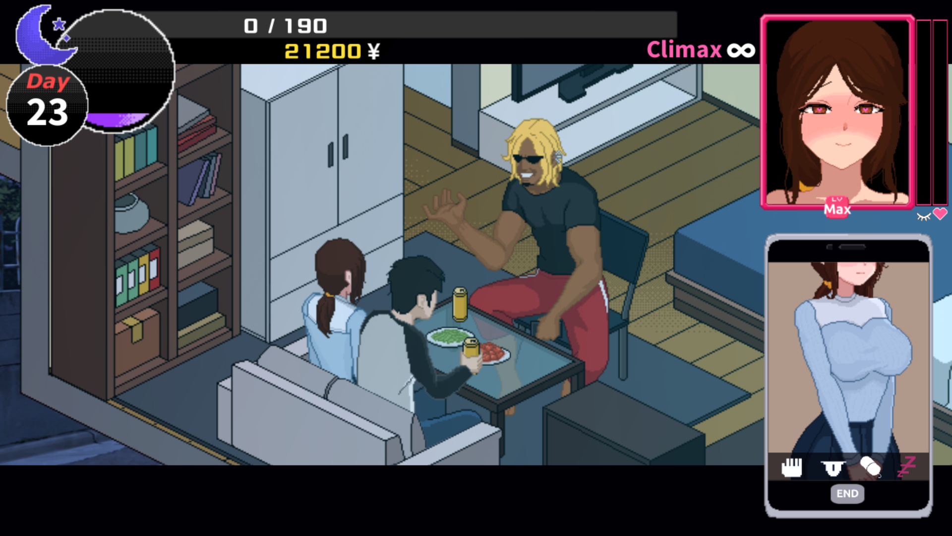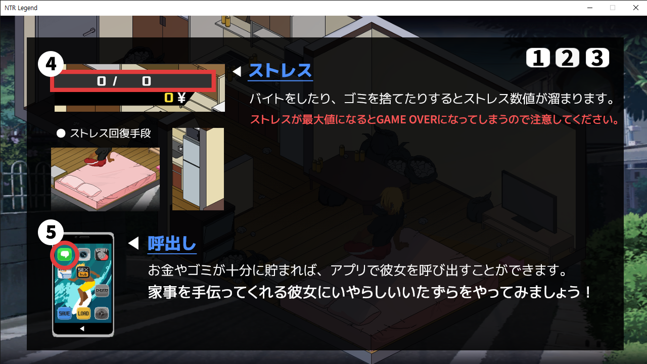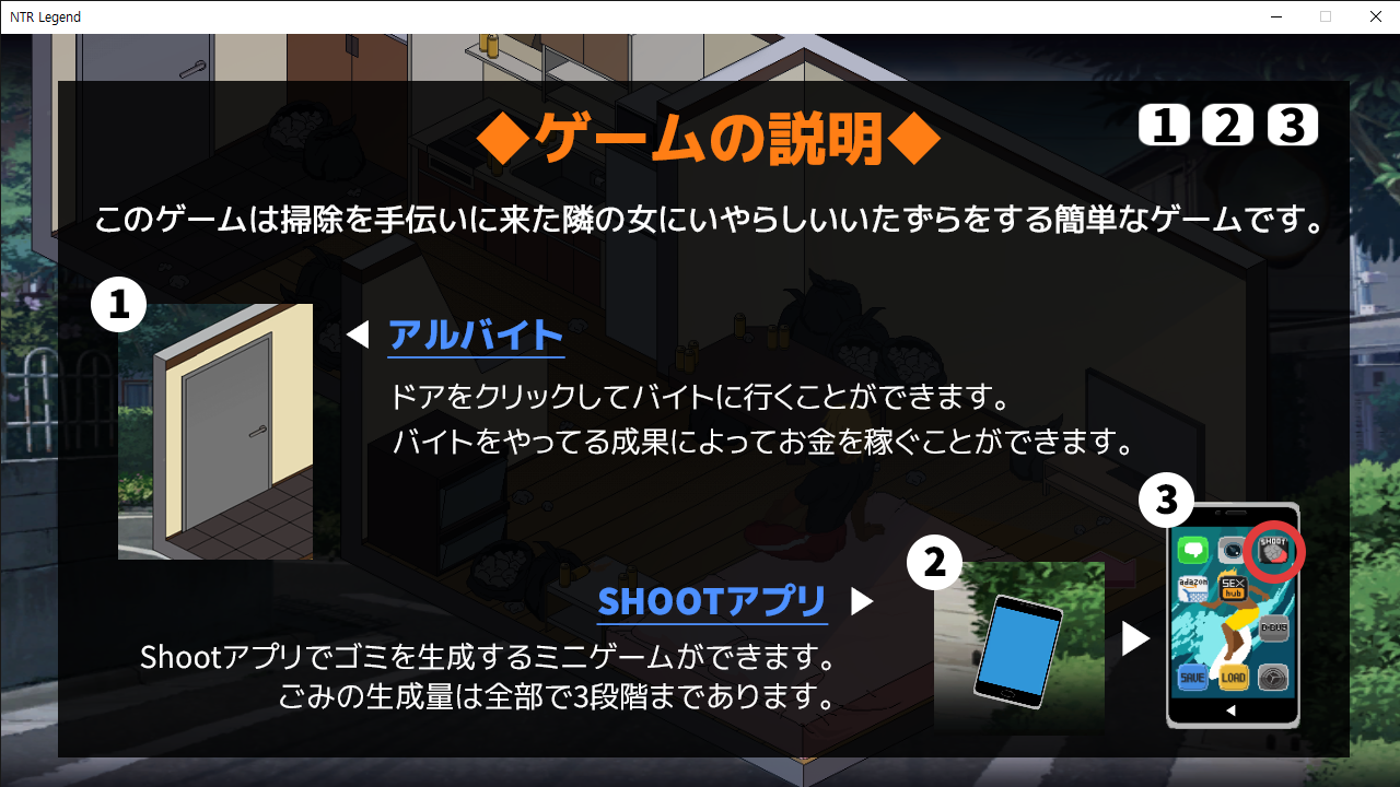 오늘의 주인공 금태양옆집 주부가 쓰레기를 치워주러 온다니 무슨게임의 설명 알바를 해서 돈을 벌고 쓰레기를 만들자스트레스가 높으면 죽습니다 돈이 모이면 그녀를 불러서 놀면 됩니다시간시스템있습니다외출은 이런느낌밖에는 귀여운 고양이가 있습니다냉장고에선 먹을 것일을 할 수 있는데 무려 병아리 감별사입니다배의 색을 보고 눌러주면됩니다상점맨 밑에 수입증가가 있으니 이거부터 사줍시다 고양이 먹이도 사줍시다옆집 아내를 불러 일을 시킬 수 있습니다 휴대폰 화면을 눌러야 진행할 수 있습니다밤이되면 강제 취침날이 바뀌면 스트레스가 확 주니 참고해줍시다냥이에게 밥을 줍시다스트레스가 해소된다는데 안되더군요돈도 열심히 벌고놀아도 줍시다야간알바가 돈을 많이줍니다심야 외출시에 가게 좋은게 많이 있지만 가격들이 비쌉니다 음란도 증가는 굳이?쓰레기 버리기는 연타를 해주면 됩니다 쓰레기버리는데 왜 스트레스가 쌓일까요고양이 밥은 일정이상은 못삽니다분신 망치도 사봤는데 스트레스가 없는 대신 보정없는 돈으로 들어오더군요 3천 5천으로 들어옵니다고양이에게 밥을 다 주면열쇠를 얻을 수 있습니다즐겁게 약점도 잡아주시고음란도 최대로눈이 맛갔잖아놀러가기 가능1주년 표시가 있던데 딱히 다른 이벤트는 없더군요밤에 나가면 남편과 친해질 수 있습니다몰카를 사서놀러간 다음 설치를 해주면 엿볼 수 있습니다비디오를 샀다면 남편에게 영상편지를 보낼 수 있습니다많이 친해지면 초대도 하는데와우수면약을 샀다면 추가 이벤트대꼴