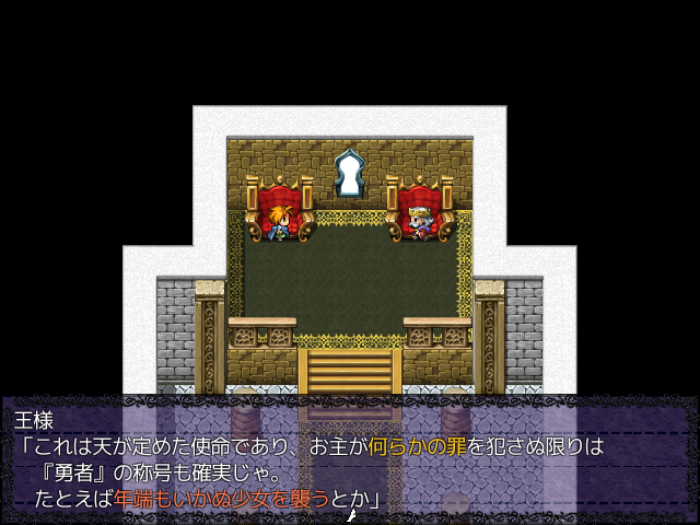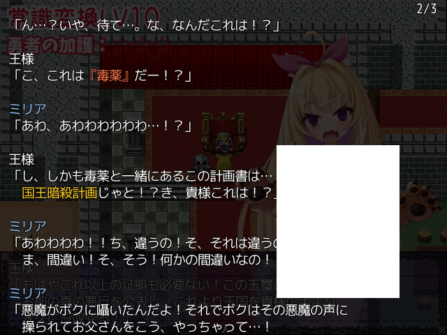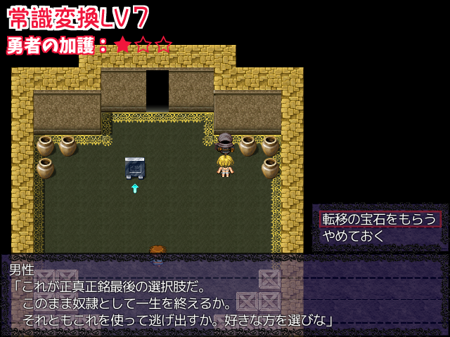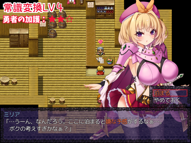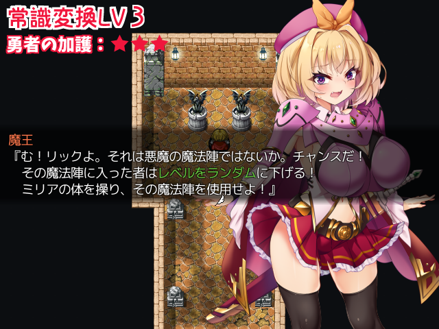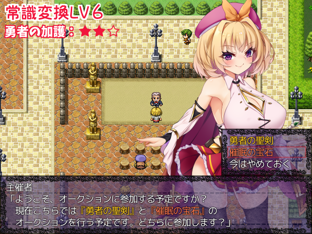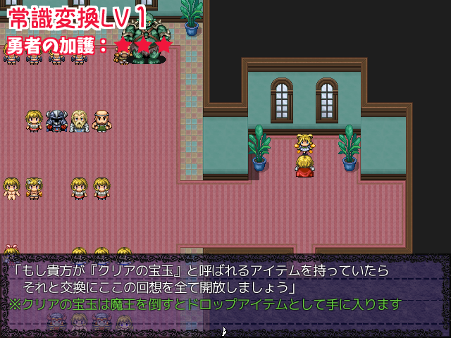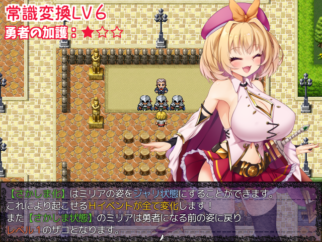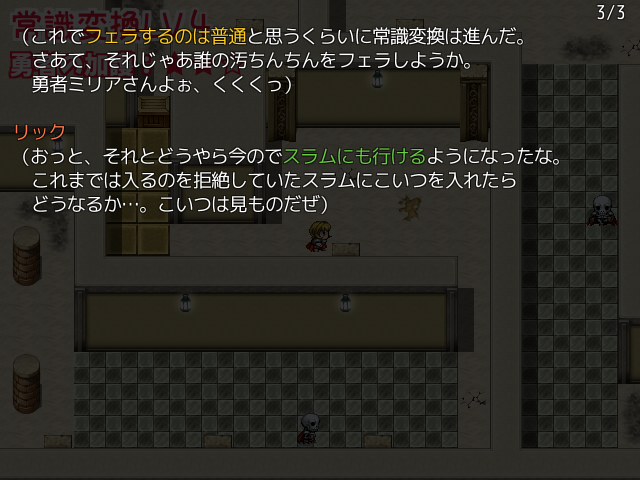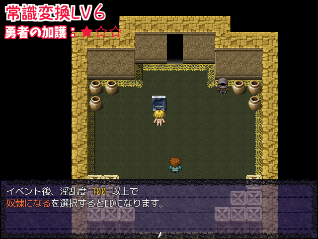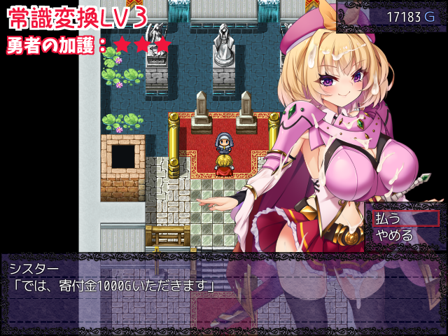 뭔가의 죄를 짓지 않는 이상 용사의 칭호는 확실하다는데척봐도 털어갈 듯한 소악마가 나옵니다용사 칭호를 뻇깁니다마왕과 합심하는 주인공용사의 힘을 얻어 강해졌습니다 도와주고 돈을 강탈해가는 용사님아무튼 삼종의 신기를 얻어야 합니다여기서 주인공이 빙의조종할려니 여러가호가 막고있어서 힘듭니다그래서 3종의 주물로 약화시킬 계획을 세웁니다강하다!바로 왼쪽에 말을 걸면 왕관이 있습니다상식개변 10이되면 다시 오자고 하네요하트하트바니걸이벤트를 보고 음란도 상승왼쪽위의 건물은 회상방이곳저곳 있으니 취향껏 보고 나갑시다여기도지금보니 가호들이 엄청납니다전이의 보석을 얻고처녀플시 특전있음바로 옆의 슬라임의 숲별건없더군요맨 오른쪽의 항구이건 별거 없습니다여기선 편도행열차몸을 주고 배를 구할 수 있습니다가운데 위에서는 아카데미가 있네요비싸여기 저주받은 보물이 있다는군요올라가다보니 서큐가 있는데 음란도를 상승시켜 주는군요열쇠가 필요하네여기도 못갑니다도구점인줄 알았는데 암거래상이것저것 파네요도구점은 더러워서 안된다고 해서 이곳저곳 찾아보니 신전이 있더군요여기서 치료가 가능하군요비싸열쇠를 사고천사를 죽입시다얘 자체도 싫어해서 그냥 죽일 수 있습니다상식개변렙이 오르는데 용사의 가호때문에 제한치가 있습니다내려가면레벨을 내리는 함정이 있습니다맨 오른쪽에서드디어 주물을 얻을 수 있습니다가호가 하나 사라져 최대치가 증가했군요바로 천사를 죽이고 슬럼가로 갈 수있게 됩니다여기 마을이 있는데싸워서 이기면돈을 주더군요 나중에 일부러 지기위해 로드했습니다오크의 동굴안쪽에서 잡아줍시다슬럼가도 있군요속옷사는데 왜 힘이 드는지 모르겠습니다슬럼가 여관은 맛집입니다여긴 약물중독이 되어야 들어갈 수 있습니다배타고 다음곳으로여기는 보물이 있다는데스위치를 누르니하나 더 있군요제국에 있답니다다음은 여기여기선 가짜용사라 불리고있군요아래는 얼음의 신전설녀에게서 눈물을 훔칠 수 있군요무한 부활을 합니다오른쪽 위 안쪽엔 드래곤이 있습니다여기는 죄다 얼어있군요불꽃의 모래가 필요합니다제국으로 가니적대관계가 되더군요여기도 템을 갈 수 있습니다졸업증이 있어야 들어갈 수 있군요저건곳은 비행정이 있어야 갈 수 있나봅니다여기선돈이 있군요더 밑으로 오니 사막이 있습니다여기서 안쪽으로 들어가서보물 랜덤가챠바로 옆의 마을로 가니3종 뭐시기의 옥션이 있다고 합니다여기선 비키니아머를 파는군요옥션가능 돈을 안낼 수도 있습니다그럼 안내면 되지아래로 삽시다응없어꺼저드디어 최면과 로리화가 가능해 집니다근데 전투에서 짐대충 3일자고얘한테 말을 걸어 탈출합시다일부러 질 수 있게 되었습니다돈 별로안줍니다제국에게도 잡혀보니주물에 대한 힌트를 주는거였군요다시 여기로 오네그냥 탈출 해보니 쉽긴한데 귀찮습니다여기도 일부러 져보고여기에 이벤트가 있더군요약물중독이 되기위한 노력 저거 3개쯤이면 걸리더군요로리로 옥션 오른쪽 위에 가면 지원을 받을 수 있으니 취향껏 합시다중독이 된 뒤 들어가서말을 걸어주고외쪽에는 이런저런걸 파는 군요위험한약사막마을 위쪽 저택으로 가서 메이드가 된다음만족도는 올릴 필요는 없는듯 합니다지하로 가줍시다바로여기에마지막 보물이 있습니다마왕에게서 비공정의 열쇠를 받습니다펫이 왜 여기있어효과는 발군10렙을 찍은뒤 여기로 오면제국에게로 가보랍니다일단 비공정을 타고왼쪽 위로 가니 천사 부활이 있습니다 의미있나여기는 나중에 보니 히든보스더군요졸업증은 챙겨야 하니 왔습니다 오른쪽에서 몸으로 숙제를 때웁시다제국으로 가면왕국을 꿀꺽한 사실을 들킵니다신전의 열쇠는 주네요말을 걸면 매국노엔딩이 가능합니다일단 마왕성으로 갑시다초록초록한 길만 가면 되더군요보스전 발리고마왕엔딩을 보았습니다이런저런걸 받고 강하게 뉴게임문젠 보스를 죽여야지 전회상 개방이 가능합니다 아 ㅋㅋ