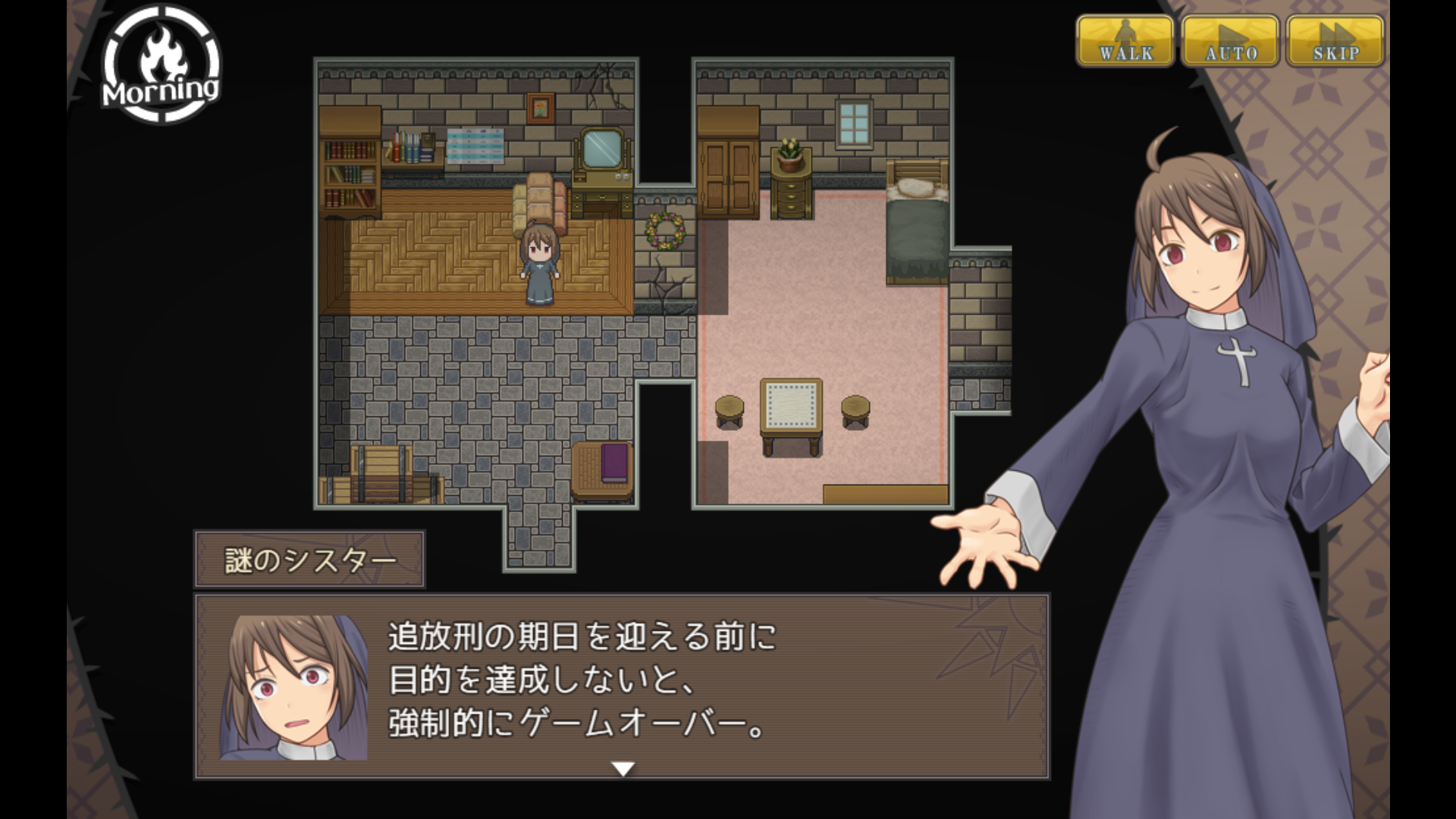 어서오세요 티셀의 마을에2개의 난이도가 존재합니다둘다 볼 수 있는거랑이건 해봤는데 아예 존엄루트로 갈 수 가 없습니다당연히 존엄루트로 갈것이기 때문에 위쪽선택시작하자마자 잡히는 주인공국가반역죄로 잡힙니다또한 몸에 저주가 있는데악혼이 들어가 있습니다얜 깡패아냐?카티가 친절한 아이인걸 봅니다이런 위선자를 이용해 먹으려는 교회놈들마을 사람들에게 스탬프가 있는데이걸 모아오면 추방기일을 연장해줍니다그리고 어머니가 물려준 4개의 거울을 이용해 먹으려고 합니다힘으로 제합할 수 없으니 마음으로 제압하려고 합니다일단은 마을 북쪽구역만 갈 수 있습니다당연 야간외출도 금지뜬금없이 등장하는 튜토리얼 수녀별건없고 키만 설명해줍니다시작상태메모도 여러개 있습니다저장은 맘대로 못합니다나가서 위로가면 교회가 있고왼쪽으로 가면 집이 있습니다2층 오른쪽이 방입니다 당연 거울은 가져가고 없습니다저기 위가 고물상거울내놔교회가 팔아놓곤 다시 2배가격으로 사갔답니다 남의 걸 맘대로 파는것도 어이없네4명에게 각각 줬다면서 알아서 찾으라고 합니다내일부턴 다른 곳도 갈 수 있게 됩니다해서 자고난뒤악혼이랑 드디어 이야기도 할 수 있게 됩니다어머니의 말에 따라 악혼을 쓰지 않았습니다이쯤되면 자아가 강해져서 동화가 힘들다고 하네요는 거짓말일 수도 있는게 악혼입니다확실한건 얘가 죽음 자기도 죽습니다다시 설명하루는 6시간으로 이루어져있고 7일로 이루어져 있습니다이벤트는 대부분 시간을 소모하고 잘만 쓴다면 하나만 남기고 세개짜리 이벤트를 볼 수 있습니다일수가 넘어가면 강제게임오버루트는 굴욕루트 존엄루트가 있습니다카티로는 해결할 수 없는 일이 있으니 친구를 많이 만들라고 하네요바로 내려가서 오른쪽에서 의뢰를 받을 수 있습니다무기점안에서 존엄을 올릴 수 있는 퀴즈가 있습니다주당 한번씩 할 수 있고 여기 말을 걸면 함정이 생깁니다첫퀴즈답은 이겁니다내려가서 오른쪽에서간단한 이벤트가 있습니다바로 내려가면 오른쪽 아래는 가지 말라고 합니다오른쪽 말고 왼쪽으로 가면 집이 있습니다 여기서 의뢰를 받아줍시다다시 위로 죽 올라와서 오른쪽 윗집은 병원입니다여긴 상회고 별건없습니다 아래 마법진은 잘 피해주세요죽 아래로 내려오면 지갑을 털리는데바로 내려오면 되찾을 수 있습니다저기는 아래와 이어져 있습니다여기 구석은거울이 있다고 구라치는 사람이 있습니다꺼져북측의 감옥에도 죄인구경좀 하고북측 가운데의 집에 들어가면 쫓겨납니다다시 남쪽으로 내려와서 이 사람에게 말을 걸면 악혼이 깃들었다고 무서워 하는 사람들을 볼 수 있습니다여관 2층에는 자고 있는 사람이여기는 거울이 있다고 구라치는 사람이 있습니다꺼져모른다고 합니다볼일 다 봤으면 여기로 갑시다악혼에 대해 조사를 할 수 있게 됩니다협력합시다올바른 교육덕분에 악혼도 위험을 받지 않는 이상 나오지 않습니다적의의 유무는 관계가 없습니다그 고통을 받을 각오가 되어있으면 악혼은 발동하지 않습니다이것 저것 조사가 끝나고 결과를 발표해줍니다하루 끝와선 그냥 잡시다