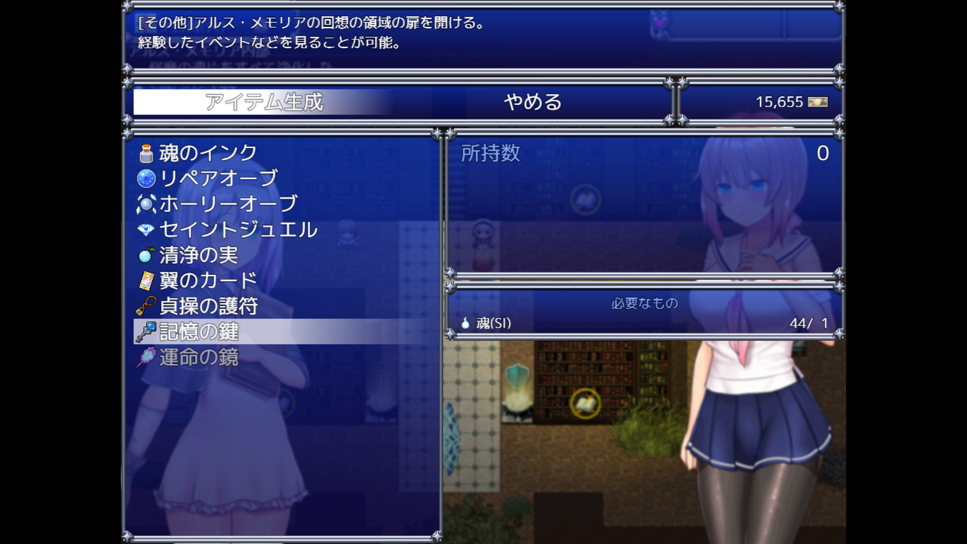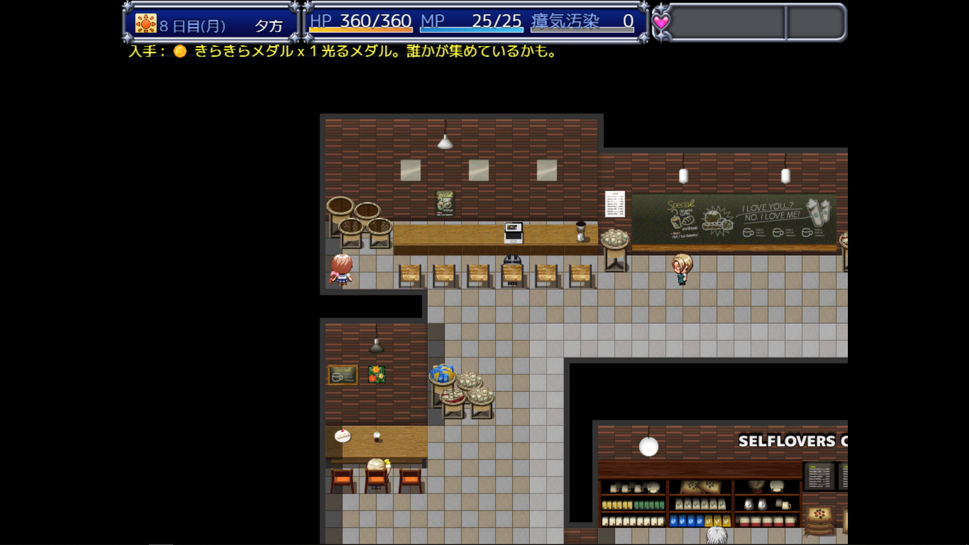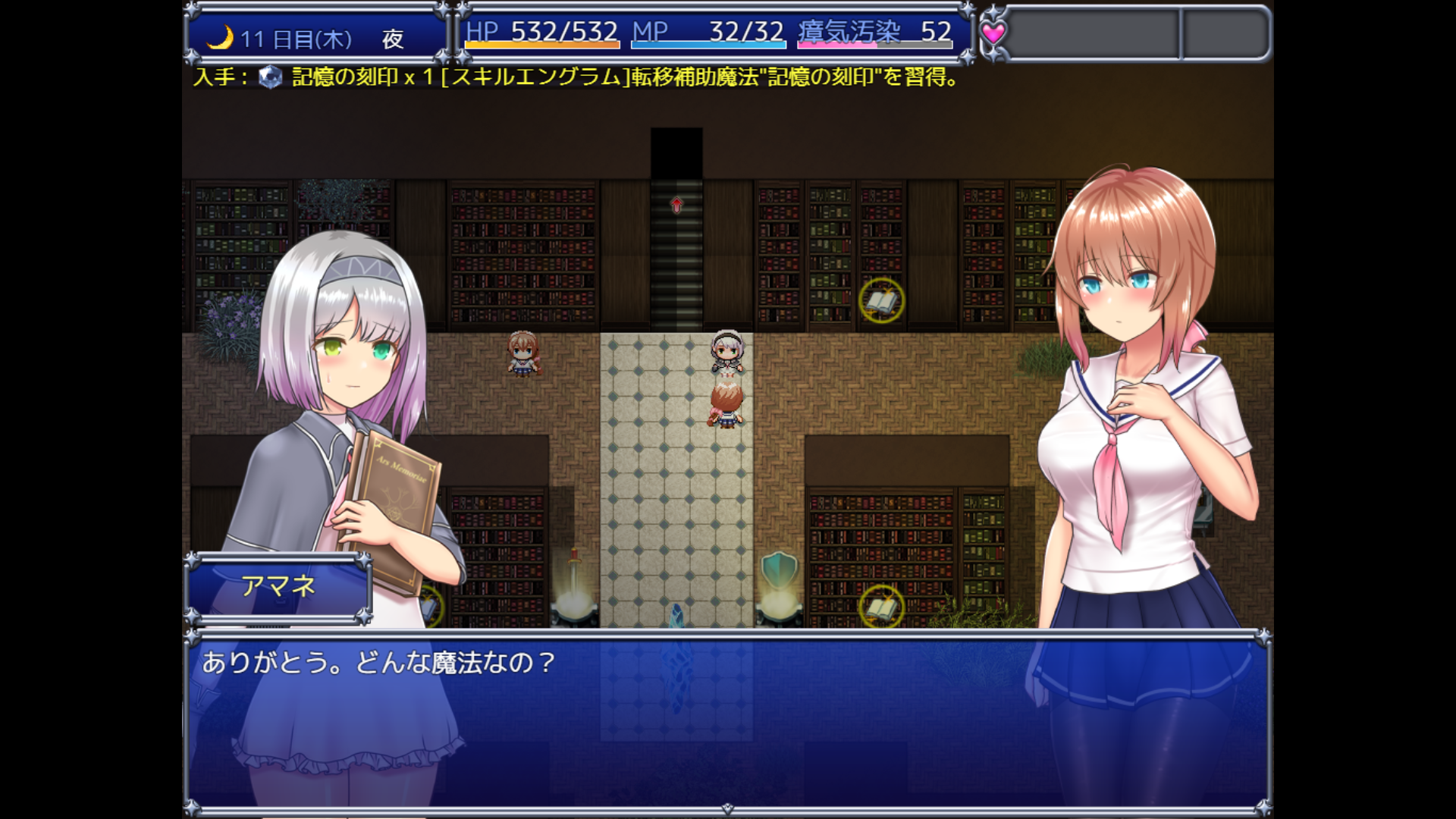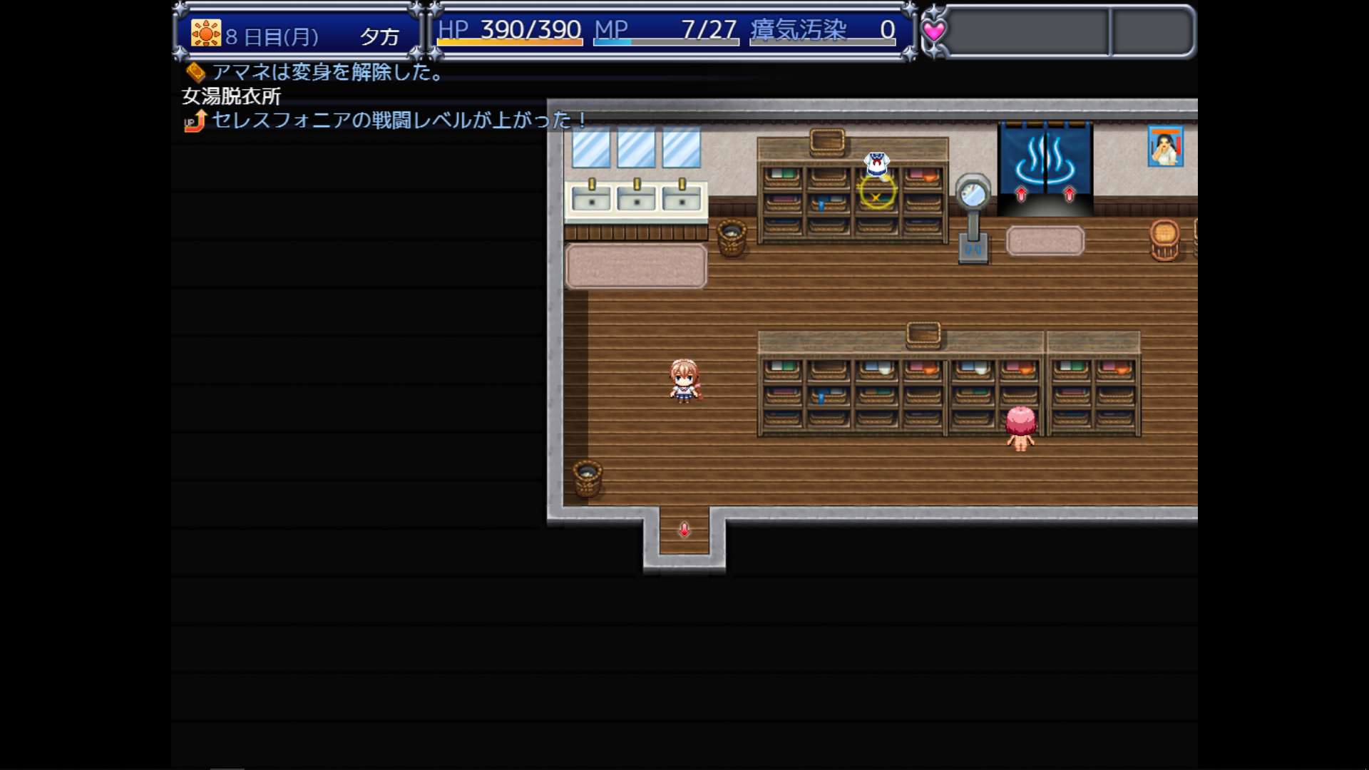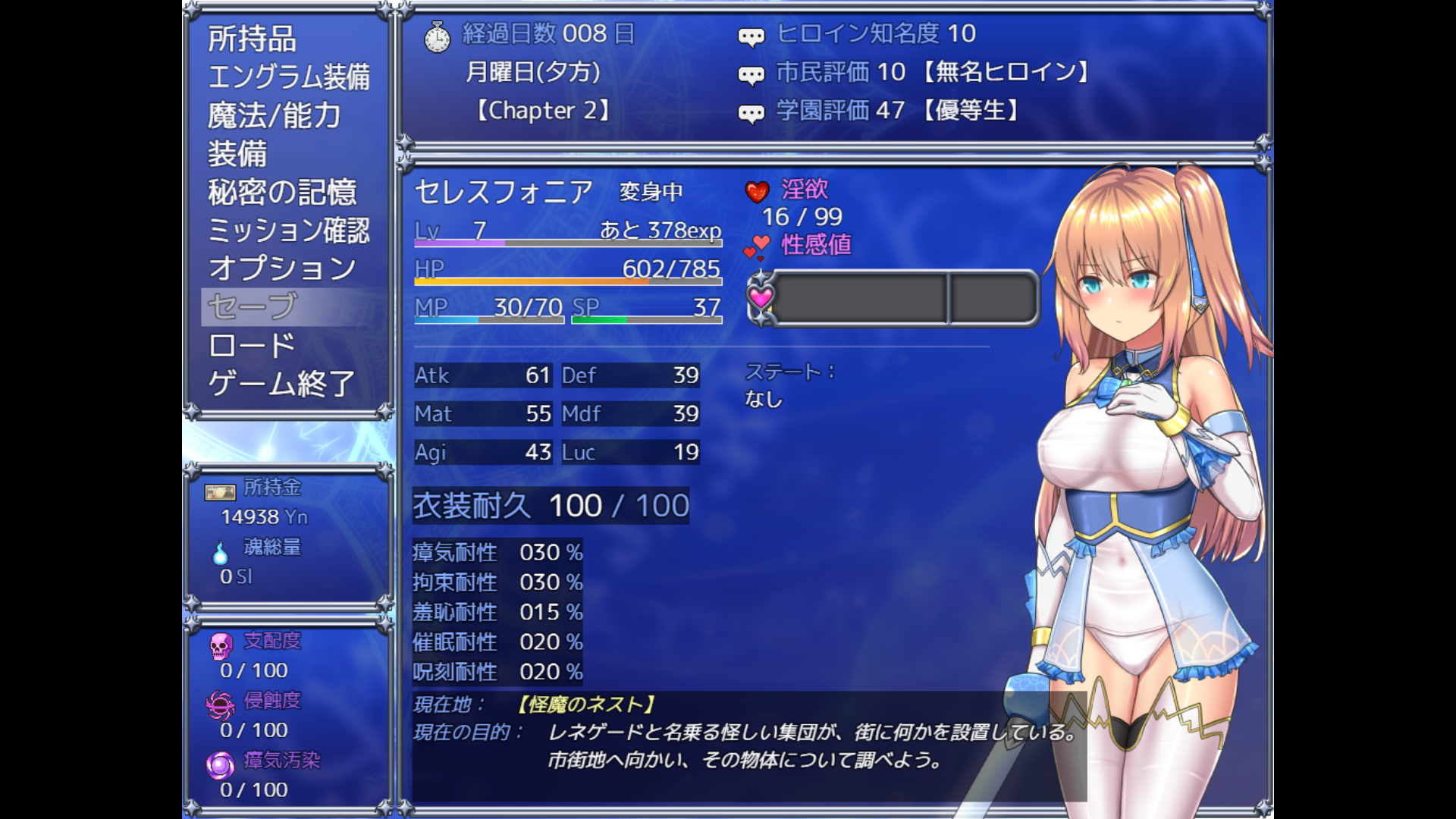 아빠가 돈주고 가라고 한 찻집별건없고평범한 알바가 가능합니다시거리에 와서위쪽에 찾던 물건이 있습니다이것저것 살 수도 있습니다이건 돈남는다고 샀더만 집에가니 하나 있으니 경영수영복을 사도록 합시다욕탕도 가봅시다퀘스트가 있는데별거없고남탕에 나옵니다처들어가면지금 싸우기엔 더럽게 셉니다한방에 반피가 깍이는데꾸역꾸역 이겼습니다당장은 별거 못합니다프리미션은세이브가 불가능합니다다 잡으면 클리어슬슬 이쯤되면 여기 뒤를 치면 한방에 죽일텐데 취향껏 노가다를 뜁시다여기 수영복이 있습니다여기도 아침 미션을 와보면당장은 아무것도 못합니다이걸 사면 회상방으로 갈 수 있고여기서 패배의 기억을 이용해 스텟을 올릴 수 있습니다회피템이 제일 좋은듯검은 개인적으로 이걸 썻습니다화학선생에게 말을 걸면1단계는 클리어가 됩니다나머지는 제작을 통해 만들어야 하는데 보통 4챕은 가야 주을 수 있습니다여기서 공격력을 올릴 수 있긴한데 큰 의미는 없습니다치유마법부터 죽 찍는게 좋습니다대충 2까지 만들어두고스토리를 진행해 봅시다이걸 깨면 되는데장기가 더럽게 쌓입니다이걸 깨면 메모리아가숏컷마법을 줍니다장기가 높을때 집으로 가면마사지숍 이벤트가 등장합니다역 앞으로 오면 레네게이드가 선전을 하고 있는데 나중에 가기로 하고마사지숍부터 갔습니다할머니가 마녀라네요여기선 잡템을 살 수 있는데묘하게 죄다 필요없습니다마사지는 침식도를 5정도 줄여주는거 같습니다대충 이쯤에서 이걸 샀습니다준비가 다 되었다면 말을 걸고마카이 지구로 끌려갑니다안쪽에 거점이 있습니다이것저것 물어볼 수 있고정보를 다 얻었으니 암살을 해줍시다템을 훔쳐가줍시다별건 없으니 죽죽 갑시다이렇게 쓰러져 있는 사람들을 구출할 수 있으니 구출도 해줍시다적이 있는데 평범하게 대화를 하시는회복도 해주고죽 올라가면 됩니다여자도 구해주고죽 위로가서이걸 피해서안으로 들어가서세큐리티를 꺼주도록 합시다여기로 들어가면 됩니다안쪽에 보스감시카메라에 찍히시는 아마네