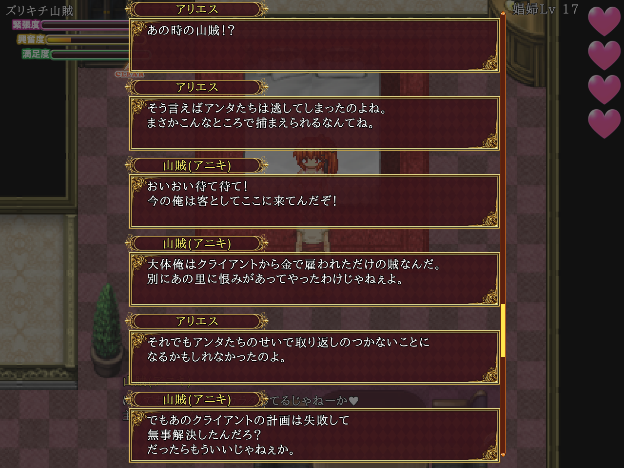 서큐버스들은 사신이 만든 녀석들이라고 배척받고 있습니다일단 시스터들에게 서큐버스와 공존을 설득해보자고 합니다돈좀 갚고전부 갚으면 2층을 가지겠다고 합니다템들을 주는데 매우 좋습니다길드로 가보면 이미 좀 늦었습니다그래도 서큐버스를 잡자고 하니 그렇게 막 하자고는 안하네요죄도 없는 서큐를 잡는건 역시 껄끄럽나 봅니다해서 교회에 물어보러 가는데교주가 급 사람이 바뀐듯이 말을 합니다뭔가 뒤가 있다고 생각하는 아리에스해서 정보실에서 정보를 얻으러 갑니다우리도 아는 정보를 말합니다 모르는걸 알려달라고1만골드를 정보료로 받습니다돈없으니 배우러옴스킬도 배우고까먹고 있던 곳대충 적당한 무기와올체커를 받을 수 있습니다 매우 좋습니다이건 처치보상을 두배로 해줍니다돈을 다 모았다면 말을 걸어주고진짜 호무라의 무녀인지 물어보네요이쪽도 서큐와의 공존을 원하네요좀더 위쪽의 정보상의 정보를 듣습니다일정기간 정보를 독점하는데대충 미인계를 써서 정보를 얻자고 합니다술에도 약합니다만 고급진 술만 마십니다그때 봤던 그 비싼 술들입니다일단 구경그때 남자 후리던 여자도 보고죽죽 말걸면 진입 대충 만족도를 높히면 되는 게임입니다또한 술을 먹이면 간단히 올릴 수 있습니다술을 안먹이면 절대 안오릅니다무기 숙련도도 올릴겸 노가다를 좀 했습니다이건 구립니다카운터시 50퍼 확률로 즉사효과 오오 이거만 있다면 나도 투기장 제왕?는 꿈이였습니다 이와중에 여기몹들은 즉사내성을 달고 있더군요 개쓰레기입니다돈을 모으는 김에 이거도 클리어꺼져배우 좋은 무기를 얻습니다비전서도 꽤 좋습니다여기도 a랭크가 되고 좋은 무기를 얻습니다다음은 15만이거도 좋은 무기입니다이거도 꽤나 좋더군요술은 하나만 사면 됩니다 저처럼 돈낭비하지 마세요하나 먹이면다 찹니다반지를 얻고전에 숲 앞에 있던 모험가가 이녀석의 부하입니다정보가 떡상할때까지 묵혔다가 판다는군요여튼 창관에서도 일을 할 수 있게 됩니다취향껏창관렙에 따라 등장하는 사람도 늘어나고하루에 일정 수만 즐길 수 있습니다이렇게 좋아하는 기술은 하트가 뜹니다혼욕도 가능해지고중간에 산적도 오는데 그때 그 산적이군요 ㅋㅋ대충 즐겼다면 진행말을 걸어주면안쪽에서 서큐가 잘 자고 있습니다일어나자기가 아닌 다른 서큐버스가 한 짓이라고 말해줍니다설마빨리 돌아가봅시다당연히 난리가 나있고이리스가서큐버스와의 혼혈이란걸 알아냅니다손절때리는 교주이리스의 공개처형후 자기는 교주직에서 사퇴를 한다고 합니다뭐지 고아원에서의 모습은 가짜인가해서 어떻게 할지 회의를 합니다투기장을 통해 교회의 지하로 가려고 합니다여기서 간단한 정비를 한 뒤투기장으로 가면 시비털립니다니들이 이리스에 대해 뭘 아냐고 물으니 모른다고 합니다 뻔뻐하네아리에스에게 짬때립니다들어가면 역시나 한놈이 막아섭니다