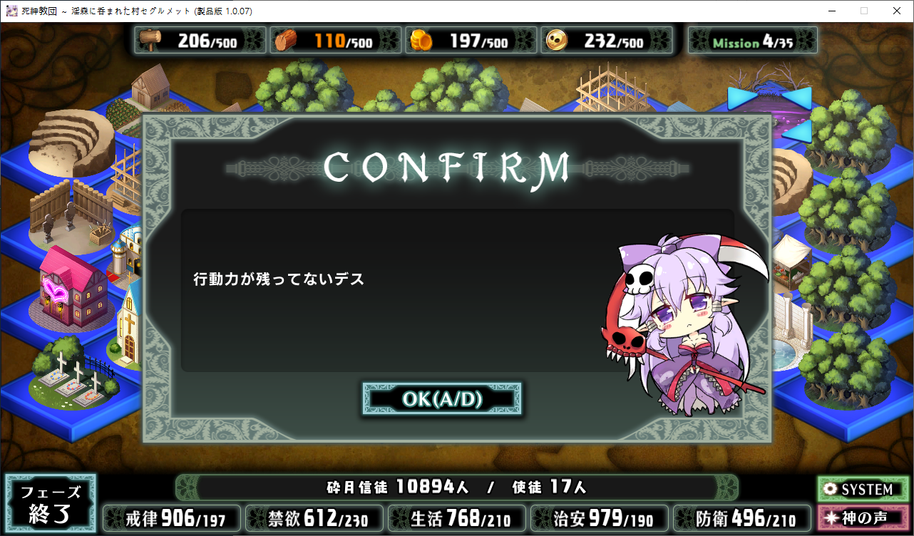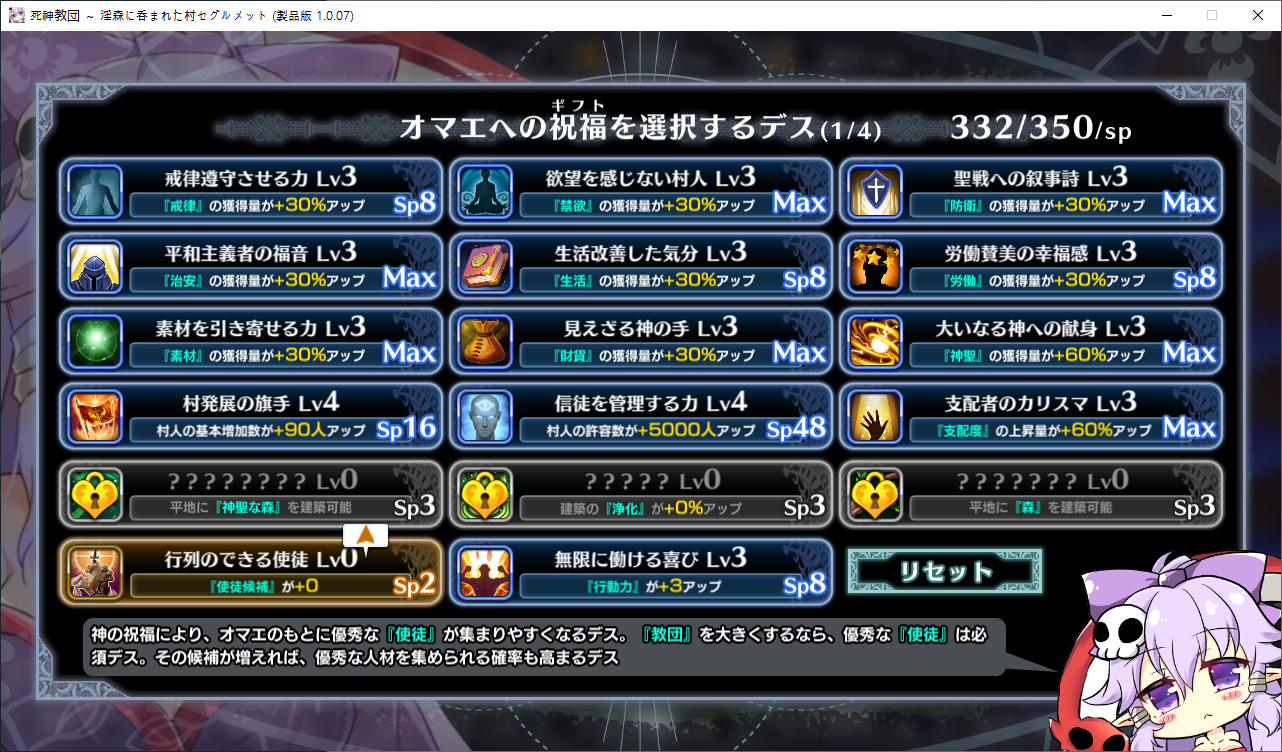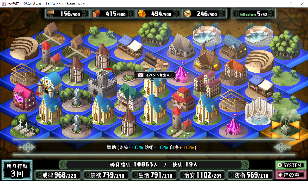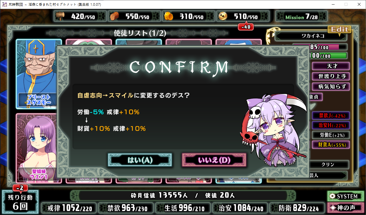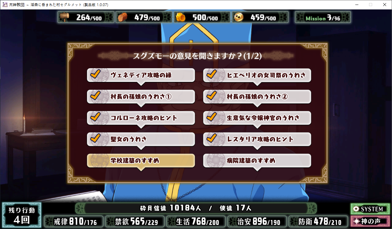 루시아가 다시 찾아왔네요맨 마지막이 칭찬이니 칭찬을 해줍시다교단이 커지면서 생기는 치안문제를 해결하기 위해 파견왔습니다 감시하러 온거죠아무튼 성녀의 영입으로 교회시설의 효과가 상승합니다하다보니 기적을 일으켜달라고 부탁하는 사람도 있던데뭐 해줍시다이분은 따로 지배도 못올리네요부족했던 재화나 신성에 숨통이 트이기 시작합니다이건 신자모집칸이 늘어나서 보다 더 좋은 놈을 고르기 쉬워집니다이것도 사서 지어줍시다개성변경확인은 보기 편해서 좋습니다 일일히 공략볼거도 아니고 다만 소비치가 2배가 되니 주의성녀님은 일 진짜 안하네요둘다 짓는게 좋겠다는 부교주열심히 주워줍시다숲을 개간하는 중 샘도 발견할 수 있네요독 높도 발견하는데 이는 정화시키면 샘이 됩니다아저주받은 건물이 있어서 이벤트 발생자기의 키가 크지 않는 것도 저주의 탓이라 생각합니다신자에게 해주의 기적을 일으켜준다니 신자가 됩니다오저주듣고 웃겼던방어시설의 효과가 증가합니다검 쪽이 뭔가 수상하다네요저택도 지어줘야 겠습니다잠시 뒤 포르수도 옵니다방어시설을 지으면 재화에 마이너스가 붙긴합니다저주받은건물 이야기하는데 어쩌다 보니 이미 조건을 맞춰서 영입을 해버렸네요숲을 개간하다보면 성지도 발견할 수 있습니다성능은 막 좋진 않지만 일단 혹시모르니 받아뒀습니다이분도 방어시설의 효과를 증가시켜줍니다죽죽 개발을 해봅시다성스러운 심볼도 지어주고협력자도 초대를 해줍시다병원을 지으면 많은 의사들이 이주를 해옵니다이런 약사들은 마녀로 취급받을 수 있기 때문에 도망쳐온다고 하네요여튼 저택을 두개를 지으면 영주의 딸이 찾아옵니다협력자의 정체였네요이제부터 전력으로 지원을 한다고 합니다저택을 지었으니 거기에 이주할 생각이라고 하네요뭔가 수상쩍은데같이 병원을 지었기 때문에 상급신관도 찾아옵니다왜 왔나 헀더니 파벌싸움때문이군요여튼 신자로 받아들입시다문젠 자리가 꽉차서 다음 신자리스트에서 알아서 낚아와야 합니다성기사인데 음문이 달린자리가 비면 이렇게 영입을 해주면 됩니다거의 대부분 시설의 효과가 증가합니다개성보는건 이렇게 편하기 때문에 찍는게 좋습니다 근데 이상하게 행동치도 2배로 들더군요밤에 이벤트가 있어서 찾아가봤는데영느낌이 안좋네요도르마무!를 하긴 했는데 결과적으론 보긴 해야하는 이벤트입니다커엽이분은 딱히 일을 같이 안해도 면죄를 얻을 수 있습니다상급신관을 영입하면 생산시설이나 병원의 효과가 증가합니다그녀를 조심하라는 부교주풍기를 문란하게 만들 위험이 있다고 합니다루시아도 조금 공략을 하다보니 빠르게 정화시킬 필요가 있다고 경고를 해오니 빠르게 노려줍시다이분도 공략하다보면 이벤트로 신자가 훅훅 늘어납니다슬슬 이분들도 최종전투에서 사기카드를 쓰기 시작하더군요 3턴 절대무적 뭐임패 주작 머임여튼 공략완료지금보니 씬 회상에 하드모드 클리어가 필요하네요 너무하네