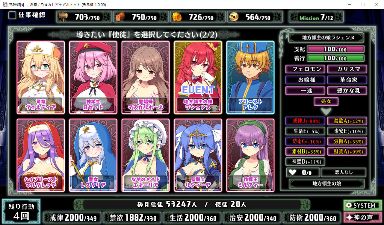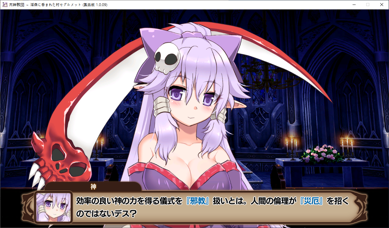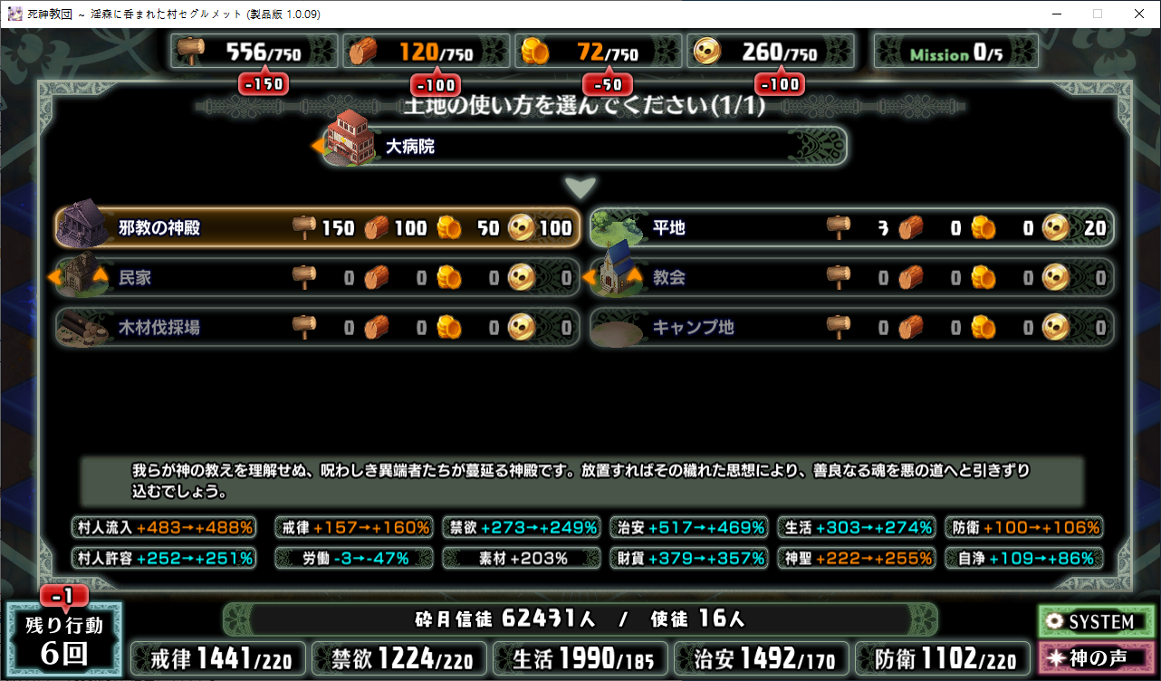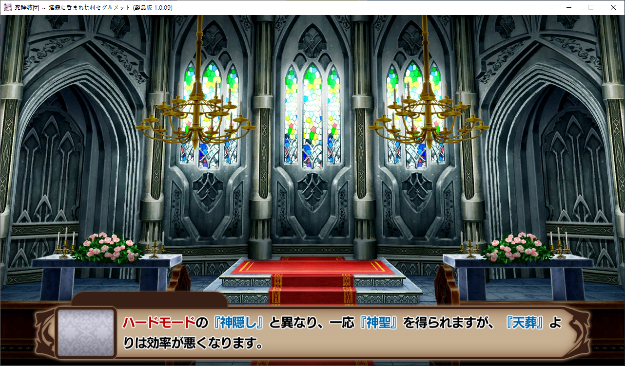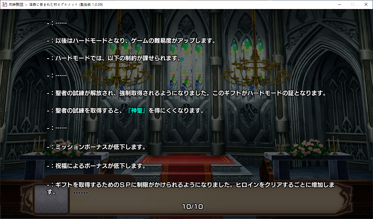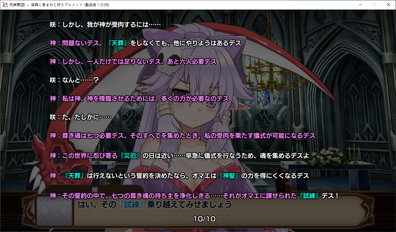 당장은 신성한 숲은 못짓네요이벤트를 더보면 역시 이분이 포레스티아였군요정확히는 화신입니다숲을 개간한 나머지 신앙의 대부분을 그여자에게 뺏겼다네요이제 개발해도 되나?아무튼 자기는 정화로 인해 저의 교단의 일부가 되었습니다신성한 숲을 지어서 그여자를 막아달라고 합니다저주받은 숲 자체는 자신의 일이 아니라고 합니다숲을 지으라고 해서지어줬습니다참고로 여기서 라센느가 이미 있다면 엔딩이 고정되어 못합니다 신패치에서는 신성바치고 리스타트가 생겼더군요덕분에 다시해서 다시 왔습니다협력자 미션을 클리어하지 않으면 영주의 딸 미션으로 바뀝니다이야기를 하고아래를 선택그다음 콜로네를 조수로 줍시다멋대로 동굴이 생겼는데 부숴지지가 않네요치료약은 나무의 수액이라고 합니다저주가 아니라 오히려 저주를 막아주는 역활이였다고 하네요다른 미션을 줍니다특급건물의 레서피를 받습니다이걸 클리어 해야 합니다가격들도 장난아닙니다완공할 필요는 없으니 바로 클리어그러면 영주의 딸이 찾아옵니다벌써부터 정치질을 하고 있습니다하루가 지나면 에레리아 이벤트가 뜹니다신성한 시련을 부과합니다나무를 10개나 지어야 합니다지어주고축복을 받아준 뒤이제 라센누를 찾아가면 됩니다디져모든 면죄가 듀얼로 구성되어 있어서 꽤나 시간을 잡아먹습니다마족구경도 하고라센누를 클리어하면 드디어 갓핸드가 해금됩니다마지막 시련입니다위를 선택하고 죽어줍시다주인공은 사신대행이 되네요 사신창관의 앞쪽이야기 인듯 합니다5트인데도 시간이 장난아니네요천장을 거부해보라고 충고합니다리트라이 이거 지금보니 뭔가 버그인지 캐릭터 스텟을 바꿔놓은게 다음에도 적용되더군요아무튼 천장을 거부하면사신이 나와서 이야기를 합니다 위를 선택그러면 하드모드로 변경됩니다기프트는 히로인을 정화시킬때만 줍니다미션보너스 감소 축복보너스 감소 등등 여러가지 디메리트가 있습니다sp가 감소하고스킬도 다시 찍어줍시다하드모드 개시다음껀 취소하면 안됩니다보면 이 대사도 약간 다릅니다천장이 카미카쿠시로 변하며 보상도 엄청 줄어듭니다신자들이 실종됩니다특성을 가지고 있지 않으면 보너스가 엄청 줄어듭니다카미카쿠시가 일어나면 거의 1퍼정도 신자수가 줄어듭니다히로인이 영입되면 바로바로 이걸 찍어줍시다 신성과 돈을 아낄 수있습니다바로 sp도 늘어나니 투자를 해줍시다최종 신자는 4만이 넘어야 하기 때문에 신자수도 잘 챙겨줍시다이 대사도 약간 달라집니다죽죽 지어주고이건 선택지가 고정되더군요저주는 둘다 상관없었습니다뭔가 눈이 이상한데히로인을 다 모으고 천장을 거부하면최종보스 사성녀 레스타리아가 나타납니다신이라는데근데 왜 이건 계속하는거지아군이야 적이야신의 대리인이라서 그렇다네요레스타리아는 성녀이며 자기이기도 한다네요거기다 힘도 빼앗겼다는데 너무 멍청한 신인듯천장의 영혼을 빼앗겨서 그렇다고 합니다사교는 역시 저의 교단이 맞았군요어떻게 모을거냐고 하니아예 사교의 신전을 지어서 함정을 파자고 합니다공격스킬도 마저찍어주고이걸 지으면 최종전에 돌입합니다교회를 제물로 바쳐서 지었습니다사교의 신도들이 모이고마지막 대결입니다갓핸드 맞좀봐라신의 카드금지라던가죽지않는다던가 사기스킬이 많습니다지면 걍 바로 엔딩갓핸드만 5개 들고가니 딜카드가 딸리더군요여튼 이기면 끝5시간걸렸습니다신의 자비로 부활하고천장이 좋은건 아니란걸 드디어 알아챈 사신은 돈으로 신성을 모으려고 합니다앤드리스 모드 해금천장은 돈으로 치를 수 있게 됩니다신성의 획득은 줄어듭니다이걸 찍고??굳이 여기서 해방을 따로 눌러야 되더군요