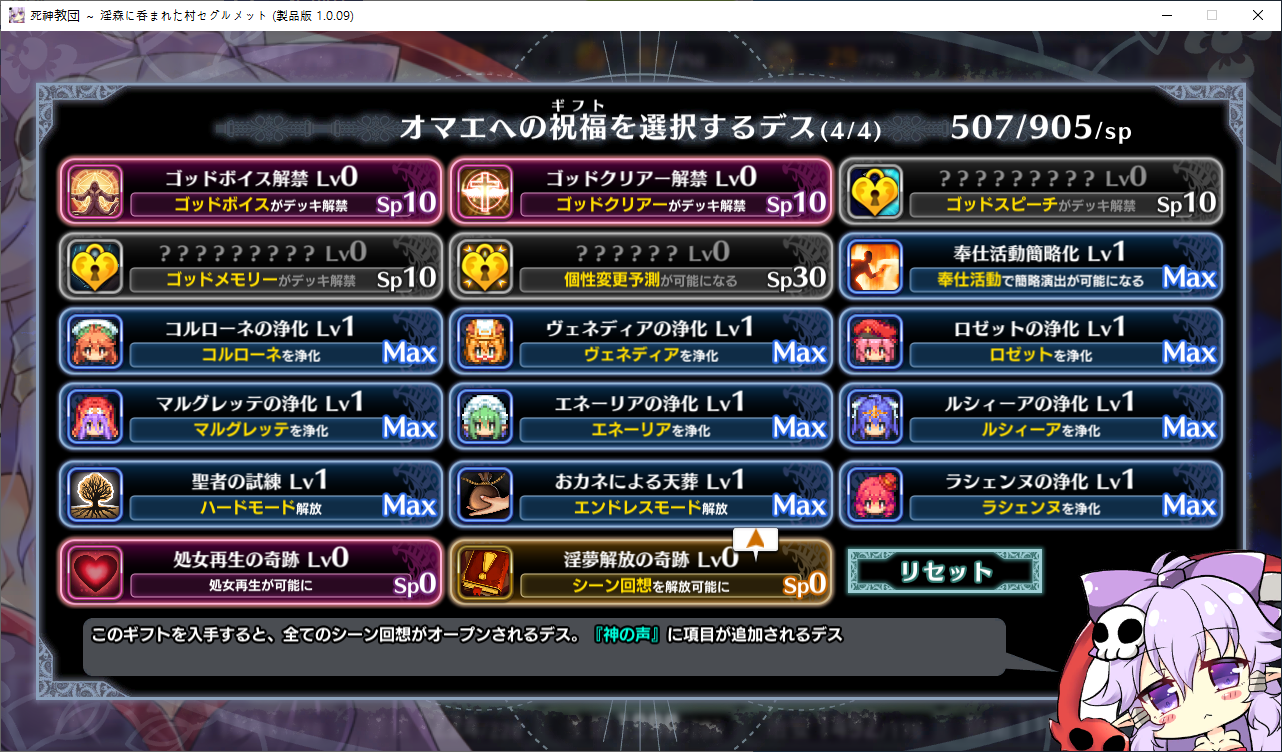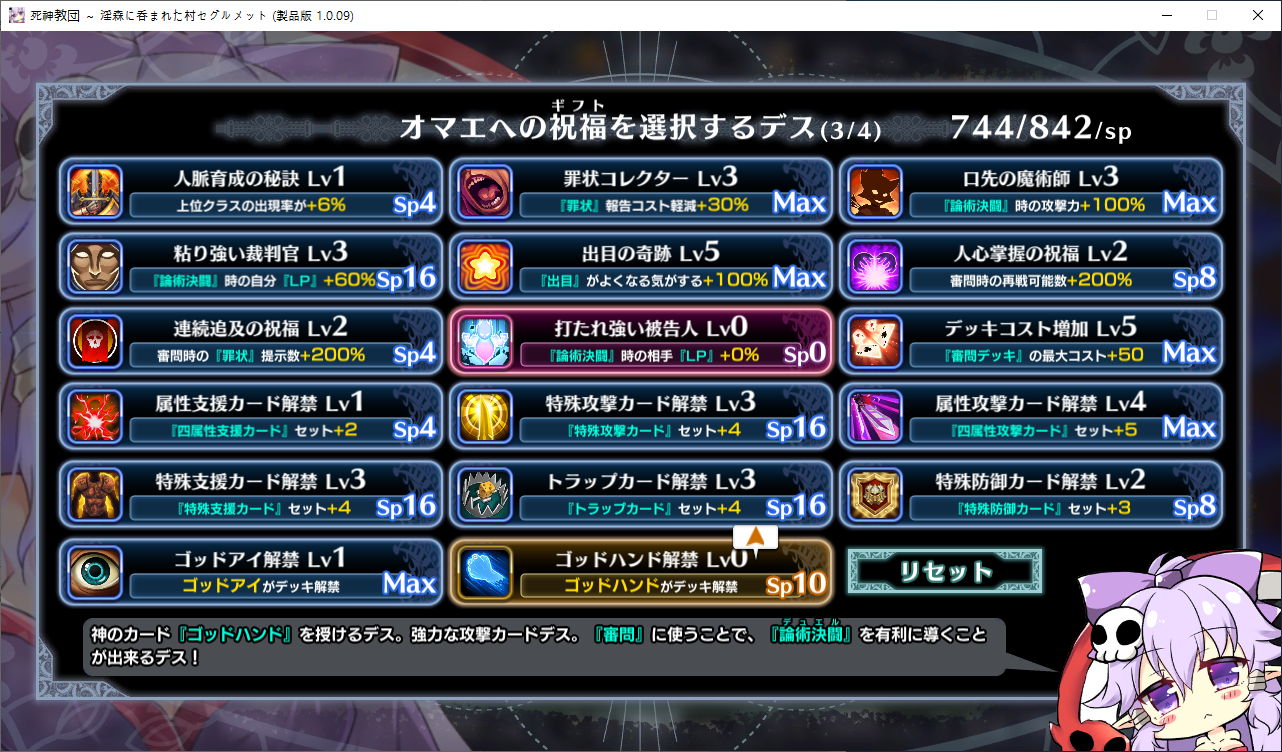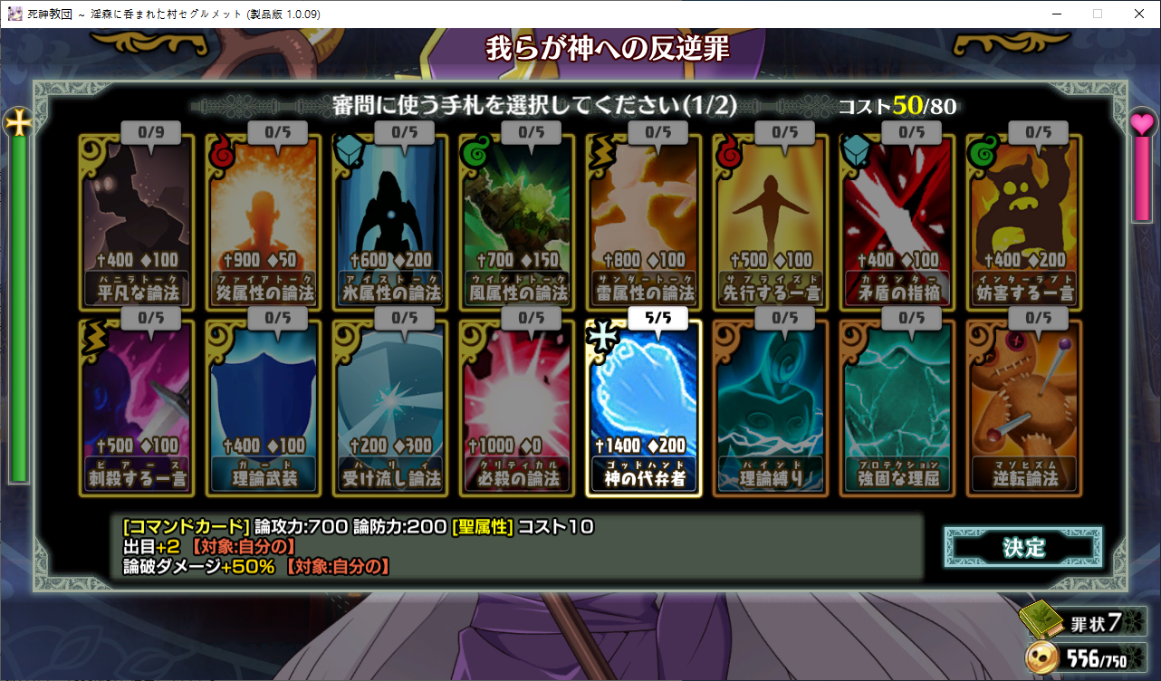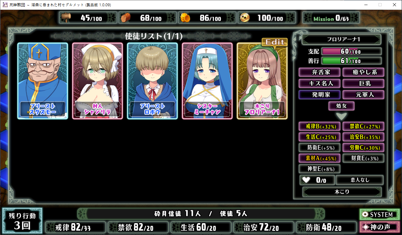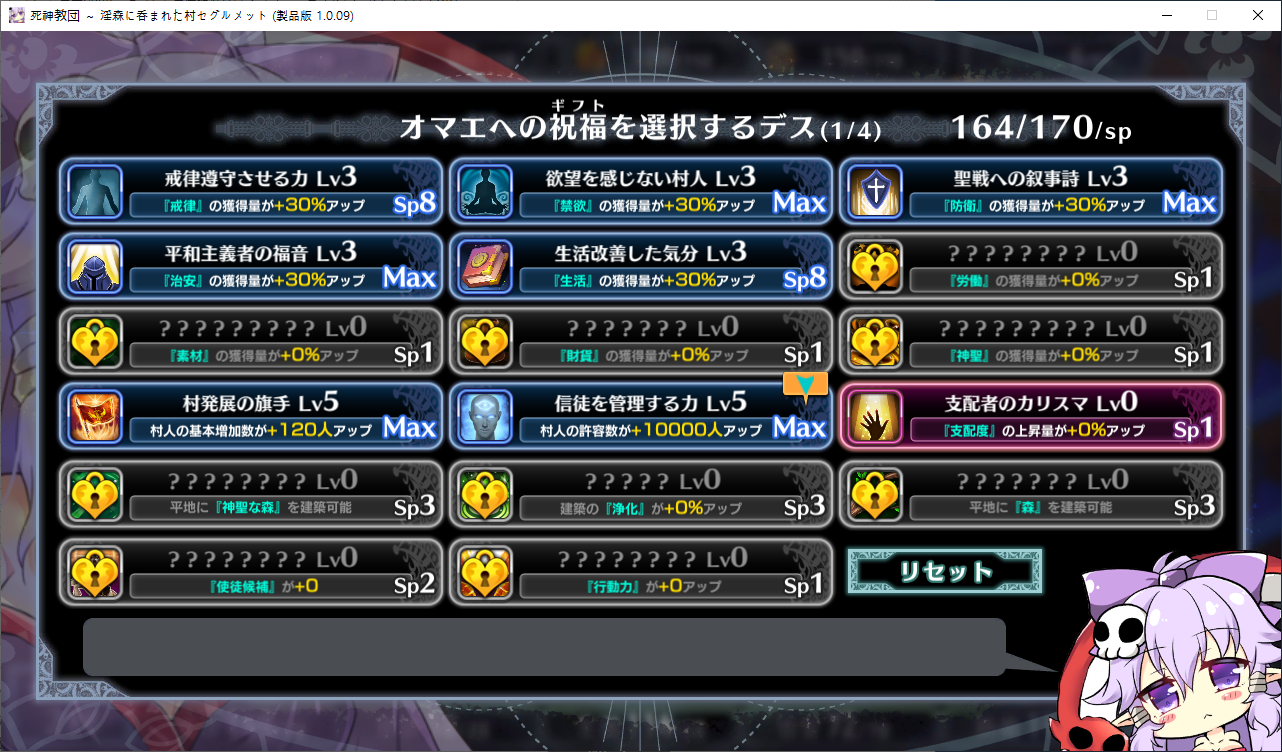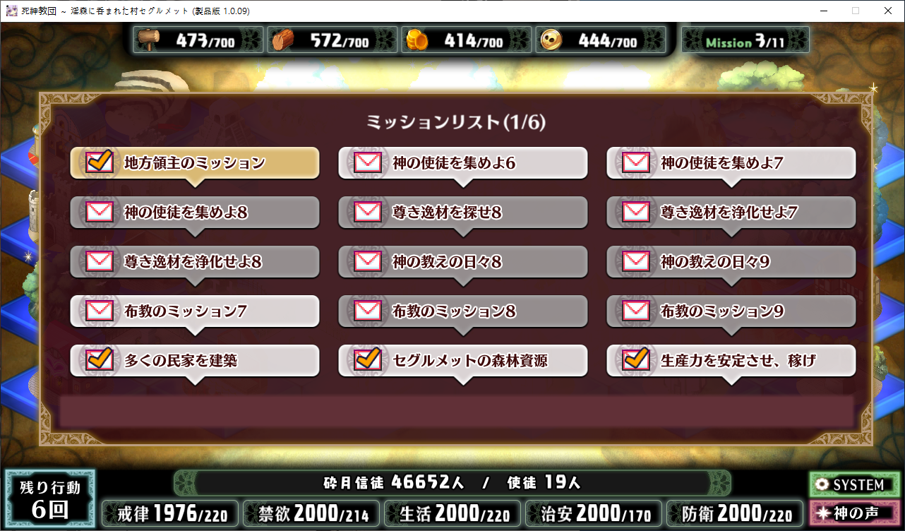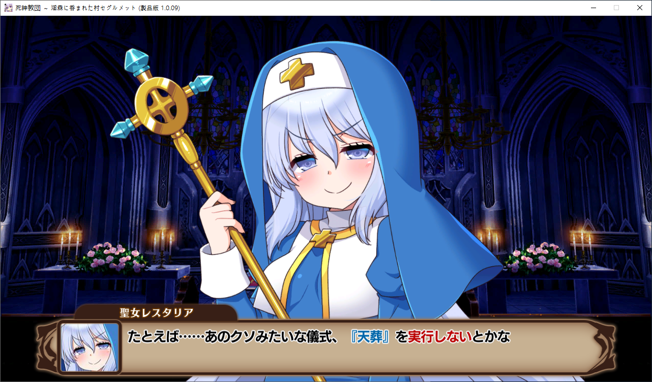 당장은 신성한 숲은 못짓네요이벤트를 더보면 역시 이분이 포레스티아였군요정확히는 화신입니다숲을 개간한 나머지 신앙의 대부분을 그여자에게 뺏겼다네요이제 개발해도 되나?아무튼 자기는 정화로 인해 저의 교단의 일부가 되었습니다신성한 숲을 지어서 그여자를 막아달라고 합니다저주받은 숲 자체는 자신의 일이 아니라고 합니다숲을 지으라고 해서지어줬습니다참고로 여기서 라센느가 이미 있다면 엔딩이 고정되어 못합니다 신패치에서는 신성바치고 리스타트가 생겼더군요덕분에 다시해서 다시 왔습니다협력자 미션을 클리어하지 않으면 영주의 딸 미션으로 바뀝니다이야기를 하고아래를 선택그다음 콜로네를 조수로 줍시다멋대로 동굴이 생겼는데 부숴지지가 않네요치료약은 나무의 수액이라고 합니다저주가 아니라 오히려 저주를 막아주는 역활이였다고 하네요다른 미션을 줍니다특급건물의 레서피를 받습니다이걸 클리어 해야 합니다가격들도 장난아닙니다완공할 필요는 없으니 바로 클리어그러면 영주의 딸이 찾아옵니다벌써부터 정치질을 하고 있습니다하루가 지나면 에레리아 이벤트가 뜹니다신성한 시련을 부과합니다나무를 10개나 지어야 합니다지어주고축복을 받아준 뒤이제 라센누를 찾아가면 됩니다디져모든 면죄가 듀얼로 구성되어 있어서 꽤나 시간을 잡아먹습니다마족구경도 하고라센누를 클리어하면 드디어 갓핸드가 해금됩니다마지막 시련입니다위를 선택하고 죽어줍시다주인공은 사신대행이 되네요 사신창관의 앞쪽이야기 인듯 합니다5트인데도 시간이 장난아니네요천장을 거부해보라고 충고합니다리트라이 이거 지금보니 뭔가 버그인지 캐릭터 스텟을 바꿔놓은게 다음에도 적용되더군요아무튼 천장을 거부하면사신이 나와서 이야기를 합니다 위를 선택그러면 하드모드로 변경됩니다기프트는 히로인을 정화시킬때만 줍니다미션보너스 감소 축복보너스 감소 등등 여러가지 디메리트가 있습니다sp가 감소하고스킬도 다시 찍어줍시다하드모드 개시다음껀 취소하면 안됩니다보면 이 대사도 약간 다릅니다천장이 카미카쿠시로 변하며 보상도 엄청 줄어듭니다신자들이 실종됩니다특성을 가지고 있지 않으면 보너스가 엄청 줄어듭니다카미카쿠시가 일어나면 거의 1퍼정도 신자수가 줄어듭니다히로인이 영입되면 바로바로 이걸 찍어줍시다 신성과 돈을 아낄 수있습니다바로 sp도 늘어나니 투자를 해줍시다최종 신자는 4만이 넘어야 하기 때문에 신자수도 잘 챙겨줍시다이 대사도 약간 달라집니다죽죽 지어주고이건 선택지가 고정되더군요저주는 둘다 상관없었습니다뭔가 눈이 이상한데히로인을 다 모으고 천장을 거부하면최종보스 사성녀 레스타리아가 나타납니다신이라는데근데 왜 이건 계속하는거지아군이야 적이야신의 대리인이라서 그렇다네요레스타리아는 성녀이며 자기이기도 한다네요거기다 힘도 빼앗겼다는데 너무 멍청한 신인듯천장의 영혼을 빼앗겨서 그렇다고 합니다사교는 역시 저의 교단이 맞았군요어떻게 모을거냐고 하니아예 사교의 신전을 지어서 함정을 파자고 합니다공격스킬도 마저찍어주고이걸 지으면 최종전에 돌입합니다교회를 제물로 바쳐서 지었습니다사교의 신도들이 모이고마지막 대결입니다갓핸드 맞좀봐라신의 카드금지라던가죽지않는다던가 사기스킬이 많습니다지면 걍 바로 엔딩갓핸드만 5개 들고가니 딜카드가 딸리더군요여튼 이기면 끝5시간걸렸습니다신의 자비로 부활하고천장이 좋은건 아니란걸 드디어 알아챈 사신은 돈으로 신성을 모으려고 합니다앤드리스 모드 해금천장은 돈으로 치를 수 있게 됩니다신성의 획득은 줄어듭니다이걸 찍고??굳이 여기서 해방을 따로 눌러야 되더군요
