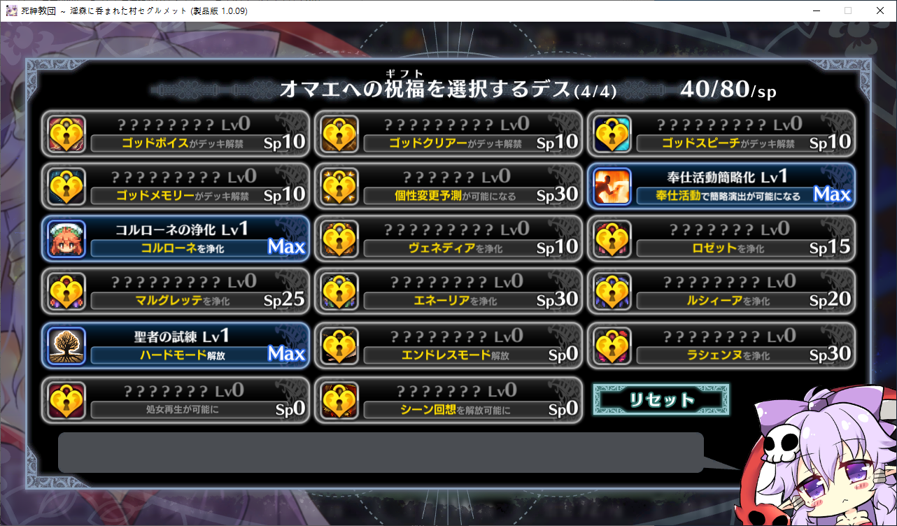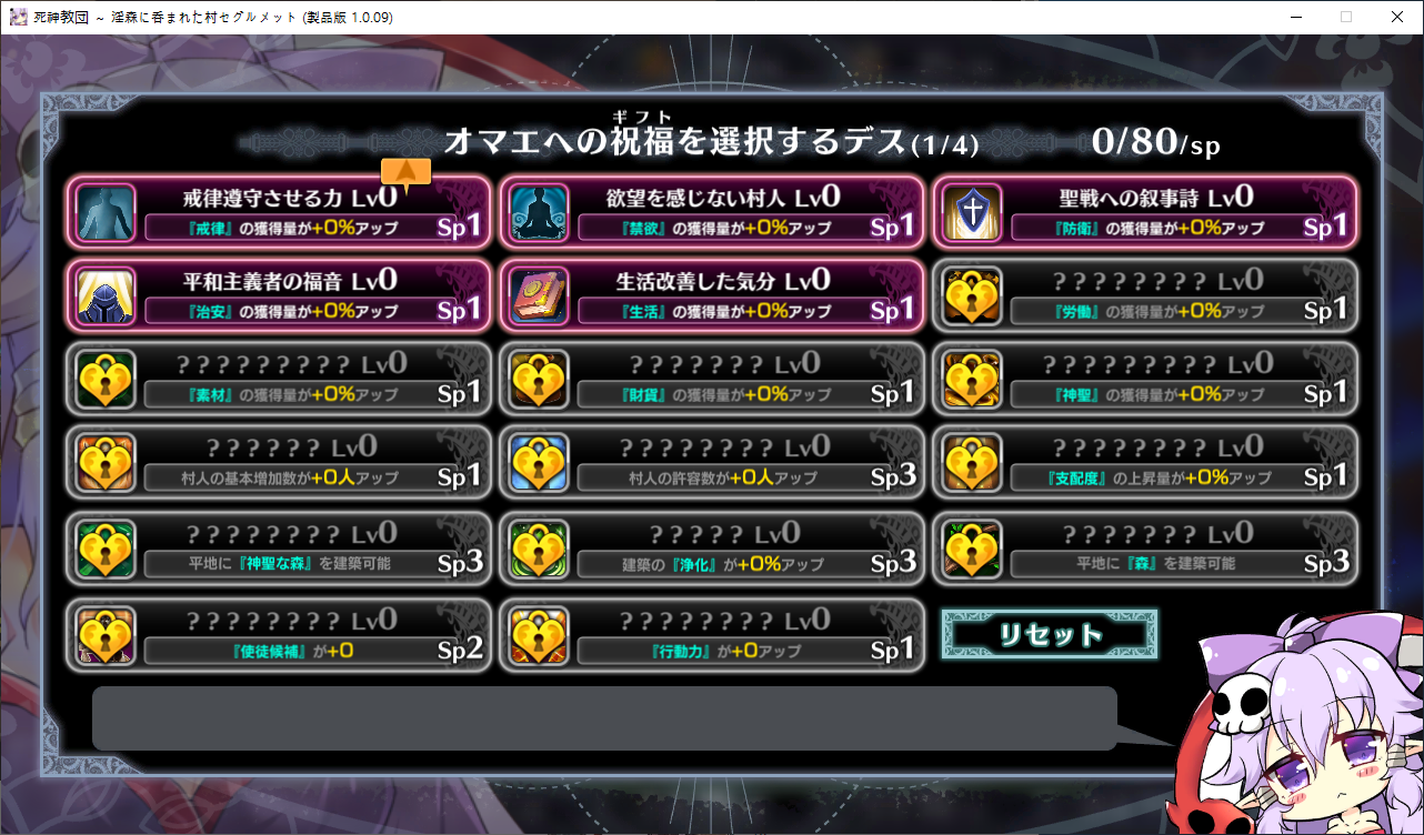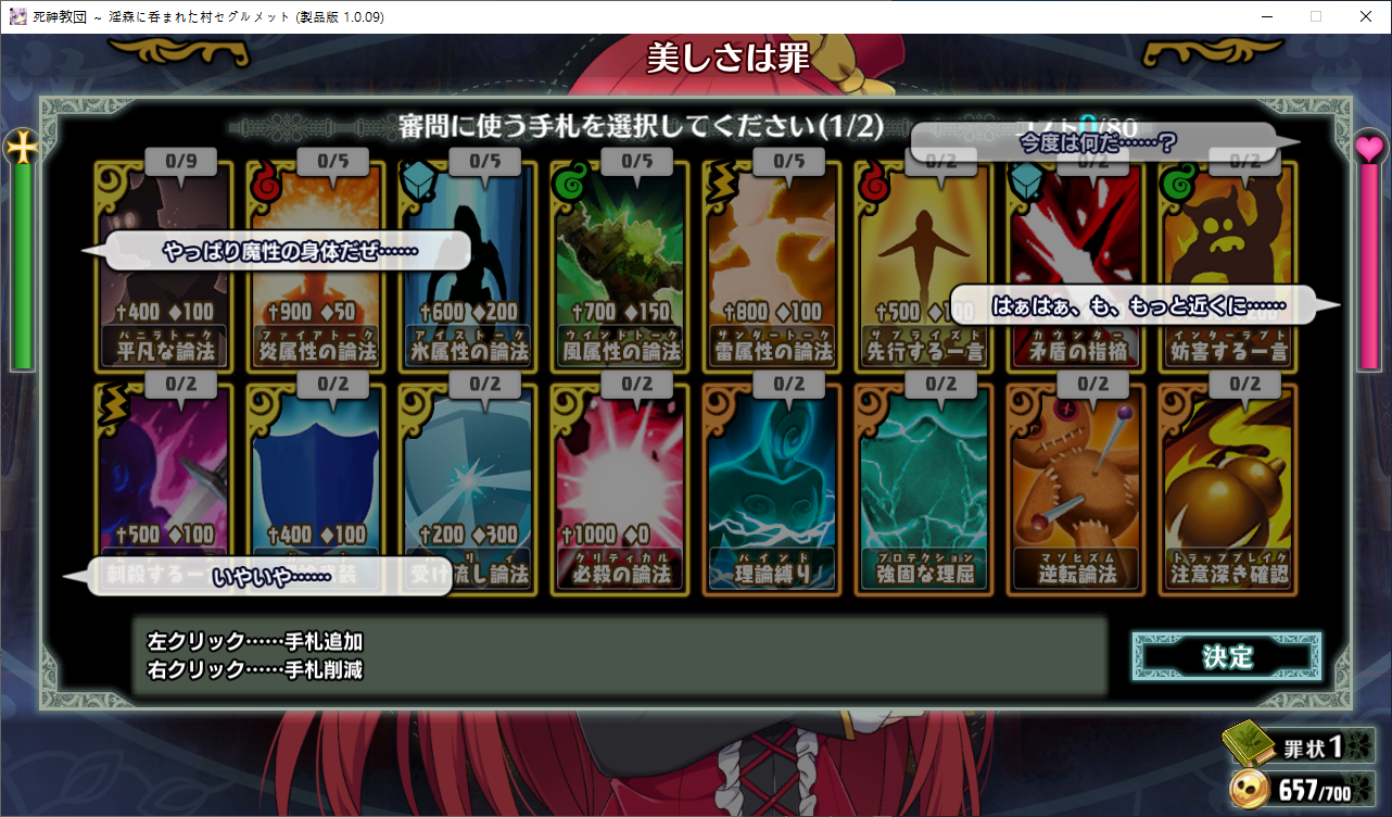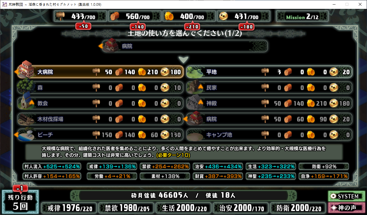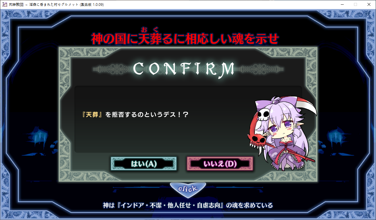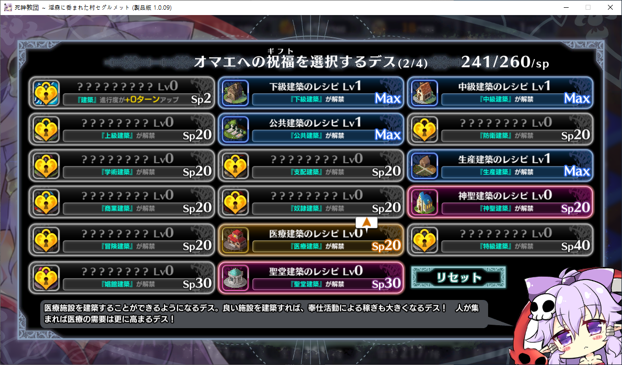 당장은 신성한 숲은 못짓네요이벤트를 더보면 역시 이분이 포레스티아였군요정확히는 화신입니다숲을 개간한 나머지 신앙의 대부분을 그여자에게 뺏겼다네요이제 개발해도 되나?아무튼 자기는 정화로 인해 저의 교단의 일부가 되었습니다신성한 숲을 지어서 그여자를 막아달라고 합니다저주받은 숲 자체는 자신의 일이 아니라고 합니다숲을 지으라고 해서지어줬습니다참고로 여기서 라센느가 이미 있다면 엔딩이 고정되어 못합니다 신패치에서는 신성바치고 리스타트가 생겼더군요덕분에 다시해서 다시 왔습니다협력자 미션을 클리어하지 않으면 영주의 딸 미션으로 바뀝니다이야기를 하고아래를 선택그다음 콜로네를 조수로 줍시다멋대로 동굴이 생겼는데 부숴지지가 않네요치료약은 나무의 수액이라고 합니다저주가 아니라 오히려 저주를 막아주는 역활이였다고 하네요다른 미션을 줍니다특급건물의 레서피를 받습니다이걸 클리어 해야 합니다가격들도 장난아닙니다완공할 필요는 없으니 바로 클리어그러면 영주의 딸이 찾아옵니다벌써부터 정치질을 하고 있습니다하루가 지나면 에레리아 이벤트가 뜹니다신성한 시련을 부과합니다나무를 10개나 지어야 합니다지어주고축복을 받아준 뒤이제 라센누를 찾아가면 됩니다디져모든 면죄가 듀얼로 구성되어 있어서 꽤나 시간을 잡아먹습니다마족구경도 하고라센누를 클리어하면 드디어 갓핸드가 해금됩니다마지막 시련입니다위를 선택하고 죽어줍시다주인공은 사신대행이 되네요 사신창관의 앞쪽이야기 인듯 합니다5트인데도 시간이 장난아니네요천장을 거부해보라고 충고합니다리트라이 이거 지금보니 뭔가 버그인지 캐릭터 스텟을 바꿔놓은게 다음에도 적용되더군요아무튼 천장을 거부하면사신이 나와서 이야기를 합니다 위를 선택그러면 하드모드로 변경됩니다기프트는 히로인을 정화시킬때만 줍니다미션보너스 감소 축복보너스 감소 등등 여러가지 디메리트가 있습니다sp가 감소하고스킬도 다시 찍어줍시다하드모드 개시다음껀 취소하면 안됩니다보면 이 대사도 약간 다릅니다천장이 카미카쿠시로 변하며 보상도 엄청 줄어듭니다신자들이 실종됩니다특성을 가지고 있지 않으면 보너스가 엄청 줄어듭니다카미카쿠시가 일어나면 거의 1퍼정도 신자수가 줄어듭니다히로인이 영입되면 바로바로 이걸 찍어줍시다 신성과 돈을 아낄 수있습니다바로 sp도 늘어나니 투자를 해줍시다최종 신자는 4만이 넘어야 하기 때문에 신자수도 잘 챙겨줍시다이 대사도 약간 달라집니다죽죽 지어주고이건 선택지가 고정되더군요저주는 둘다 상관없었습니다뭔가 눈이 이상한데히로인을 다 모으고 천장을 거부하면최종보스 사성녀 레스타리아가 나타납니다신이라는데근데 왜 이건 계속하는거지아군이야 적이야신의 대리인이라서 그렇다네요레스타리아는 성녀이며 자기이기도 한다네요거기다 힘도 빼앗겼다는데 너무 멍청한 신인듯천장의 영혼을 빼앗겨서 그렇다고 합니다사교는 역시 저의 교단이 맞았군요어떻게 모을거냐고 하니아예 사교의 신전을 지어서 함정을 파자고 합니다공격스킬도 마저찍어주고이걸 지으면 최종전에 돌입합니다교회를 제물로 바쳐서 지었습니다사교의 신도들이 모이고마지막 대결입니다갓핸드 맞좀봐라신의 카드금지라던가죽지않는다던가 사기스킬이 많습니다지면 걍 바로 엔딩갓핸드만 5개 들고가니 딜카드가 딸리더군요여튼 이기면 끝5시간걸렸습니다신의 자비로 부활하고천장이 좋은건 아니란걸 드디어 알아챈 사신은 돈으로 신성을 모으려고 합니다앤드리스 모드 해금천장은 돈으로 치를 수 있게 됩니다신성의 획득은 줄어듭니다이걸 찍고??굳이 여기서 해방을 따로 눌러야 되더군요