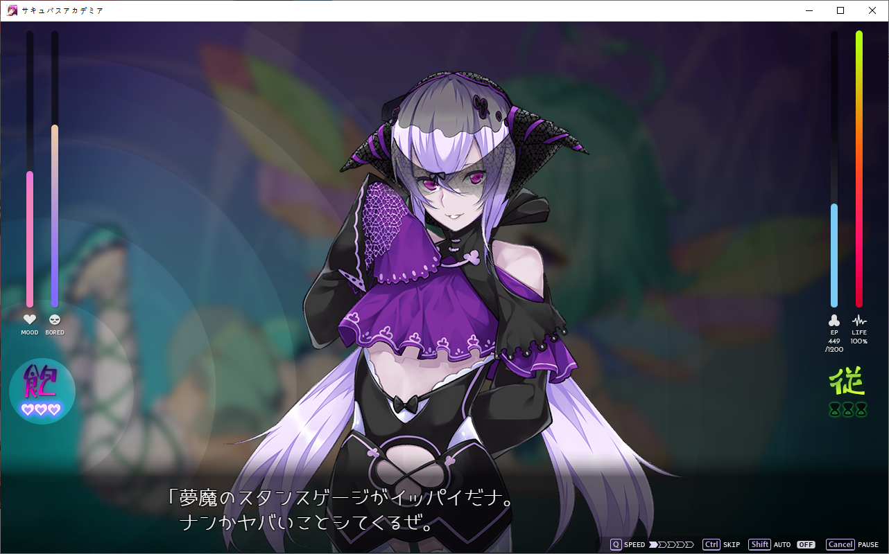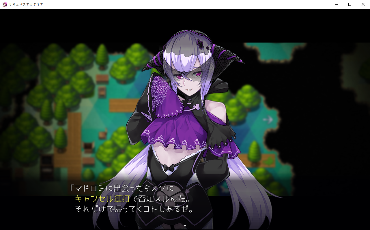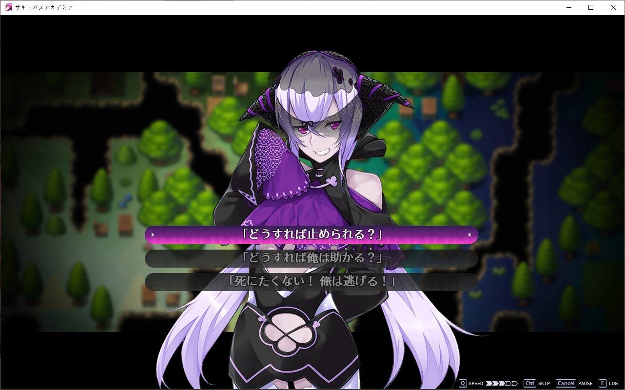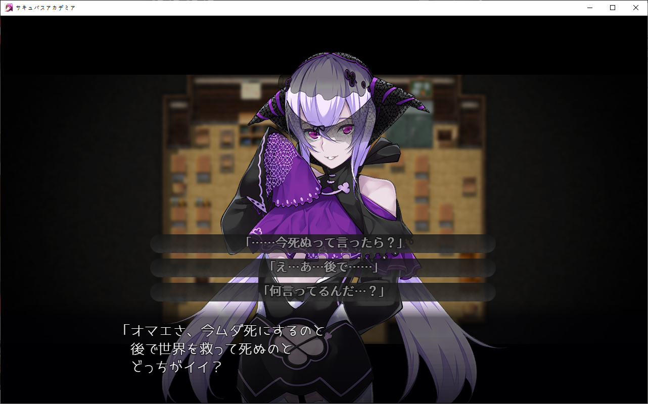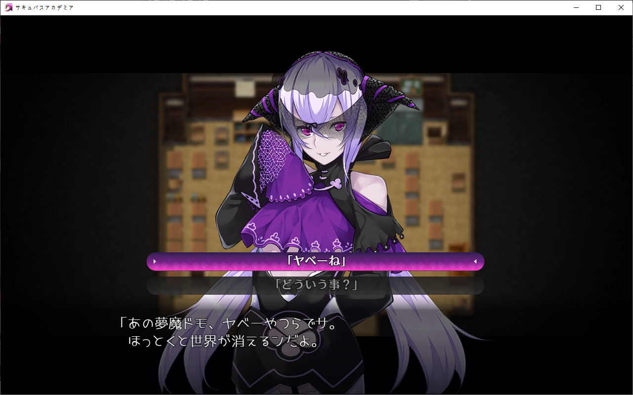 요상한 질문부터 시작합니다죽기 싫지만 쟌넨 이미 죽었습니다이 질문은 꽤 중요한데 처음의 자세를 결정합니다뭐 짜피 중간중간 계속 바뀌기도 하고 나중엔 3개다 쓸 수 있어서 엄청 중요한건 아니니 취향껏 합시다3은 없습니다처음은 이 게임의 시스템을 살짝보여줍니다 나중에 다시 보여주니 패스앞에서 템을 줍고난이도를 선택할 수 있네요도감도 있군요바로 앞의 명찰을 주으면주인공의 이름을 정할 수 있습니다키설명바로 위는 여자의 명찰이 있고자신의 소꿉친구라고 하네요서브히로인 이름도 일일히 지정할 수 있습니다백골이 된 친구가 있습니다뎃 누구지금 쓸데없이 죽는거랑 뒤에 세계를 구하고 죽는거 뭐가 더 좋냐고 합니다여기 몽마들은 강해서 진짜로 세계를 지워버릴 지도 모른다고 하네요안뇽너 악마지같이 돌아갈까후후후 거리며 다가오려는 찰나 세계가 어긋나버립니다몽마 맞네빈 교실의 숲으로 이동되었습니다템을 줍고악세나 열쇠는 장비템입니다위로 갑시다이건 나중에 부술 수 있습니다빈 교실도 이상하게 변해버리는 군요몽마를 만족시킨뒤 보내버리면주인공이 가는 순간 몽마가 최고로 만족한 상태라면 몽마는 꿈의 세계로 돌아갈 거라고 합니다물론 주인공은 죽고 나머지는 해피엔딩...은 아니고 몽마는 한마리가 아니라고 합니다그래도 주인공이 학원에서 얻은 경험은 이녀석이 다른 녀석에게 확실히 전해줄거라고 합니다물론 죽음의 직전은 아니고 동정인 채로 넘어간다고 합니다참고로 동정만 가능하고동정이 모두 죽으면 이세계도 끝입니다이름을 정하는데 이녀석의 웃는 소리인 푸후쿠스로 정합니다이동중에 쉬프트를 누르면 이야기가 가능한데 초반부터 까먹고 바로 안썻습니다안쪽으로 가보자네요템들은 죄다 가져가고중간부터 잡몹이 나옵니다몽마는 아니고 마도로미라는 녀석입니다배틀전에 난이도를 선택할 수 있는데트로피는 또 못참지하드로 가겠습니다암거나 누르고태도는 보통 선택지에 따라 갈린다고 합니다전투공격시 일정확률로 콤보가 나타나며 더욱 상위의 공격을 할 수 있습니다보통 상위기는 데미지가 크며 필살게이지를 1 올립니다스탠스게이지가 차오른걸 볼 수 있습니다이걸 소비함으로 특별한 기술을 쓸 수 있습니다물론 성공을 해야겠죠필살기는 게이지를 모두 소모하며 강한데미지를 주고 재사용 시간이 있습니다하지만 모든 기술은 이렇게 실패확률이 있습니다액션이 실패하면 흥미를 잃기 때문에 디메리트가 큽니다흥미를 다시 불러 일으키기 위해 공격을 해야 합니다 난이도가 높으면 공격이 실패하는 순간 망할 수가 있습니다상대도 스탠스 게이지가 있으며 이것이 꽉 찰경우 특수한 공격을 해옵니다어떤 공격을 해올지는 한자를 통해 어느정도 유추는 가능합니다푸후쿠스를 선택해 베일을 써줍시다다시 흥미를 보이기 시작하고 절호조가 되었습니다리그렛을 사용해 2턴동안 무드를 배로 증가시킵시다꽤나 엄청난 데미지가 들어갑니다이렇게 무드가 최대가 되면 몽마는 만족하고 떠납니다몽마와 논 덕분에 이 세계에 대해 조금 더 이해하게 되었습니다exp를 가득 채우면 여러 유용한 아이템을 줍니다이건 대충 스킬포인트라고 생각하면 됩니다이런저런 트로피도 있으니 모으는 재미도 있습니다마도로미는 캔슬키를 연타하면 거부할 수 있습니다싸울지 말지는 선택이며 싸우는 쪽이 경험치나 아이템을 더 주긴합니다도망치던 싸우던 자유지만 100잡는 트로피도 있으니 엔간하면 잡아줍시다이런저런 환금용 아이템도 줍니다길따라 가다보면뭔가 이상한게 공격해옵니다저런 붉은건 케다모노입니다정면에서 공격하면 쓰러뜨릴 수 있습니다이건 주인공인 검도부의 능력입니다돌아가면오컬트부가 결계인지 머시기로 여긴 괜찮다고 합니다안쪽에서 뭘 하고 있으니 물어보라고 하네요이곳저곳 둘러봅시다온도계는 몽도계로 바뀌어져 있고 보스를 쓰러뜨릴때마다 1씩 증가합니다이건 밀어주면 나중에 바닥으로 생깁니다에비살려둬서 얻는 이득은 없고 상자 자체는 나중에 열수록 좋다고 하네요이곳저곳 대화하고각각의 장소마다 앞에 명찰이 떨어져 있습니다간호사 선생님도 계시고비상구는 나중에 이곳저곳 다니는 지름길 입니다여기서 악마를 소환하면악마상인이 등장합니다환금은 자동입니다장비템이라던가 새로운 길을 열 수 있는 아이템을 팝니다오컬트부 부원이런저런걸 물어볼 수 있고여기는 유품을 사용하는 곳입니다숲의 동쪽으로 가보라고 하네요각지의 명찰을 줍고갸루도 하나 있습니다여기는 상점에서 가솔린을 사면 되는데 잡템인줄 알고 1회차는 깜박했습니다여기로 갑시다