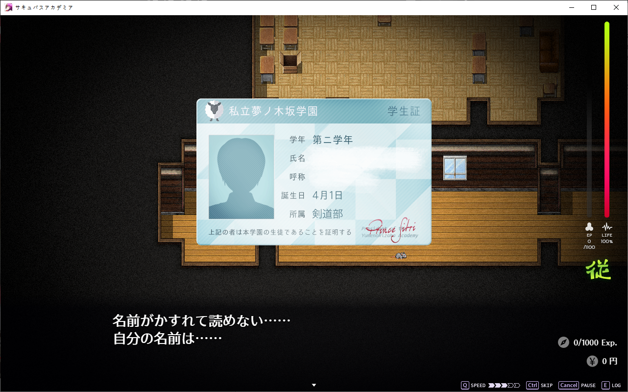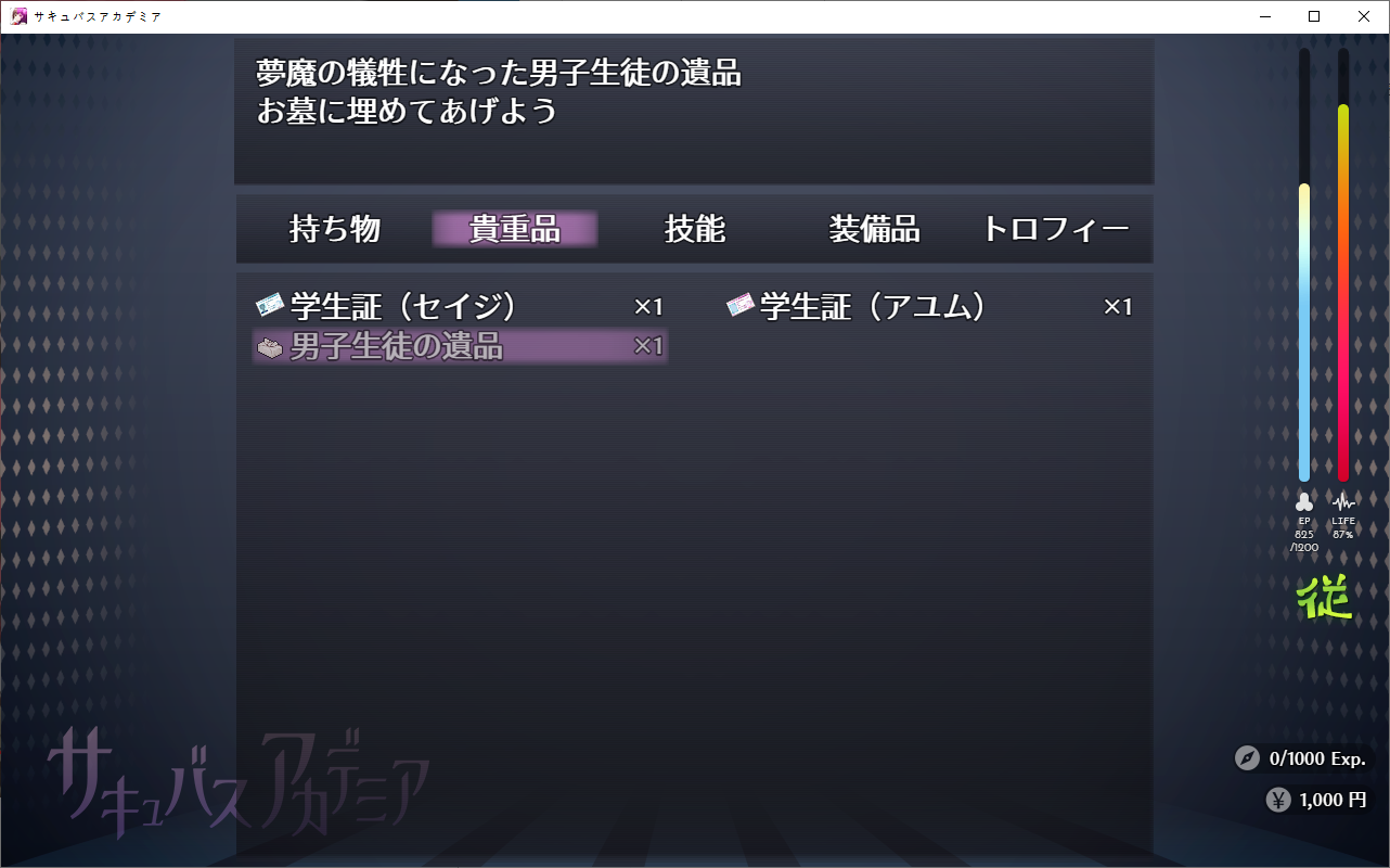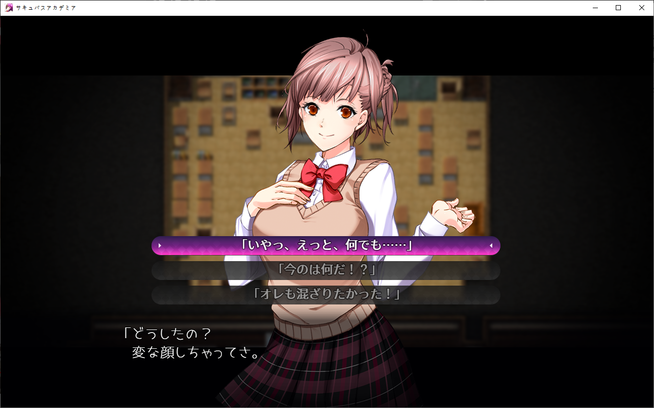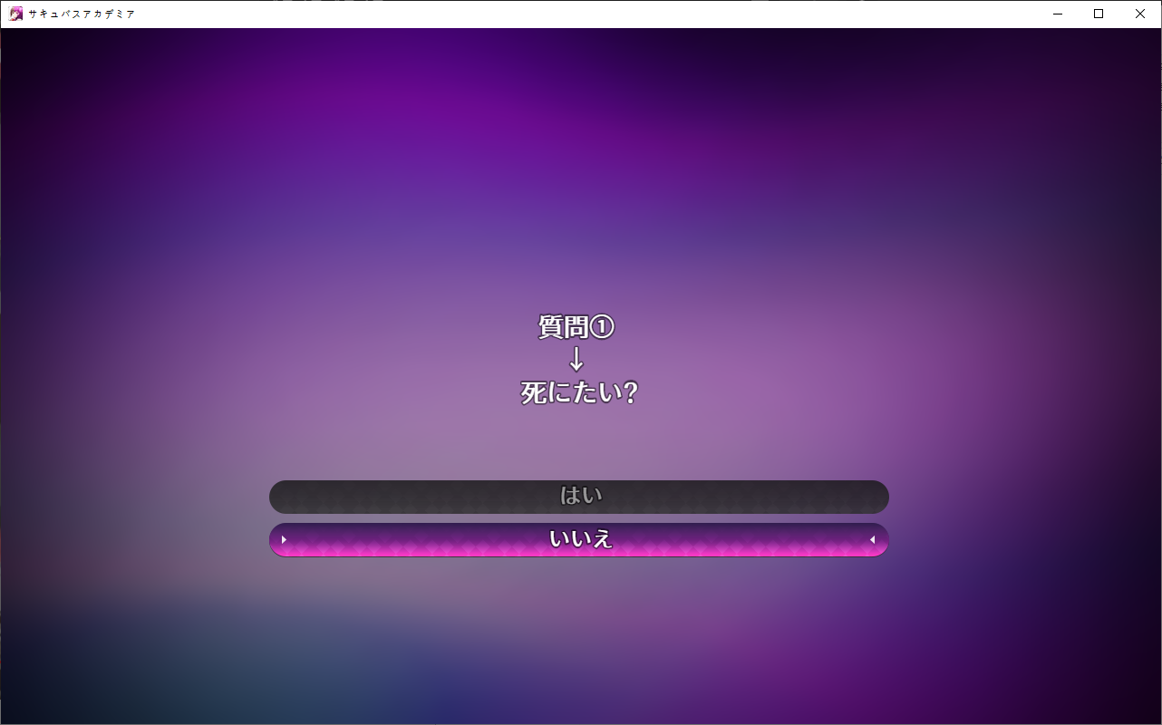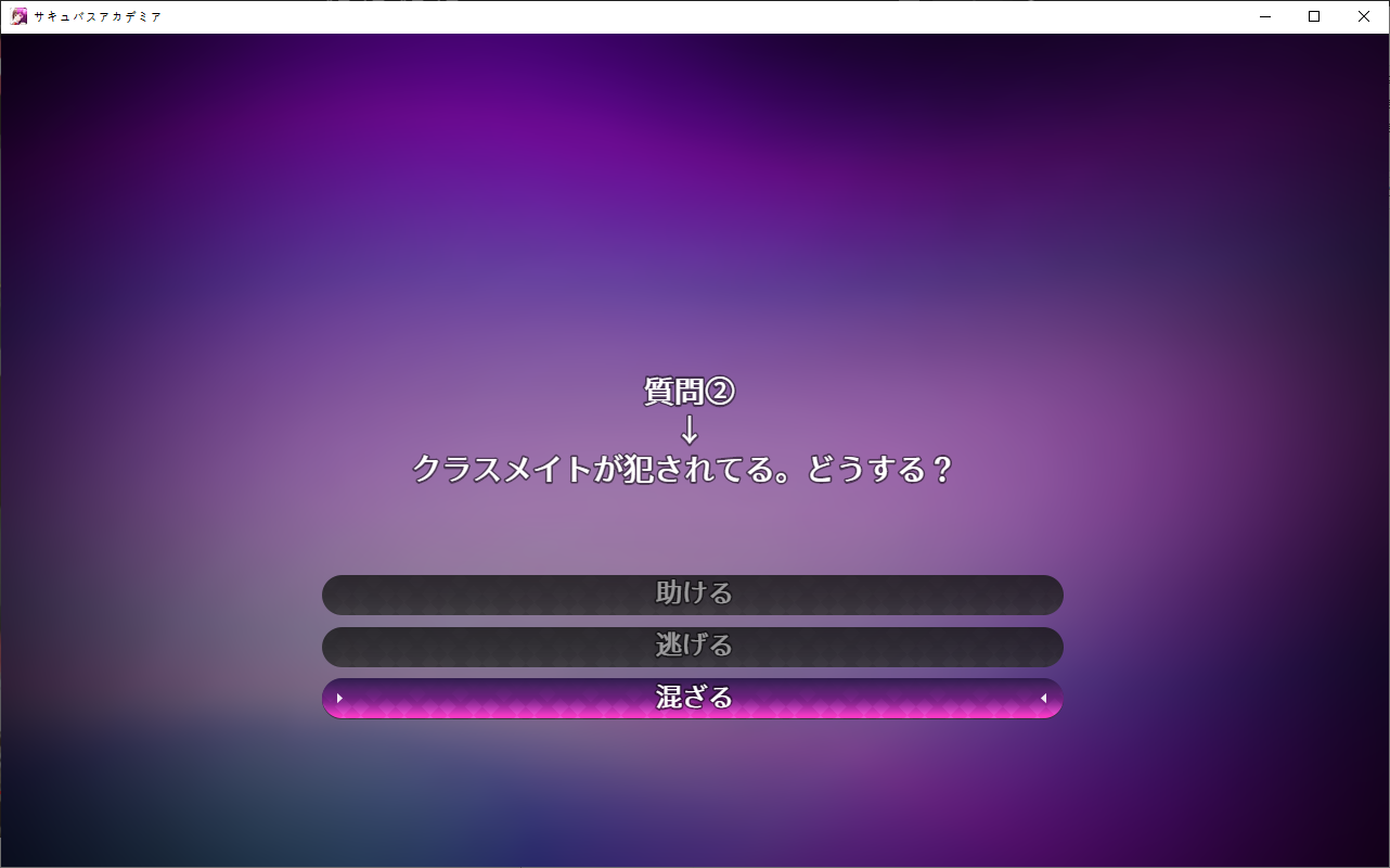 요상한 질문부터 시작합니다죽기 싫지만 쟌넨 이미 죽었습니다이 질문은 꽤 중요한데 처음의 자세를 결정합니다뭐 짜피 중간중간 계속 바뀌기도 하고 나중엔 3개다 쓸 수 있어서 엄청 중요한건 아니니 취향껏 합시다3은 없습니다처음은 이 게임의 시스템을 살짝보여줍니다 나중에 다시 보여주니 패스앞에서 템을 줍고난이도를 선택할 수 있네요도감도 있군요바로 앞의 명찰을 주으면주인공의 이름을 정할 수 있습니다키설명바로 위는 여자의 명찰이 있고자신의 소꿉친구라고 하네요서브히로인 이름도 일일히 지정할 수 있습니다백골이 된 친구가 있습니다뎃 누구지금 쓸데없이 죽는거랑 뒤에 세계를 구하고 죽는거 뭐가 더 좋냐고 합니다여기 몽마들은 강해서 진짜로 세계를 지워버릴 지도 모른다고 하네요안뇽너 악마지같이 돌아갈까후후후 거리며 다가오려는 찰나 세계가 어긋나버립니다몽마 맞네빈 교실의 숲으로 이동되었습니다템을 줍고악세나 열쇠는 장비템입니다위로 갑시다이건 나중에 부술 수 있습니다빈 교실도 이상하게 변해버리는 군요몽마를 만족시킨뒤 보내버리면주인공이 가는 순간 몽마가 최고로 만족한 상태라면 몽마는 꿈의 세계로 돌아갈 거라고 합니다물론 주인공은 죽고 나머지는 해피엔딩...은 아니고 몽마는 한마리가 아니라고 합니다그래도 주인공이 학원에서 얻은 경험은 이녀석이 다른 녀석에게 확실히 전해줄거라고 합니다물론 죽음의 직전은 아니고 동정인 채로 넘어간다고 합니다참고로 동정만 가능하고동정이 모두 죽으면 이세계도 끝입니다이름을 정하는데 이녀석의 웃는 소리인 푸후쿠스로 정합니다이동중에 쉬프트를 누르면 이야기가 가능한데 초반부터 까먹고 바로 안썻습니다안쪽으로 가보자네요템들은 죄다 가져가고중간부터 잡몹이 나옵니다몽마는 아니고 마도로미라는 녀석입니다배틀전에 난이도를 선택할 수 있는데트로피는 또 못참지하드로 가겠습니다암거나 누르고태도는 보통 선택지에 따라 갈린다고 합니다전투공격시 일정확률로 콤보가 나타나며 더욱 상위의 공격을 할 수 있습니다보통 상위기는 데미지가 크며 필살게이지를 1 올립니다스탠스게이지가 차오른걸 볼 수 있습니다이걸 소비함으로 특별한 기술을 쓸 수 있습니다물론 성공을 해야겠죠필살기는 게이지를 모두 소모하며 강한데미지를 주고 재사용 시간이 있습니다하지만 모든 기술은 이렇게 실패확률이 있습니다액션이 실패하면 흥미를 잃기 때문에 디메리트가 큽니다흥미를 다시 불러 일으키기 위해 공격을 해야 합니다 난이도가 높으면 공격이 실패하는 순간 망할 수가 있습니다상대도 스탠스 게이지가 있으며 이것이 꽉 찰경우 특수한 공격을 해옵니다어떤 공격을 해올지는 한자를 통해 어느정도 유추는 가능합니다푸후쿠스를 선택해 베일을 써줍시다다시 흥미를 보이기 시작하고 절호조가 되었습니다리그렛을 사용해 2턴동안 무드를 배로 증가시킵시다꽤나 엄청난 데미지가 들어갑니다이렇게 무드가 최대가 되면 몽마는 만족하고 떠납니다몽마와 논 덕분에 이 세계에 대해 조금 더 이해하게 되었습니다exp를 가득 채우면 여러 유용한 아이템을 줍니다이건 대충 스킬포인트라고 생각하면 됩니다이런저런 트로피도 있으니 모으는 재미도 있습니다마도로미는 캔슬키를 연타하면 거부할 수 있습니다싸울지 말지는 선택이며 싸우는 쪽이 경험치나 아이템을 더 주긴합니다도망치던 싸우던 자유지만 100잡는 트로피도 있으니 엔간하면 잡아줍시다이런저런 환금용 아이템도 줍니다길따라 가다보면뭔가 이상한게 공격해옵니다저런 붉은건 케다모노입니다정면에서 공격하면 쓰러뜨릴 수 있습니다이건 주인공인 검도부의 능력입니다돌아가면오컬트부가 결계인지 머시기로 여긴 괜찮다고 합니다안쪽에서 뭘 하고 있으니 물어보라고 하네요이곳저곳 둘러봅시다온도계는 몽도계로 바뀌어져 있고 보스를 쓰러뜨릴때마다 1씩 증가합니다이건 밀어주면 나중에 바닥으로 생깁니다에비살려둬서 얻는 이득은 없고 상자 자체는 나중에 열수록 좋다고 하네요이곳저곳 대화하고각각의 장소마다 앞에 명찰이 떨어져 있습니다간호사 선생님도 계시고비상구는 나중에 이곳저곳 다니는 지름길 입니다여기서 악마를 소환하면악마상인이 등장합니다환금은 자동입니다장비템이라던가 새로운 길을 열 수 있는 아이템을 팝니다오컬트부 부원이런저런걸 물어볼 수 있고여기는 유품을 사용하는 곳입니다숲의 동쪽으로 가보라고 하네요각지의 명찰을 줍고갸루도 하나 있습니다여기는 상점에서 가솔린을 사면 되는데 잡템인줄 알고 1회차는 깜박했습니다여기로 갑시다