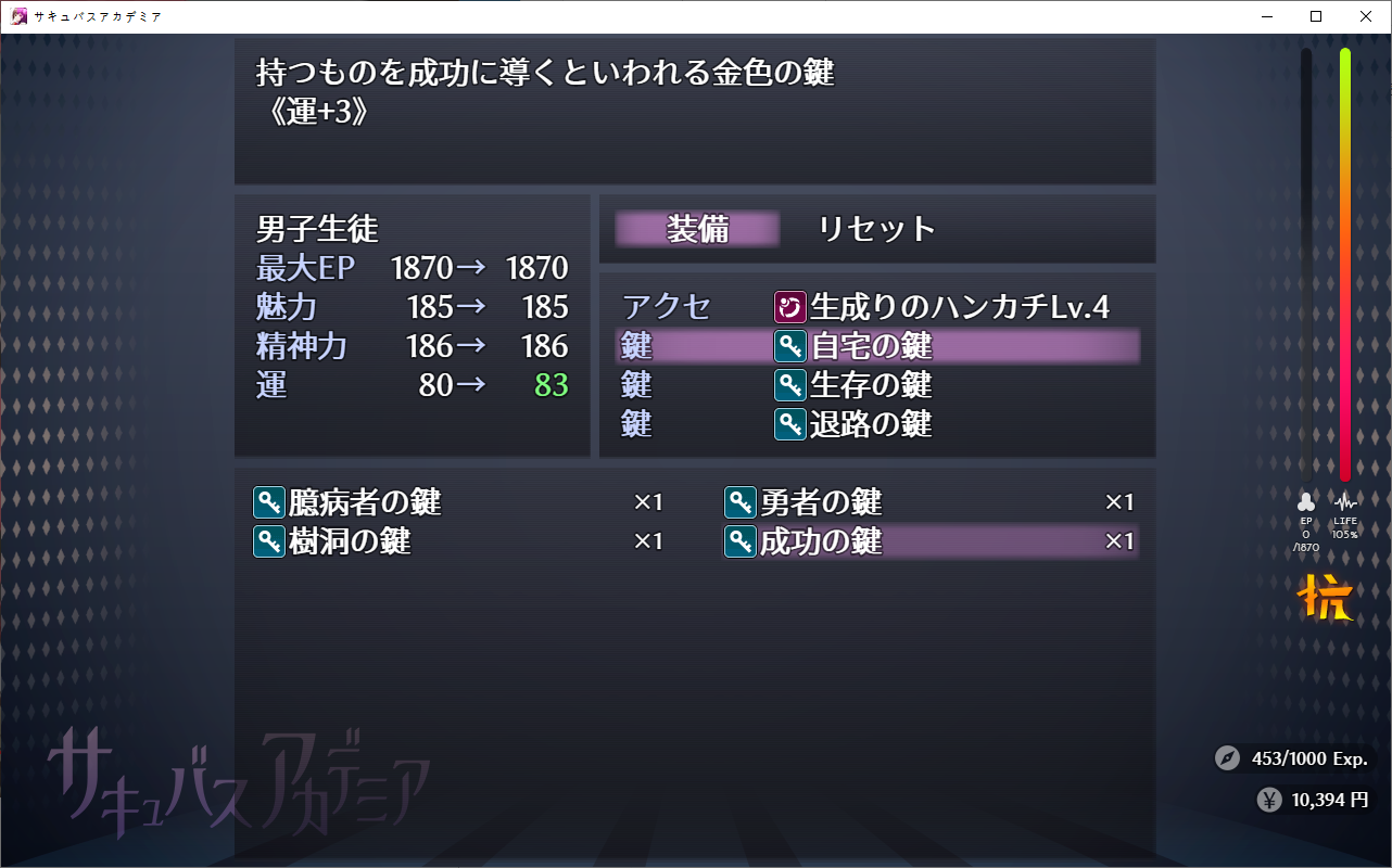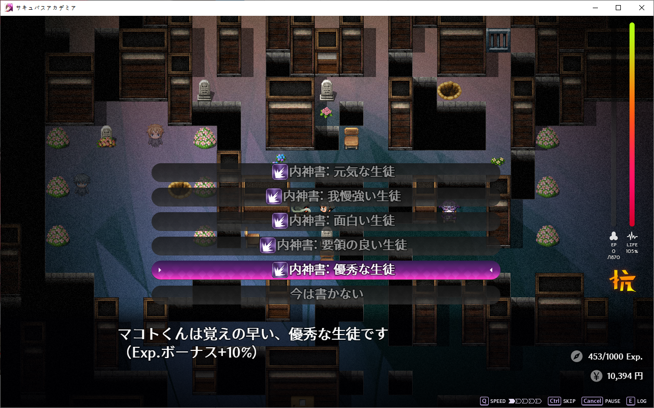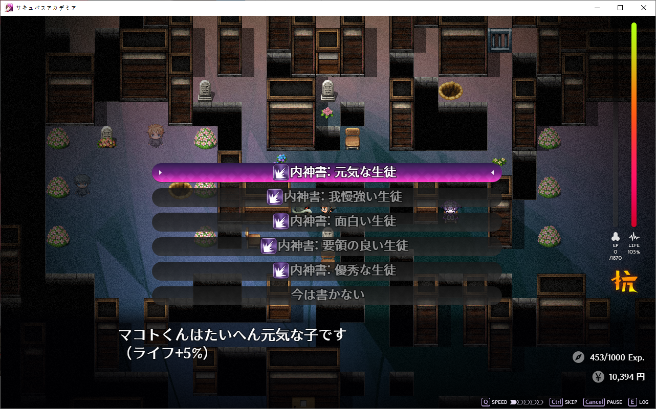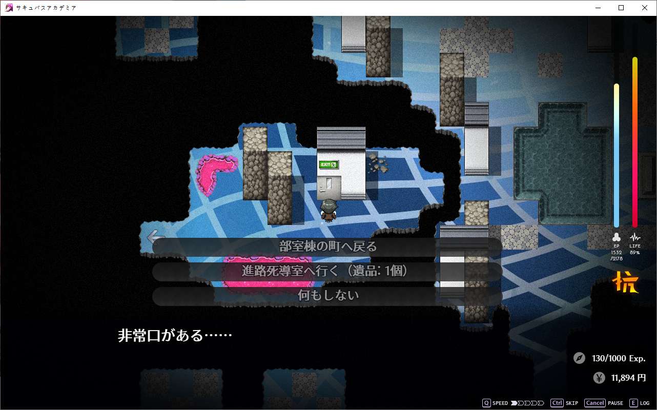 전 아직은 트루엔딩의 존재를 몰라서 아무나 붙잡고 환생했습니다부활하면 이렇게이름을 다시 정하고 시작할 수 있습니다이 몸은 이제 제겁니다전생의 기억과 기술들을 모두 가지고 갑니다몽도계가 1 증가해서 파는 템들도 늘어났습니다도끼저기를 깨면뭔지 싶었는데여기서 템을 주워불을 붙여주면 됩니다그다음 시계를 멈추면회상방이 개방됩니다아직은 찍먹수준의 진행도나갈 땐 멈춰야 합니다회상방용 잡템템을 줍고내려가서다시 멈추고안쪽에 들어가면 여신이 나타납니다바이아직은 별거 없습니다참고로 보스를 잡으면 죽음의 기억이 들어오는데 이거도 2회차 보정용입니다오컬트부 부원들도모두 2층으로 갔습니다여기도 사라져있고몽도계도 보면 숫자가 증가해 있습니다오컬트부는 2층으로 가고 여긴 수영부가 오는게 맞습니다여자탈의실이 있는데 당장은 못갑니다기척이 있습니다내려가서여기의 기믹은죽내려가서물을 채우면물이 생기면서 헤엄쳐서 건너갈 수 있습니다이번의 보스물이 있는 상태에서 만나면 상태이상에 걸립니다물을 빼고상자를 열어야 합니다물이 있으면 수초가 자라나서 지나갈 수 없습니다이렇게 좀 왔다갔다 거려야 합니다주겅지나가고아직은 별거 없습니다다음 스테이지여기는 저 물방울을 타고 지나가면 됩니다뿅끝에 소용돌이가 있다면강제 전투잘 타고 지나가면 됩니다상자도 열심히 열고템줍줍이녀석들도 여유가 되면 상대해 줍시다죽는걸 지켜보던살려주던 죽는건 같습니다잘가요운을 올려주는 열쇠는 좋습니다돌아오면트로피에 대해 이야기를 해줍니다뭐를 찍을지는 자유인데전 언제나 경험치 증가를 좋아하는 편입니다스킬도 좀 찍어주고스킬설명이 부족한 경우도 있는데 큰 데미지를 받으면 짤딜을 한번 넣을 수 있어서 좋은 스킬입니다참고로 보스를 잡은 곳에 다시가면 템을 얻을 수 있습니다렙을 올리다보면 얻는 열쇠 강화 아이템취향껏 올려주면 되는데 이거랑이거를 주로 썼습니다여튼 다시 돌아가서 진행아마 저 붉은거도 밟으면 안되는지 여기서 함정회피실패가 많이 뜨더군요템도 훔치고여기는 잠시 있다가 보고여기로 가면비상구가 있습니다돌아오면 사신과 잡담을 하는데좋아하는 가슴의 크기를 묻습니다 이건 푸후쿠스의 외형에 영향을 미칩니다통지서도 바꾸고더 가면 보스전여기에 앞서 주은 템을 뿌리면이런저런 잡템과 보스전이 기다립니다개인적으로 좀 어렵긴 했습니다으앙 쥬금다음은 수영부 부원으로 환생했습니다
