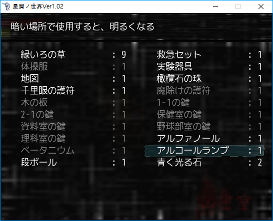 일어나보니 어두운 교실노멀도 어렵다는 사람이 많으므로 자신없으면 이지로 합시다키설명당장은 못줍고여길 조사하면 주을 수 있습니다나무판을 주워서 길을 만들어 줍시다내려가면 해골이 있고밖은 위험하지만 여기있는거 보단 나으니 나갑시다지도를 주워줍시다애초에 맵도 어긋나 있어서 크게 도움은 안됩니다저 판자를 주으러 갑시다해골들에게선 템을 얻을 수 있으니 발견하면 주워갑시다저쪽의 소녀를 구출하는게 굿엔딩 조건입니다판자를 주워서 위로 올라가고죽 오른쪽으로 갑시다미술실을 찾아서 들어갑시다붙잡히면 바로 게임오버안에서 저장이 가능하기 때문에 열심히 도망칩시다일정 걸음을 걸으면 클리어판자를 줍고왼쪽으로 돌아와서 가운데로 내려갑시다가다보면 창문이 깨지고 까마귀가 나오는데 귀찮으니 처맞으면서 빨리 넘어갑시다왼쯕으로 죽 가면유령이 나오고천리안의 부적을 얻는데반짝거리는 부분이 함정입니다 피해서 판자를 주워줍시다아래로 죽죽영혼과 이야기를 하고왼쪽으로 가면 잠겨있고2-1로 가라는 이야기를 듣습니다오른쪽으로 죽가면열쇠가 있고 사줍시다참고로 하드의 경우 초반 이곳이 막혀있어서 빙글 돌아가야 합니다입장문제 풀사람은 푸시고 귀찮은 사람은 x키를 누르면 중간까지 스킵됩니다다음 문제는 천리안을 쓰면 정답이 보이고몬티홀 문제는 가운데만 선택하지 맙시다여길 선택하고위만 죽죽 누르고 가운데에서 조각을 챙겨갑시다열쇠도 챙기고다시 죽 돌아와서돌도 줍고 선반을 조사하면 약이 없는데매점에서 사줍시다이걸 사면 됩니다그 뒤 미술실 아래를 통해 2층으로 올라갑시다템도 훔치고제작레서피도 읽어줍시다2층에서 바로 아래로 내려와서 탈의실로옷을 갈아입읍시다왼쪽을 지나갈 수 있게 되고죽 가서 야구부실의 열쇠를 주워줍시다하드난이도에선 걸어서 가야합니다2층의 야구부실로 가서이벤트여기로 가야됩니다템도 훔치고돌아가는 길에 땅이 흔들리는데맵이 바뀝니다아래로 떨어지게 되고유령을 따라갑시다죽 따라가서 물건을 회수하고1층의 깨끗한 화장실에서 하나코씨 이벤트를 봅시다다시 2층으로 가서 이과실을 털어야 합니다옆의 탈의실에서 상자를 주워서 A로 써주면 됩니다이런상태그전에 아래로 가서판자도 훔쳐주고적들이 있는데 노말에도 그냥 무시하고 죽 달리는게 편했습니다이때만 주을 수 있는 템이 있긴한데 귀찮아서 패스했습니다저리 오른쪽의 선반에서 템을 얻을 수 있는데 버그인지 엄청 팅깁니다실험용기를 사용하면 이제부터 물건을 만들 수 있습니다불도 피워줍시다도서관으로 들어가서불을 켜줍시다이것저것 읽어주고 템들도 다 회수해 줍시다탈출은 아마 이걸 읽으면 나갈 수 있을겁니다돌아가는 길에서 여길 램프로 태우고템을 가져갑시다아까 떨어진 그 장소로 갑시다2층 중간지점템도 훔치고여기가 진짜 하드면 답답해서 못하겠습니다하드면 저기 아래는 막혀있고 재화가 3개 떨어져 있습니다답답하니 후딱후딱갑시다4-2교실에 도착주위에서 빛나는 물건을 주으면 됩니다위치자체는 고정이고 세이브도 가능해서 어렵진 않습니다이벤트를 마치면 공간의 균열을 사용할 수 있습니다보건실로 돌아와서 나가면 이벤트이과준비실의 열쇠를 얻습니다그전에 매점도 들러서 포탈을 열어주고곳곳에 포탈이 생기니 지나가면서 열어줍시다이과준비실에서 템도 훔치고여기서 회상방을 여는데 필요한 아이템이 있습니다그다음 나무덩쿨을 타고 내려갑시다