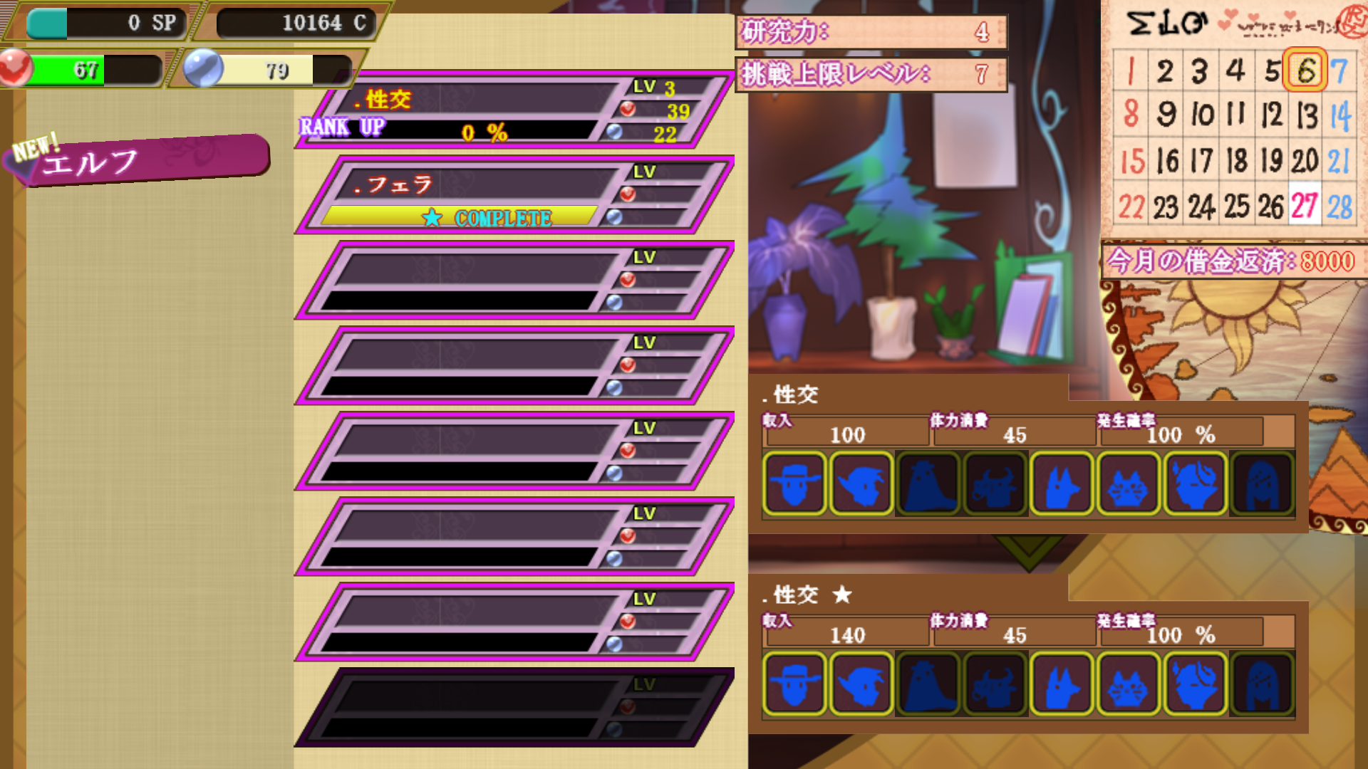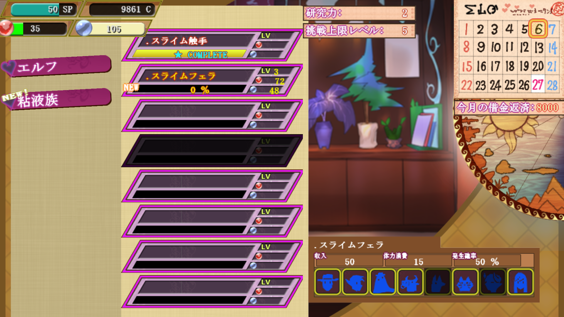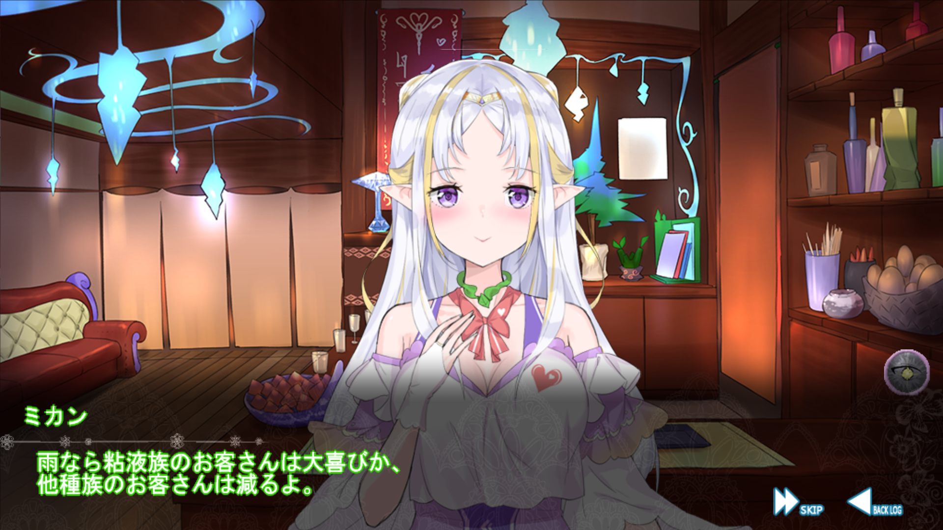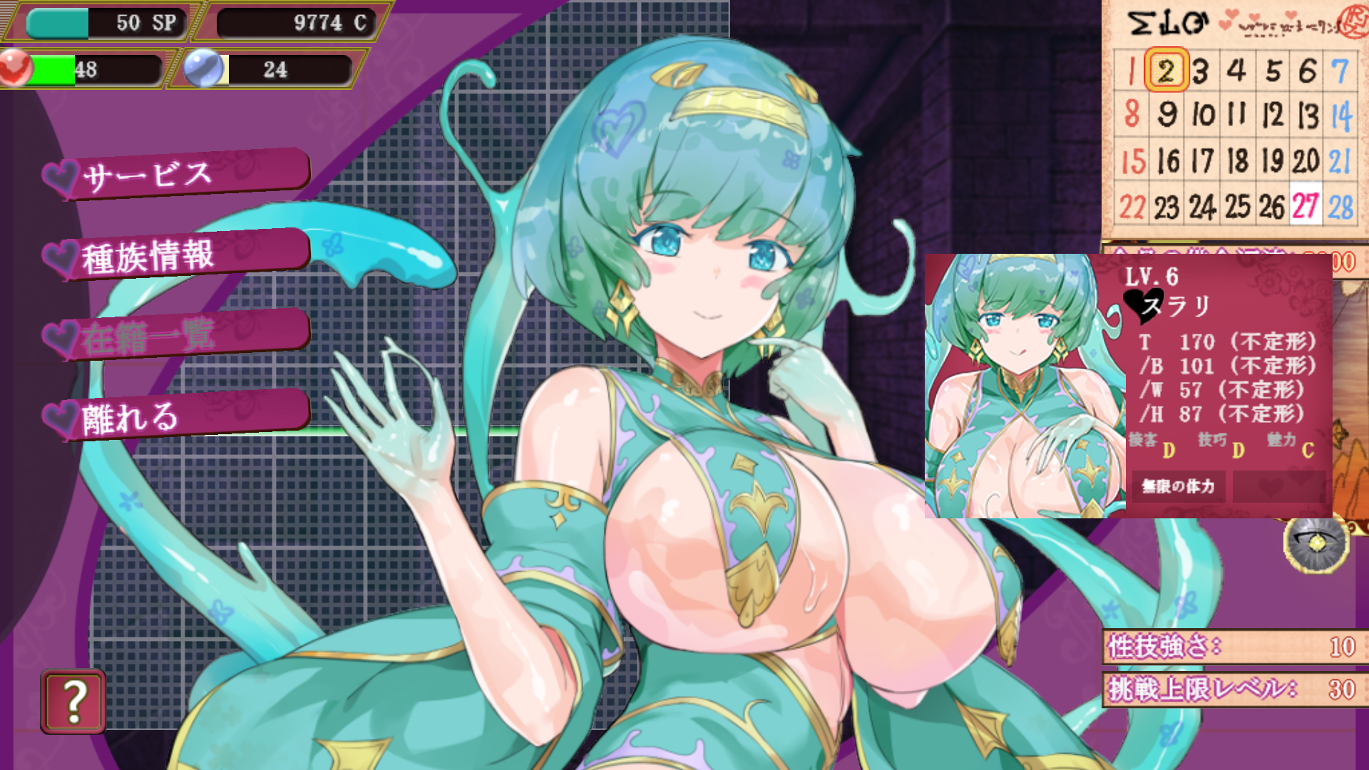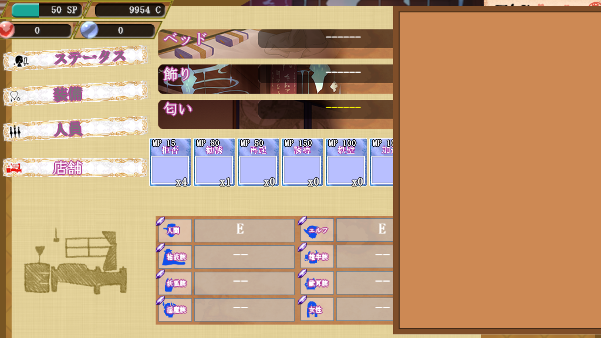 게임자체가 쉽기 때문에 노말로 갑시다튜토리얼서비스시간동안 상대를 만족시키는 것이 목표입니다각 종족마다 약점이라던가 있어서 재미가 있습니다말종족은 가슴을 만지는게 좋다지만 긴장한 상태라 그런지 효과적이지 않습니다그럴때는 숨겨진 기술을 쓰면 되는데 이땐 꼬리를 만질 수 있습니다이렇게 숨겨진 장소가 있는 종족도 있습니다 나중에 얻는 관찰스킬로 보면 보입니다꼬리를 만져주면 긴장이 풀리고 그 뒤로 즐기면 되는데 같은 기술을 계속쓰면 둔감해 지는거 같더군요여기가 주인공의 창관밖을 산책하다가 전생자를 만납니다전생자놈들은 치트능력을 앞세워서 이쪽세계를 말아먹는다고 싫어합니다친절히 상대해 주는데당연히 처발립니다아아 이건 페라라는 것이다우오옷 이것이 펠라라는 것인가 우리도 벤치마킹하자해서 개발을 하려고 합니다엘프족으론 평범하고 슬라임에게 지원을 받으려고 합니다다른 창관으로 갑시다안녕톱을 지명하기 위해선 VIP가 되어야 하고 그러기 위해선 직원 하나를 만족시켜야 합니다이 게임의 특이한 점으로선 종족정보가 있는데이런저런 약점이라던가 정보를 알게 되면 채워지고 그 만큼 각 창관에 보너스를 받을 수 있습니다아직은 VIP가 아니라서 지명은 못합니다이렇게 시작하는게 가성비는 좋습니다랜덤이라 아무나 옵니다한번하고 나오면 슬라임들은 정력이 꽉 차있는 남자를 좋아한다는 이야기를 들을 수 있습니다정력이 딸리면 거의 최종스펙으로도 못떄리겠더군요스킬도 있습니다뭐를 찍던 자유긴 한데 접객이 제일 구립니다분별을 얻을 수 있습니다상태도 있는데스테이터스라던가직원상점의 이런저런 효과아이템을 설치할 수 있습니다놀다보면 고양이 상인도 찾아옵니다전생자들은 모두 전생특전이 있나봅니다이런저런걸 살 수도 있는데해보니 돈이 철철남기도 해서 중후반부턴 죄다 사시면 됩니다슬라임에 대한 정보도 들어주고전생자에 대한 정보도 들어줍시다짜증나는 전생자를 마음대로 할 수 있어서 인기가 좋습니다회복제는 사면 바로바로 회복됩니다 휴식누르는거보단 이득이니 사주는게 좋습니다이런건 나중에 돈의 여유가 생기면 하나씩 사면 되고이거도 나중에 사야합니다 악세류는 쓰레기니 패스선전은 너무 초반이면 해봤자 이득이 적으니 좀 시간이 지나면 해줍시다일단은 슬라임과 놀아봅시다종족정보를 보면이때까지 얻은 정보들이 보이고 이런 정보를 얻을때마다 이런저런 보너스를 받은걸 볼 수 있습니다출근일이 따로 있고 지명도 따로 안했기 때문에 랜덤으로 상대가 등장합니다관찰로 상대의 약점을 볼 수 있습니다특정부위가 아닌 다른부위가 보인다면 약점입니다이렇게 특정행동을 하면 상대종족에 대한 정보를 볼 수 있습니다서로가 서로의 첫상대였나 봅니다아침에는 휴식이나 개발을 하고밤에는 음행을 떠나면 됩니다경영페이즈도 있긴한데 크게 조작할 것도 없어서 이벤트 조건일때만 들러주면 됩니다스킬 카드를 써서 이런저런 효과를 낼 수 있습니다돈을 많이 벌진 않습니다소녀를 한명 만족시켰다면 드디어 지명이 가능해집니다돈이 더 들어가는게 문제슬라리를 지명해서 놀면 됩니다이기면 계약을 얻습니다슬라임족도 하나 덤으로 받습니다날씨에 따라 방문종족이 바뀌기도 합니다또한 행동으로도 어빌리티를 얻을 수 있습니다이번 목표는슬라임페라 개발입니다아가씨들의 경험치가 쌓이면 다른 기술들도 개발할 수 있습니다현재까지 얻은 정보는 이렇군요 나중에 돈주고 사면 됩니다다음은 미노타우루스군요낮에는 우유배달을 할 수 있습니다한붓그리기 형식으로 왔던 곳은 다시 못지나갑니다손놈들을 오크라고 부르나 보네요 이런놈들은 빨리빨리 치워주어야 합니다슬라리는 S랭시 경험치 증가 악세를 주기 때문에 노가다 장소입니다일일 수입 천을 넘기고미미에게 새로운 기술에 대한 홍보를 부탁합시다종족 우수성을 이용해서 전생자에게 대항합시다선전을 부탁합시다