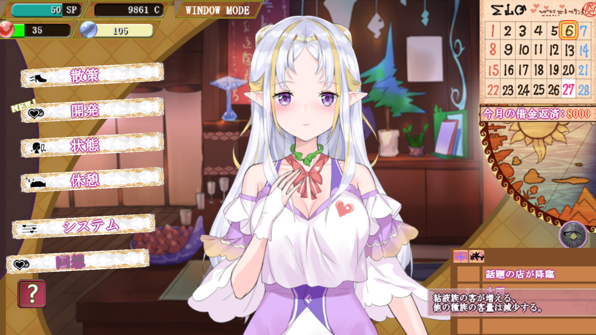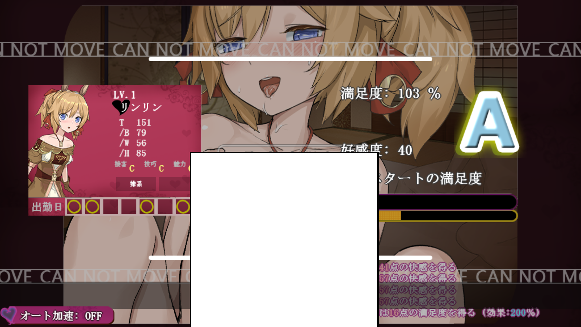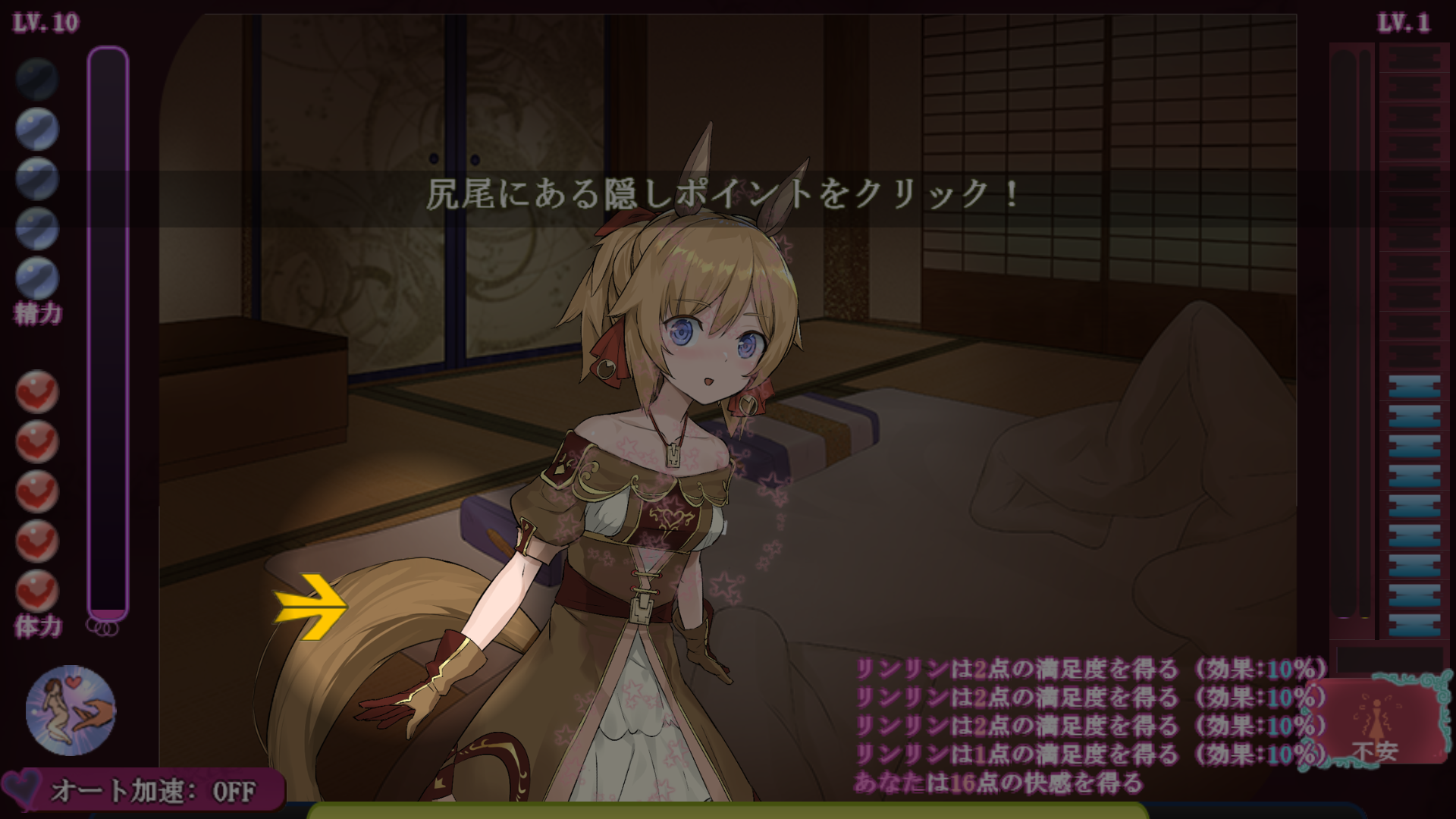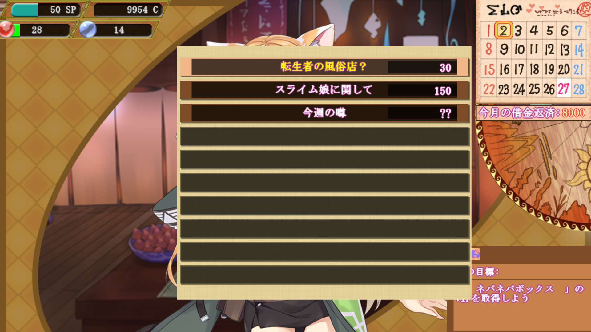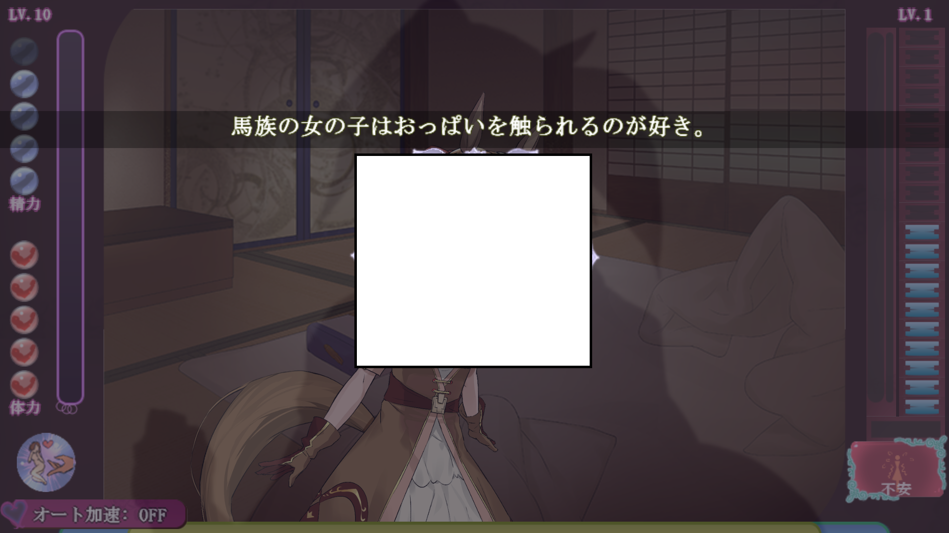 게임자체가 쉽기 때문에 노말로 갑시다튜토리얼서비스시간동안 상대를 만족시키는 것이 목표입니다각 종족마다 약점이라던가 있어서 재미가 있습니다말종족은 가슴을 만지는게 좋다지만 긴장한 상태라 그런지 효과적이지 않습니다그럴때는 숨겨진 기술을 쓰면 되는데 이땐 꼬리를 만질 수 있습니다이렇게 숨겨진 장소가 있는 종족도 있습니다 나중에 얻는 관찰스킬로 보면 보입니다꼬리를 만져주면 긴장이 풀리고 그 뒤로 즐기면 되는데 같은 기술을 계속쓰면 둔감해 지는거 같더군요여기가 주인공의 창관밖을 산책하다가 전생자를 만납니다전생자놈들은 치트능력을 앞세워서 이쪽세계를 말아먹는다고 싫어합니다친절히 상대해 주는데당연히 처발립니다아아 이건 페라라는 것이다우오옷 이것이 펠라라는 것인가 우리도 벤치마킹하자해서 개발을 하려고 합니다엘프족으론 평범하고 슬라임에게 지원을 받으려고 합니다다른 창관으로 갑시다안녕톱을 지명하기 위해선 VIP가 되어야 하고 그러기 위해선 직원 하나를 만족시켜야 합니다이 게임의 특이한 점으로선 종족정보가 있는데이런저런 약점이라던가 정보를 알게 되면 채워지고 그 만큼 각 창관에 보너스를 받을 수 있습니다아직은 VIP가 아니라서 지명은 못합니다이렇게 시작하는게 가성비는 좋습니다랜덤이라 아무나 옵니다한번하고 나오면 슬라임들은 정력이 꽉 차있는 남자를 좋아한다는 이야기를 들을 수 있습니다정력이 딸리면 거의 최종스펙으로도 못떄리겠더군요스킬도 있습니다뭐를 찍던 자유긴 한데 접객이 제일 구립니다분별을 얻을 수 있습니다상태도 있는데스테이터스라던가직원상점의 이런저런 효과아이템을 설치할 수 있습니다놀다보면 고양이 상인도 찾아옵니다전생자들은 모두 전생특전이 있나봅니다이런저런걸 살 수도 있는데해보니 돈이 철철남기도 해서 중후반부턴 죄다 사시면 됩니다슬라임에 대한 정보도 들어주고전생자에 대한 정보도 들어줍시다짜증나는 전생자를 마음대로 할 수 있어서 인기가 좋습니다회복제는 사면 바로바로 회복됩니다 휴식누르는거보단 이득이니 사주는게 좋습니다이런건 나중에 돈의 여유가 생기면 하나씩 사면 되고이거도 나중에 사야합니다 악세류는 쓰레기니 패스선전은 너무 초반이면 해봤자 이득이 적으니 좀 시간이 지나면 해줍시다일단은 슬라임과 놀아봅시다종족정보를 보면이때까지 얻은 정보들이 보이고 이런 정보를 얻을때마다 이런저런 보너스를 받은걸 볼 수 있습니다출근일이 따로 있고 지명도 따로 안했기 때문에 랜덤으로 상대가 등장합니다관찰로 상대의 약점을 볼 수 있습니다특정부위가 아닌 다른부위가 보인다면 약점입니다이렇게 특정행동을 하면 상대종족에 대한 정보를 볼 수 있습니다서로가 서로의 첫상대였나 봅니다아침에는 휴식이나 개발을 하고밤에는 음행을 떠나면 됩니다경영페이즈도 있긴한데 크게 조작할 것도 없어서 이벤트 조건일때만 들러주면 됩니다스킬 카드를 써서 이런저런 효과를 낼 수 있습니다돈을 많이 벌진 않습니다소녀를 한명 만족시켰다면 드디어 지명이 가능해집니다돈이 더 들어가는게 문제슬라리를 지명해서 놀면 됩니다이기면 계약을 얻습니다슬라임족도 하나 덤으로 받습니다날씨에 따라 방문종족이 바뀌기도 합니다또한 행동으로도 어빌리티를 얻을 수 있습니다이번 목표는슬라임페라 개발입니다아가씨들의 경험치가 쌓이면 다른 기술들도 개발할 수 있습니다현재까지 얻은 정보는 이렇군요 나중에 돈주고 사면 됩니다다음은 미노타우루스군요낮에는 우유배달을 할 수 있습니다한붓그리기 형식으로 왔던 곳은 다시 못지나갑니다손놈들을 오크라고 부르나 보네요 이런놈들은 빨리빨리 치워주어야 합니다슬라리는 S랭시 경험치 증가 악세를 주기 때문에 노가다 장소입니다일일 수입 천을 넘기고미미에게 새로운 기술에 대한 홍보를 부탁합시다종족 우수성을 이용해서 전생자에게 대항합시다선전을 부탁합시다