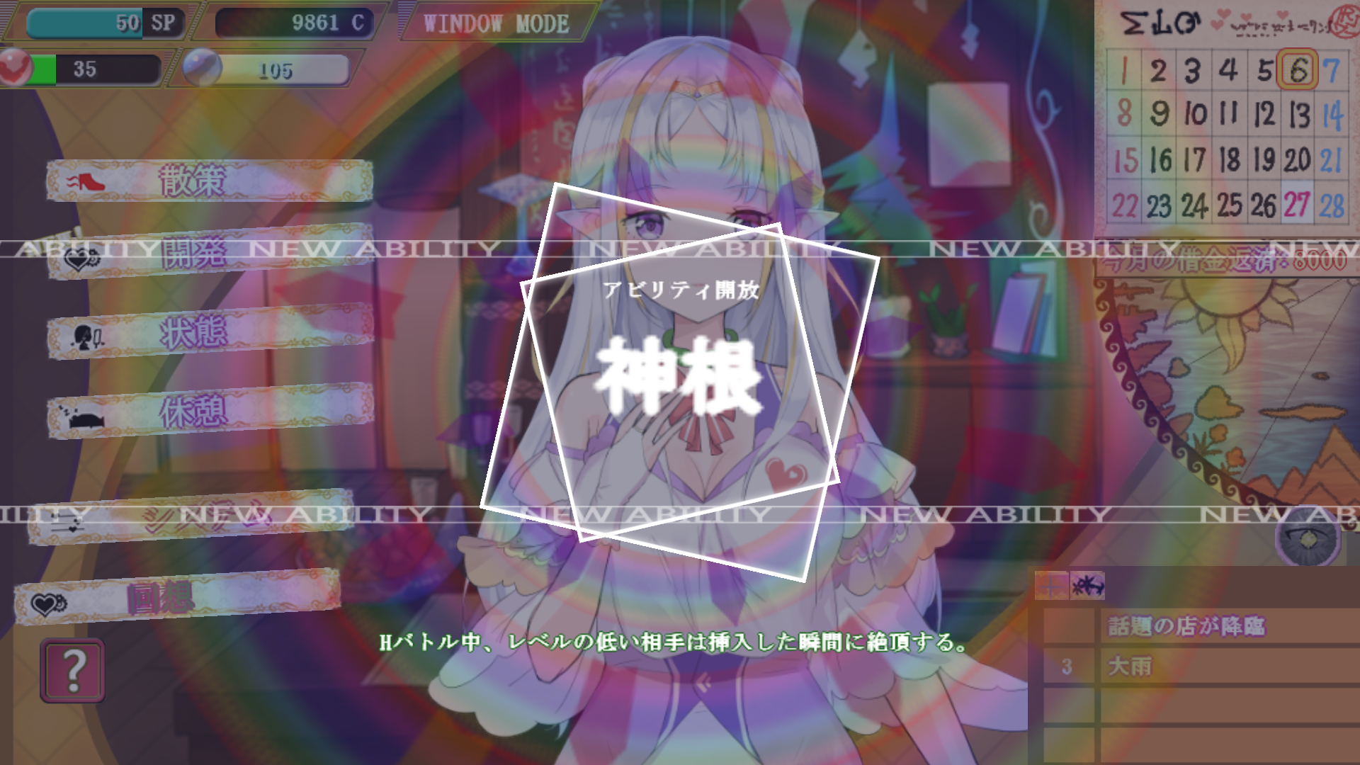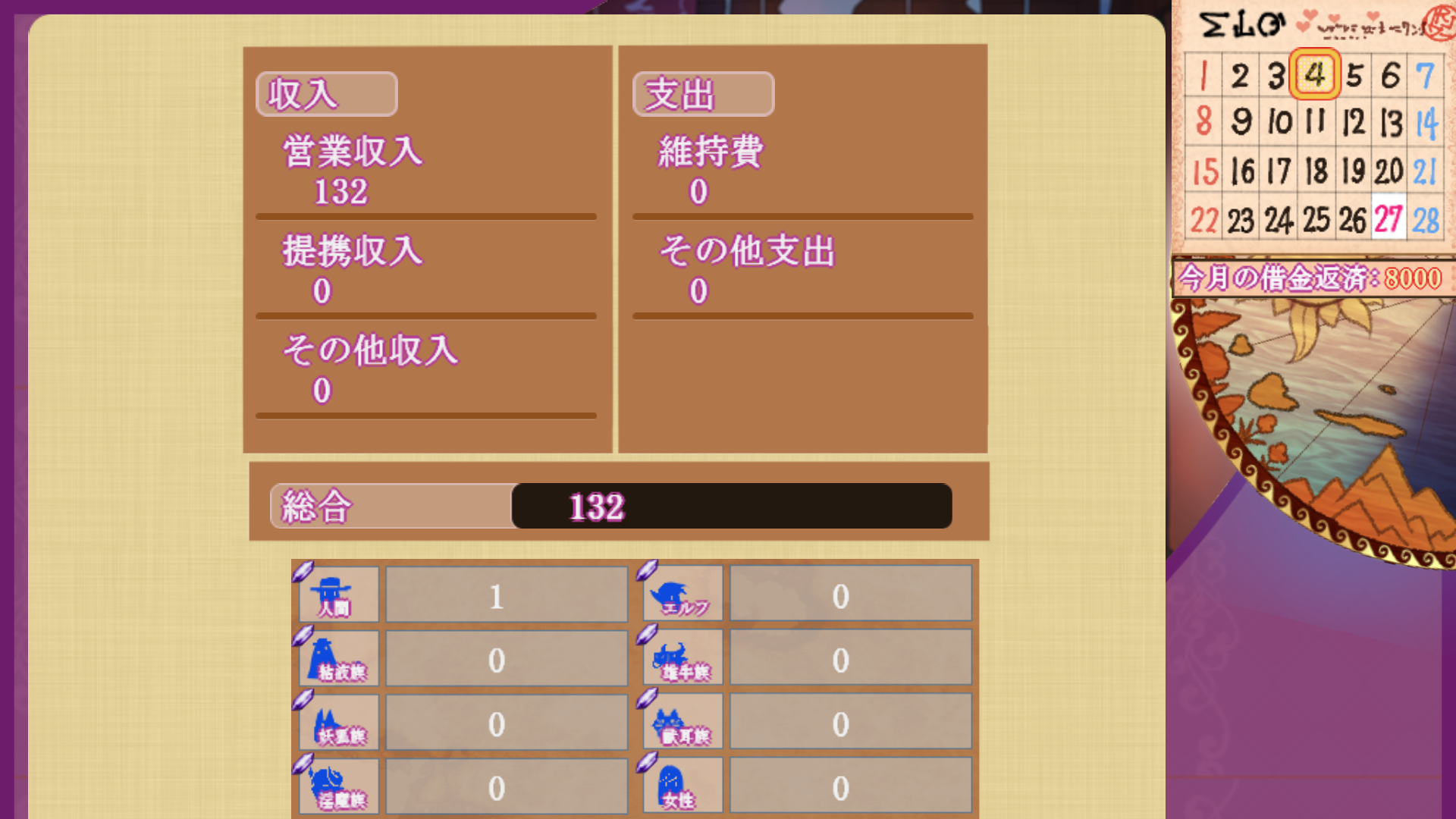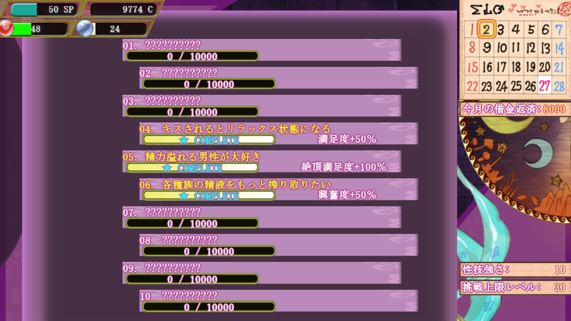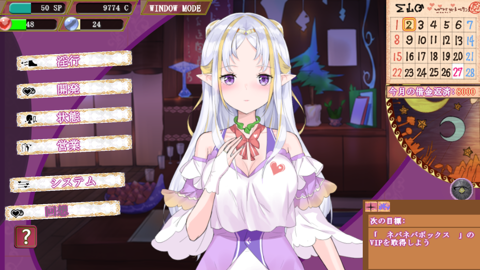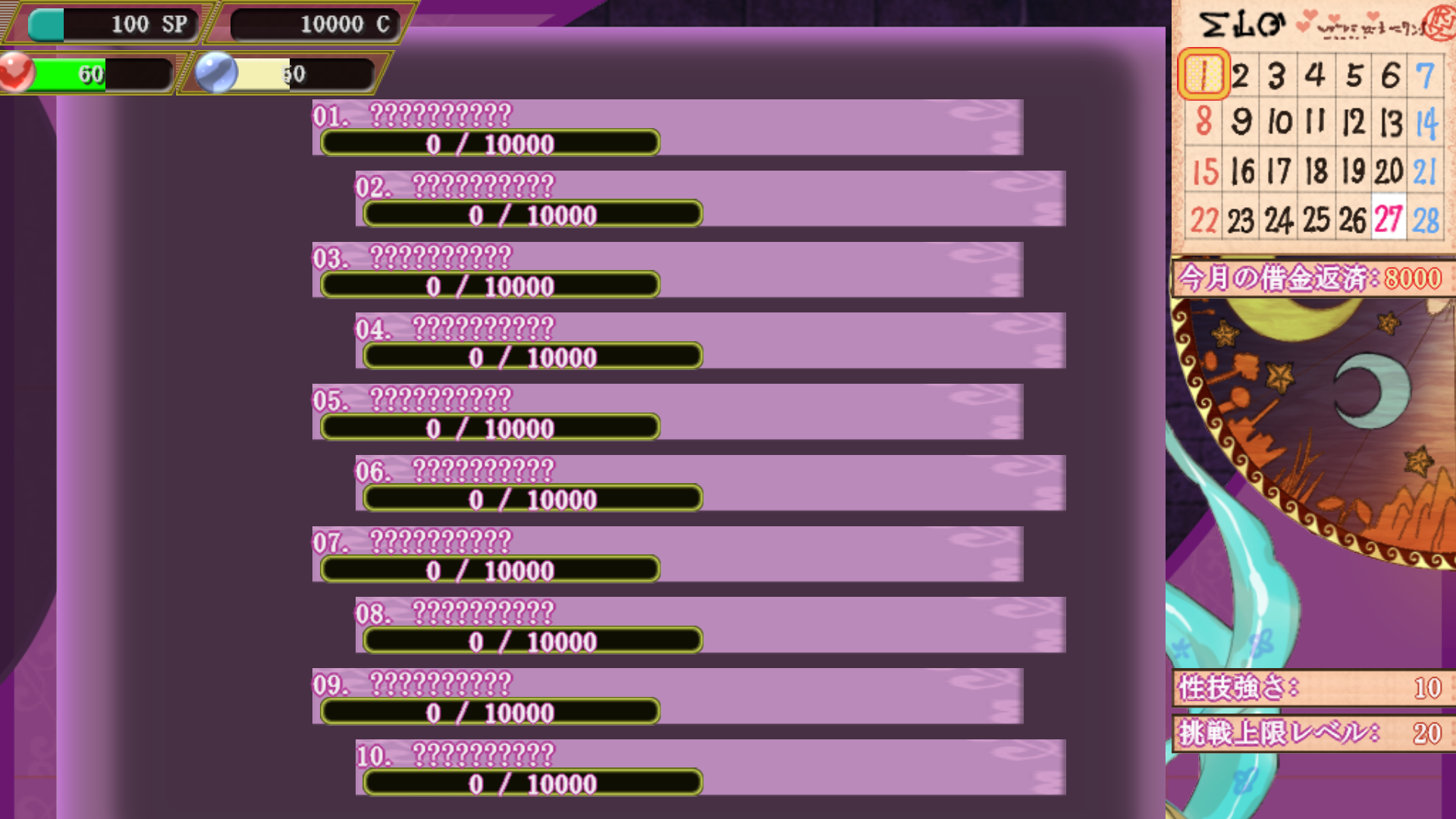 게임자체가 쉽기 때문에 노말로 갑시다튜토리얼서비스시간동안 상대를 만족시키는 것이 목표입니다각 종족마다 약점이라던가 있어서 재미가 있습니다말종족은 가슴을 만지는게 좋다지만 긴장한 상태라 그런지 효과적이지 않습니다그럴때는 숨겨진 기술을 쓰면 되는데 이땐 꼬리를 만질 수 있습니다이렇게 숨겨진 장소가 있는 종족도 있습니다 나중에 얻는 관찰스킬로 보면 보입니다꼬리를 만져주면 긴장이 풀리고 그 뒤로 즐기면 되는데 같은 기술을 계속쓰면 둔감해 지는거 같더군요여기가 주인공의 창관밖을 산책하다가 전생자를 만납니다전생자놈들은 치트능력을 앞세워서 이쪽세계를 말아먹는다고 싫어합니다친절히 상대해 주는데당연히 처발립니다아아 이건 페라라는 것이다우오옷 이것이 펠라라는 것인가 우리도 벤치마킹하자해서 개발을 하려고 합니다엘프족으론 평범하고 슬라임에게 지원을 받으려고 합니다다른 창관으로 갑시다안녕톱을 지명하기 위해선 VIP가 되어야 하고 그러기 위해선 직원 하나를 만족시켜야 합니다이 게임의 특이한 점으로선 종족정보가 있는데이런저런 약점이라던가 정보를 알게 되면 채워지고 그 만큼 각 창관에 보너스를 받을 수 있습니다아직은 VIP가 아니라서 지명은 못합니다이렇게 시작하는게 가성비는 좋습니다랜덤이라 아무나 옵니다한번하고 나오면 슬라임들은 정력이 꽉 차있는 남자를 좋아한다는 이야기를 들을 수 있습니다정력이 딸리면 거의 최종스펙으로도 못떄리겠더군요스킬도 있습니다뭐를 찍던 자유긴 한데 접객이 제일 구립니다분별을 얻을 수 있습니다상태도 있는데스테이터스라던가직원상점의 이런저런 효과아이템을 설치할 수 있습니다놀다보면 고양이 상인도 찾아옵니다전생자들은 모두 전생특전이 있나봅니다이런저런걸 살 수도 있는데해보니 돈이 철철남기도 해서 중후반부턴 죄다 사시면 됩니다슬라임에 대한 정보도 들어주고전생자에 대한 정보도 들어줍시다짜증나는 전생자를 마음대로 할 수 있어서 인기가 좋습니다회복제는 사면 바로바로 회복됩니다 휴식누르는거보단 이득이니 사주는게 좋습니다이런건 나중에 돈의 여유가 생기면 하나씩 사면 되고이거도 나중에 사야합니다 악세류는 쓰레기니 패스선전은 너무 초반이면 해봤자 이득이 적으니 좀 시간이 지나면 해줍시다일단은 슬라임과 놀아봅시다종족정보를 보면이때까지 얻은 정보들이 보이고 이런 정보를 얻을때마다 이런저런 보너스를 받은걸 볼 수 있습니다출근일이 따로 있고 지명도 따로 안했기 때문에 랜덤으로 상대가 등장합니다관찰로 상대의 약점을 볼 수 있습니다특정부위가 아닌 다른부위가 보인다면 약점입니다이렇게 특정행동을 하면 상대종족에 대한 정보를 볼 수 있습니다서로가 서로의 첫상대였나 봅니다아침에는 휴식이나 개발을 하고밤에는 음행을 떠나면 됩니다경영페이즈도 있긴한데 크게 조작할 것도 없어서 이벤트 조건일때만 들러주면 됩니다스킬 카드를 써서 이런저런 효과를 낼 수 있습니다돈을 많이 벌진 않습니다소녀를 한명 만족시켰다면 드디어 지명이 가능해집니다돈이 더 들어가는게 문제슬라리를 지명해서 놀면 됩니다이기면 계약을 얻습니다슬라임족도 하나 덤으로 받습니다날씨에 따라 방문종족이 바뀌기도 합니다또한 행동으로도 어빌리티를 얻을 수 있습니다이번 목표는슬라임페라 개발입니다아가씨들의 경험치가 쌓이면 다른 기술들도 개발할 수 있습니다현재까지 얻은 정보는 이렇군요 나중에 돈주고 사면 됩니다다음은 미노타우루스군요낮에는 우유배달을 할 수 있습니다한붓그리기 형식으로 왔던 곳은 다시 못지나갑니다손놈들을 오크라고 부르나 보네요 이런놈들은 빨리빨리 치워주어야 합니다슬라리는 S랭시 경험치 증가 악세를 주기 때문에 노가다 장소입니다일일 수입 천을 넘기고미미에게 새로운 기술에 대한 홍보를 부탁합시다종족 우수성을 이용해서 전생자에게 대항합시다선전을 부탁합시다