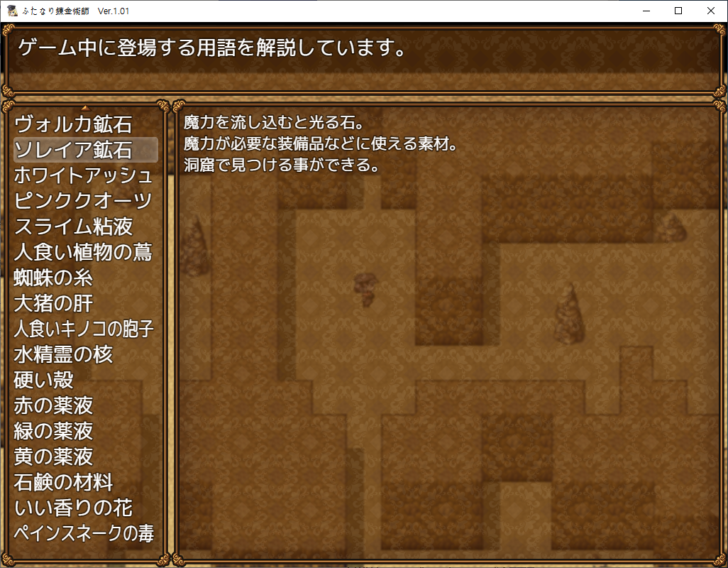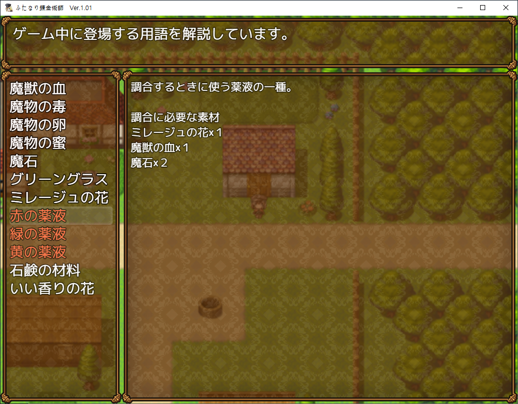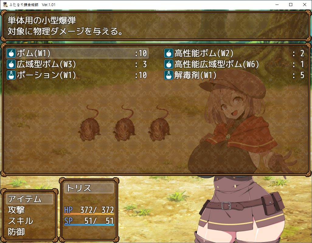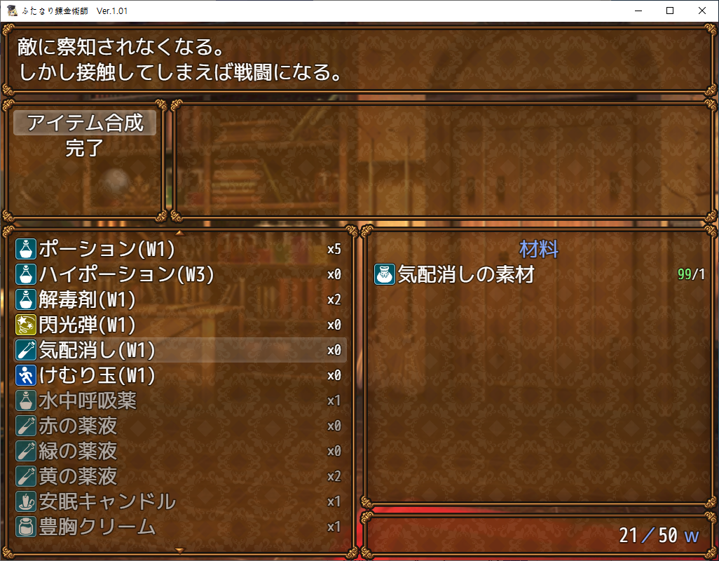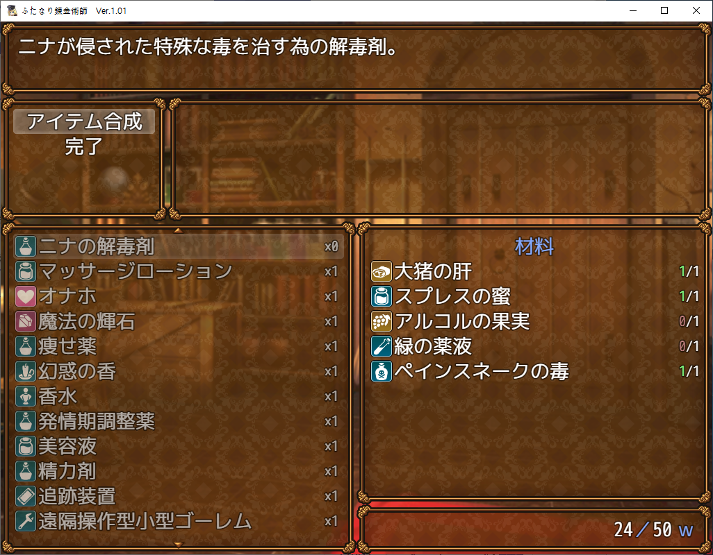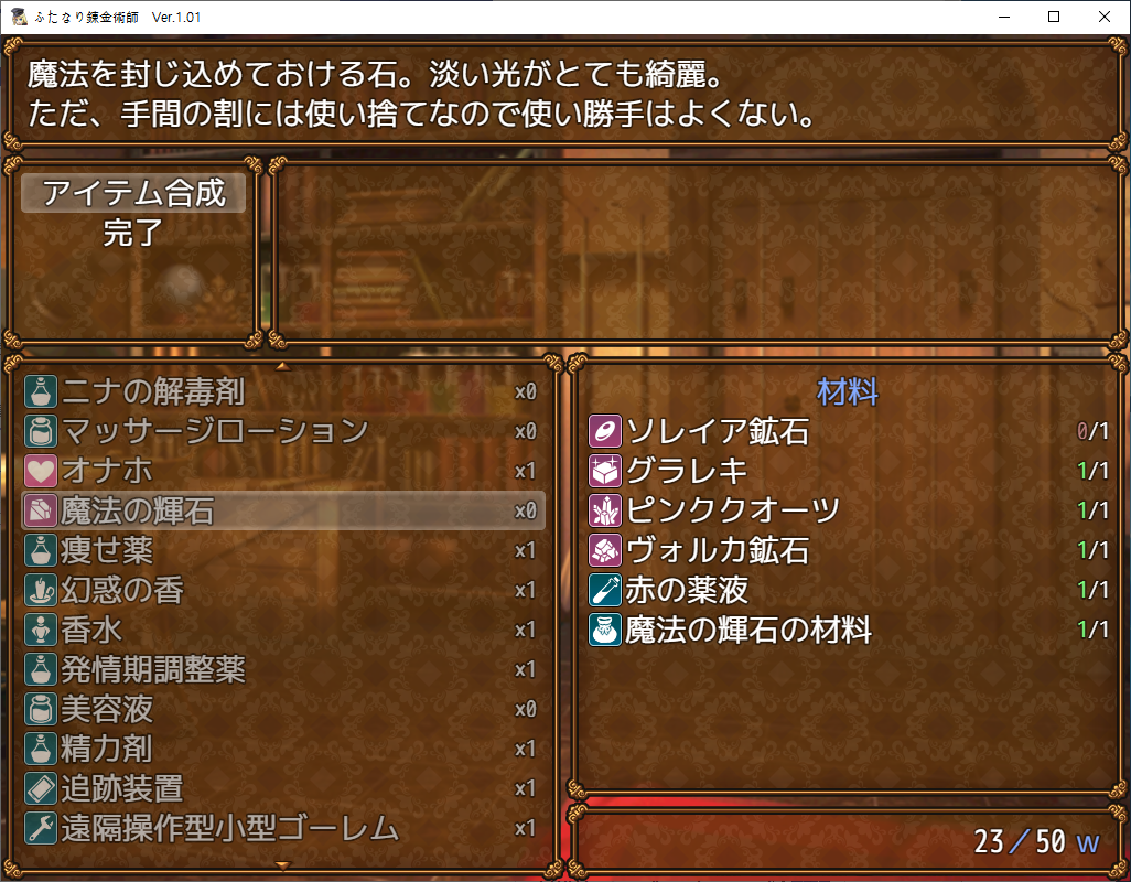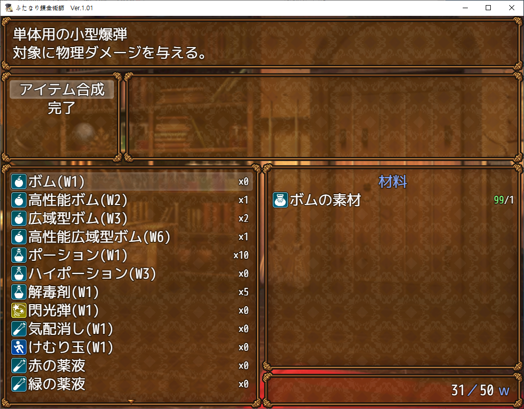 난이도는 취향껏오늘의 주인공입니다몬스터에게 당하는 소녀를 구해줍시다특이하게 아이템으로 싸우는 형식입니다폭탄을 던지며 싸웁시다거의 무제한 급이니 팍팍써줍시다오먹을 생각 만반백광화를 찾고 있습니다그냥은 안알려주네요묵을 곳이 있냐고 물으니 뭔가 있다고 하고집을 소환해 냅니다새로운 퀘스트가 추가되고간이봄이나 포션을 만들순 있는데 그리 세진 않습니다튜토리얼이니 조합을 해봅시다조합을 눌러서아이템을 만들면 됩니다촌장의 신뢰를 얻기 위해 마을 사람들을 도우려고 합니다이제부터 조합이 가능해집니다이런저런 소재를 얻는 방법이 적혀있습니다안녕놀 수 있습니다히로인들은 눈에 띄니 말을 걸면 되는데 일반 NPC도 섞여 있어서 결국 모두에게 말을 걸어야 합니다저마다 뭔가 곤란한 일이 있어서 그걸 도와주는게 목적입니다퀘스트가 추가되는 형식소재는 숲에 가면 얻을 수 있고몬스터는 기본적으로 투명상태입니다채집물도 가까이 가야 반짝입니다대부분의 소재는 다시 얻을 수 없습니다 이곳저곳 다녀봅시다가까이 가야지 이렇게 나옵니다적에 따라 드랍하는 아이템이 다릅니다아이템도 이렇게 가까이 가야 보이는데 수상쩍은 장소를 조사해보면 됩니다밖에도 몇몇 소녀들이 있는데다크엘프도 있군요당장은 못잡네요한쪽은 위험한 수인족이 있는데보스급이니고성능 봄을 써줍니다 저건 범위봄인데 안읽고 대충썻다가 위험했습니다약도 나중에 만들어야 합니다계속 탐험생각보다 길이 많습니다폭탄을 다 썻다면 귀환무게가 문제인거지 재료는 많습니다 만든건지 안만든건지는 기본재료를 보면 알기 쉽습니다퀘스트를 완료하면 소소한 돈과 평가가 오릅니다몇몇 특정장소는 바로 이동할 수 있습니다계속 탐험뭔가 기분나쁜 장소도 있는데 여기도 보스가 있으니 레벨을 올려서 도전하는거도 방법입니다가끔나오는 큰짐승 중보스격이고 이녀석이 소재인게 두세개쯤 있습니다꽤나 셉니다저기 보글보글 거리는거도 있는데가까이 가면 이벤트숨어버려서 다른 대책이 필요합니다동굴도 있고안쪽에는 박쥐라던가 거미라던가 전갈이 있습니다이쪽으로는황야가 있고안쪽에 귀여운 펫이 있습니다메스카키만 나중에 퀘스트를 줍니다협박을 하면서 특별한 보석을 구해오라고 합니다한번 궁금해서 여기로 오니왠 저택이 나오는데잠기고적들이 덤벼옵니다으엑상자들은죄다 미믹입니다죽 안으로 가면 보스전이때까지 잡몹들은 마석을 거의 확정적으로 줘서 좋긴한데 그럼 폭탄이 부족한게 문제적자체는 막 세진 않았습니다흡혈귀를 굴복시켰습니다여기도 가면특수재료를 얻을 수 있습니다이곳저곳 갈 수 있게 되었네요보석도 만들어주고광석은 동굴에서 얻을 수 있다고 해놓고는여기서 운빨로 주웠습니다 랜덤드랍인 듯 하네요알콜의 과일도랜덤드랍인듯 합니다이거도 만들어두고슬슬 하나하나 깨갔습니다여기도 기척지우고 들어가면 됩니다임무를 다 안깨도 촌장이 초대를 해옵니다대충 이정도였네요촌장과 대화를 하면 엔딩이쪽에 숨겨진 길이 있었고씨가 없으니 씨을 만들어 주는 약이였군요 정말 무서운 연금술사였습니다전회상개방가능입니다
