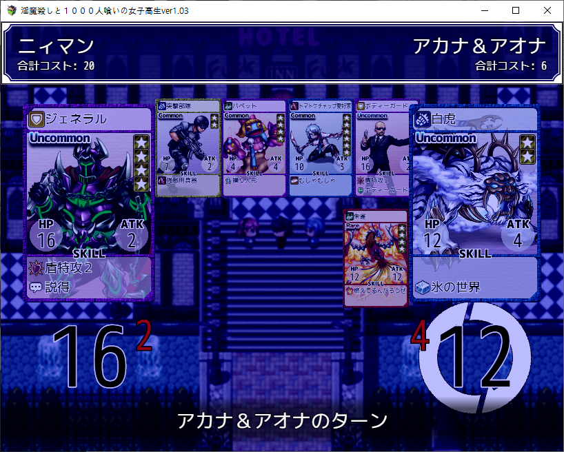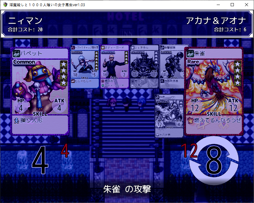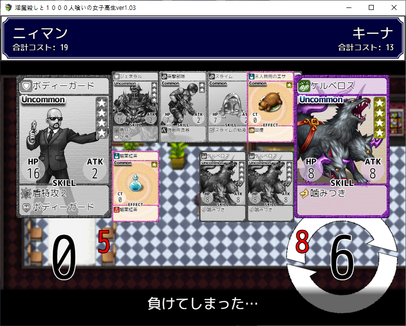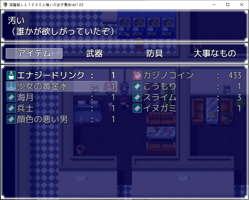 불법약물을 쓴다는 정보를 들었습니다조사조사아래랑 위랑 다른데?이기면 꽤 쓸만한 카드를 줍니다파이어스피릿을 주면 되는데 당장은 없네요어짜피 구린카드라 나중에 얻을면 바꿔먹읍시다기억을 얻고호텔로 가면 되겠군요여기도 카지노가 있고옆에는 미니게임이 있습니다숫자버튼을 눌러야 합니다숫자맞추기보단 많이주네요저기로 가면 되겠군요양옆에서 상자부터 털고 갔습니다레전드 카드도 있나보네요여기도 털고보스전백호랑 주작을 꺼내서 싸우네요꽤 셉니다이걸 주으면뭔갈 주는데 쓴 적은 없네요듀얼도 즐기고뭔가 이상한 남자도 있는데 약의 중독되서 그렇습니다위로가면전투다시 돌아와서여기도 카드교환인데 뭔 카드인지를 안찍어놨네요전투여기서 장비템을 얻을 수 있습니다무난하게 좋습니다돌 부술 수 있을 줄 알았는데 위치마다 필요 체력이 다르더군요옆으로 가니 사신이 있고숨겨진 기억의 힌트를 줍니다대충 둘러봤으면 호텔로 갑시다체력이 되니 곳곳의 돌도 부쉈습니다학교 진입전에 호텔도 들러서 깨주고여기도 이기면여기서 스피릿을 얻을 수 있습니다팔아버리고여기도 다시와서 템을 회수템을 훔치고여기 기억이 있는데하필 소녀가 막네요처발림여기서도코인을 얻을 수 있습니다여기도 부수고확정가챠를 돌려줍시다리트라이꾸역꾸역 이겼습니다여기에 기억이 하나 있습니다쓸모없는 슬라임도 얻을 수 있습니다대충 둘러보았다면 학교로죽죽 이벤트남자들이 흉폭화 되고 있네요여기 상자도 훔쳐먹고문제는 별거 없습니다죽 위로 가면 그때의 파랑빨강이 있네요이겨주고여기도 장비템이 있네요더 가면 흉폭화된 남자가 있습니다듀얼을 신청할 줄이야같이 교장과 면담을 하러 갑시다1대1 면담을 위한 초석을 깝니다이 학교도 정상은 아니네요정력이 높은게 이 사회에선 정의라고 합니다아무튼 여주의 엄마가 흑막인가 보네요병원을 운영중입니다거기로 가기위해선 VIP가 될 필요가 있습니다
