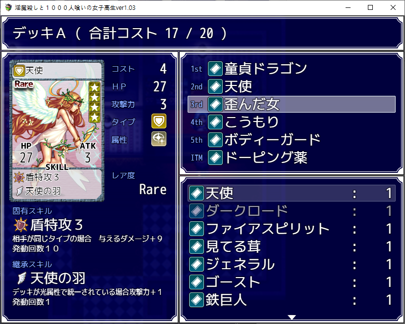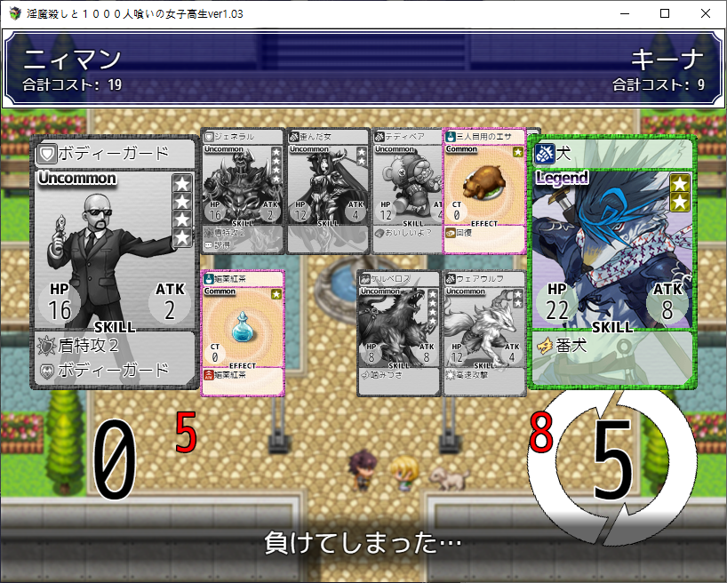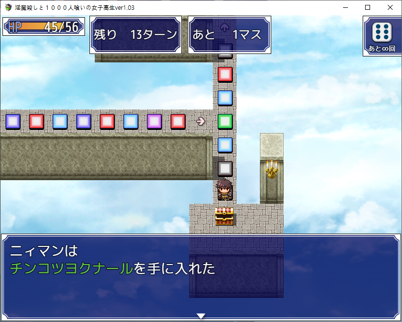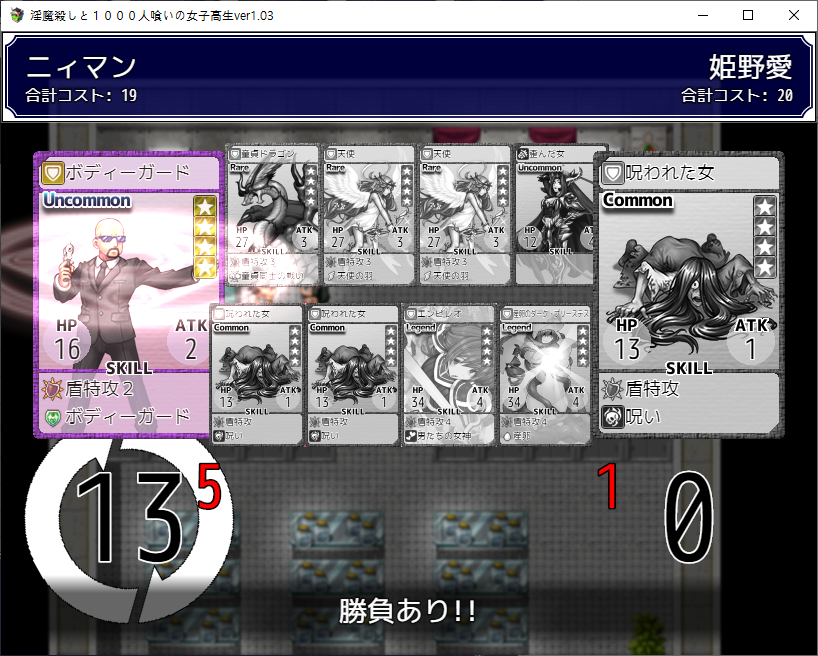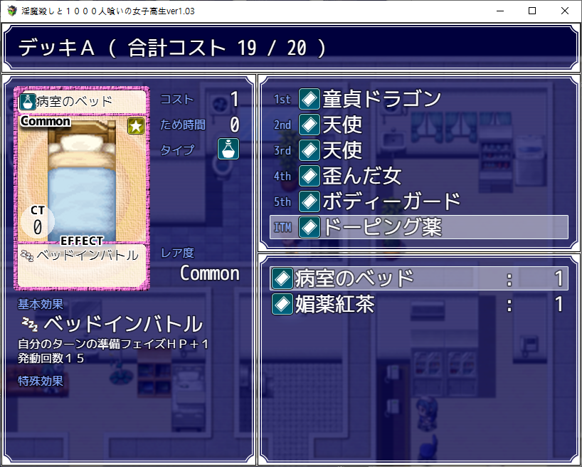 이전 맵을 안깨서 깨야하군요대충가도 되고돌을 부수고 가도 됩니다50코인이나 드네요나중에 회상을 보니 여기 몹중 하나가 전투가능한 몹같더군요무난한 카드를 얻었습니다필요한건 이 것이벤트맵이라 그런지 특별한건 없습니다생각해보니 이건 안연거 같네요그 다음 히로인의 집에 놀러가는 주인공엄마가 에로합니다알고보니 VIP에 있던 서큐버스고백을 해오네요이쯤에서 보스가 감당할 능력이 안된다고 손을 떼라고 하지만자존심에 자기가 한다고 합니다학교는 약의 부작용으로 모두 성욕을 잃고 현자가 되었네요 다행히 낫긴 합니다뭘 했다고 벌써 최종장입니다집앞에서 기억을 얻고마지막 기억은VIP룸에 있습니다너무 비싸네요가챠를 돌릴 수 있습니다병원에 갈려면이녀석을 이겨야 합니다여기부터 돌아서 카드를 좀 주워보겠습니다체력템이 있고여기에서 전투를 이기면레어카드를 얻을 수 있습니다여기는 클리어 하면 3회 돌릴 수 있습니다왼쪽은 특별한건 없네요운좋게 천사를 얻었습니다다시 진입꾸역꾸역 이겼습니다들어가고이녀석들도 괜히 휘말립니다뭔가 무서운 몹들이 있는데그냥 잡몹입니다 잡으면서 가죠듀얼로 삥을 뜯으면서 갑시다일단 2층으로 갑시다이녀석들은 괜히 휘말리고여기서 낫을 얻고내려와서 도와주고여기로 가면 최종보스전입니다더럽게 어렵더군요세이브 로드질 하면서 카드를 뽑아봤는데레어초과가 안나옵니다천사를 하나 더 주워서 데리고 갔습니다최종엔트리 여기에 도핑말고 침대를 가져갔습니다꾸역꾸역이겼습니다임무는 실패하고 나락가는 엔딩회상방이 열리고여기는 뒷엔딩이 나옵니다회상개방을 안하면이녀석과 싸워야 하는데에바임