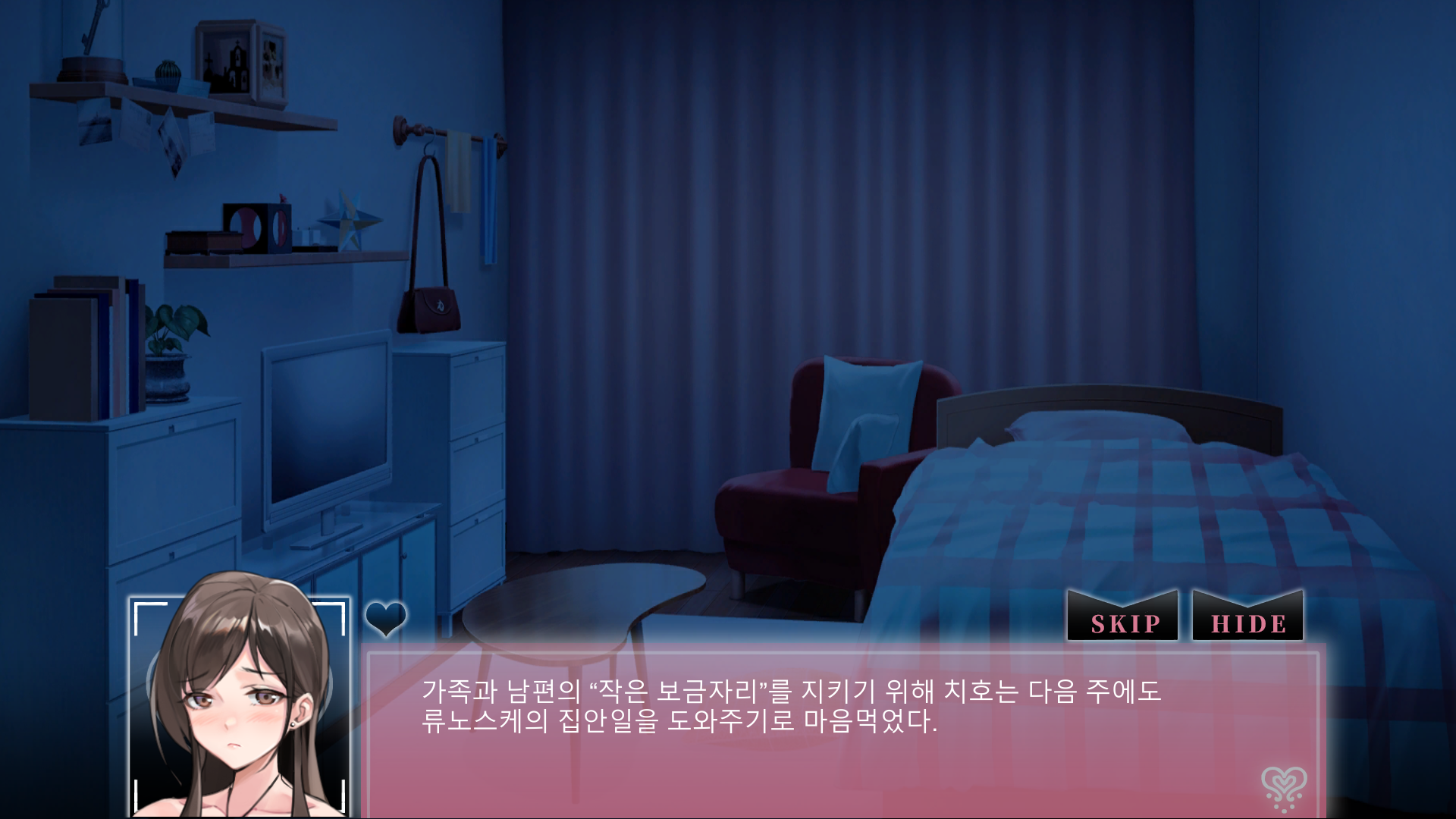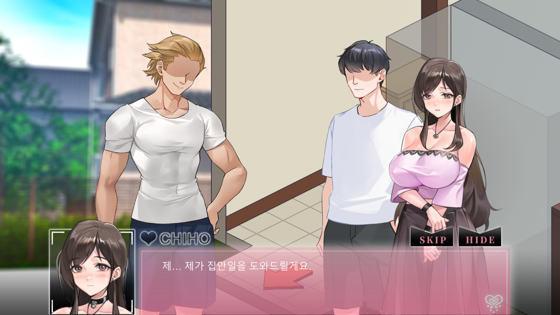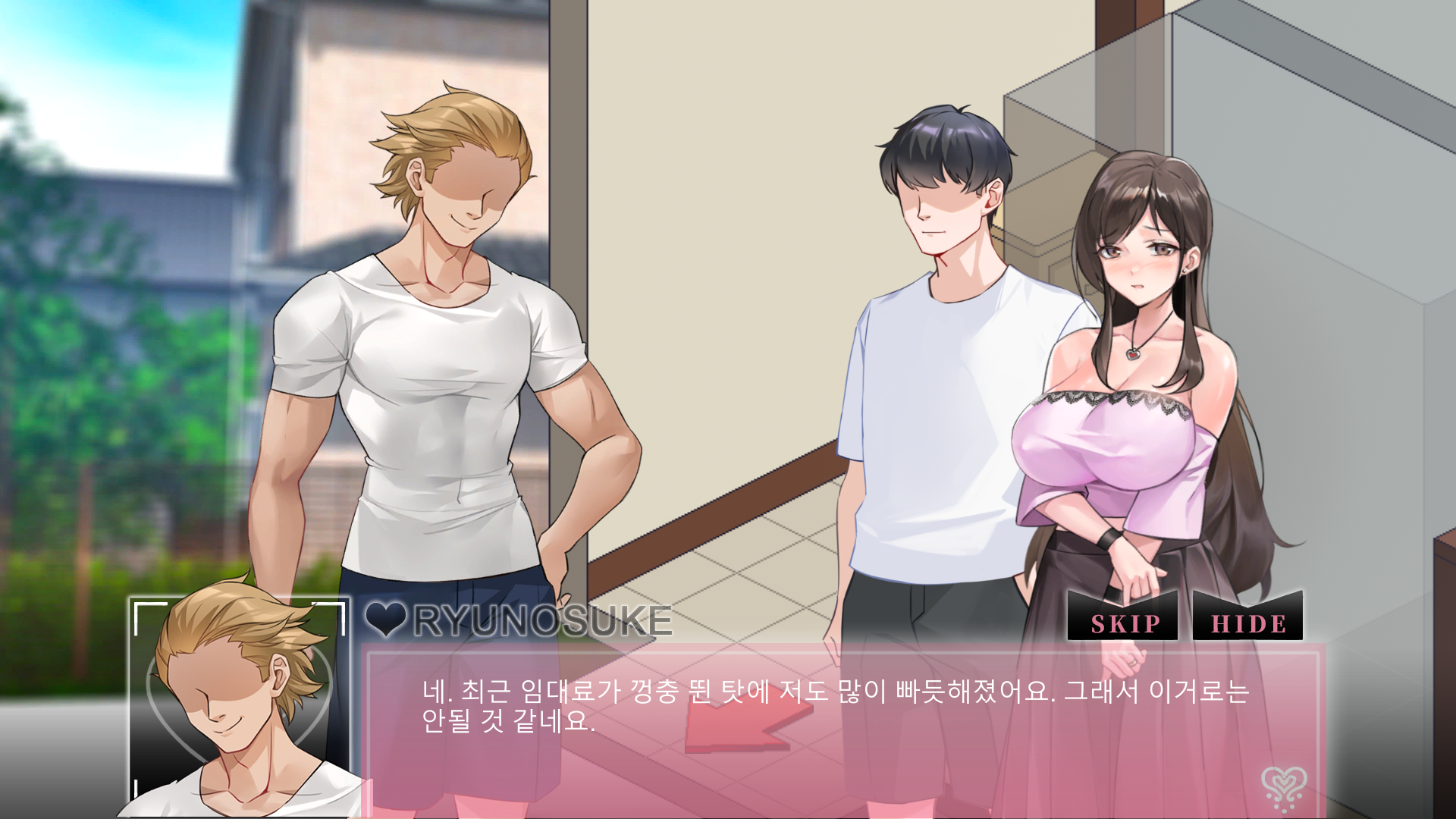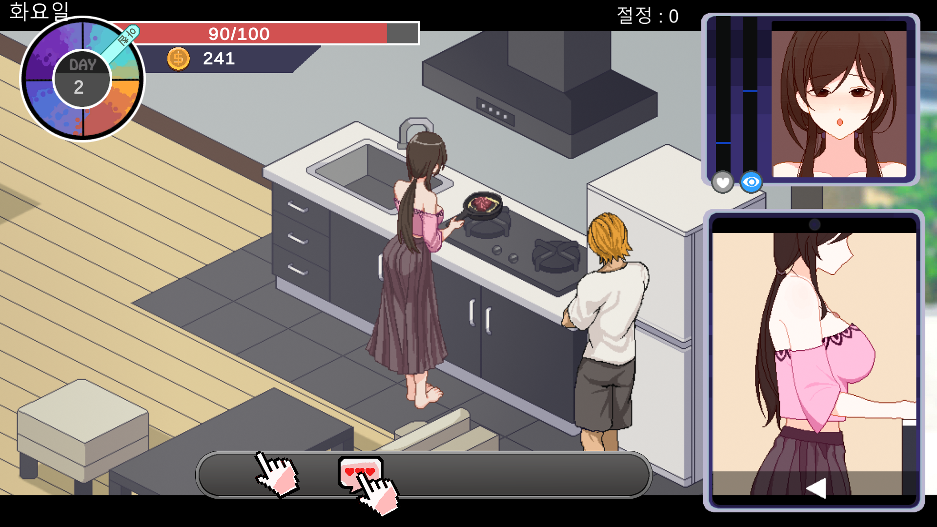 언어설정 잘 해두고돈도 많은 금태양입니다먹잇감 발견밑작업에 들어갑니다집안일을 도와주는 댓가로 월세를 받지 않습니다개꿀이능력도 있는 치트급 금태양이네요팁을 봅시다원작과 달리 시간제한이 있습니다레나인형도 있네요인형은 본편에서 리리스 인형으로 바뀌었더군요눈물은 사둡시다설명이 기네요다른거도 이것저것 살만 합니다응애 밥줘스킬들도 있네요메신저 기능도 있습니다ㅎㅇ순진한 녀석문자를 씹기도 하네요일이나 도와줘발코니도 있습니다일을 하거나 헬스장에서 체력을 늘릴 수 있습니다안되네요책같은건읽어주면 잡다한 효과가 있습니다이런거라던가이런게 있습니다 다만 최대치가 있기 때문에 많이 읽어도 의미는 없는거 같더군요낮부터 일을 하는데미니게임입니다뽈뽈뽈 날아갑시다고점을 어떻게 해서든 한번 찍어두는게 좋긴합니다야시장은 당장은 못가네요불러서요리를 시킵시다원작과 비슷한 구성인데바로만지면 의미가 없고 칭찬을 좀 해줘야 오르는거 같더군요다음부턴 놀아줍시다오이제부터 문신이 밝아집니다단계를 올려줍시다쇼타가 돈을 잘 벌어오지 못해서 어쩔 수 없이 일은 계속해야합니다월세가 공짜면 어쩔 수 없지다시와한국어로 해주세요차시간을 가져야 하는데저 템이 어딨지다른거나 열심히 샀습니다팁의 다음은 이제서야 봤네요캠이나 설치하죠화장실좀 볼게요캠이 설치가 되고오이제보니 위쪽에 템이 있더군요 누가 아래쪽부터 놔둬티타임이라지만 와인을 마십니다본편에는 아이콘이 좀 달라져 있네요 1 2 3순서로 눌러서 하트를 한칸씩 채우면 됩니다술게임도 하는데 가위바위보는 상대 마음의 색을 보고 맞게 내야합니다다시 진행일단은 밑작업을 해야합니다아내는 예스인데 남편은 계속 노군요계속 밑작업을 해주고열심히 일하네요더 높시다예문신은 점점 밝아지고 있습니다이제부턴 부스텟도 오르네요니아내 맛있더라다음은 밤에 전화리리스도 만족하네요이제 본격적인 NTR입니다이부분이 좀 어렵더군요새로운 성벽을 심어줘야 합니다이전엔 어떻게 해야 올리지 했는데 안걸리고 끝까지 한판을 해야 오르는거더군요이제부터 계획도 볼 수 있습니다야시장도 갈 수 있게 되네요