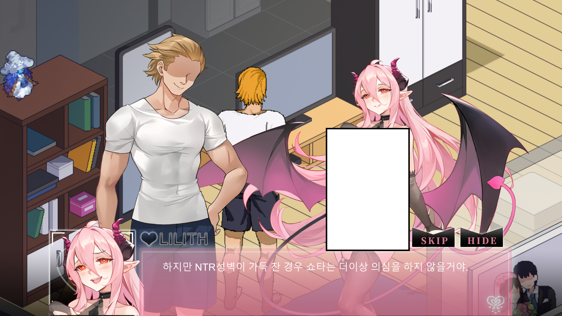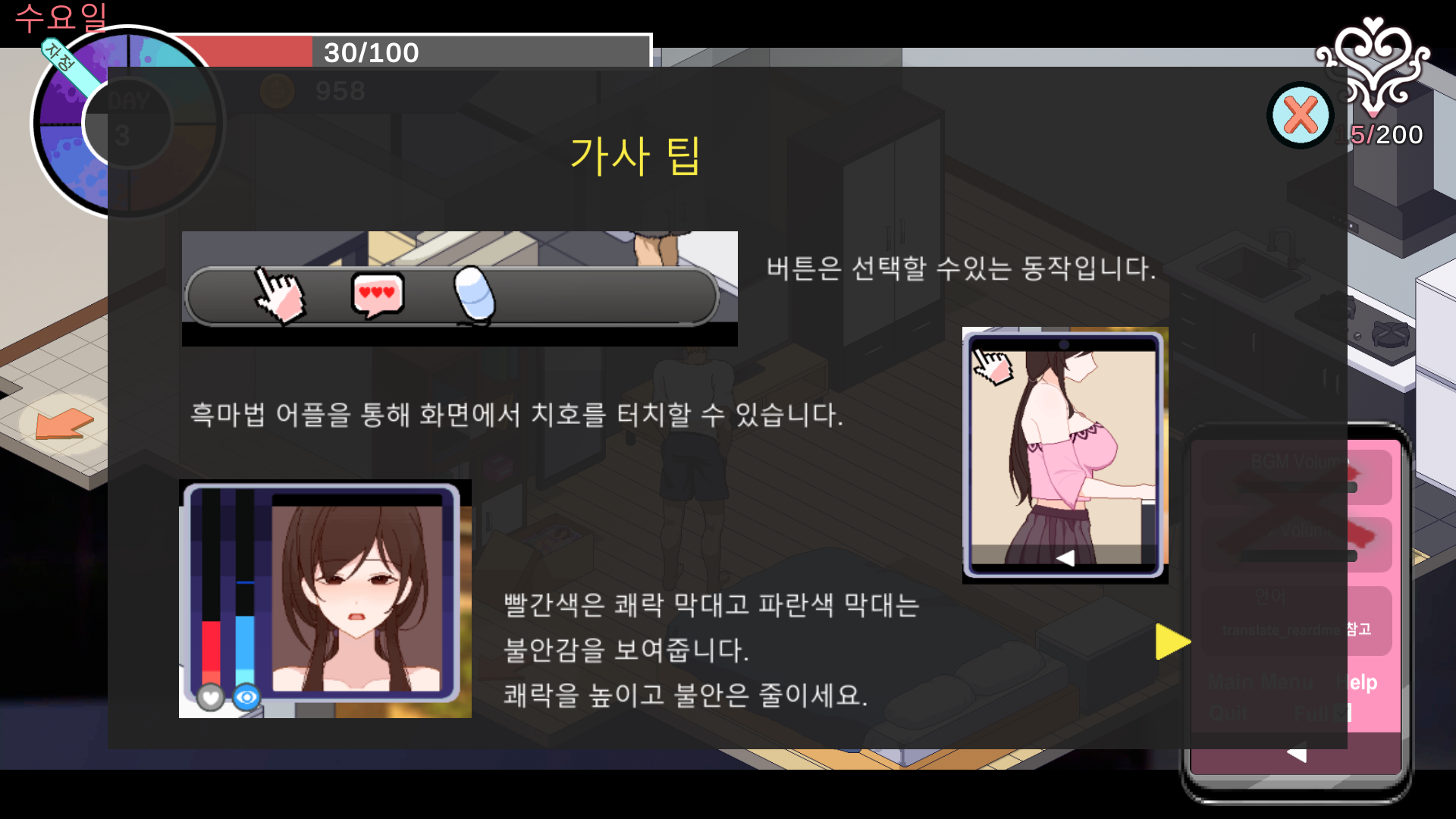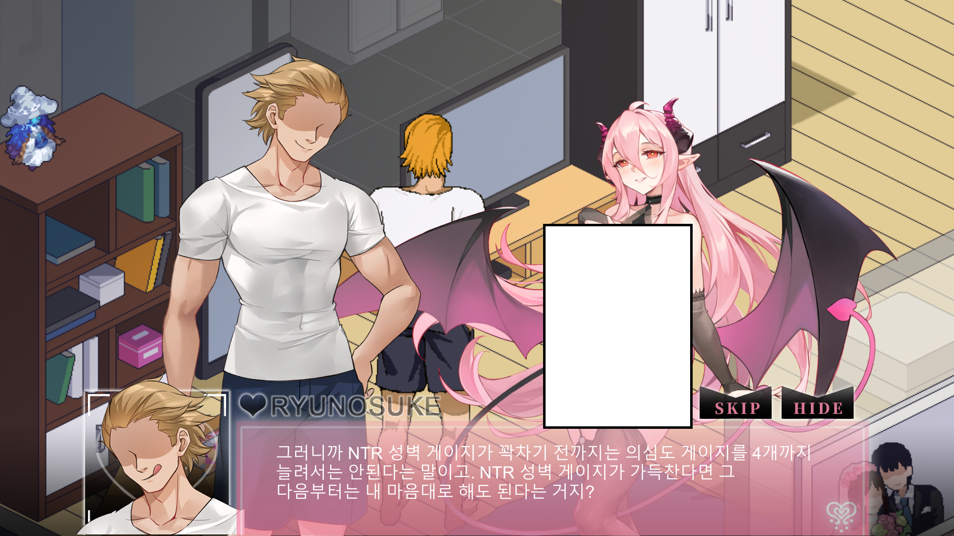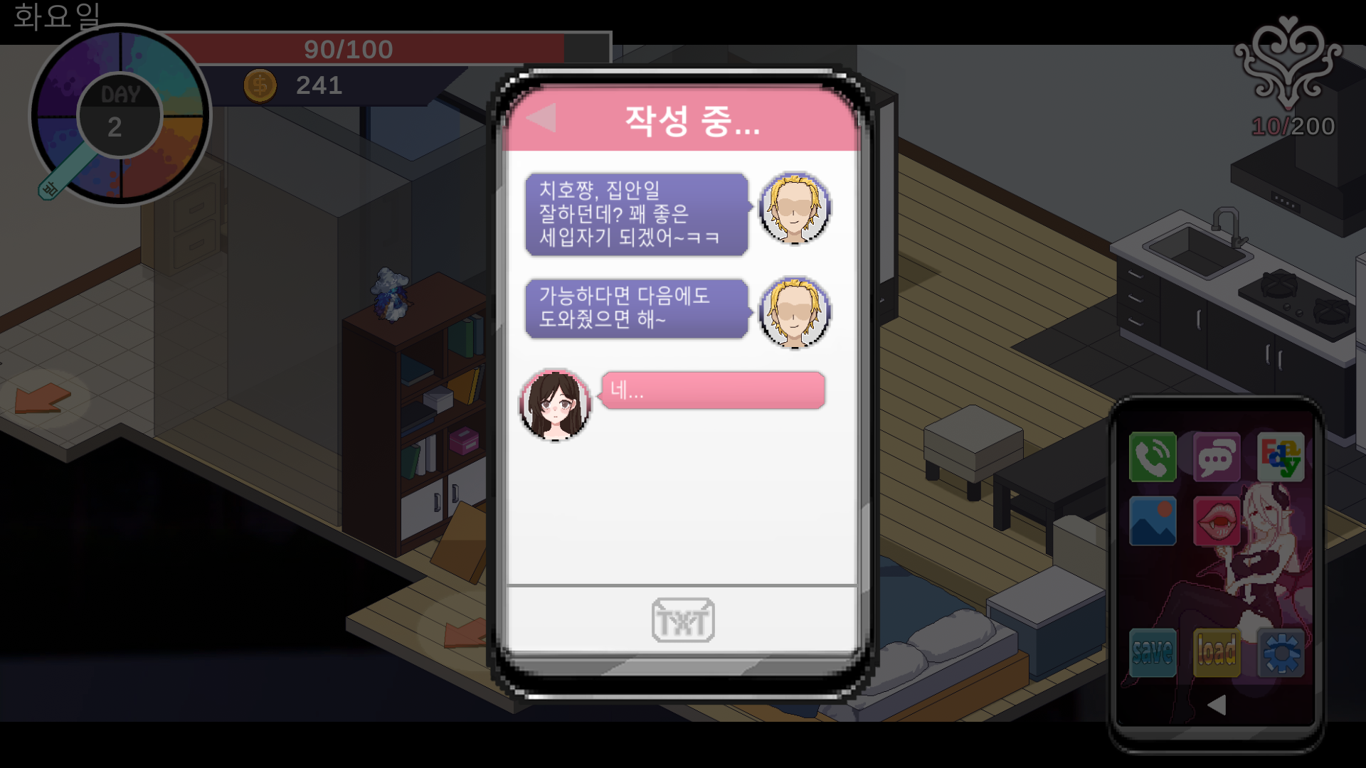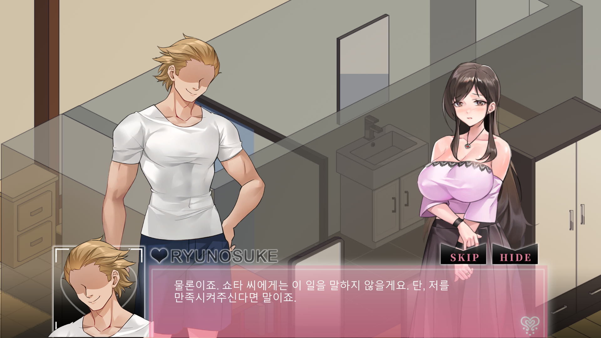 언어설정 잘 해두고돈도 많은 금태양입니다먹잇감 발견밑작업에 들어갑니다집안일을 도와주는 댓가로 월세를 받지 않습니다개꿀이능력도 있는 치트급 금태양이네요팁을 봅시다원작과 달리 시간제한이 있습니다레나인형도 있네요인형은 본편에서 리리스 인형으로 바뀌었더군요눈물은 사둡시다설명이 기네요다른거도 이것저것 살만 합니다응애 밥줘스킬들도 있네요메신저 기능도 있습니다ㅎㅇ순진한 녀석문자를 씹기도 하네요일이나 도와줘발코니도 있습니다일을 하거나 헬스장에서 체력을 늘릴 수 있습니다안되네요책같은건읽어주면 잡다한 효과가 있습니다이런거라던가이런게 있습니다 다만 최대치가 있기 때문에 많이 읽어도 의미는 없는거 같더군요낮부터 일을 하는데미니게임입니다뽈뽈뽈 날아갑시다고점을 어떻게 해서든 한번 찍어두는게 좋긴합니다야시장은 당장은 못가네요불러서요리를 시킵시다원작과 비슷한 구성인데바로만지면 의미가 없고 칭찬을 좀 해줘야 오르는거 같더군요다음부턴 놀아줍시다오이제부터 문신이 밝아집니다단계를 올려줍시다쇼타가 돈을 잘 벌어오지 못해서 어쩔 수 없이 일은 계속해야합니다월세가 공짜면 어쩔 수 없지다시와한국어로 해주세요차시간을 가져야 하는데저 템이 어딨지다른거나 열심히 샀습니다팁의 다음은 이제서야 봤네요캠이나 설치하죠화장실좀 볼게요캠이 설치가 되고오이제보니 위쪽에 템이 있더군요 누가 아래쪽부터 놔둬티타임이라지만 와인을 마십니다본편에는 아이콘이 좀 달라져 있네요 1 2 3순서로 눌러서 하트를 한칸씩 채우면 됩니다술게임도 하는데 가위바위보는 상대 마음의 색을 보고 맞게 내야합니다다시 진행일단은 밑작업을 해야합니다아내는 예스인데 남편은 계속 노군요계속 밑작업을 해주고열심히 일하네요더 높시다예문신은 점점 밝아지고 있습니다이제부턴 부스텟도 오르네요니아내 맛있더라다음은 밤에 전화리리스도 만족하네요이제 본격적인 NTR입니다이부분이 좀 어렵더군요새로운 성벽을 심어줘야 합니다이전엔 어떻게 해야 올리지 했는데 안걸리고 끝까지 한판을 해야 오르는거더군요이제부터 계획도 볼 수 있습니다야시장도 갈 수 있게 되네요