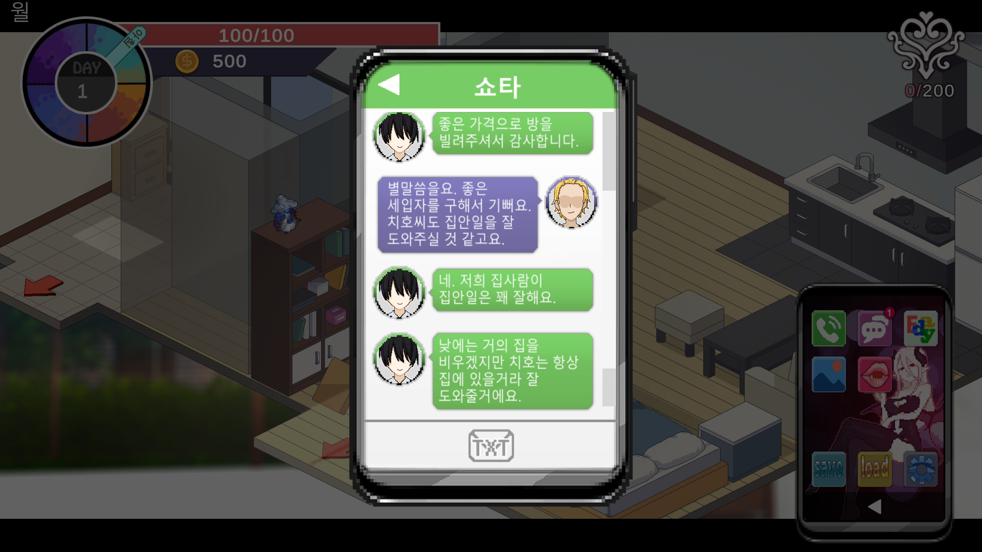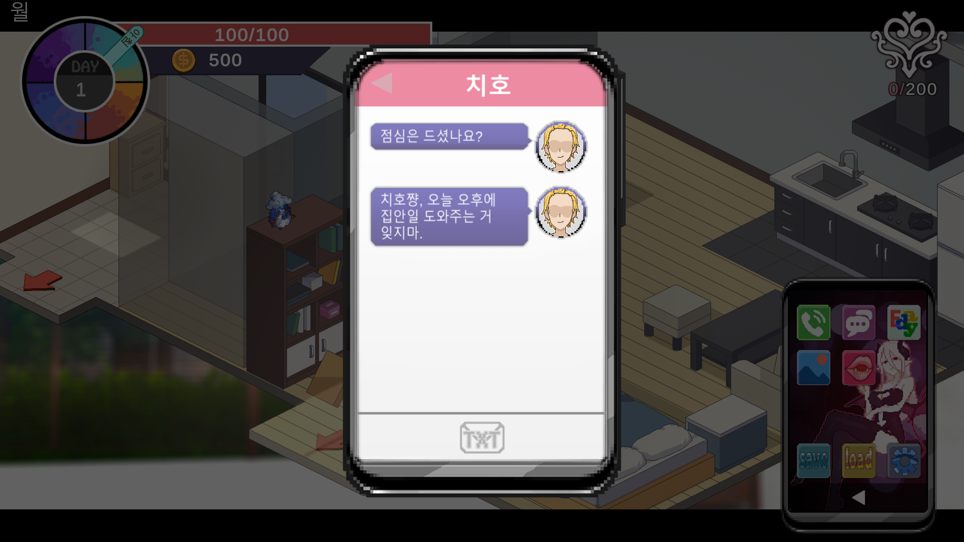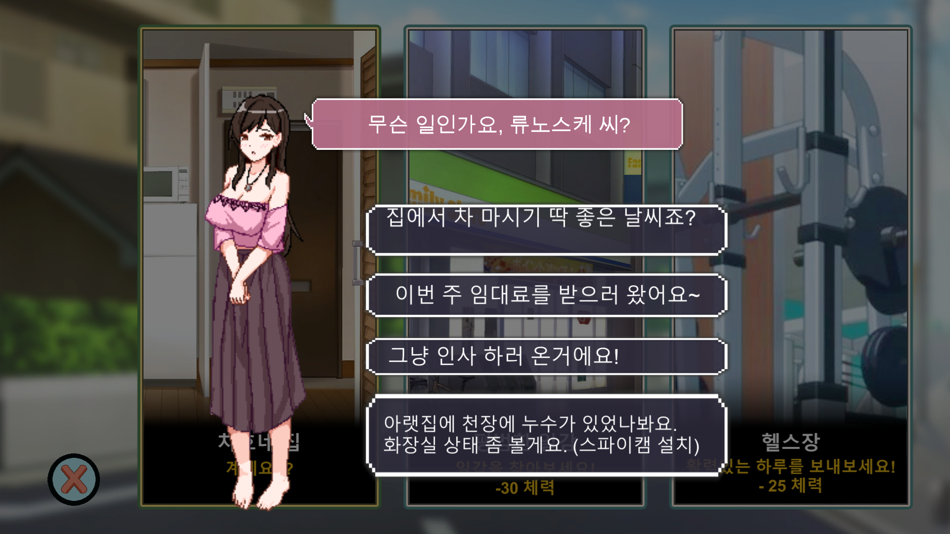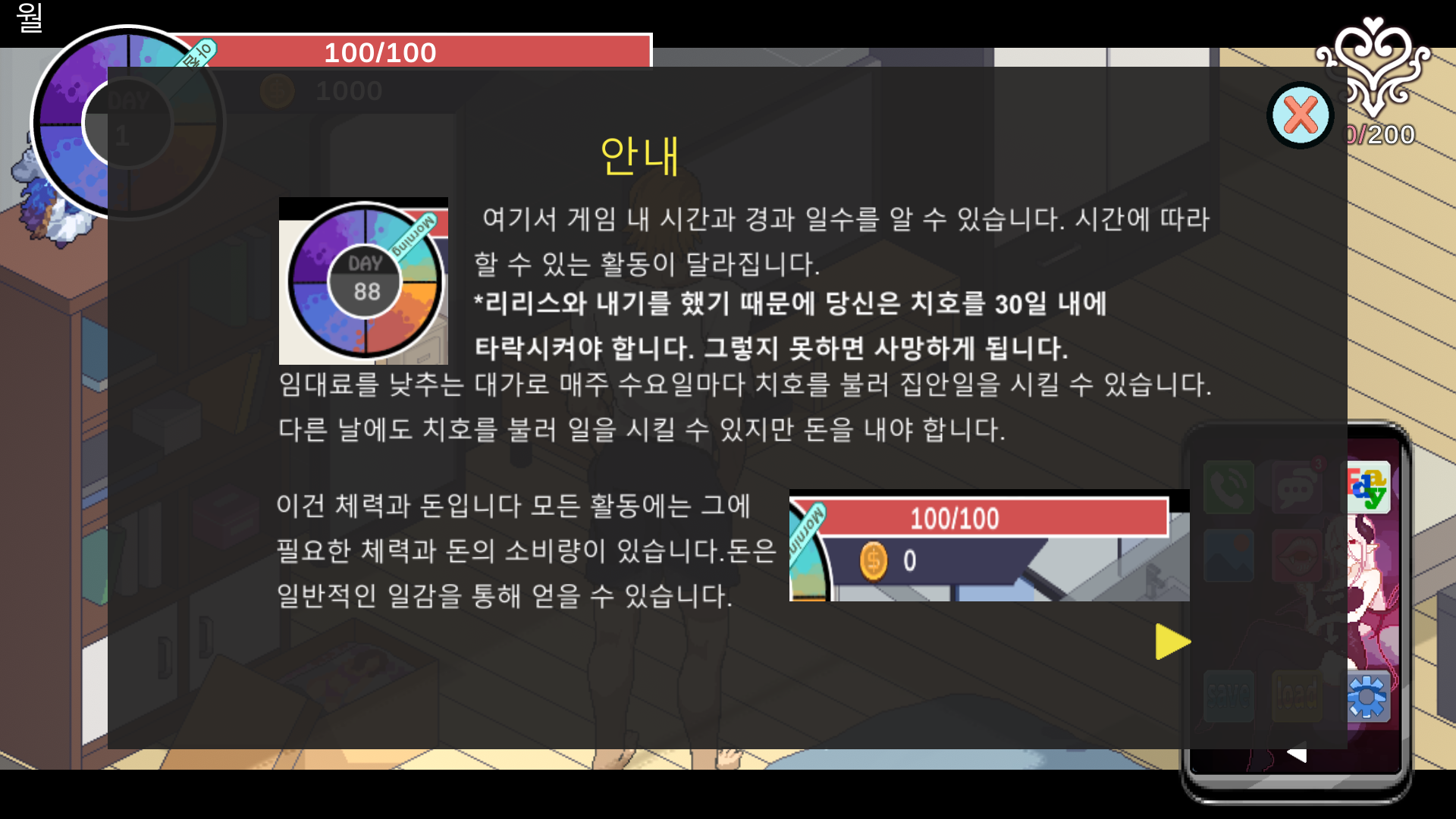 언어설정 잘 해두고돈도 많은 금태양입니다먹잇감 발견밑작업에 들어갑니다집안일을 도와주는 댓가로 월세를 받지 않습니다개꿀이능력도 있는 치트급 금태양이네요팁을 봅시다원작과 달리 시간제한이 있습니다레나인형도 있네요인형은 본편에서 리리스 인형으로 바뀌었더군요눈물은 사둡시다설명이 기네요다른거도 이것저것 살만 합니다응애 밥줘스킬들도 있네요메신저 기능도 있습니다ㅎㅇ순진한 녀석문자를 씹기도 하네요일이나 도와줘발코니도 있습니다일을 하거나 헬스장에서 체력을 늘릴 수 있습니다안되네요책같은건읽어주면 잡다한 효과가 있습니다이런거라던가이런게 있습니다 다만 최대치가 있기 때문에 많이 읽어도 의미는 없는거 같더군요낮부터 일을 하는데미니게임입니다뽈뽈뽈 날아갑시다고점을 어떻게 해서든 한번 찍어두는게 좋긴합니다야시장은 당장은 못가네요불러서요리를 시킵시다원작과 비슷한 구성인데바로만지면 의미가 없고 칭찬을 좀 해줘야 오르는거 같더군요다음부턴 놀아줍시다오이제부터 문신이 밝아집니다단계를 올려줍시다쇼타가 돈을 잘 벌어오지 못해서 어쩔 수 없이 일은 계속해야합니다월세가 공짜면 어쩔 수 없지다시와한국어로 해주세요차시간을 가져야 하는데저 템이 어딨지다른거나 열심히 샀습니다팁의 다음은 이제서야 봤네요캠이나 설치하죠화장실좀 볼게요캠이 설치가 되고오이제보니 위쪽에 템이 있더군요 누가 아래쪽부터 놔둬티타임이라지만 와인을 마십니다본편에는 아이콘이 좀 달라져 있네요 1 2 3순서로 눌러서 하트를 한칸씩 채우면 됩니다술게임도 하는데 가위바위보는 상대 마음의 색을 보고 맞게 내야합니다다시 진행일단은 밑작업을 해야합니다아내는 예스인데 남편은 계속 노군요계속 밑작업을 해주고열심히 일하네요더 높시다예문신은 점점 밝아지고 있습니다이제부턴 부스텟도 오르네요니아내 맛있더라다음은 밤에 전화리리스도 만족하네요이제 본격적인 NTR입니다이부분이 좀 어렵더군요새로운 성벽을 심어줘야 합니다이전엔 어떻게 해야 올리지 했는데 안걸리고 끝까지 한판을 해야 오르는거더군요이제부터 계획도 볼 수 있습니다야시장도 갈 수 있게 되네요