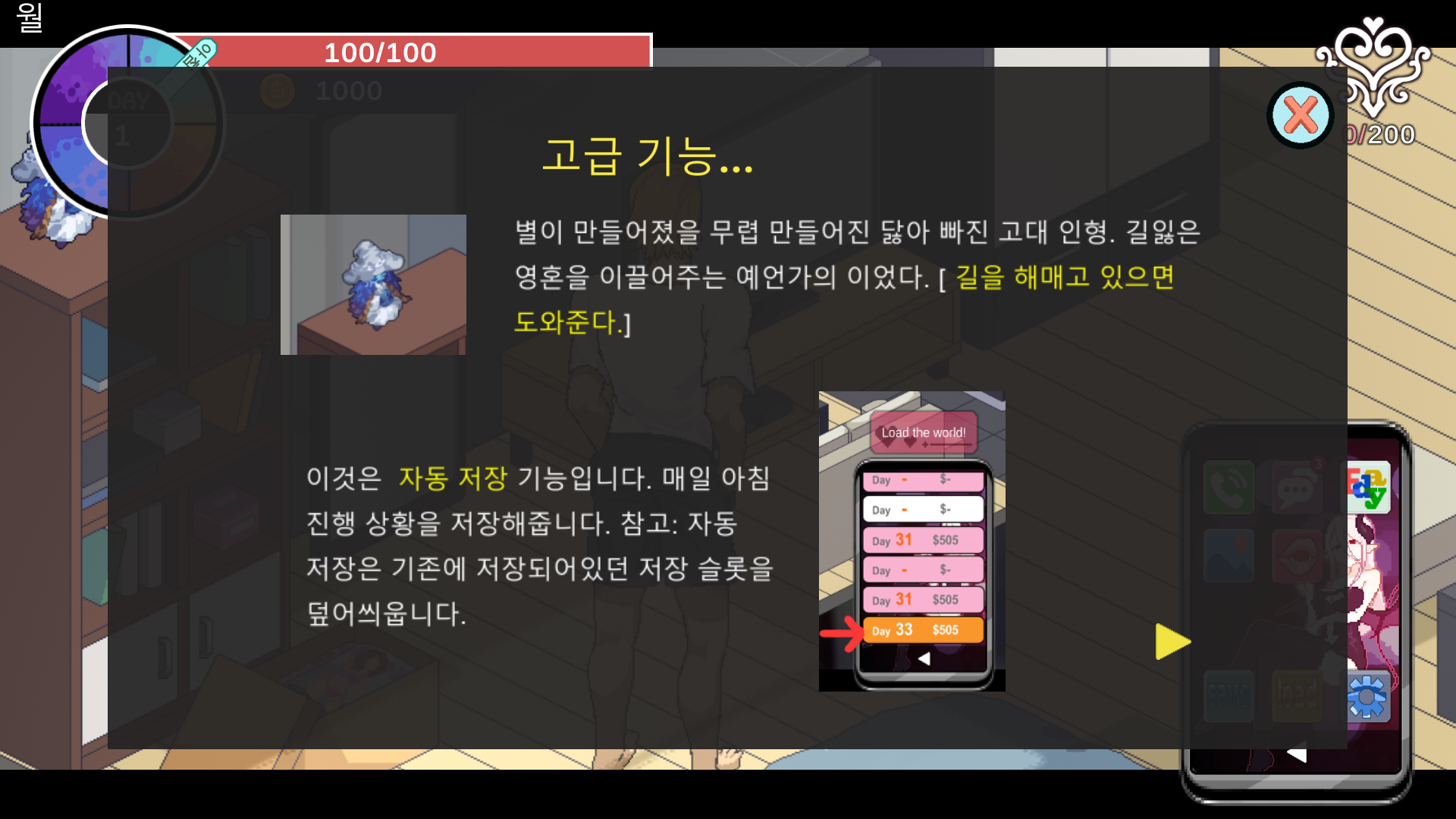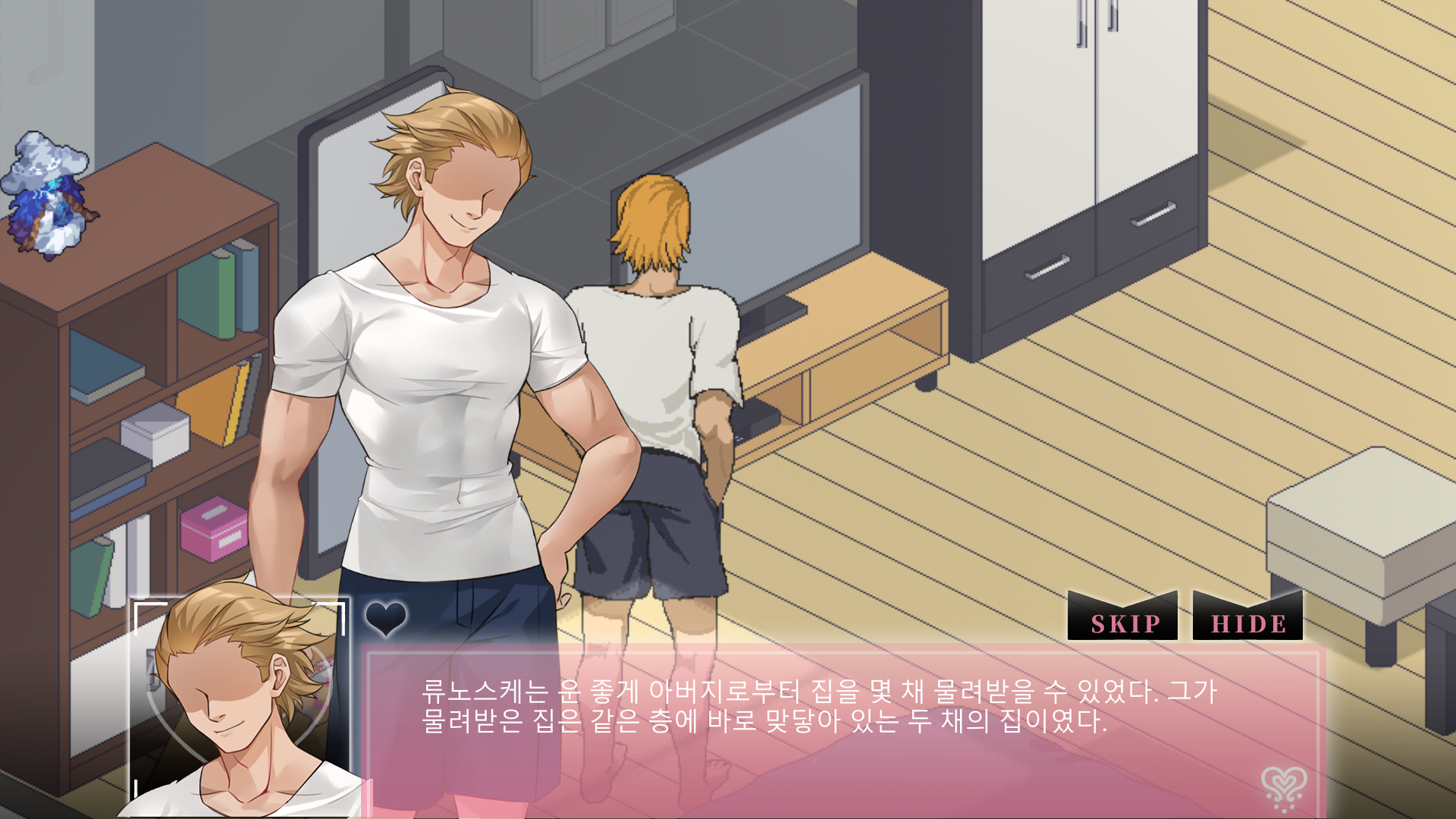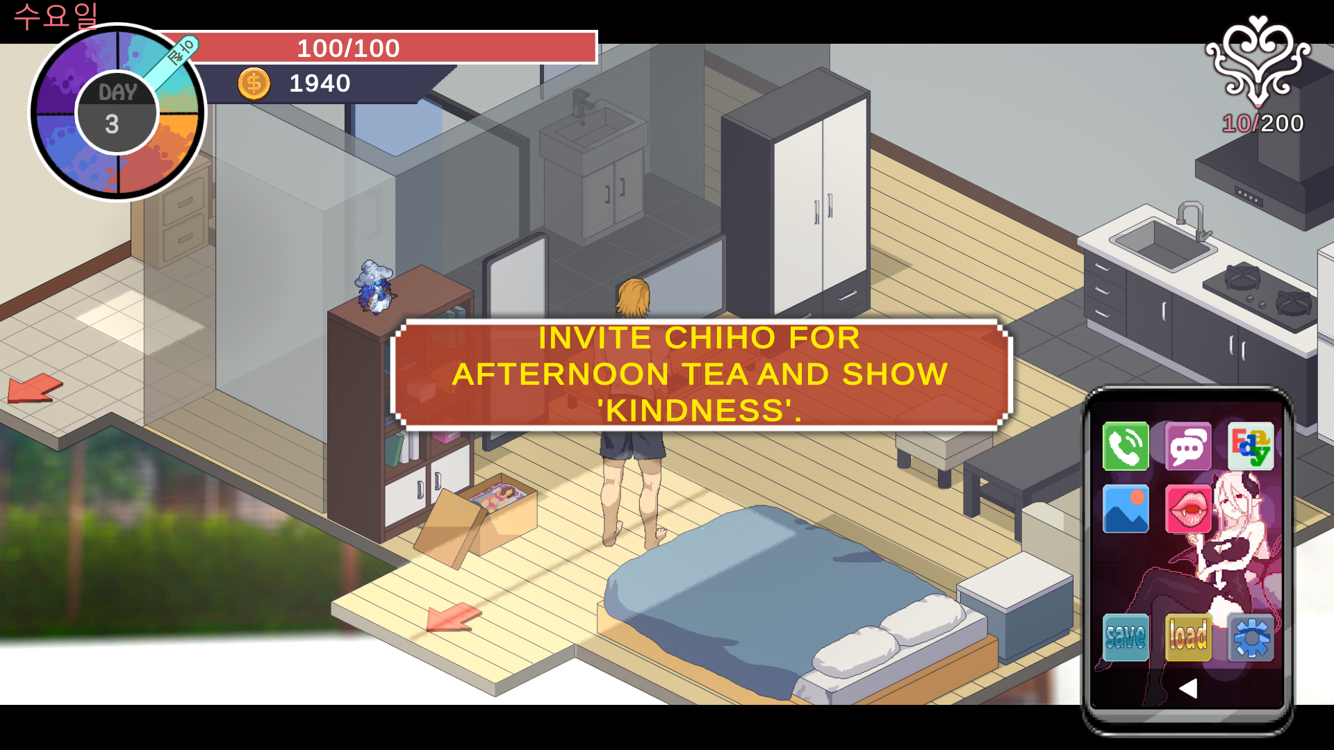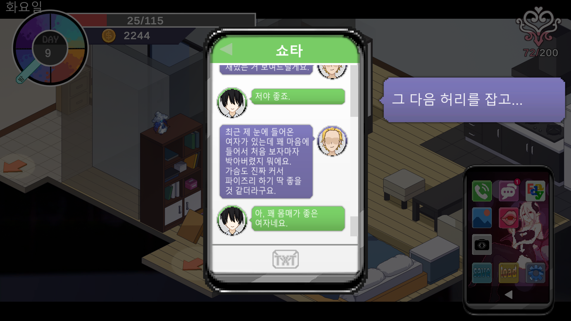 언어설정 잘 해두고돈도 많은 금태양입니다먹잇감 발견밑작업에 들어갑니다집안일을 도와주는 댓가로 월세를 받지 않습니다개꿀이능력도 있는 치트급 금태양이네요팁을 봅시다원작과 달리 시간제한이 있습니다레나인형도 있네요인형은 본편에서 리리스 인형으로 바뀌었더군요눈물은 사둡시다설명이 기네요다른거도 이것저것 살만 합니다응애 밥줘스킬들도 있네요메신저 기능도 있습니다ㅎㅇ순진한 녀석문자를 씹기도 하네요일이나 도와줘발코니도 있습니다일을 하거나 헬스장에서 체력을 늘릴 수 있습니다안되네요책같은건읽어주면 잡다한 효과가 있습니다이런거라던가이런게 있습니다 다만 최대치가 있기 때문에 많이 읽어도 의미는 없는거 같더군요낮부터 일을 하는데미니게임입니다뽈뽈뽈 날아갑시다고점을 어떻게 해서든 한번 찍어두는게 좋긴합니다야시장은 당장은 못가네요불러서요리를 시킵시다원작과 비슷한 구성인데바로만지면 의미가 없고 칭찬을 좀 해줘야 오르는거 같더군요다음부턴 놀아줍시다오이제부터 문신이 밝아집니다단계를 올려줍시다쇼타가 돈을 잘 벌어오지 못해서 어쩔 수 없이 일은 계속해야합니다월세가 공짜면 어쩔 수 없지다시와한국어로 해주세요차시간을 가져야 하는데저 템이 어딨지다른거나 열심히 샀습니다팁의 다음은 이제서야 봤네요캠이나 설치하죠화장실좀 볼게요캠이 설치가 되고오이제보니 위쪽에 템이 있더군요 누가 아래쪽부터 놔둬티타임이라지만 와인을 마십니다본편에는 아이콘이 좀 달라져 있네요 1 2 3순서로 눌러서 하트를 한칸씩 채우면 됩니다술게임도 하는데 가위바위보는 상대 마음의 색을 보고 맞게 내야합니다다시 진행일단은 밑작업을 해야합니다아내는 예스인데 남편은 계속 노군요계속 밑작업을 해주고열심히 일하네요더 높시다예문신은 점점 밝아지고 있습니다이제부턴 부스텟도 오르네요니아내 맛있더라다음은 밤에 전화리리스도 만족하네요이제 본격적인 NTR입니다이부분이 좀 어렵더군요새로운 성벽을 심어줘야 합니다이전엔 어떻게 해야 올리지 했는데 안걸리고 끝까지 한판을 해야 오르는거더군요이제부터 계획도 볼 수 있습니다야시장도 갈 수 있게 되네요