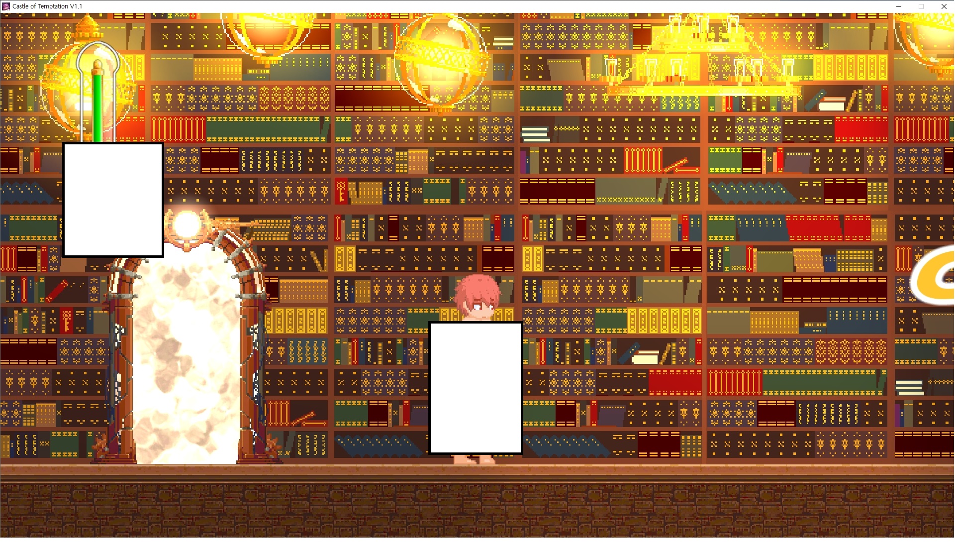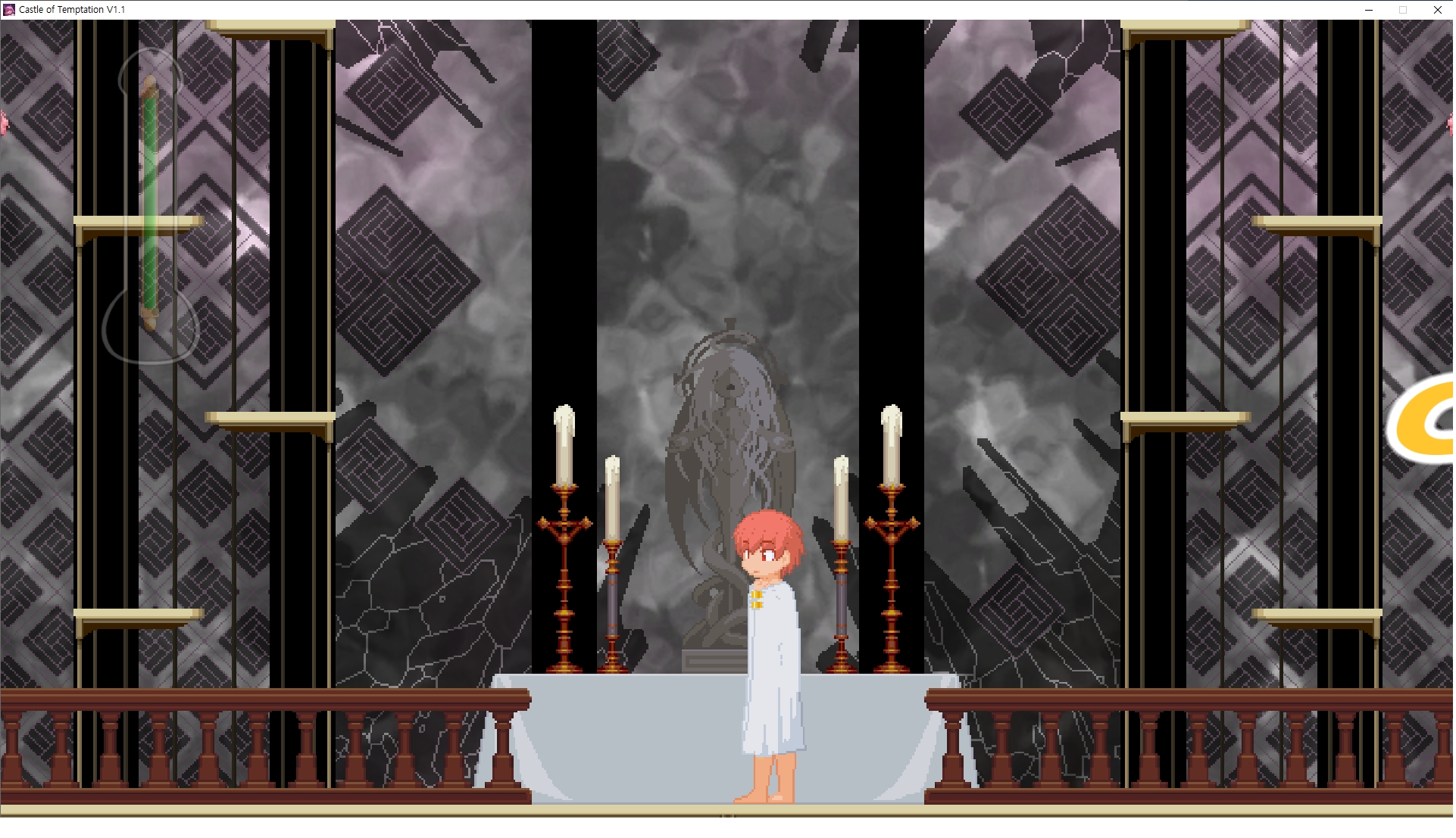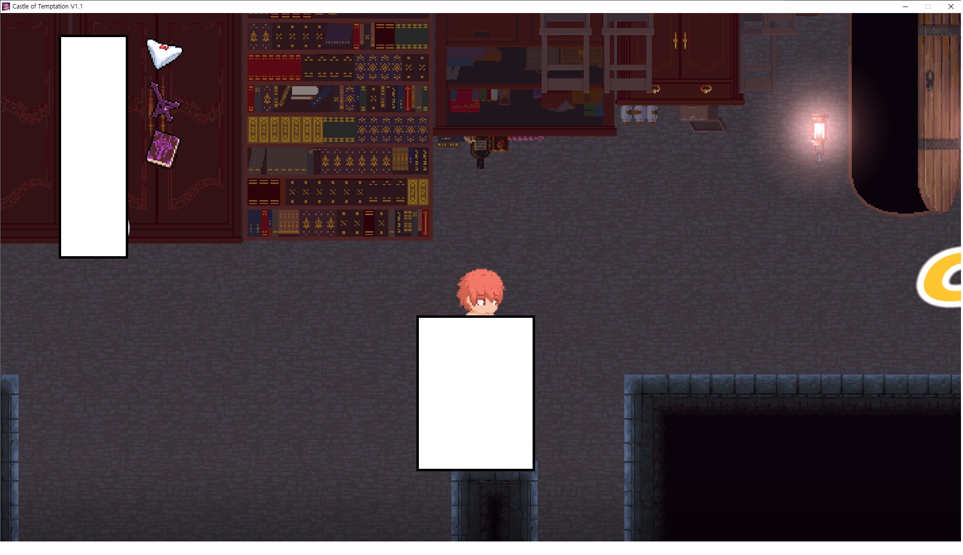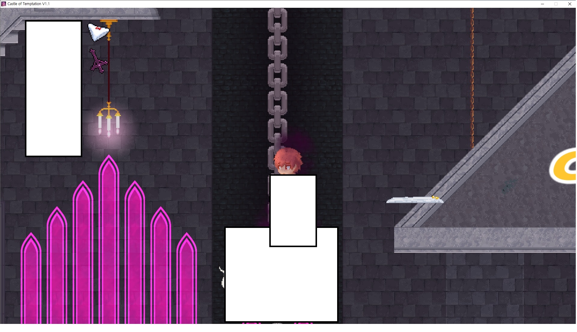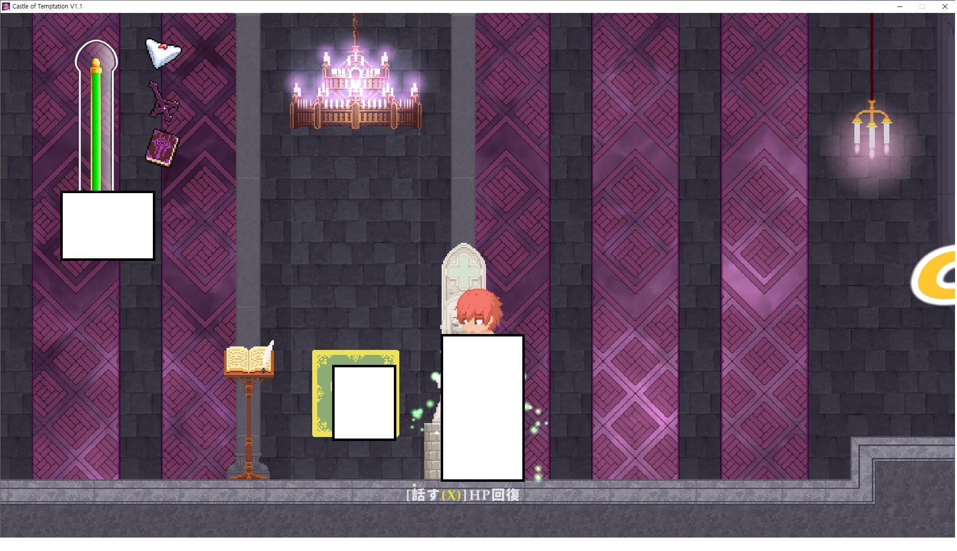 다시 처음부터여기 미믹방에서 위로 올라갑시다왼쪽에 비밀길이 있습니다죽가면 열쇠를 얻고갑자기 어두워지는데오른쪽으로 죽 달려서 도망치면 됩니다클리어하면 이렇게 열쇠가 나옵니다인형의 방은 여기 아래 상자를 치우면 길이 하나 더 있는데왼쪽 복도에서 인형이 튀어나오는길을 피해 뒤로 가면 됩니다상자를 밝고 넘어가야하나 싶긴한데 전 손에 맞아서 무적시간때 지나가졌습니다여기서 기어를 얻으면여기로 돌아오게 되고 열쇠를 얻을 수 있습니다다음은 이곳여기 점프해서 올라가면 뭔갈 조사할 수 있는데조사하면 워프가 켜집니다여기 빛에서 계속 조사하면 책상을 던질 수 있는데 그냥 던지면 죽고야스 한판 조지게 만들어 저기 앉게 만들고그 뒤에 던져주면 됩니다잘가고전지를 얻을 수 있고이걸 끼워주면열쇠로 가는 길이 열립니다여기도 온김에 3번 다 같은 곳으로 가봤습니다최종에리어는 매우 어렵다는데보스급 적이 나와서 대적합니다다만 몸이 철로 되어 있어서 자석을 켜주면 아무것도 못합니다그냥 평범히 걸어서 기계만 켜주면 깰 정도로 쉽더군요같은 곳을 3번 깨야만 도달하는 장소도 있네요뭐 별건 없었습니다여기도 최대한 날먹을 해보려고 했는데꽤 어렵더군요너무 일찍가면 닿아버려서 죽습니다계속 하다보니 되긴하더군요 날먹하는 단계가 장난이 아니기 때문에 낫긴합니다일단 되돌아가서죽 뒤로가서여기서 벽이 하나 튀어나오는데 이 뒤에 있습니다먹어둔 뒤다시 여기로이번엔 함정이 있는걸 아니까 뛰어서 넘어가줍시다무사히 탈출했습니다다시 그곳으로위서를 써서 지나갈 수 있습니다세이브장소가 있고여긴 피지컬로 넘어가야합니다살짝만 닿아도 바로 죽으니 어렵더군요어캐어캐 통과했습니다여기서 다시 정화해주고지나가면보스를 만날 수 있습니다저 랜턴이 다 꺼질때까지 버티면 됩니다공같은걸 피하면 되는데 옷을 총 4번 주니 4목숨입니다피지컬을 믿어요마지막의 발악패턴도 있습니다클리어 하면 열쇠를 쓸 수 있습니다이분은 츤츤 거리면서 같이 잘 있어주네요이쯤이면 한판 해주겠지?안해줍니다참고로 저거고르면 첨부터 해야됩니다....로드해서 올라가면?어우죽죽 위로 갑시다크게 어렵진 않더군요더 위로가면박쥐가 나와서 도와줍니다뭔가 멀쩡해졌네요이런저런 이야기가 있는데뭔 말인진 모르겠습니다대충 여기 성주가 성모의 유체를 가지고 뭔갈 했나봅니다그리고 영웅의 피로 클론을 만들어서 그 힘을 흡수하려고 한거 같네요이젤이 데몬족이고 데몬족이 평화가 싫어서 반란을 일으켰나봅니다해서 사실 지명수배당하고 있었네요이분이 조사하러 왔었나 봅니다저희가 성모랑 노는사이 튀었나봅니다반쯤 시설자첸 구라였나보네요그리고 원래 성주는 이분이였습니다하나하나 물어보고이분의 이름은 아이시스인가보네요 즐긴뒤에잘 도망가면 됩니다프리모드가 열립니다기억실이라던가 있고엔딩 그림을 구경도 할 수 있습니다친절히 수집품 위치도 적혀있고 얻기만 하면 탈출해도 획득한걸로 쳐준답니다