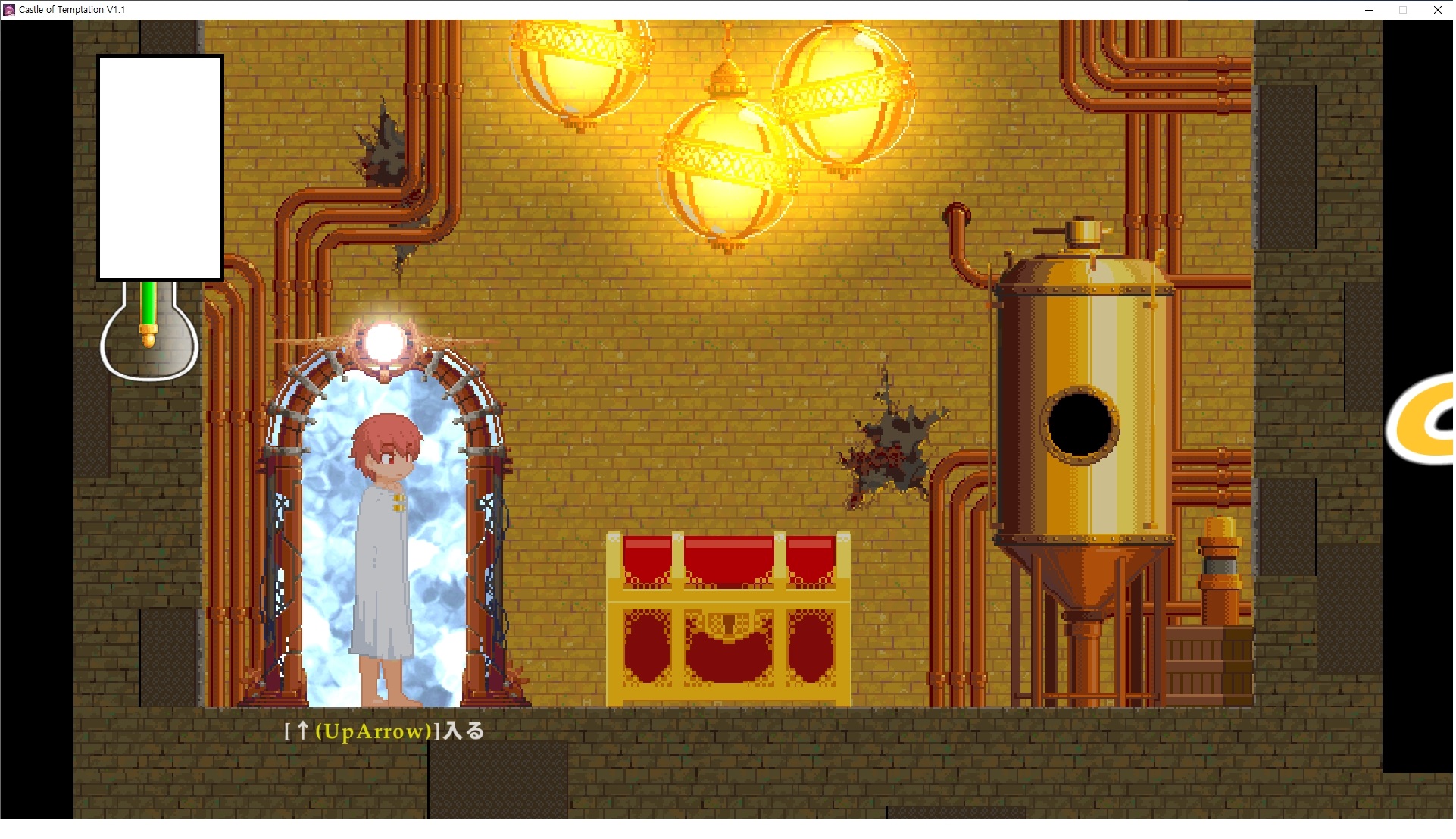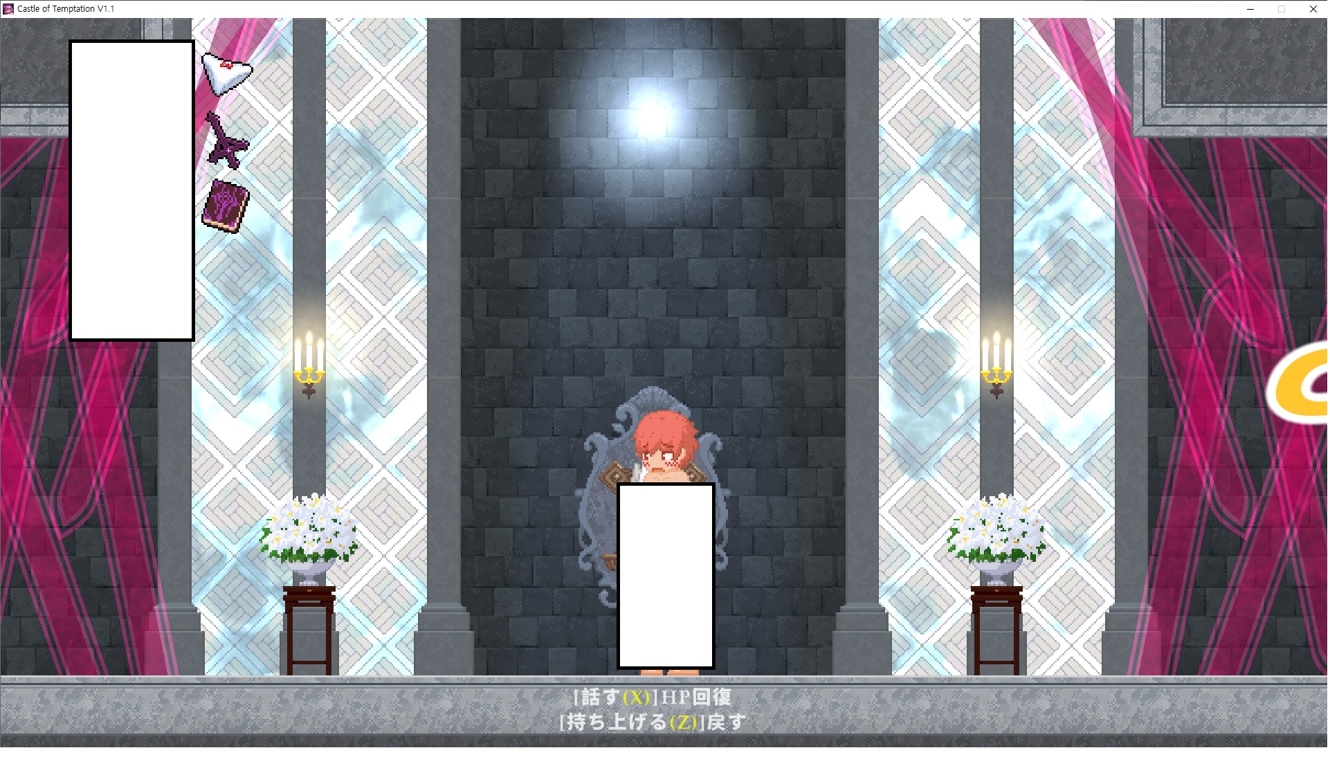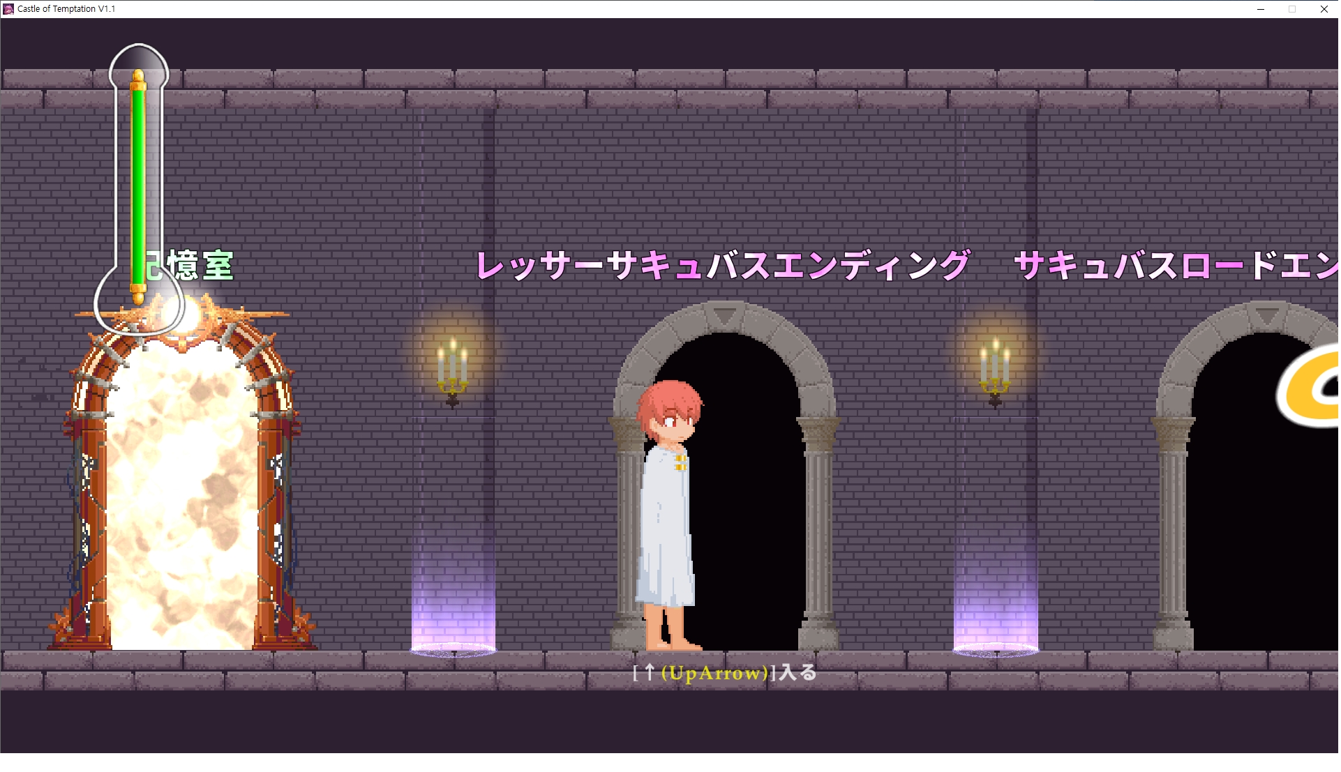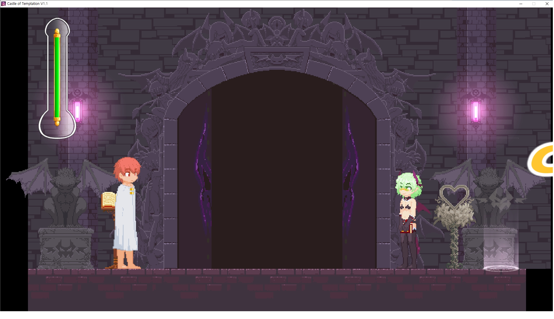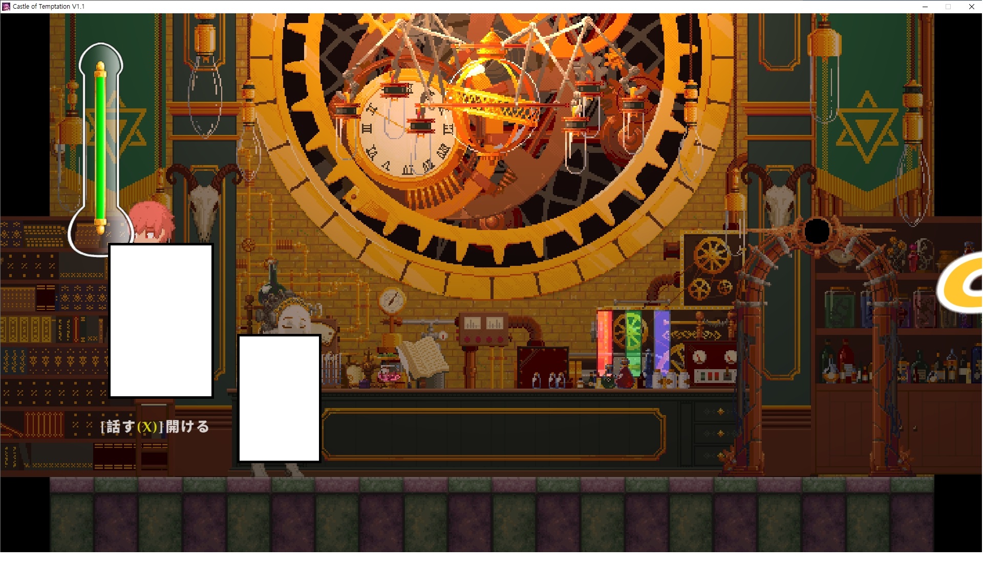 다시 처음부터여기 미믹방에서 위로 올라갑시다왼쪽에 비밀길이 있습니다죽가면 열쇠를 얻고갑자기 어두워지는데오른쪽으로 죽 달려서 도망치면 됩니다클리어하면 이렇게 열쇠가 나옵니다인형의 방은 여기 아래 상자를 치우면 길이 하나 더 있는데왼쪽 복도에서 인형이 튀어나오는길을 피해 뒤로 가면 됩니다상자를 밝고 넘어가야하나 싶긴한데 전 손에 맞아서 무적시간때 지나가졌습니다여기서 기어를 얻으면여기로 돌아오게 되고 열쇠를 얻을 수 있습니다다음은 이곳여기 점프해서 올라가면 뭔갈 조사할 수 있는데조사하면 워프가 켜집니다여기 빛에서 계속 조사하면 책상을 던질 수 있는데 그냥 던지면 죽고야스 한판 조지게 만들어 저기 앉게 만들고그 뒤에 던져주면 됩니다잘가고전지를 얻을 수 있고이걸 끼워주면열쇠로 가는 길이 열립니다여기도 온김에 3번 다 같은 곳으로 가봤습니다최종에리어는 매우 어렵다는데보스급 적이 나와서 대적합니다다만 몸이 철로 되어 있어서 자석을 켜주면 아무것도 못합니다그냥 평범히 걸어서 기계만 켜주면 깰 정도로 쉽더군요같은 곳을 3번 깨야만 도달하는 장소도 있네요뭐 별건 없었습니다여기도 최대한 날먹을 해보려고 했는데꽤 어렵더군요너무 일찍가면 닿아버려서 죽습니다계속 하다보니 되긴하더군요 날먹하는 단계가 장난이 아니기 때문에 낫긴합니다일단 되돌아가서죽 뒤로가서여기서 벽이 하나 튀어나오는데 이 뒤에 있습니다먹어둔 뒤다시 여기로이번엔 함정이 있는걸 아니까 뛰어서 넘어가줍시다무사히 탈출했습니다다시 그곳으로위서를 써서 지나갈 수 있습니다세이브장소가 있고여긴 피지컬로 넘어가야합니다살짝만 닿아도 바로 죽으니 어렵더군요어캐어캐 통과했습니다여기서 다시 정화해주고지나가면보스를 만날 수 있습니다저 랜턴이 다 꺼질때까지 버티면 됩니다공같은걸 피하면 되는데 옷을 총 4번 주니 4목숨입니다피지컬을 믿어요마지막의 발악패턴도 있습니다클리어 하면 열쇠를 쓸 수 있습니다이분은 츤츤 거리면서 같이 잘 있어주네요이쯤이면 한판 해주겠지?안해줍니다참고로 저거고르면 첨부터 해야됩니다....로드해서 올라가면?어우죽죽 위로 갑시다크게 어렵진 않더군요더 위로가면박쥐가 나와서 도와줍니다뭔가 멀쩡해졌네요이런저런 이야기가 있는데뭔 말인진 모르겠습니다대충 여기 성주가 성모의 유체를 가지고 뭔갈 했나봅니다그리고 영웅의 피로 클론을 만들어서 그 힘을 흡수하려고 한거 같네요이젤이 데몬족이고 데몬족이 평화가 싫어서 반란을 일으켰나봅니다해서 사실 지명수배당하고 있었네요이분이 조사하러 왔었나 봅니다저희가 성모랑 노는사이 튀었나봅니다반쯤 시설자첸 구라였나보네요그리고 원래 성주는 이분이였습니다하나하나 물어보고이분의 이름은 아이시스인가보네요 즐긴뒤에잘 도망가면 됩니다프리모드가 열립니다기억실이라던가 있고엔딩 그림을 구경도 할 수 있습니다친절히 수집품 위치도 적혀있고 얻기만 하면 탈출해도 획득한걸로 쳐준답니다