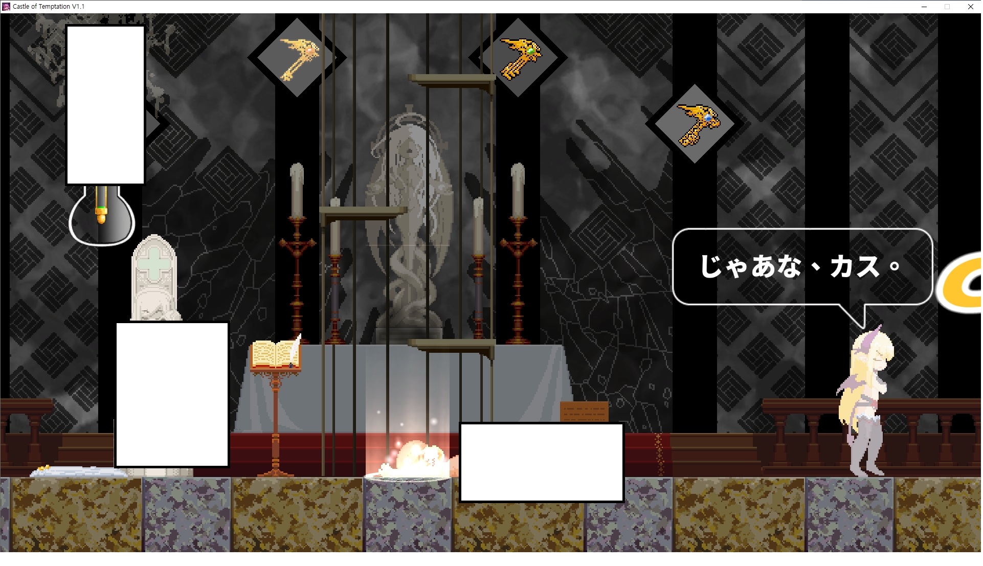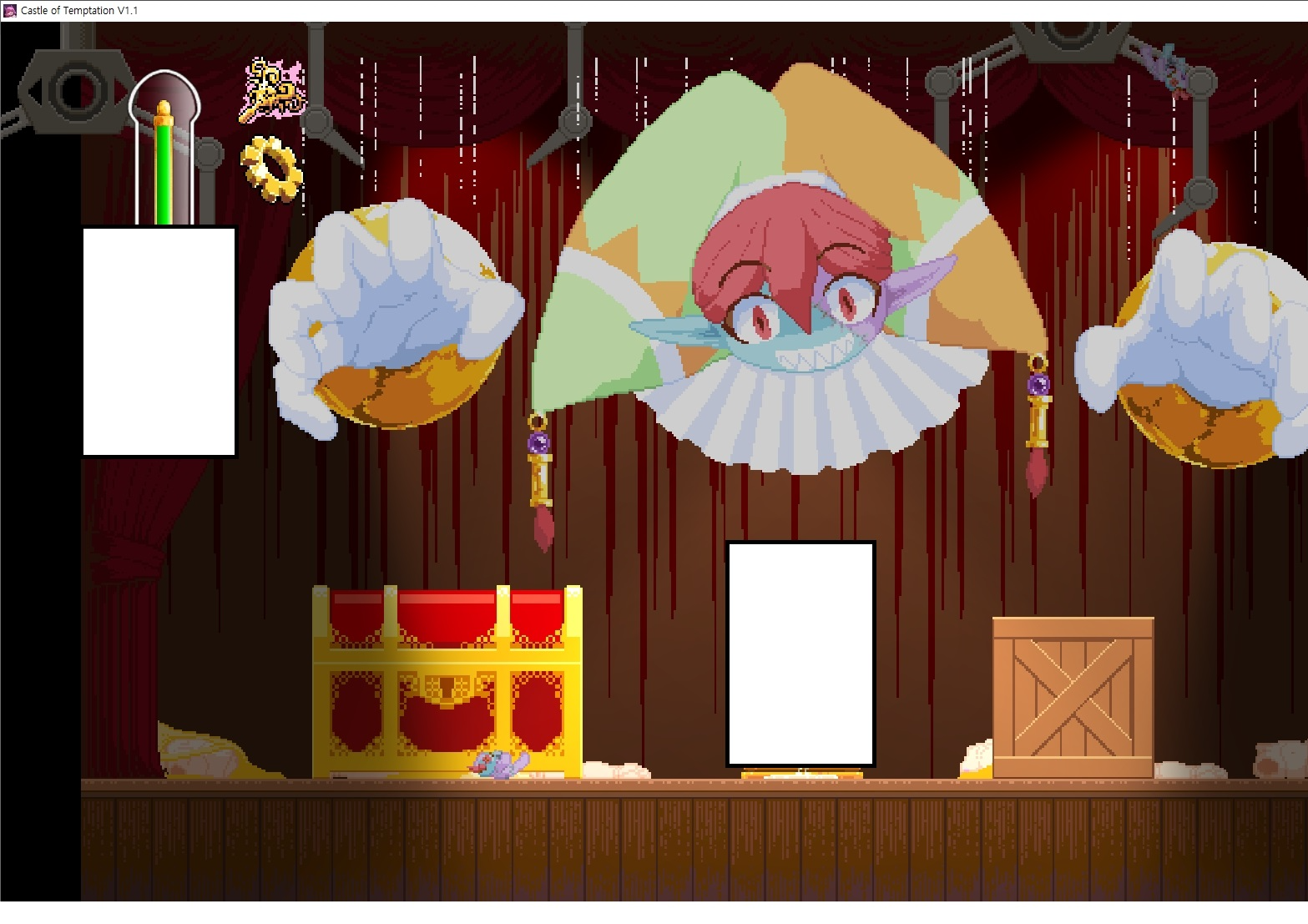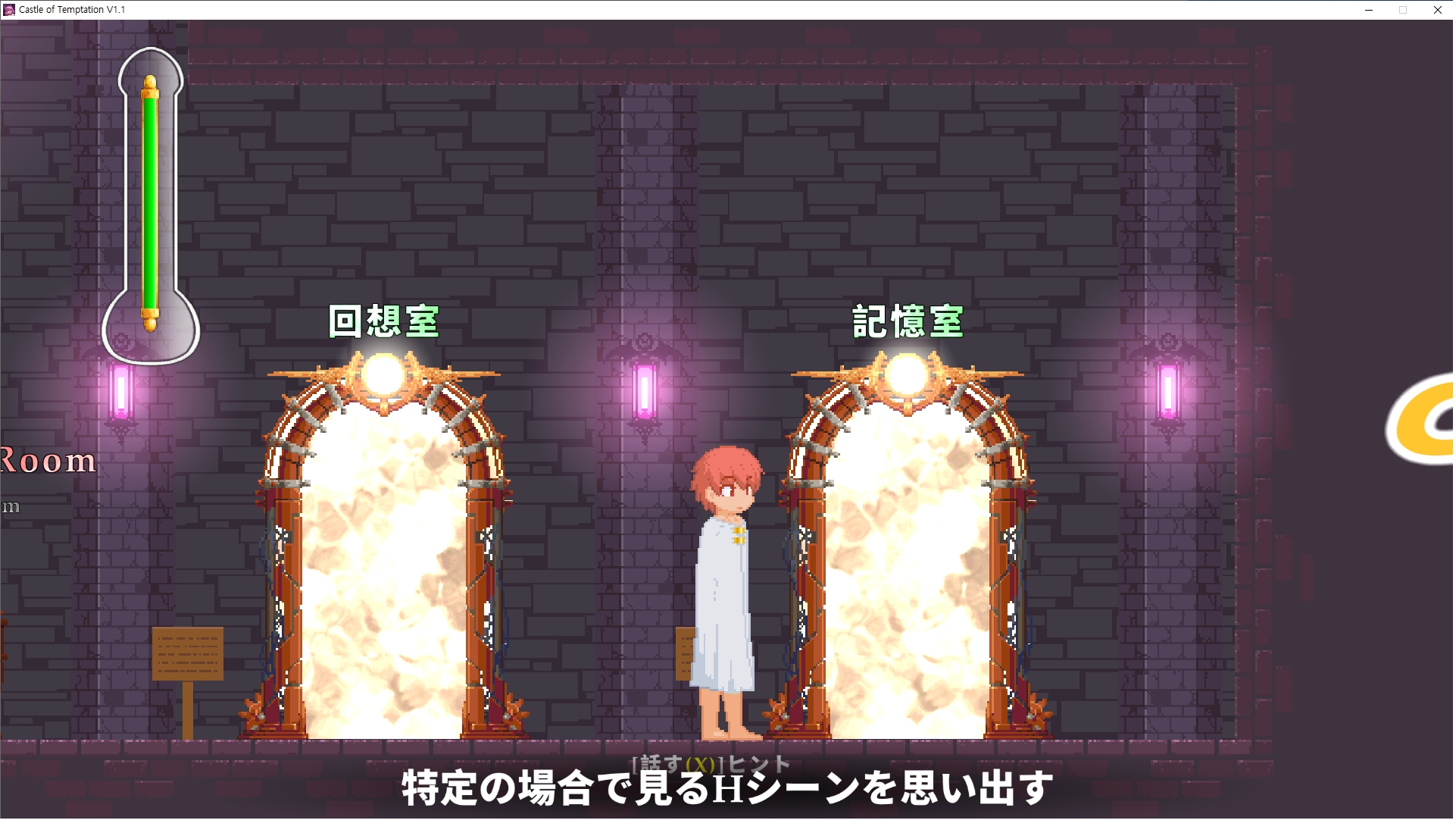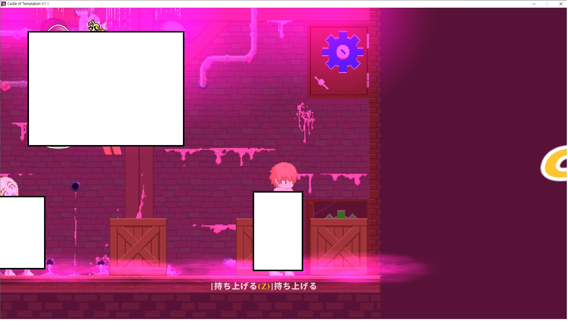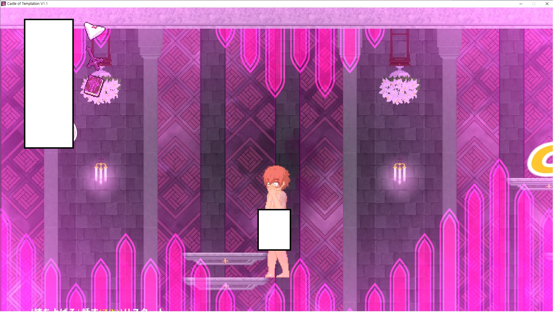 다시 처음부터여기 미믹방에서 위로 올라갑시다왼쪽에 비밀길이 있습니다죽가면 열쇠를 얻고갑자기 어두워지는데오른쪽으로 죽 달려서 도망치면 됩니다클리어하면 이렇게 열쇠가 나옵니다인형의 방은 여기 아래 상자를 치우면 길이 하나 더 있는데왼쪽 복도에서 인형이 튀어나오는길을 피해 뒤로 가면 됩니다상자를 밝고 넘어가야하나 싶긴한데 전 손에 맞아서 무적시간때 지나가졌습니다여기서 기어를 얻으면여기로 돌아오게 되고 열쇠를 얻을 수 있습니다다음은 이곳여기 점프해서 올라가면 뭔갈 조사할 수 있는데조사하면 워프가 켜집니다여기 빛에서 계속 조사하면 책상을 던질 수 있는데 그냥 던지면 죽고야스 한판 조지게 만들어 저기 앉게 만들고그 뒤에 던져주면 됩니다잘가고전지를 얻을 수 있고이걸 끼워주면열쇠로 가는 길이 열립니다여기도 온김에 3번 다 같은 곳으로 가봤습니다최종에리어는 매우 어렵다는데보스급 적이 나와서 대적합니다다만 몸이 철로 되어 있어서 자석을 켜주면 아무것도 못합니다그냥 평범히 걸어서 기계만 켜주면 깰 정도로 쉽더군요같은 곳을 3번 깨야만 도달하는 장소도 있네요뭐 별건 없었습니다여기도 최대한 날먹을 해보려고 했는데꽤 어렵더군요너무 일찍가면 닿아버려서 죽습니다계속 하다보니 되긴하더군요 날먹하는 단계가 장난이 아니기 때문에 낫긴합니다일단 되돌아가서죽 뒤로가서여기서 벽이 하나 튀어나오는데 이 뒤에 있습니다먹어둔 뒤다시 여기로이번엔 함정이 있는걸 아니까 뛰어서 넘어가줍시다무사히 탈출했습니다다시 그곳으로위서를 써서 지나갈 수 있습니다세이브장소가 있고여긴 피지컬로 넘어가야합니다살짝만 닿아도 바로 죽으니 어렵더군요어캐어캐 통과했습니다여기서 다시 정화해주고지나가면보스를 만날 수 있습니다저 랜턴이 다 꺼질때까지 버티면 됩니다공같은걸 피하면 되는데 옷을 총 4번 주니 4목숨입니다피지컬을 믿어요마지막의 발악패턴도 있습니다클리어 하면 열쇠를 쓸 수 있습니다이분은 츤츤 거리면서 같이 잘 있어주네요이쯤이면 한판 해주겠지?안해줍니다참고로 저거고르면 첨부터 해야됩니다....로드해서 올라가면?어우죽죽 위로 갑시다크게 어렵진 않더군요더 위로가면박쥐가 나와서 도와줍니다뭔가 멀쩡해졌네요이런저런 이야기가 있는데뭔 말인진 모르겠습니다대충 여기 성주가 성모의 유체를 가지고 뭔갈 했나봅니다그리고 영웅의 피로 클론을 만들어서 그 힘을 흡수하려고 한거 같네요이젤이 데몬족이고 데몬족이 평화가 싫어서 반란을 일으켰나봅니다해서 사실 지명수배당하고 있었네요이분이 조사하러 왔었나 봅니다저희가 성모랑 노는사이 튀었나봅니다반쯤 시설자첸 구라였나보네요그리고 원래 성주는 이분이였습니다하나하나 물어보고이분의 이름은 아이시스인가보네요 즐긴뒤에잘 도망가면 됩니다프리모드가 열립니다기억실이라던가 있고엔딩 그림을 구경도 할 수 있습니다친절히 수집품 위치도 적혀있고 얻기만 하면 탈출해도 획득한걸로 쳐준답니다