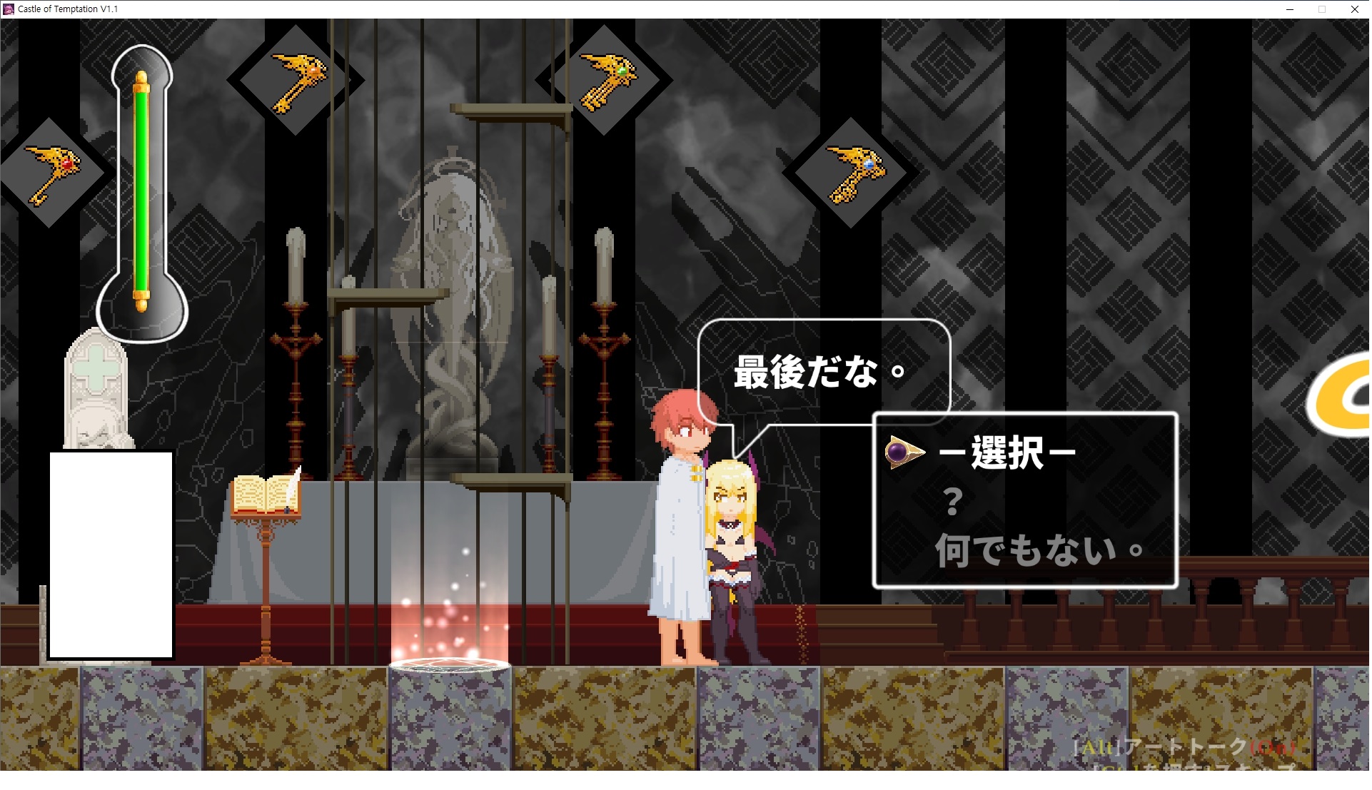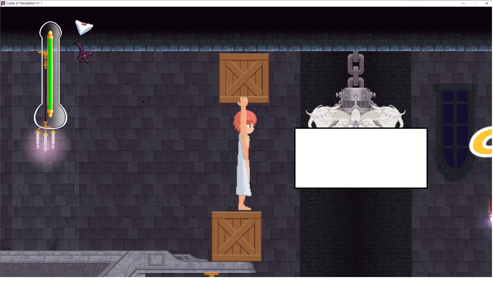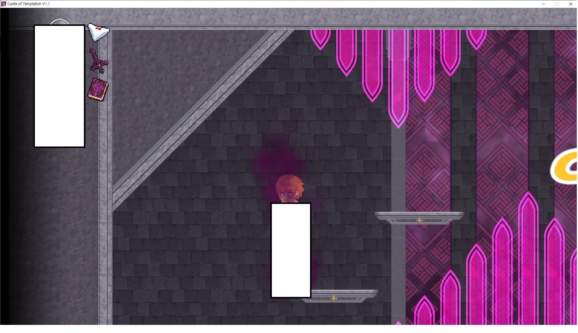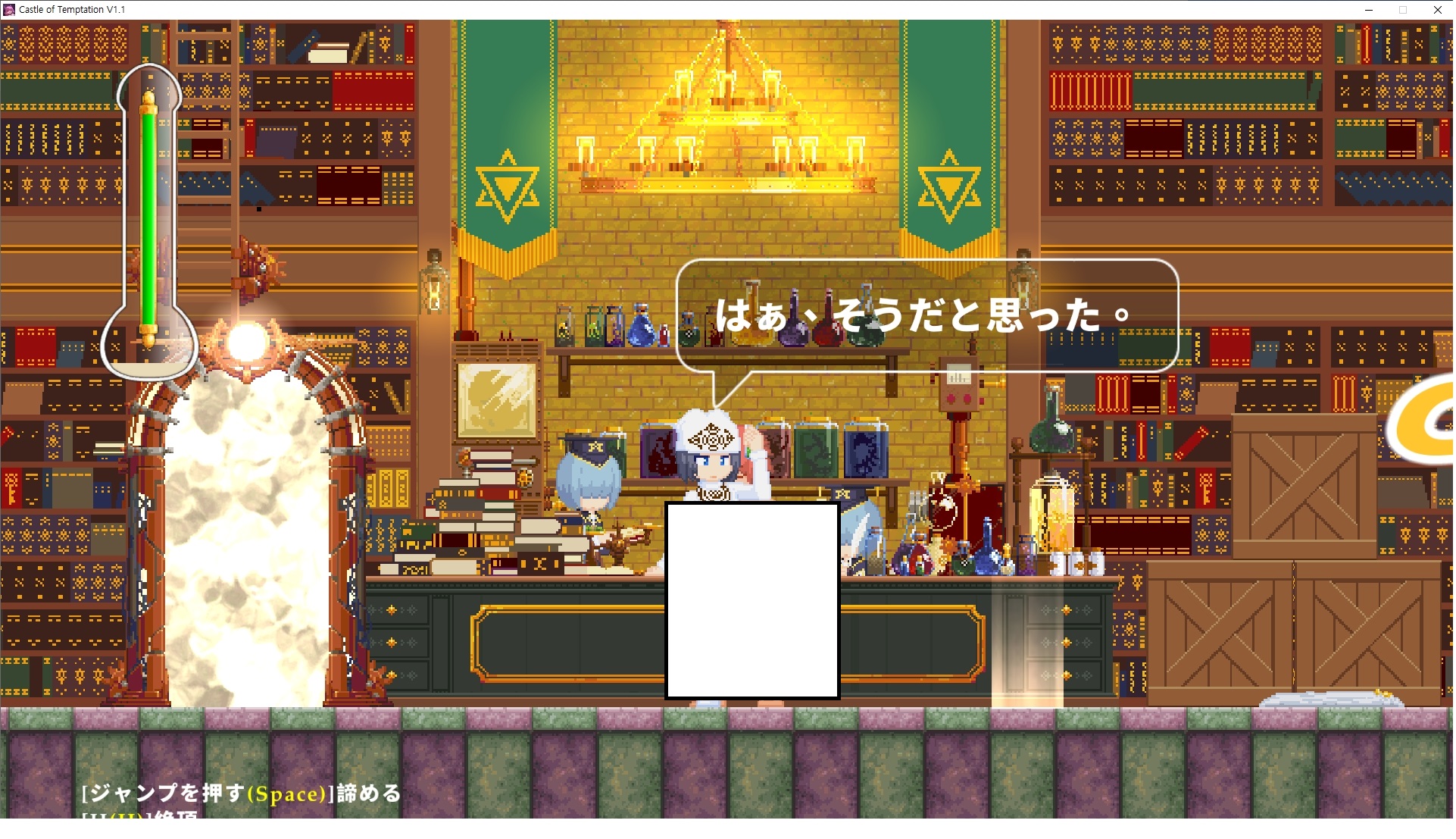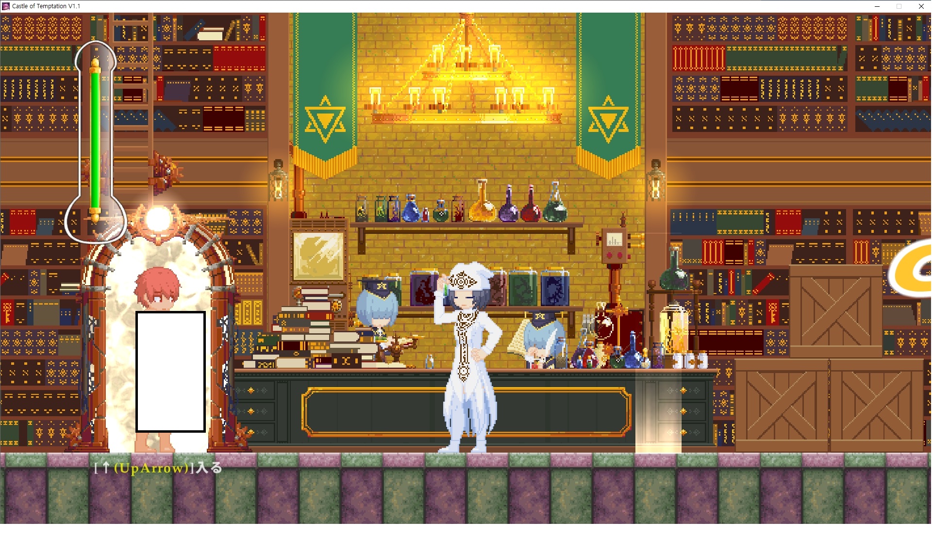 다시 처음부터여기 미믹방에서 위로 올라갑시다왼쪽에 비밀길이 있습니다죽가면 열쇠를 얻고갑자기 어두워지는데오른쪽으로 죽 달려서 도망치면 됩니다클리어하면 이렇게 열쇠가 나옵니다인형의 방은 여기 아래 상자를 치우면 길이 하나 더 있는데왼쪽 복도에서 인형이 튀어나오는길을 피해 뒤로 가면 됩니다상자를 밝고 넘어가야하나 싶긴한데 전 손에 맞아서 무적시간때 지나가졌습니다여기서 기어를 얻으면여기로 돌아오게 되고 열쇠를 얻을 수 있습니다다음은 이곳여기 점프해서 올라가면 뭔갈 조사할 수 있는데조사하면 워프가 켜집니다여기 빛에서 계속 조사하면 책상을 던질 수 있는데 그냥 던지면 죽고야스 한판 조지게 만들어 저기 앉게 만들고그 뒤에 던져주면 됩니다잘가고전지를 얻을 수 있고이걸 끼워주면열쇠로 가는 길이 열립니다여기도 온김에 3번 다 같은 곳으로 가봤습니다최종에리어는 매우 어렵다는데보스급 적이 나와서 대적합니다다만 몸이 철로 되어 있어서 자석을 켜주면 아무것도 못합니다그냥 평범히 걸어서 기계만 켜주면 깰 정도로 쉽더군요같은 곳을 3번 깨야만 도달하는 장소도 있네요뭐 별건 없었습니다여기도 최대한 날먹을 해보려고 했는데꽤 어렵더군요너무 일찍가면 닿아버려서 죽습니다계속 하다보니 되긴하더군요 날먹하는 단계가 장난이 아니기 때문에 낫긴합니다일단 되돌아가서죽 뒤로가서여기서 벽이 하나 튀어나오는데 이 뒤에 있습니다먹어둔 뒤다시 여기로이번엔 함정이 있는걸 아니까 뛰어서 넘어가줍시다무사히 탈출했습니다다시 그곳으로위서를 써서 지나갈 수 있습니다세이브장소가 있고여긴 피지컬로 넘어가야합니다살짝만 닿아도 바로 죽으니 어렵더군요어캐어캐 통과했습니다여기서 다시 정화해주고지나가면보스를 만날 수 있습니다저 랜턴이 다 꺼질때까지 버티면 됩니다공같은걸 피하면 되는데 옷을 총 4번 주니 4목숨입니다피지컬을 믿어요마지막의 발악패턴도 있습니다클리어 하면 열쇠를 쓸 수 있습니다이분은 츤츤 거리면서 같이 잘 있어주네요이쯤이면 한판 해주겠지?안해줍니다참고로 저거고르면 첨부터 해야됩니다....로드해서 올라가면?어우죽죽 위로 갑시다크게 어렵진 않더군요더 위로가면박쥐가 나와서 도와줍니다뭔가 멀쩡해졌네요이런저런 이야기가 있는데뭔 말인진 모르겠습니다대충 여기 성주가 성모의 유체를 가지고 뭔갈 했나봅니다그리고 영웅의 피로 클론을 만들어서 그 힘을 흡수하려고 한거 같네요이젤이 데몬족이고 데몬족이 평화가 싫어서 반란을 일으켰나봅니다해서 사실 지명수배당하고 있었네요이분이 조사하러 왔었나 봅니다저희가 성모랑 노는사이 튀었나봅니다반쯤 시설자첸 구라였나보네요그리고 원래 성주는 이분이였습니다하나하나 물어보고이분의 이름은 아이시스인가보네요 즐긴뒤에잘 도망가면 됩니다프리모드가 열립니다기억실이라던가 있고엔딩 그림을 구경도 할 수 있습니다친절히 수집품 위치도 적혀있고 얻기만 하면 탈출해도 획득한걸로 쳐준답니다
