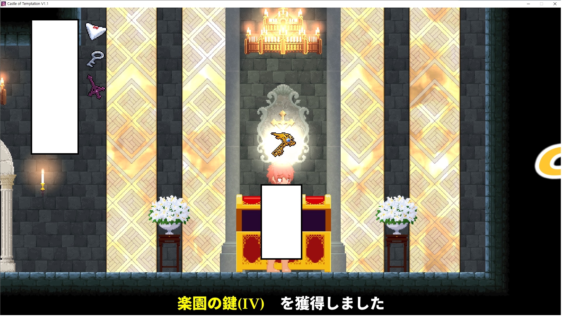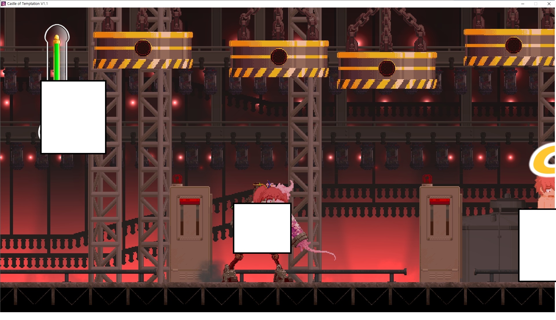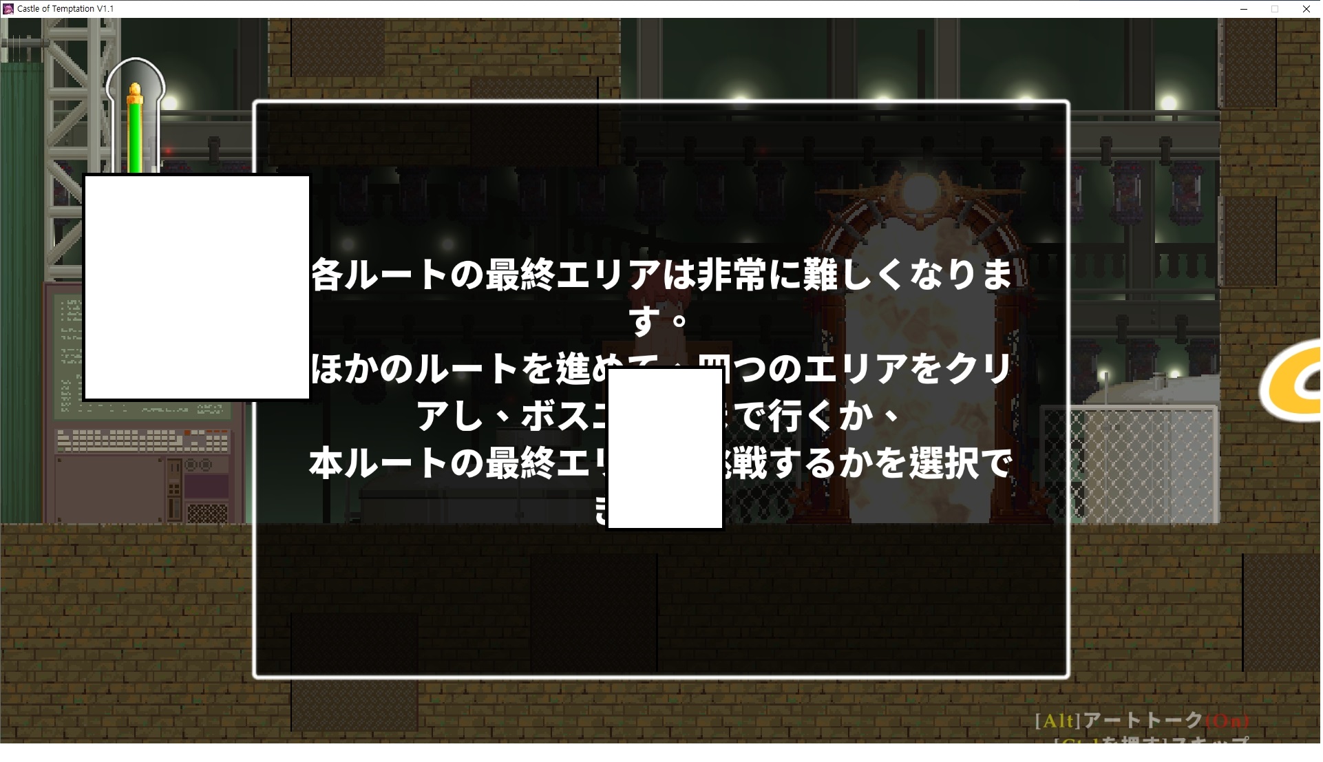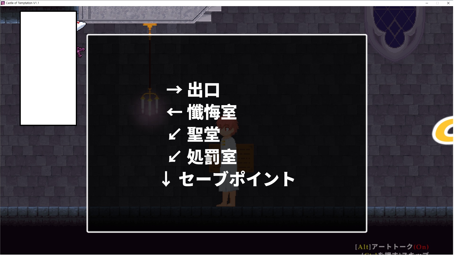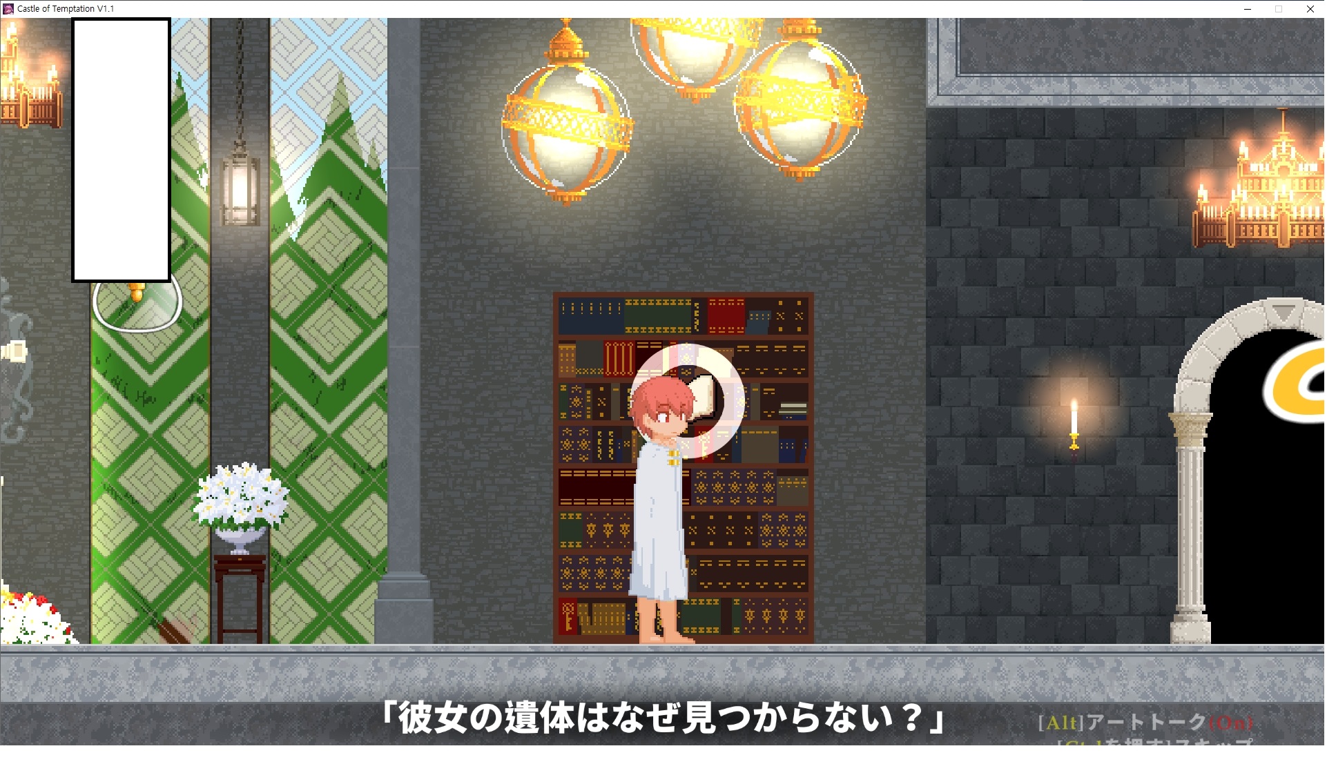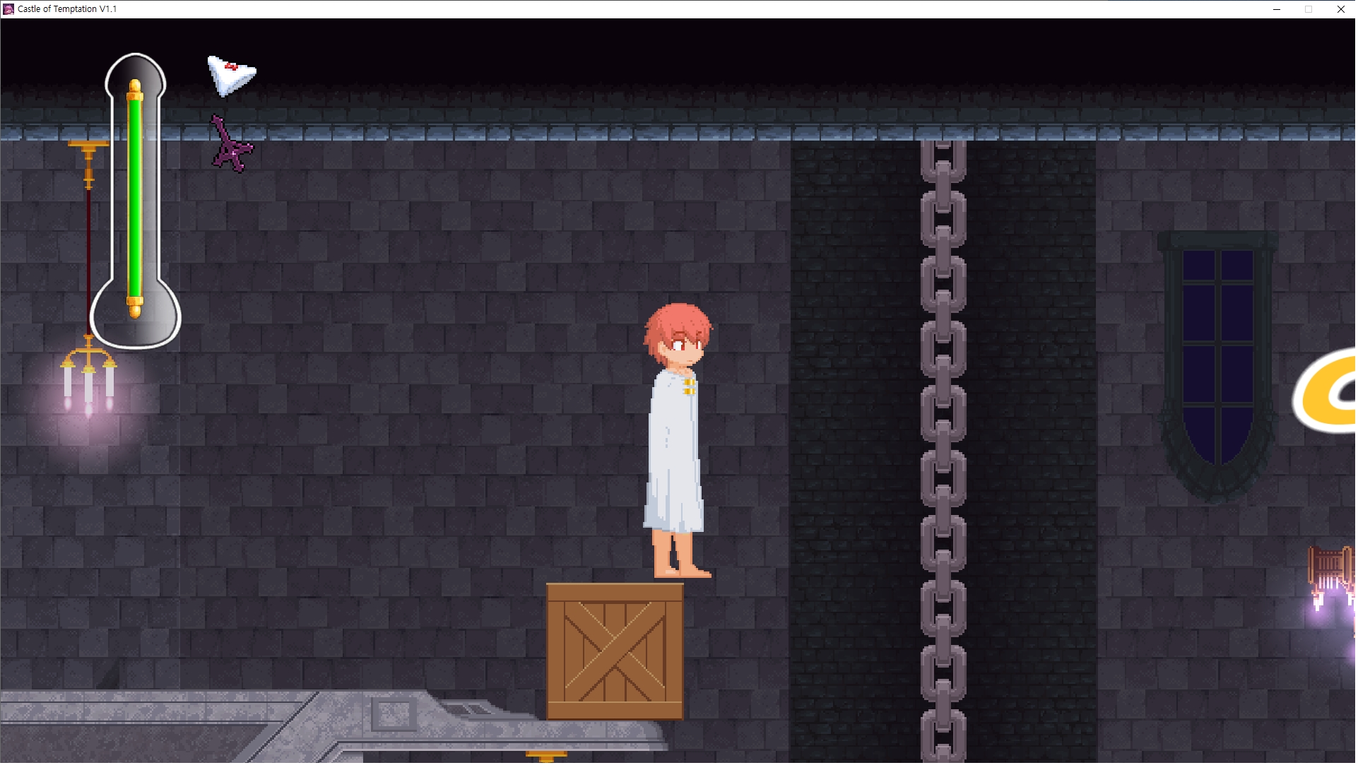 다시 처음부터여기 미믹방에서 위로 올라갑시다왼쪽에 비밀길이 있습니다죽가면 열쇠를 얻고갑자기 어두워지는데오른쪽으로 죽 달려서 도망치면 됩니다클리어하면 이렇게 열쇠가 나옵니다인형의 방은 여기 아래 상자를 치우면 길이 하나 더 있는데왼쪽 복도에서 인형이 튀어나오는길을 피해 뒤로 가면 됩니다상자를 밝고 넘어가야하나 싶긴한데 전 손에 맞아서 무적시간때 지나가졌습니다여기서 기어를 얻으면여기로 돌아오게 되고 열쇠를 얻을 수 있습니다다음은 이곳여기 점프해서 올라가면 뭔갈 조사할 수 있는데조사하면 워프가 켜집니다여기 빛에서 계속 조사하면 책상을 던질 수 있는데 그냥 던지면 죽고야스 한판 조지게 만들어 저기 앉게 만들고그 뒤에 던져주면 됩니다잘가고전지를 얻을 수 있고이걸 끼워주면열쇠로 가는 길이 열립니다여기도 온김에 3번 다 같은 곳으로 가봤습니다최종에리어는 매우 어렵다는데보스급 적이 나와서 대적합니다다만 몸이 철로 되어 있어서 자석을 켜주면 아무것도 못합니다그냥 평범히 걸어서 기계만 켜주면 깰 정도로 쉽더군요같은 곳을 3번 깨야만 도달하는 장소도 있네요뭐 별건 없었습니다여기도 최대한 날먹을 해보려고 했는데꽤 어렵더군요너무 일찍가면 닿아버려서 죽습니다계속 하다보니 되긴하더군요 날먹하는 단계가 장난이 아니기 때문에 낫긴합니다일단 되돌아가서죽 뒤로가서여기서 벽이 하나 튀어나오는데 이 뒤에 있습니다먹어둔 뒤다시 여기로이번엔 함정이 있는걸 아니까 뛰어서 넘어가줍시다무사히 탈출했습니다다시 그곳으로위서를 써서 지나갈 수 있습니다세이브장소가 있고여긴 피지컬로 넘어가야합니다살짝만 닿아도 바로 죽으니 어렵더군요어캐어캐 통과했습니다여기서 다시 정화해주고지나가면보스를 만날 수 있습니다저 랜턴이 다 꺼질때까지 버티면 됩니다공같은걸 피하면 되는데 옷을 총 4번 주니 4목숨입니다피지컬을 믿어요마지막의 발악패턴도 있습니다클리어 하면 열쇠를 쓸 수 있습니다이분은 츤츤 거리면서 같이 잘 있어주네요이쯤이면 한판 해주겠지?안해줍니다참고로 저거고르면 첨부터 해야됩니다....로드해서 올라가면?어우죽죽 위로 갑시다크게 어렵진 않더군요더 위로가면박쥐가 나와서 도와줍니다뭔가 멀쩡해졌네요이런저런 이야기가 있는데뭔 말인진 모르겠습니다대충 여기 성주가 성모의 유체를 가지고 뭔갈 했나봅니다그리고 영웅의 피로 클론을 만들어서 그 힘을 흡수하려고 한거 같네요이젤이 데몬족이고 데몬족이 평화가 싫어서 반란을 일으켰나봅니다해서 사실 지명수배당하고 있었네요이분이 조사하러 왔었나 봅니다저희가 성모랑 노는사이 튀었나봅니다반쯤 시설자첸 구라였나보네요그리고 원래 성주는 이분이였습니다하나하나 물어보고이분의 이름은 아이시스인가보네요 즐긴뒤에잘 도망가면 됩니다프리모드가 열립니다기억실이라던가 있고엔딩 그림을 구경도 할 수 있습니다친절히 수집품 위치도 적혀있고 얻기만 하면 탈출해도 획득한걸로 쳐준답니다