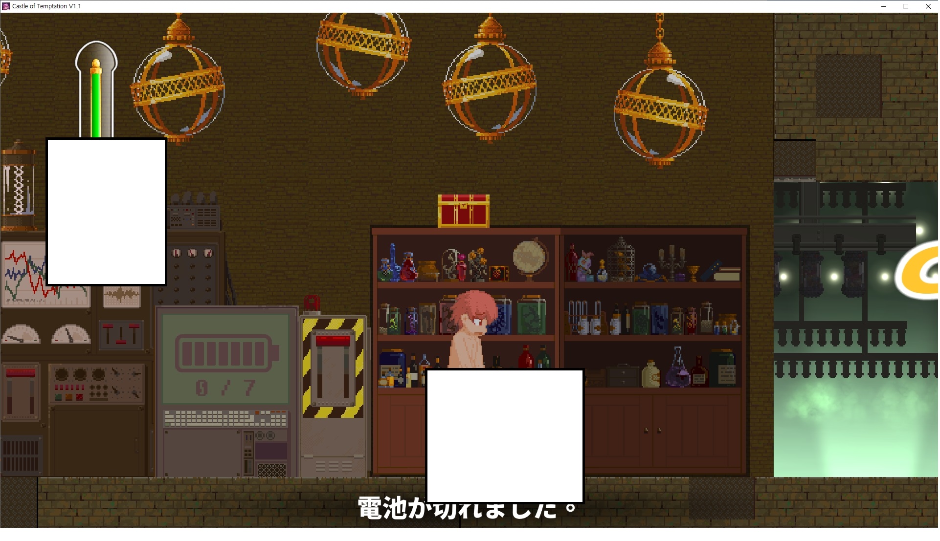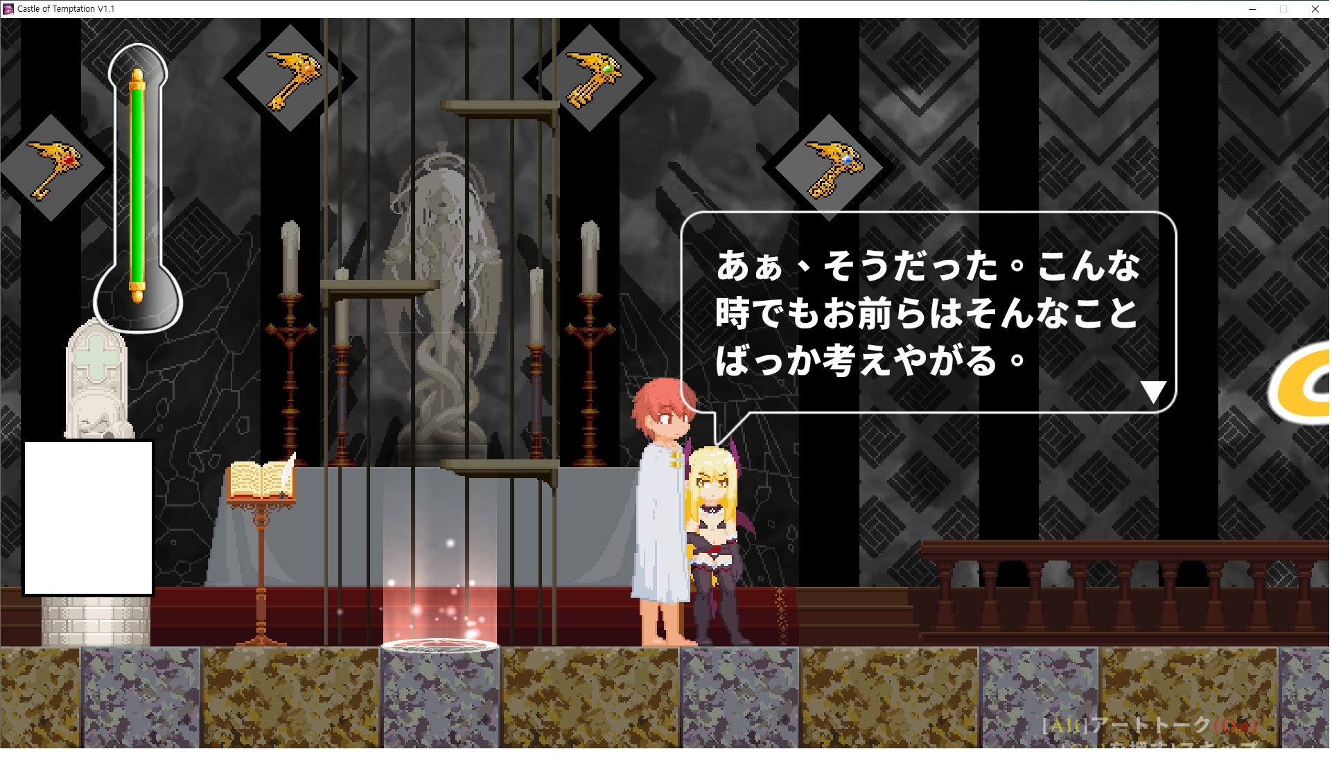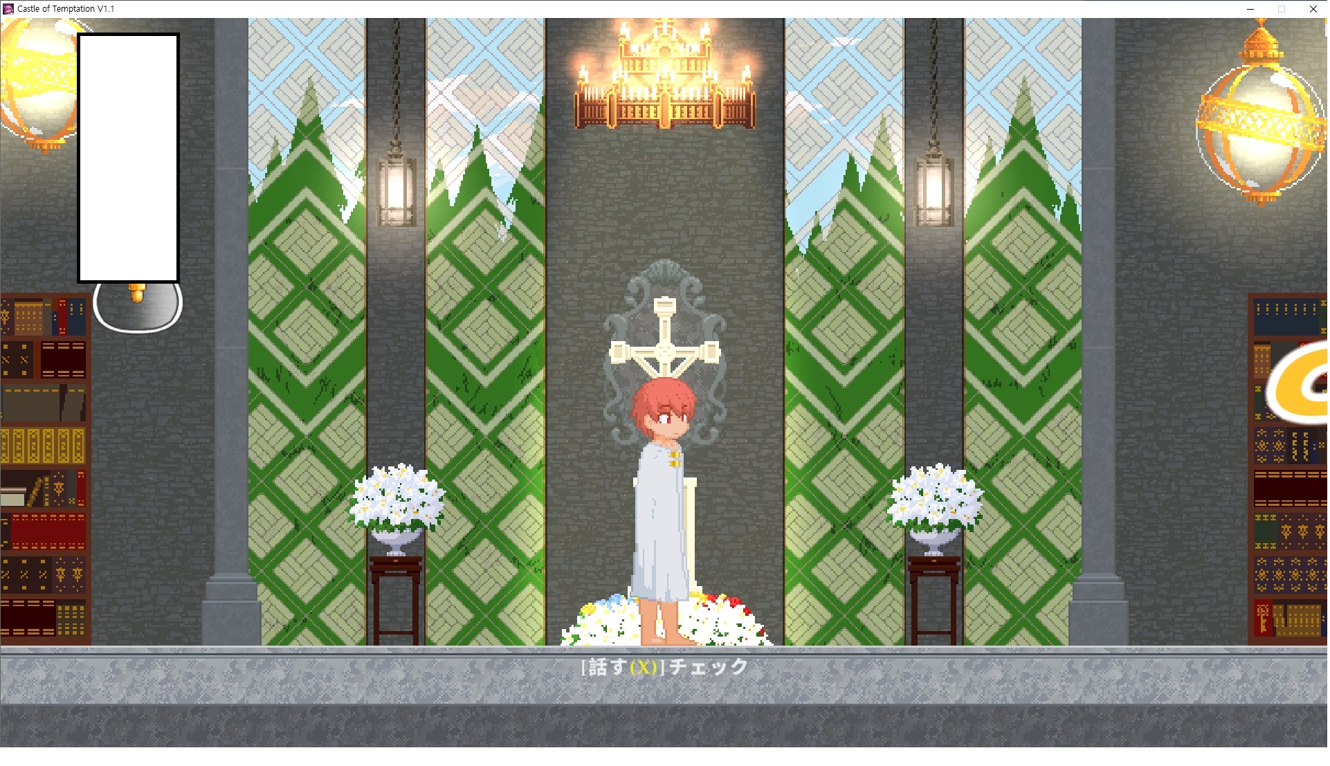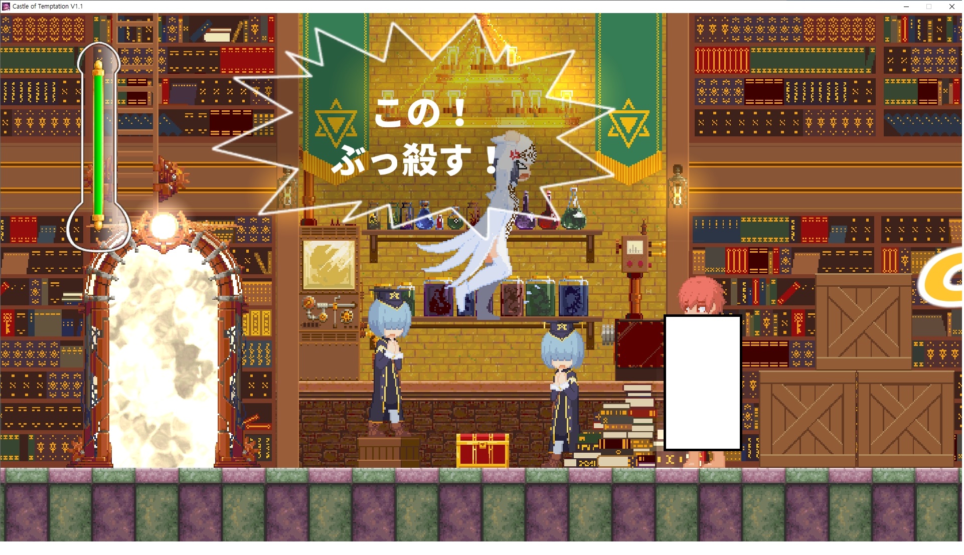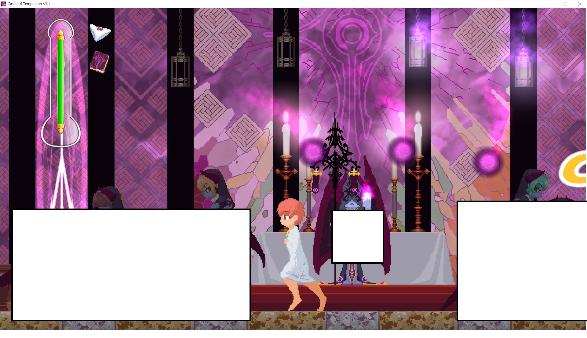 다시 처음부터여기 미믹방에서 위로 올라갑시다왼쪽에 비밀길이 있습니다죽가면 열쇠를 얻고갑자기 어두워지는데오른쪽으로 죽 달려서 도망치면 됩니다클리어하면 이렇게 열쇠가 나옵니다인형의 방은 여기 아래 상자를 치우면 길이 하나 더 있는데왼쪽 복도에서 인형이 튀어나오는길을 피해 뒤로 가면 됩니다상자를 밝고 넘어가야하나 싶긴한데 전 손에 맞아서 무적시간때 지나가졌습니다여기서 기어를 얻으면여기로 돌아오게 되고 열쇠를 얻을 수 있습니다다음은 이곳여기 점프해서 올라가면 뭔갈 조사할 수 있는데조사하면 워프가 켜집니다여기 빛에서 계속 조사하면 책상을 던질 수 있는데 그냥 던지면 죽고야스 한판 조지게 만들어 저기 앉게 만들고그 뒤에 던져주면 됩니다잘가고전지를 얻을 수 있고이걸 끼워주면열쇠로 가는 길이 열립니다여기도 온김에 3번 다 같은 곳으로 가봤습니다최종에리어는 매우 어렵다는데보스급 적이 나와서 대적합니다다만 몸이 철로 되어 있어서 자석을 켜주면 아무것도 못합니다그냥 평범히 걸어서 기계만 켜주면 깰 정도로 쉽더군요같은 곳을 3번 깨야만 도달하는 장소도 있네요뭐 별건 없었습니다여기도 최대한 날먹을 해보려고 했는데꽤 어렵더군요너무 일찍가면 닿아버려서 죽습니다계속 하다보니 되긴하더군요 날먹하는 단계가 장난이 아니기 때문에 낫긴합니다일단 되돌아가서죽 뒤로가서여기서 벽이 하나 튀어나오는데 이 뒤에 있습니다먹어둔 뒤다시 여기로이번엔 함정이 있는걸 아니까 뛰어서 넘어가줍시다무사히 탈출했습니다다시 그곳으로위서를 써서 지나갈 수 있습니다세이브장소가 있고여긴 피지컬로 넘어가야합니다살짝만 닿아도 바로 죽으니 어렵더군요어캐어캐 통과했습니다여기서 다시 정화해주고지나가면보스를 만날 수 있습니다저 랜턴이 다 꺼질때까지 버티면 됩니다공같은걸 피하면 되는데 옷을 총 4번 주니 4목숨입니다피지컬을 믿어요마지막의 발악패턴도 있습니다클리어 하면 열쇠를 쓸 수 있습니다이분은 츤츤 거리면서 같이 잘 있어주네요이쯤이면 한판 해주겠지?안해줍니다참고로 저거고르면 첨부터 해야됩니다....로드해서 올라가면?어우죽죽 위로 갑시다크게 어렵진 않더군요더 위로가면박쥐가 나와서 도와줍니다뭔가 멀쩡해졌네요이런저런 이야기가 있는데뭔 말인진 모르겠습니다대충 여기 성주가 성모의 유체를 가지고 뭔갈 했나봅니다그리고 영웅의 피로 클론을 만들어서 그 힘을 흡수하려고 한거 같네요이젤이 데몬족이고 데몬족이 평화가 싫어서 반란을 일으켰나봅니다해서 사실 지명수배당하고 있었네요이분이 조사하러 왔었나 봅니다저희가 성모랑 노는사이 튀었나봅니다반쯤 시설자첸 구라였나보네요그리고 원래 성주는 이분이였습니다하나하나 물어보고이분의 이름은 아이시스인가보네요 즐긴뒤에잘 도망가면 됩니다프리모드가 열립니다기억실이라던가 있고엔딩 그림을 구경도 할 수 있습니다친절히 수집품 위치도 적혀있고 얻기만 하면 탈출해도 획득한걸로 쳐준답니다