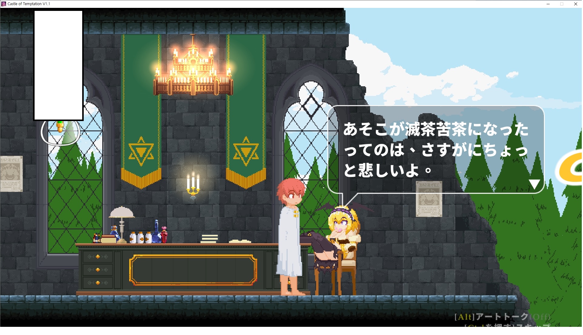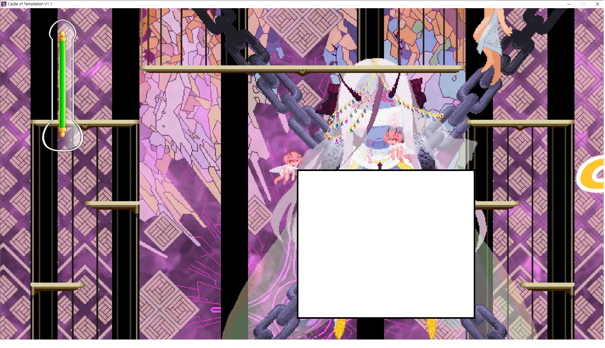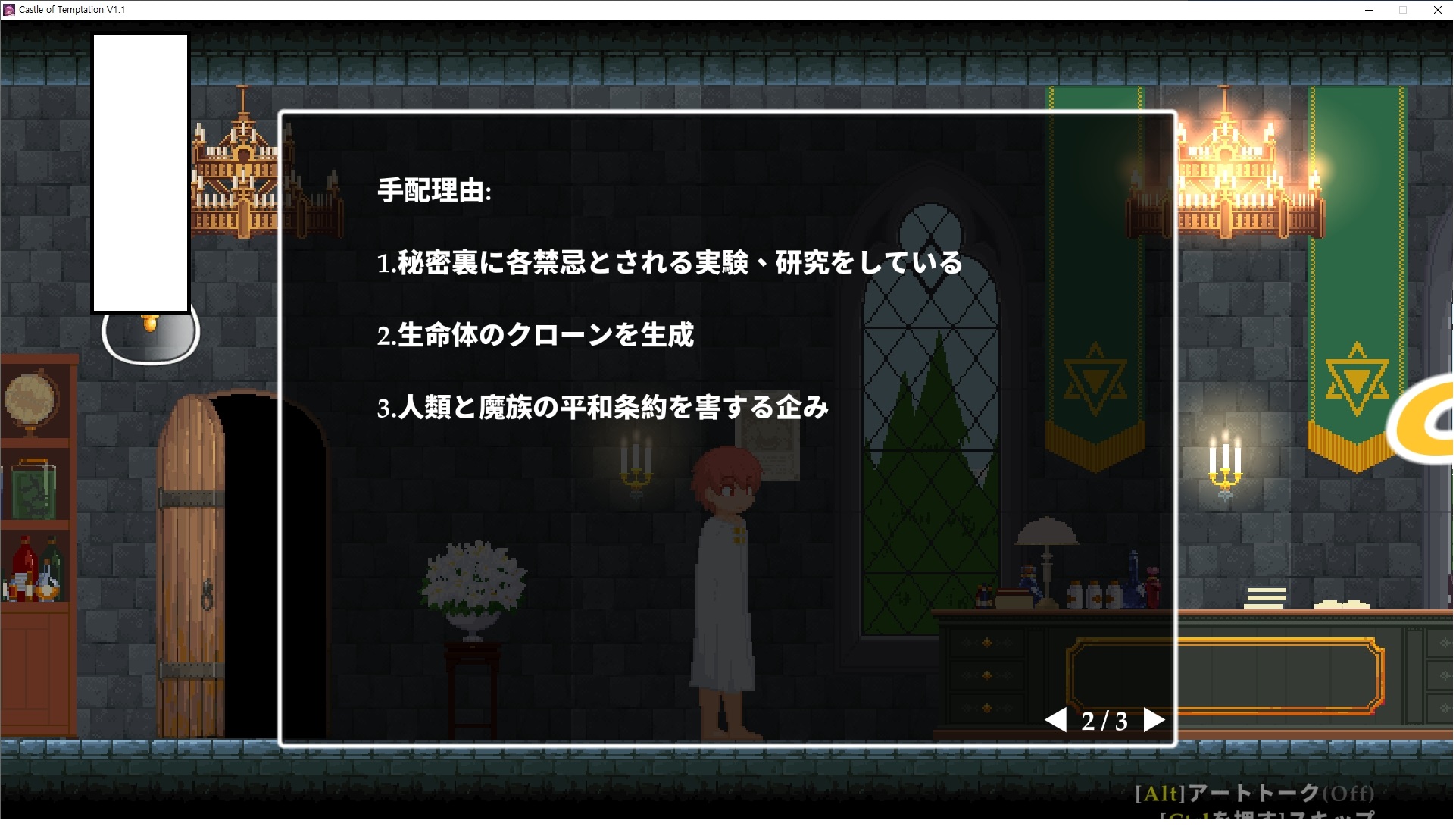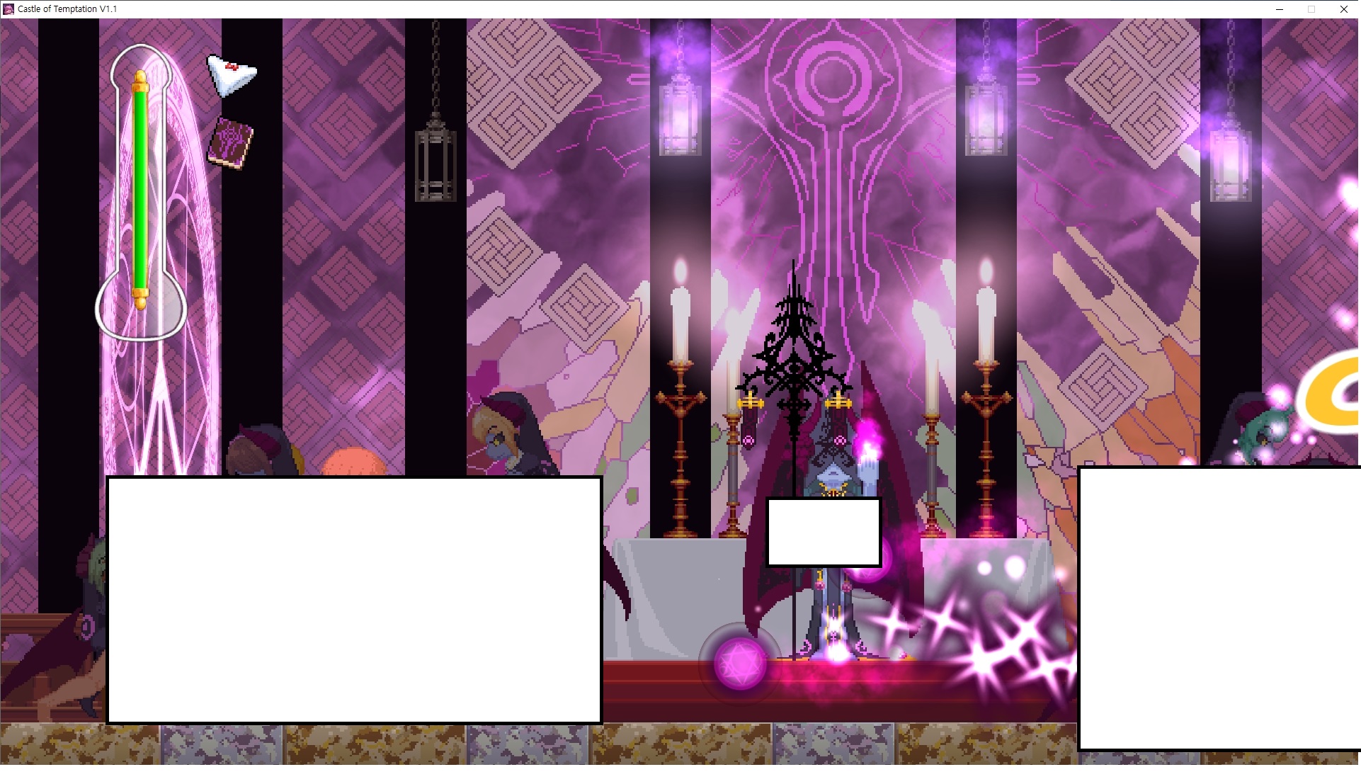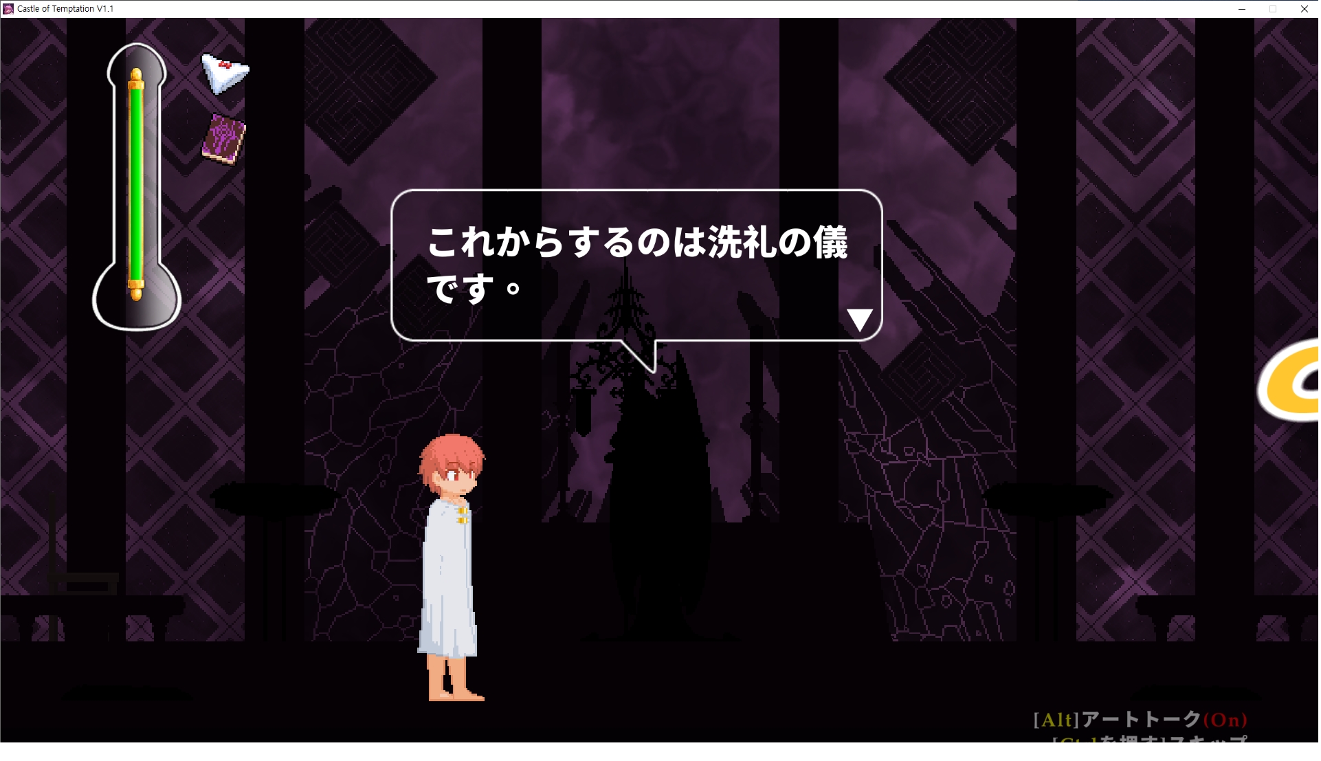 다시 처음부터여기 미믹방에서 위로 올라갑시다왼쪽에 비밀길이 있습니다죽가면 열쇠를 얻고갑자기 어두워지는데오른쪽으로 죽 달려서 도망치면 됩니다클리어하면 이렇게 열쇠가 나옵니다인형의 방은 여기 아래 상자를 치우면 길이 하나 더 있는데왼쪽 복도에서 인형이 튀어나오는길을 피해 뒤로 가면 됩니다상자를 밝고 넘어가야하나 싶긴한데 전 손에 맞아서 무적시간때 지나가졌습니다여기서 기어를 얻으면여기로 돌아오게 되고 열쇠를 얻을 수 있습니다다음은 이곳여기 점프해서 올라가면 뭔갈 조사할 수 있는데조사하면 워프가 켜집니다여기 빛에서 계속 조사하면 책상을 던질 수 있는데 그냥 던지면 죽고야스 한판 조지게 만들어 저기 앉게 만들고그 뒤에 던져주면 됩니다잘가고전지를 얻을 수 있고이걸 끼워주면열쇠로 가는 길이 열립니다여기도 온김에 3번 다 같은 곳으로 가봤습니다최종에리어는 매우 어렵다는데보스급 적이 나와서 대적합니다다만 몸이 철로 되어 있어서 자석을 켜주면 아무것도 못합니다그냥 평범히 걸어서 기계만 켜주면 깰 정도로 쉽더군요같은 곳을 3번 깨야만 도달하는 장소도 있네요뭐 별건 없었습니다여기도 최대한 날먹을 해보려고 했는데꽤 어렵더군요너무 일찍가면 닿아버려서 죽습니다계속 하다보니 되긴하더군요 날먹하는 단계가 장난이 아니기 때문에 낫긴합니다일단 되돌아가서죽 뒤로가서여기서 벽이 하나 튀어나오는데 이 뒤에 있습니다먹어둔 뒤다시 여기로이번엔 함정이 있는걸 아니까 뛰어서 넘어가줍시다무사히 탈출했습니다다시 그곳으로위서를 써서 지나갈 수 있습니다세이브장소가 있고여긴 피지컬로 넘어가야합니다살짝만 닿아도 바로 죽으니 어렵더군요어캐어캐 통과했습니다여기서 다시 정화해주고지나가면보스를 만날 수 있습니다저 랜턴이 다 꺼질때까지 버티면 됩니다공같은걸 피하면 되는데 옷을 총 4번 주니 4목숨입니다피지컬을 믿어요마지막의 발악패턴도 있습니다클리어 하면 열쇠를 쓸 수 있습니다이분은 츤츤 거리면서 같이 잘 있어주네요이쯤이면 한판 해주겠지?안해줍니다참고로 저거고르면 첨부터 해야됩니다....로드해서 올라가면?어우죽죽 위로 갑시다크게 어렵진 않더군요더 위로가면박쥐가 나와서 도와줍니다뭔가 멀쩡해졌네요이런저런 이야기가 있는데뭔 말인진 모르겠습니다대충 여기 성주가 성모의 유체를 가지고 뭔갈 했나봅니다그리고 영웅의 피로 클론을 만들어서 그 힘을 흡수하려고 한거 같네요이젤이 데몬족이고 데몬족이 평화가 싫어서 반란을 일으켰나봅니다해서 사실 지명수배당하고 있었네요이분이 조사하러 왔었나 봅니다저희가 성모랑 노는사이 튀었나봅니다반쯤 시설자첸 구라였나보네요그리고 원래 성주는 이분이였습니다하나하나 물어보고이분의 이름은 아이시스인가보네요 즐긴뒤에잘 도망가면 됩니다프리모드가 열립니다기억실이라던가 있고엔딩 그림을 구경도 할 수 있습니다친절히 수집품 위치도 적혀있고 얻기만 하면 탈출해도 획득한걸로 쳐준답니다