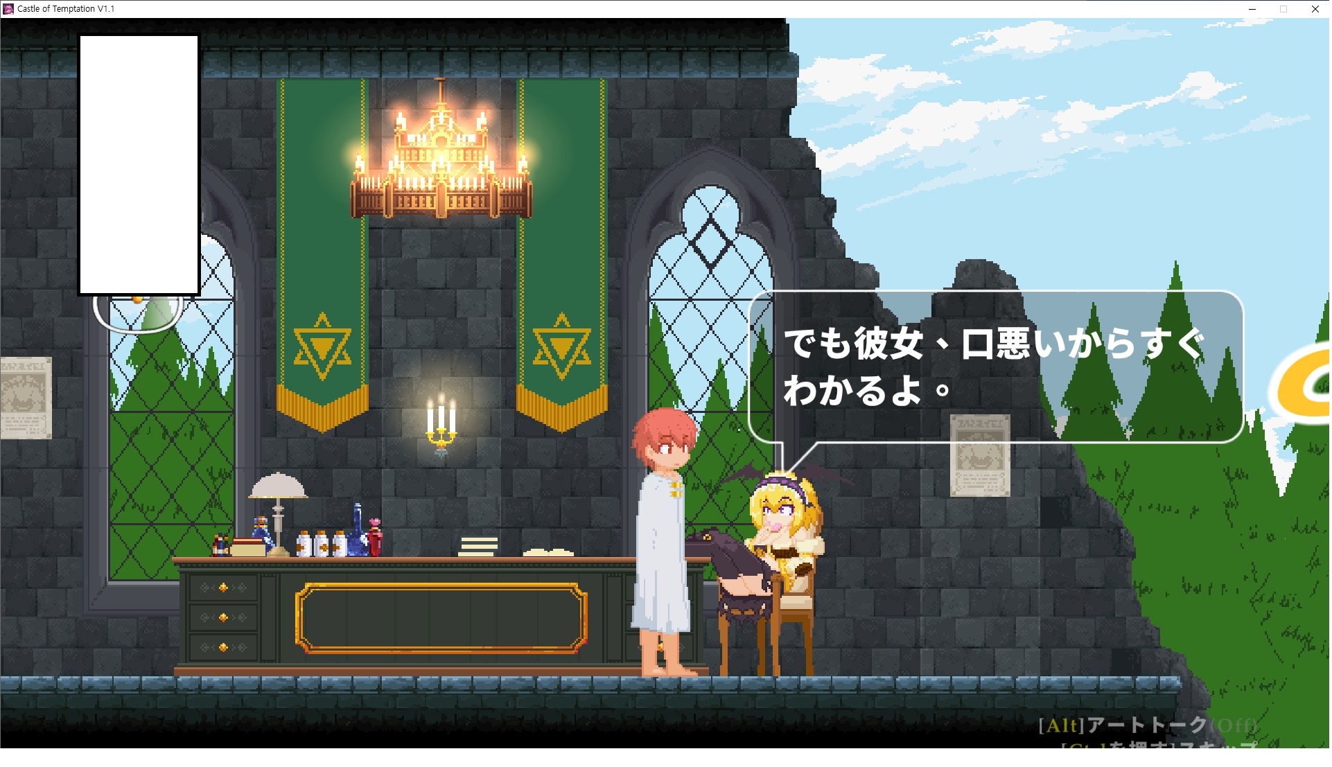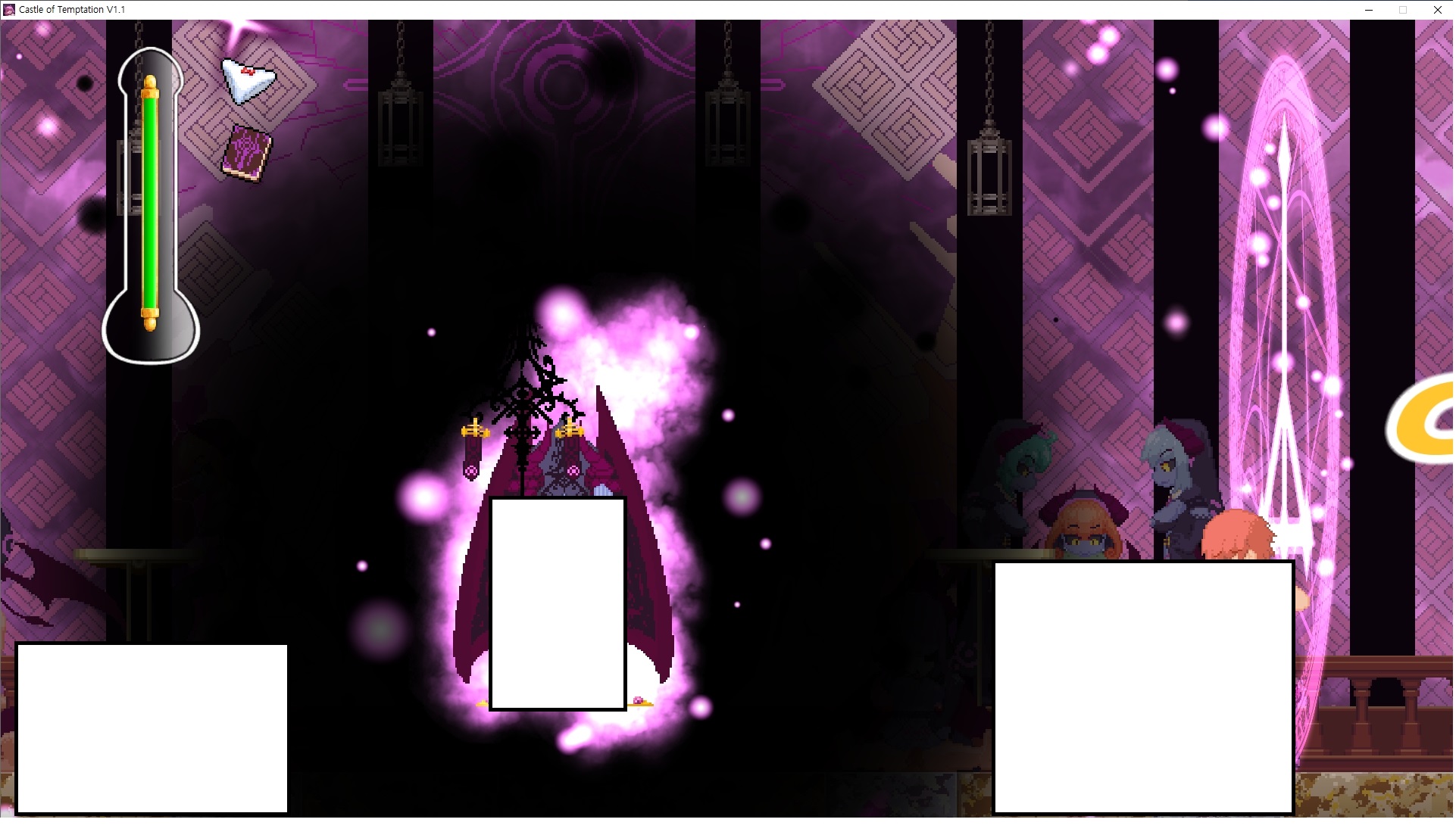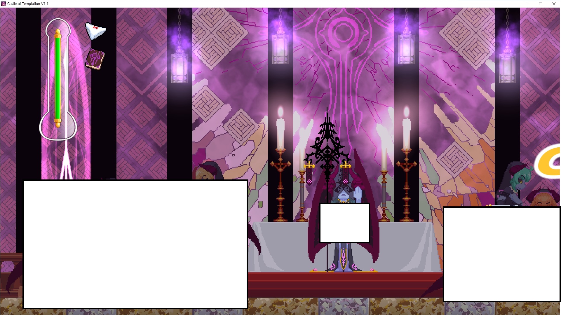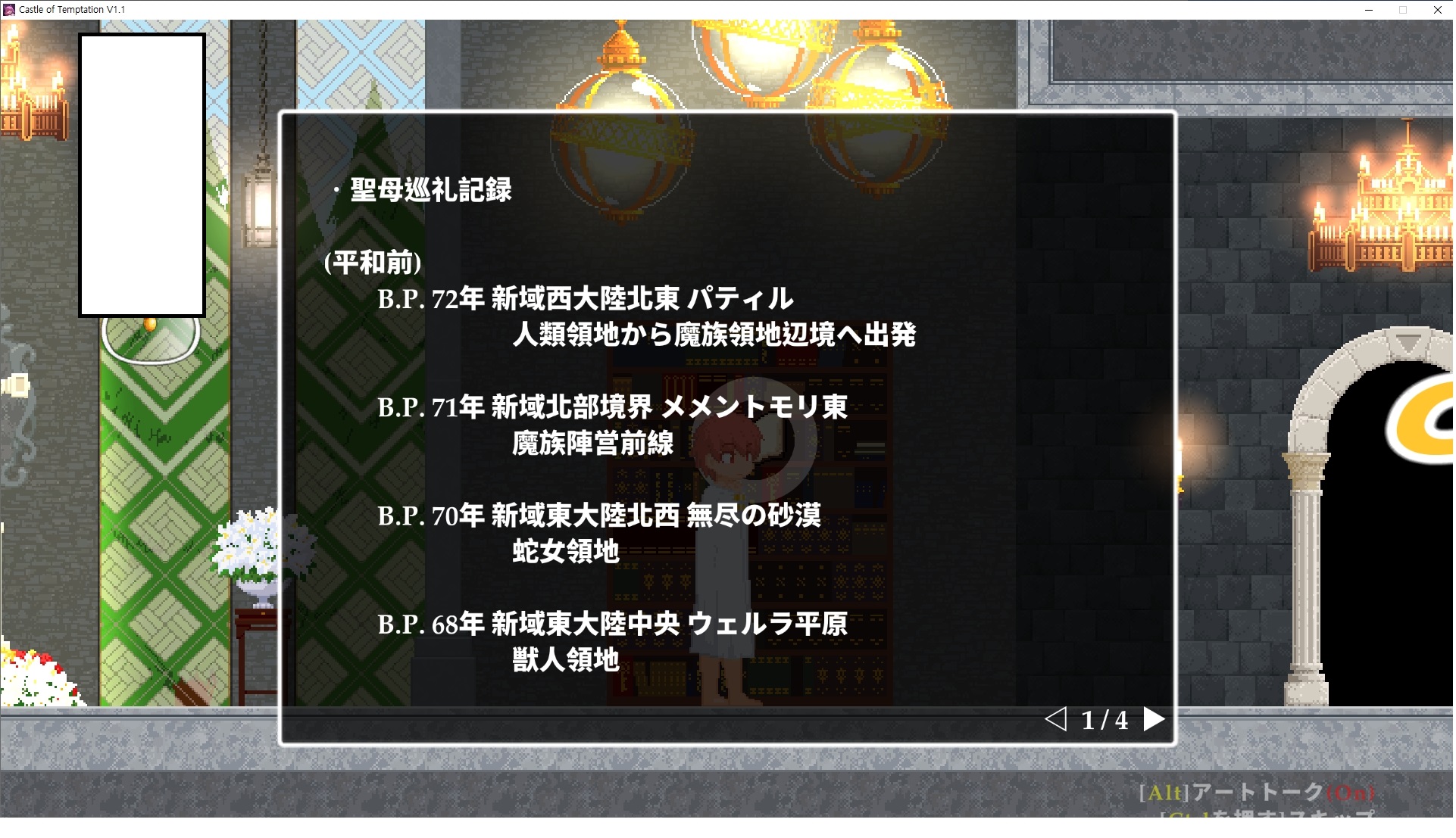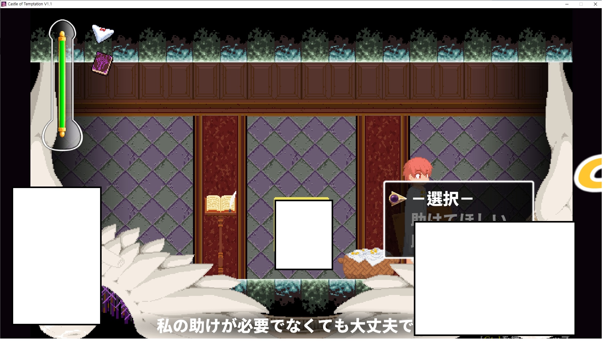 다시 처음부터여기 미믹방에서 위로 올라갑시다왼쪽에 비밀길이 있습니다죽가면 열쇠를 얻고갑자기 어두워지는데오른쪽으로 죽 달려서 도망치면 됩니다클리어하면 이렇게 열쇠가 나옵니다인형의 방은 여기 아래 상자를 치우면 길이 하나 더 있는데왼쪽 복도에서 인형이 튀어나오는길을 피해 뒤로 가면 됩니다상자를 밝고 넘어가야하나 싶긴한데 전 손에 맞아서 무적시간때 지나가졌습니다여기서 기어를 얻으면여기로 돌아오게 되고 열쇠를 얻을 수 있습니다다음은 이곳여기 점프해서 올라가면 뭔갈 조사할 수 있는데조사하면 워프가 켜집니다여기 빛에서 계속 조사하면 책상을 던질 수 있는데 그냥 던지면 죽고야스 한판 조지게 만들어 저기 앉게 만들고그 뒤에 던져주면 됩니다잘가고전지를 얻을 수 있고이걸 끼워주면열쇠로 가는 길이 열립니다여기도 온김에 3번 다 같은 곳으로 가봤습니다최종에리어는 매우 어렵다는데보스급 적이 나와서 대적합니다다만 몸이 철로 되어 있어서 자석을 켜주면 아무것도 못합니다그냥 평범히 걸어서 기계만 켜주면 깰 정도로 쉽더군요같은 곳을 3번 깨야만 도달하는 장소도 있네요뭐 별건 없었습니다여기도 최대한 날먹을 해보려고 했는데꽤 어렵더군요너무 일찍가면 닿아버려서 죽습니다계속 하다보니 되긴하더군요 날먹하는 단계가 장난이 아니기 때문에 낫긴합니다일단 되돌아가서죽 뒤로가서여기서 벽이 하나 튀어나오는데 이 뒤에 있습니다먹어둔 뒤다시 여기로이번엔 함정이 있는걸 아니까 뛰어서 넘어가줍시다무사히 탈출했습니다다시 그곳으로위서를 써서 지나갈 수 있습니다세이브장소가 있고여긴 피지컬로 넘어가야합니다살짝만 닿아도 바로 죽으니 어렵더군요어캐어캐 통과했습니다여기서 다시 정화해주고지나가면보스를 만날 수 있습니다저 랜턴이 다 꺼질때까지 버티면 됩니다공같은걸 피하면 되는데 옷을 총 4번 주니 4목숨입니다피지컬을 믿어요마지막의 발악패턴도 있습니다클리어 하면 열쇠를 쓸 수 있습니다이분은 츤츤 거리면서 같이 잘 있어주네요이쯤이면 한판 해주겠지?안해줍니다참고로 저거고르면 첨부터 해야됩니다....로드해서 올라가면?어우죽죽 위로 갑시다크게 어렵진 않더군요더 위로가면박쥐가 나와서 도와줍니다뭔가 멀쩡해졌네요이런저런 이야기가 있는데뭔 말인진 모르겠습니다대충 여기 성주가 성모의 유체를 가지고 뭔갈 했나봅니다그리고 영웅의 피로 클론을 만들어서 그 힘을 흡수하려고 한거 같네요이젤이 데몬족이고 데몬족이 평화가 싫어서 반란을 일으켰나봅니다해서 사실 지명수배당하고 있었네요이분이 조사하러 왔었나 봅니다저희가 성모랑 노는사이 튀었나봅니다반쯤 시설자첸 구라였나보네요그리고 원래 성주는 이분이였습니다하나하나 물어보고이분의 이름은 아이시스인가보네요 즐긴뒤에잘 도망가면 됩니다프리모드가 열립니다기억실이라던가 있고엔딩 그림을 구경도 할 수 있습니다친절히 수집품 위치도 적혀있고 얻기만 하면 탈출해도 획득한걸로 쳐준답니다