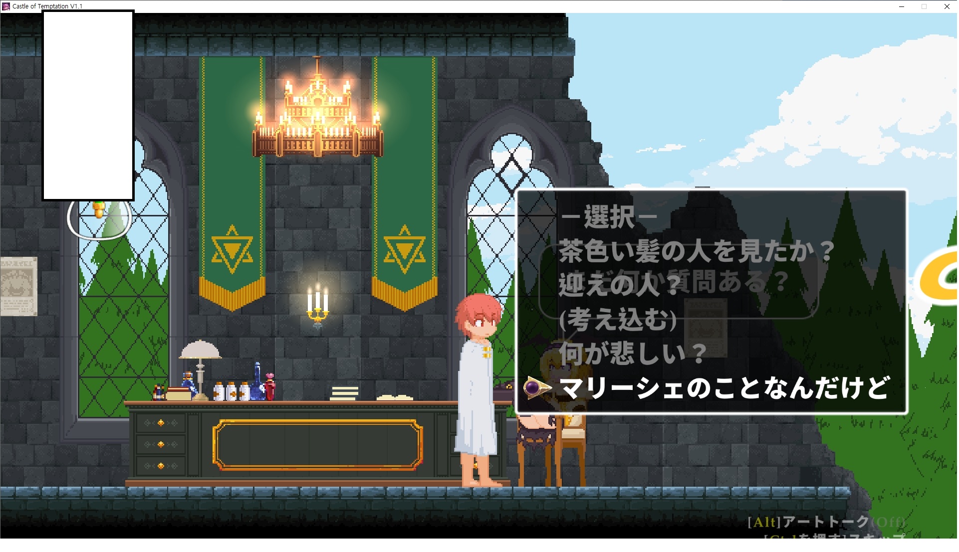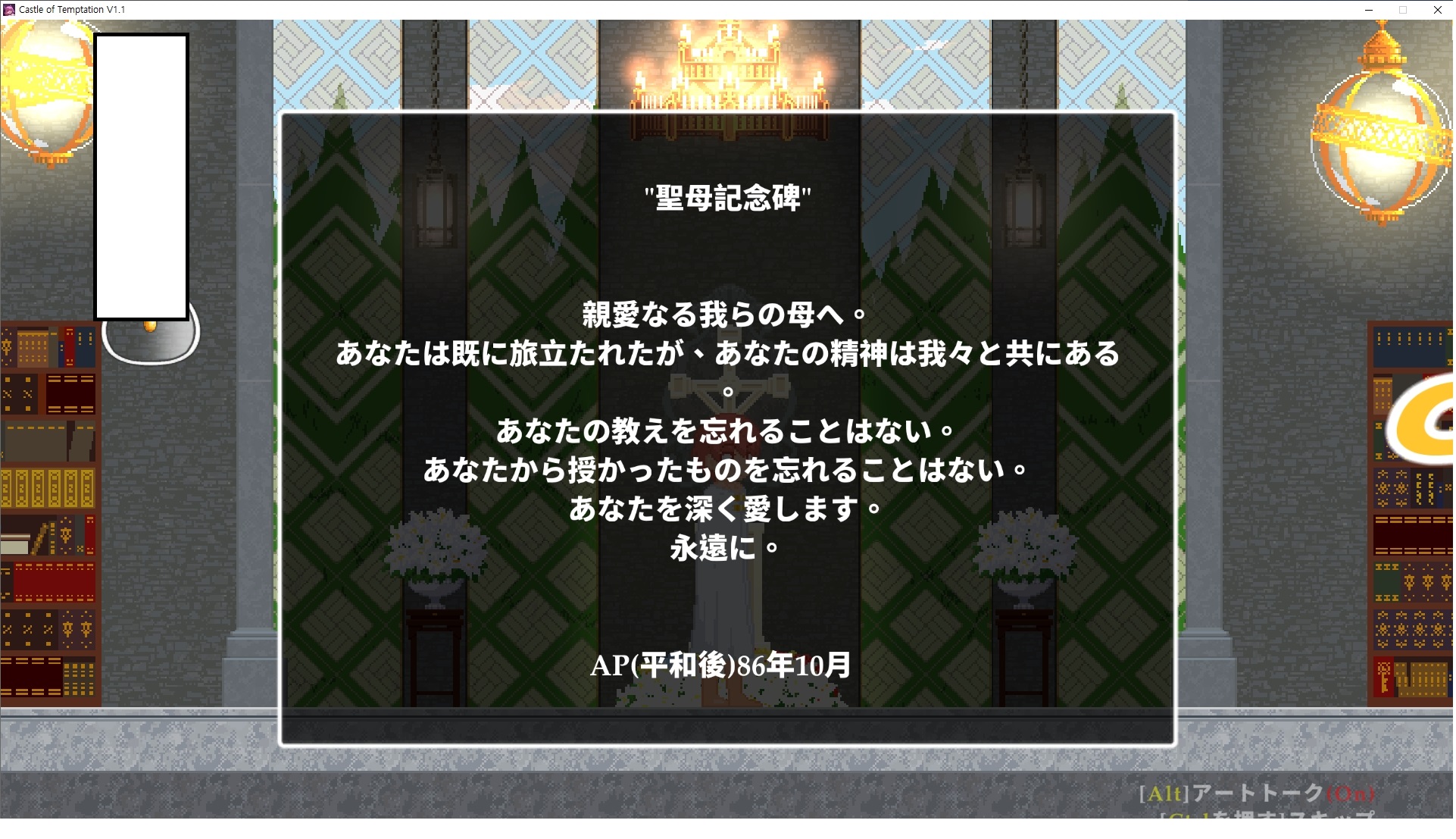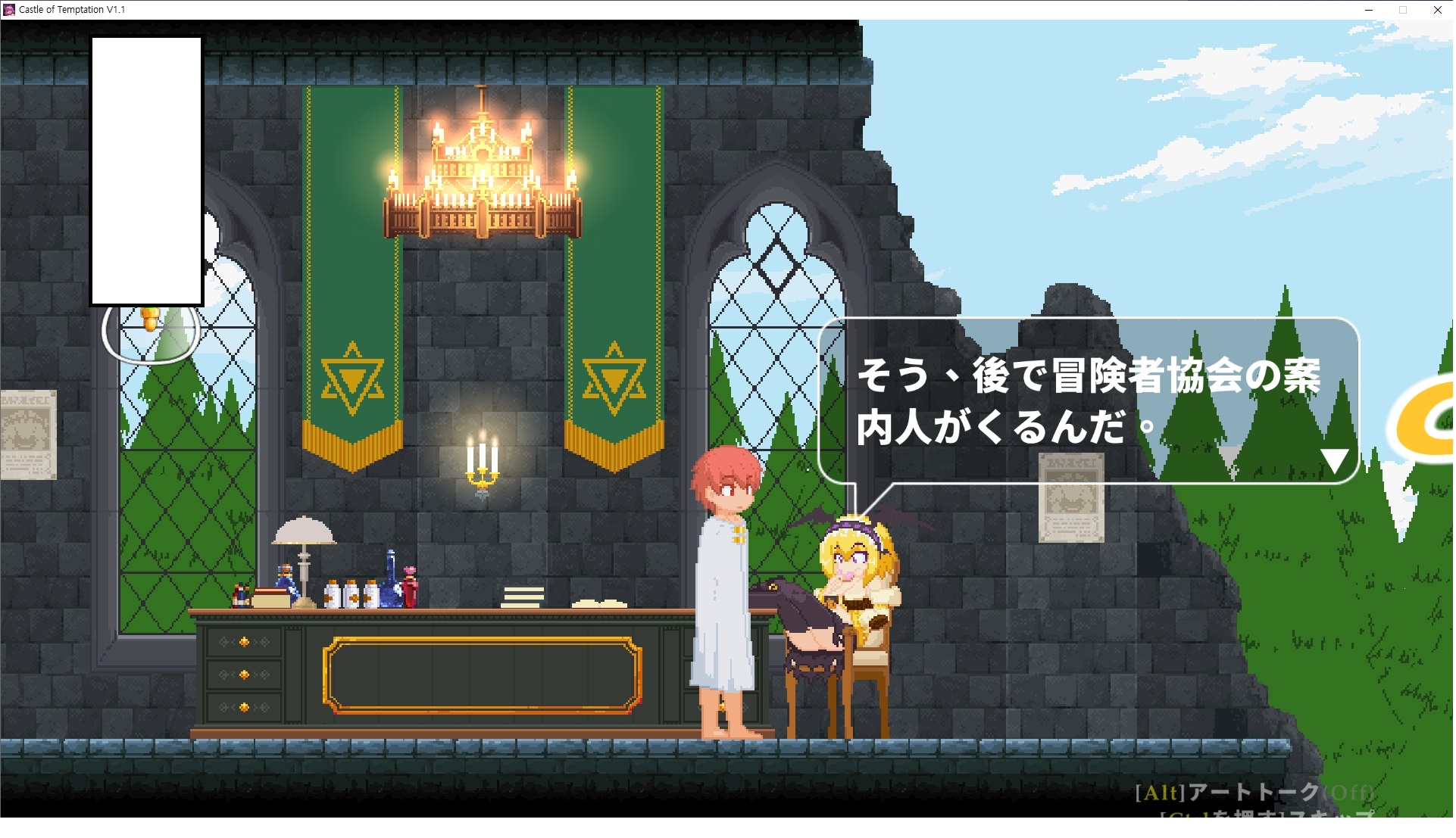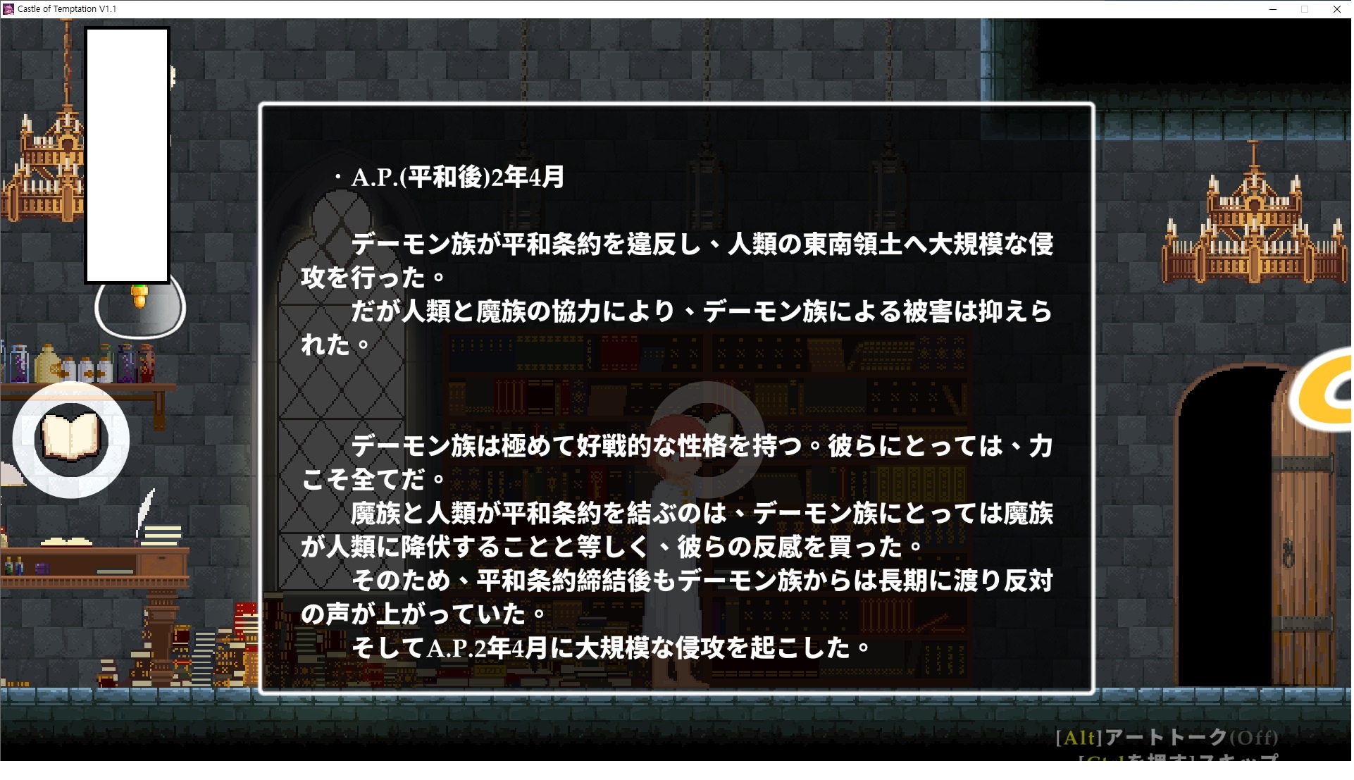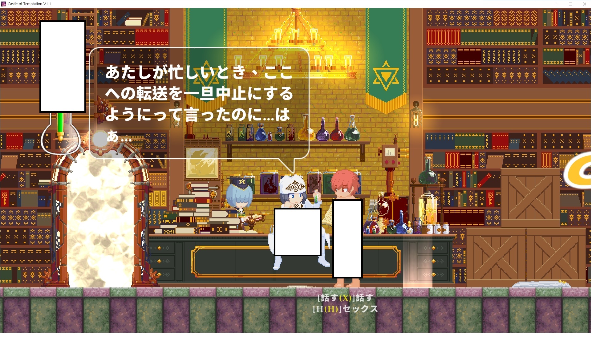 다시 처음부터여기 미믹방에서 위로 올라갑시다왼쪽에 비밀길이 있습니다죽가면 열쇠를 얻고갑자기 어두워지는데오른쪽으로 죽 달려서 도망치면 됩니다클리어하면 이렇게 열쇠가 나옵니다인형의 방은 여기 아래 상자를 치우면 길이 하나 더 있는데왼쪽 복도에서 인형이 튀어나오는길을 피해 뒤로 가면 됩니다상자를 밝고 넘어가야하나 싶긴한데 전 손에 맞아서 무적시간때 지나가졌습니다여기서 기어를 얻으면여기로 돌아오게 되고 열쇠를 얻을 수 있습니다다음은 이곳여기 점프해서 올라가면 뭔갈 조사할 수 있는데조사하면 워프가 켜집니다여기 빛에서 계속 조사하면 책상을 던질 수 있는데 그냥 던지면 죽고야스 한판 조지게 만들어 저기 앉게 만들고그 뒤에 던져주면 됩니다잘가고전지를 얻을 수 있고이걸 끼워주면열쇠로 가는 길이 열립니다여기도 온김에 3번 다 같은 곳으로 가봤습니다최종에리어는 매우 어렵다는데보스급 적이 나와서 대적합니다다만 몸이 철로 되어 있어서 자석을 켜주면 아무것도 못합니다그냥 평범히 걸어서 기계만 켜주면 깰 정도로 쉽더군요같은 곳을 3번 깨야만 도달하는 장소도 있네요뭐 별건 없었습니다여기도 최대한 날먹을 해보려고 했는데꽤 어렵더군요너무 일찍가면 닿아버려서 죽습니다계속 하다보니 되긴하더군요 날먹하는 단계가 장난이 아니기 때문에 낫긴합니다일단 되돌아가서죽 뒤로가서여기서 벽이 하나 튀어나오는데 이 뒤에 있습니다먹어둔 뒤다시 여기로이번엔 함정이 있는걸 아니까 뛰어서 넘어가줍시다무사히 탈출했습니다다시 그곳으로위서를 써서 지나갈 수 있습니다세이브장소가 있고여긴 피지컬로 넘어가야합니다살짝만 닿아도 바로 죽으니 어렵더군요어캐어캐 통과했습니다여기서 다시 정화해주고지나가면보스를 만날 수 있습니다저 랜턴이 다 꺼질때까지 버티면 됩니다공같은걸 피하면 되는데 옷을 총 4번 주니 4목숨입니다피지컬을 믿어요마지막의 발악패턴도 있습니다클리어 하면 열쇠를 쓸 수 있습니다이분은 츤츤 거리면서 같이 잘 있어주네요이쯤이면 한판 해주겠지?안해줍니다참고로 저거고르면 첨부터 해야됩니다....로드해서 올라가면?어우죽죽 위로 갑시다크게 어렵진 않더군요더 위로가면박쥐가 나와서 도와줍니다뭔가 멀쩡해졌네요이런저런 이야기가 있는데뭔 말인진 모르겠습니다대충 여기 성주가 성모의 유체를 가지고 뭔갈 했나봅니다그리고 영웅의 피로 클론을 만들어서 그 힘을 흡수하려고 한거 같네요이젤이 데몬족이고 데몬족이 평화가 싫어서 반란을 일으켰나봅니다해서 사실 지명수배당하고 있었네요이분이 조사하러 왔었나 봅니다저희가 성모랑 노는사이 튀었나봅니다반쯤 시설자첸 구라였나보네요그리고 원래 성주는 이분이였습니다하나하나 물어보고이분의 이름은 아이시스인가보네요 즐긴뒤에잘 도망가면 됩니다프리모드가 열립니다기억실이라던가 있고엔딩 그림을 구경도 할 수 있습니다친절히 수집품 위치도 적혀있고 얻기만 하면 탈출해도 획득한걸로 쳐준답니다