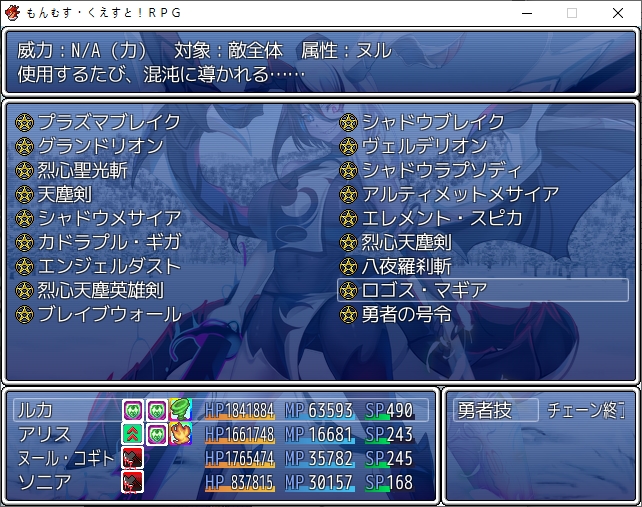 마왕성으로 와보니 허룡이 와있습니다때가 무르익었으나 이 장소는 아니라고 합니다그때의 결투장소 봉래산의 정상으로 오라고 합니다여기도 챙겨갑시다평범하게 대화도 잘하고 예의바르네요아카식레코드에서 다운받았다고 합니다시디도 받습니다여기도 다 챙겨갑시다과거이야기네요허룡은 죽지않고 사신을 죽인게 저쪽세계입니다하지만 원망은 하지 않고 자기를 최강으로 길러준 감사의 의미였다고 합니다생각보다 사신이 살아있는 세계선은 적었다고 하네요육조도 옵니다일시적으로 동료가 되긴합니다필요는 없지만요그래도 강력한 허룡이제 전력으로 상대해준다고 합니다역시 그 힘을 쓸 수 밖에 없나뭔가 쓸 수록 혼돈에 잠식된다는 기술이 있긴한데어짜피 제가 살 세상아닙니다이기면 드래곤의 금벽을 얻을 수 있습니다혼돈이 무서운 말을 하네요급 아픈데아드라멜릭이 뒤를 칩니다그 힘을 계속 쓰지 말라고 합니다결투에 끼어들어 화가 난 허룡자신은 사자중 최강이라면서 싸우려고 합니다무려 아드라까지 이기는 허룡하지만 허룡도 정상인 상태는 아니였는데 그럼에도 계속 싸우려고 합니다이번에도 일리아스가 봉인술을 써주고사신이 공격을 하며 그렇게 싸움은 마무리가 됩니다이제 마지막 하나만 남았네요묘까지 만들어줍니다이제 대장간도 최대레벨이 되고인형이 하나 생겨있는데어느새 3명의 오야지만 남았네요 위치도 알려줍니다모름모름모름 정확히는 혼돈 심층영역에 3명 다 있습니다비석도 늘어납니다나가면 드디어 일리아스 각성이벤트가 나옵니다성에너지를 가진 자들을 모아전기충격을 주는 느낌으로 일리아스의 힘을 다시 일깨우려고 합니다여기로 갑시다제일 안쪽에 조건에 맞는 곳이 있습니다드디어 의식을 시작하는데일리아스의 동료들도 열심히 합니다근데 아무일도 안일어납니다이미 일리아스가 충분히 강해서라네요그럼 만세삼창이나 합시다와 만세만세그런 상황에서 아피로가 등장모두가 모여있으니 일망타진할 생각입니다아공간의 게이트를 열어 없애려고 하지만제일 약한 둘이 사라지고 동료를 구하러 일리아스도 같이 사라집니다소니아의 힘으로 게이트가 닫기지만 이미 세명이 빨려들어가버렸군요소니아가 여기 붙었단 사실을 이제 압니다여기서의 1초는 저기서 5년이란 긴 시간차이가 발생한다고 합니다벌써 저기는 엄청난 시간이 흘러버렸습니다그런 시간속덕분에 일리아스는 강해질 시간을 얻었습니다게이트를 열고 직접돌아옵니다드디어 일리아스님이 복귀를 합니다누구세요?둘도 여신의 가호를 받아 파워업했습니다꽤나 힘든 시간을 겪었네요서브일리아스도 죽인 아피로지만여긴 동료도 있습니다셋은 다시 동료가 되고7대천사도 임시로 동료가 됩니다바로 패줍시다어느새 혼돈의 사자에게도 준할만큼 강해져있습니다과거의 일 때문에 총구를 겨누지만이쪽은 친구먹었으니 괜찮습니다친구친구여신의 금벽도 얻습니다지금의 우리들이라면 혼돈의 신조차 이길 수 있을겁니다생각보다 체인이 좋진 않습니다단야도 가능해집니다바로 찾아가서 만들어봅시다재료는 최종던전에서 얻을 수 있습니다다시 들어가보면모두가 모여있습니다이제 금단의 무구를 만드려고 합니다파피는 궁극의 혼돈무기를 만듭니다찐최종장비를 만들 수 있습니다데미지가 장난아닙니다이데아 루카스 전용장비는 벌써 데이터로 들어있네요이제서야 와보는 일리아스베르크집에 가보면 아무것도 없습니다시디만 하나 있습니다빼먹은거 몇개 챙겨갑시다 몬테카를로 져스티스의 방에 시디가소니아의 기억속 루카의 여관에 시디가 있습니다저번에 여기서 잤을때 아무일도 안일어났었는데 진행을 좀 하면 이벤트가 일어납니다매지컬마린쨩도 등장누군가가 그란베리아의 꿈속에 있네요저녀석을 쓰러뜨리기 위해 꿈 속으로 들어갑시다이상한 석판들이 보이네요 악몽인거 치곤 좀 이상합니다정비도 가능합니다마법진이 있는데위쪽만 빛이납니다들어가보면 그란베리아가 있습니다꽤 초기의 마법소녀 의식때의 그란베리아입니다템도 있으니 챙겨갑시다안쪽에는 타마모가 있고그란베리아는 마법소녀로 각성해서 싸웁니다시계방향으로 돌면 되네요다시 그란베리아와 만나는데 아까 만난 그란베리아와 동일인물 같습니다이쪽을 이세계에서 온 사람이라고 인식하고 있네요여기에는 사리엘라가 과혹한 압정을 하고 있기 때문에 해결하려고 합니다일리아스가 죽은 뒤로 이러고 있다고 합니다안쪽으로 가면 사리엘라가 있습니다한대 패주고 조언을 해줍시다악몽치곤 매우 이상합니다일리아스라면 이런 악몽을 보여줬을거라 하네요다음은 산이리아입니다누군가가 금술을 쓰려고 한다고 합니다가보면 미나기가 회생의 술을 쓰려고 합니다그런 미나기도 말려줍시다악몽이 아닌 평행세계같다고 합니다그다음은 그랜드노아네요이번 적은 전마법소녀라고 합니다확실히 평행세계군요안쪽에는 라파엘라가 타락해있습니다모든걸 아는 자로 각성하려고 하네요이기면 그란베리아에게 조언을 해주며 사라집니다이래서 마법소녀는 하고 싶지 않다고 하네요다음엔 이쪽에서 도움을 