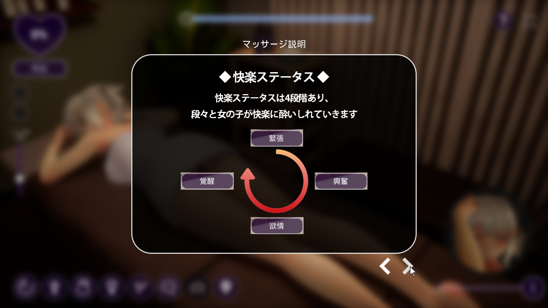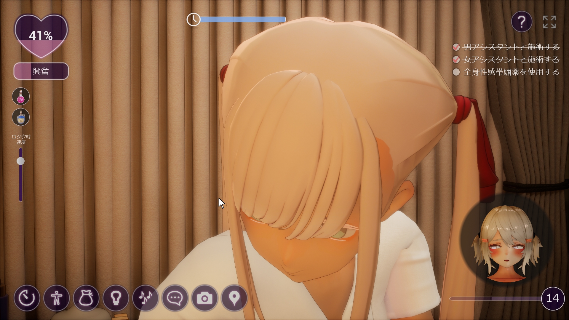 테니스부 소녀를 마사지 하는 게임입니다그냥 이거만 봐도 갓겜입니다마크를 눌러 마사지를 할 수 있는 위치를 확인 후에 마사지를 하면 됩니다 그냥 하면 귀찮으니 휠을 눌러 오토로 돌립시다4단계로 이루어져 있는데 초반엔 좀 잘 안오르긴 합니다시간이 끝나면 돈을 받고이걸로 상점에서 템을 사서 효율을 높이면 되는 형식입니다레벨이 오르면 할 수 있는 행동들이 많아집니다 목표의 경우 오른쪽 위에 표시됩니다나중에 예쁜 어시스트 눈나도 추가되는데 이 누나랑은 상호작용이 없어서 아쉽네요20렙까지 올려서 템을 사면 끝입니다 시간제한을 없애주는 템을 줍니다