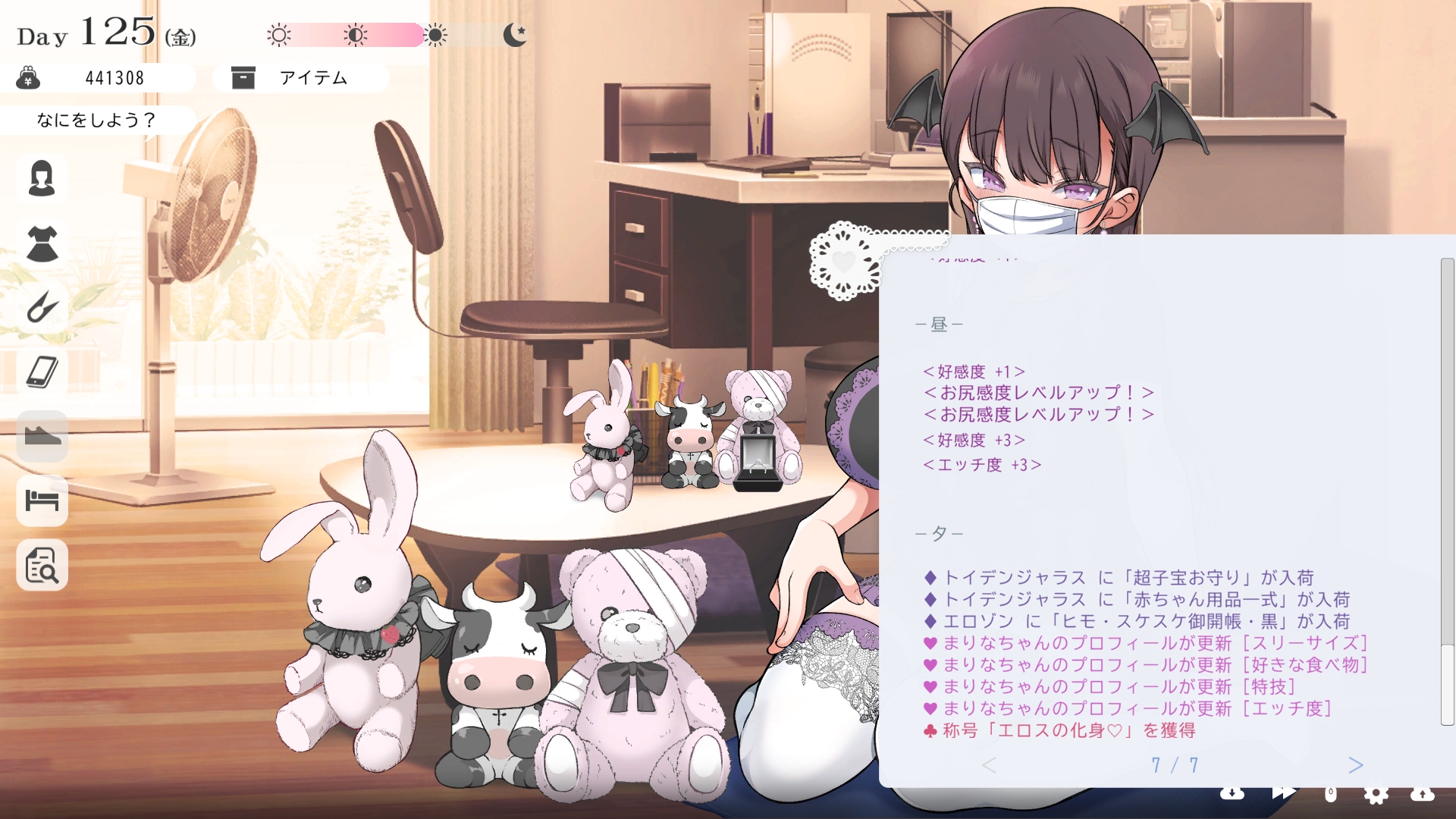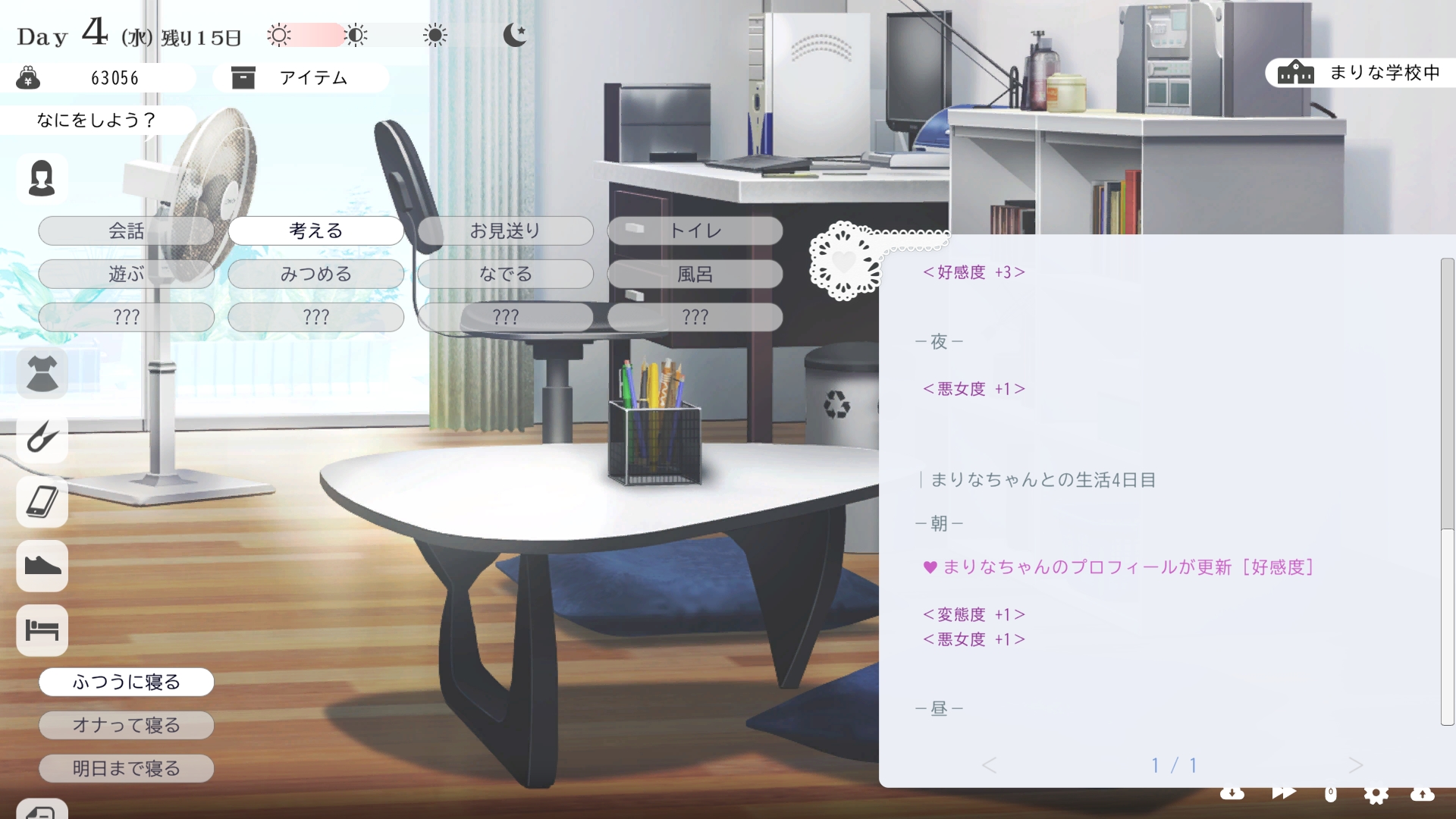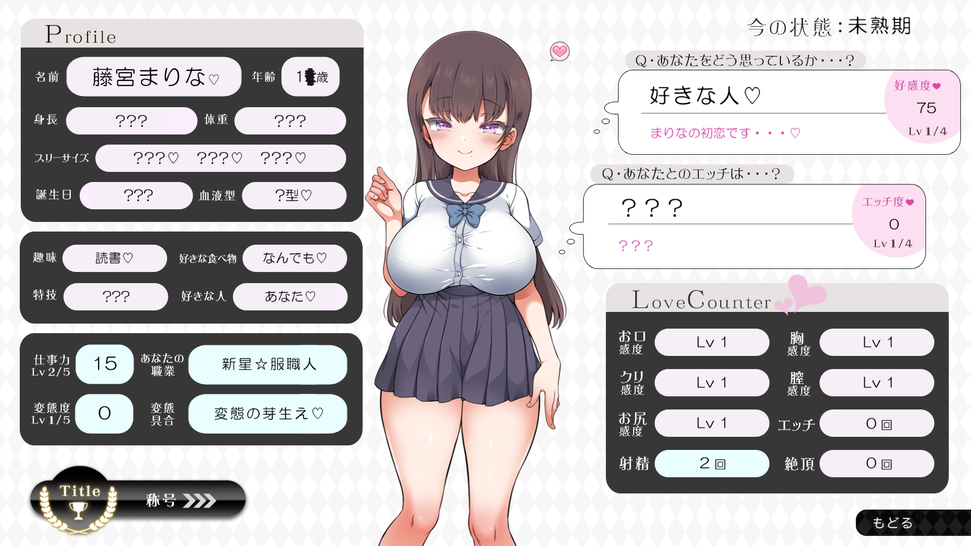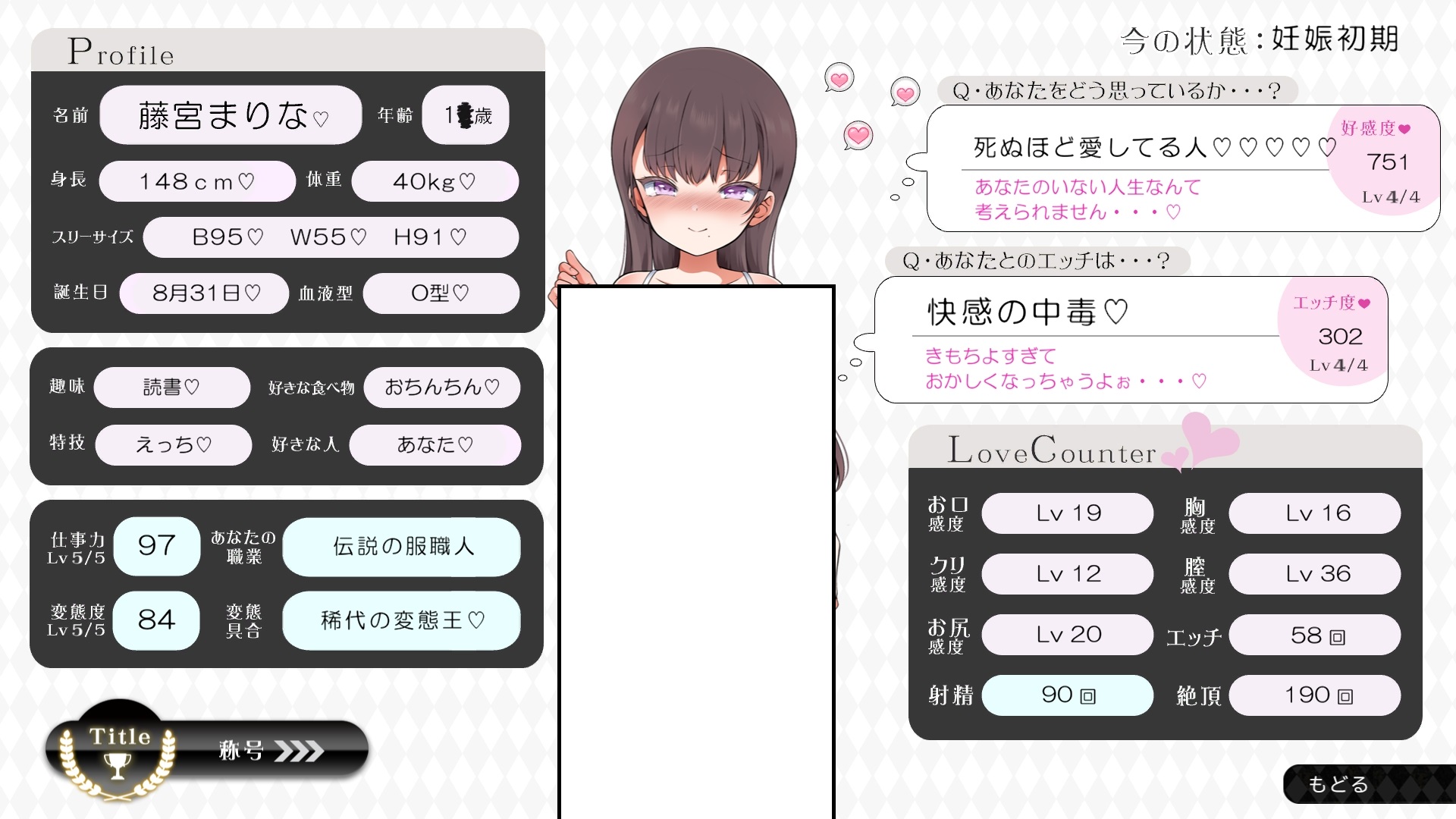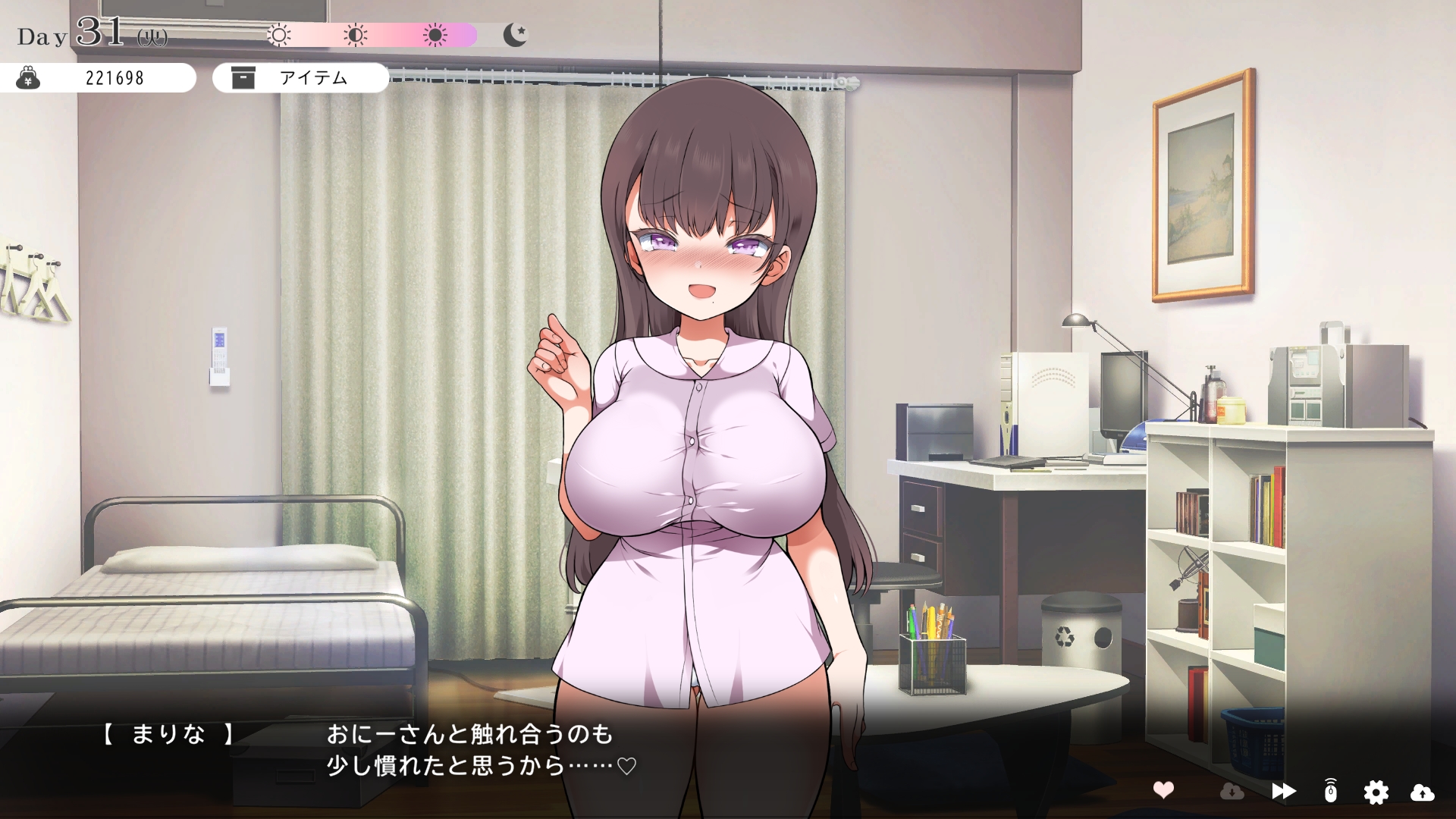 따지고 보면 주인공이 프러포즈를 한거니 책임을 지라는 마리나이때부턴 평정심도 깨집니다이제부터 새로운 생활이 시작됩니다궁금해서 다른 엔딩도 몇개 맛만 봤습니다바로 손대면 악녀도라는 히든 스테이터스가 오르네요바로 ATM으로 전락합니다엔딩을 보면 이전 마리나가 말한대로 모든 친척과 연을 끊고 혼자 살아가려고 하는데 솔직히 제대로된 생활을 할진 모르겠네요이것 저것 봤는데 크게 변하는건 없더군요다시 돌아오니 이것 저것 많이 생겼네요배웅도 해주고통판이 생겨있는데아마존이네요또한 이때부터 선물도 가능한가봅니다사랑하는 사람으로 변하고 이 후 호감도가 오르면 하트도 점점 늘어납니다다른 이야기들도 더 들을 수 있습니다밥은 더 근사해졌습니다주말의 외출도 마리나와 같이 갈 수 있습니다와이키키비치로도 갈 수 있네요책방은 별거 없었습니다 일정도는 책으로 좀 올리는게 낫더군요 100까지 깡으로 올리기 힘들었습니다이 뒤엔 카페도 갈 수 있습니다책같은건 여기서 써야하는데쓰면 한턴도 지납니다 영 좋진 않네요의사놀이도 해주고악세도 열심히 모아줍시다선택지가 나오긴하는데 그냥 이벤트로 보면 커피랑 피자를 잘 시켜먹더군요동거 초기 히든스텟으로 미열도가 있는데 저 하트이벤트를 죽 보면서 올려주면 됩니다옷갈도 가능한데 당장은 선물로 준 옷이 없어서 불가능하네요악세라도 입혀줍시다생일이 8월 31일이였군요일등급이 오르면 옷등급이 오르고 판매가가 훅 오릅니다 열심히 일을 해줍시다프로필도 잘 채워주고선물도 열심히 사줍시다집에 실제로 장식도 해줍니다공원도 갈 수있는데 오후에만 갈 수 있네요해안가도 가보고공원에도 놀러도 갑니다그렇게 죽 지내다보면 마리나도 준비가 됩니다이제 남자도 익숙해졌나보네요이제부터 더욱 본격적으로 즐길 수 있습니다여기서도 많은 옷들이 기다리니 열심히 사줍시다 다만 초기에는 오래 즐기진 못하더군요생각보다 개방되는 요소가 많습니다엣찌도를 올려야 밤일이 편해집니다열심히 감도도 올려주고오후때 마리나를 생각하면 이렇게 마중도 나갈 수 있습니다일도 3레벨이 되고드디어 다른 옷감소재를 살 수 있었습니다죽죽 개방을 해줍시다2레벨은 되어야 좀 할만합니다옷도 만들어서 선물을 해줬습니다와 인상이 바로 바뀌네요중간에 주인공의 옷을 선물해주는 이벤트도 있더군요요즘 지뢰계에 왜 이렇게 꽃히는지 모르겠습니다마지막은 특수인데속옷같긴한데 없이도 만들 수 있더군요 대체 무슨 옷인거지 참고로 옷감도 많이 안들어서 ㄹㅇ 무에서 유를 창조합니다온천도 놀러갈 수 있게 되네요이때까지 왜 따로자는진 모르겠지만 드디어 같이 잡니다유원지로도 놀러갈 수 있고호감도가 오르면 제쿠스이가 뭔 말인진 모르곘지만 이걸 사면 결혼을 할 수 있습니다결혼반지도 잊지 말고 사줍시다밤에만 선물가능합니다밤이 되어서 선물을 하면프로포즈가 가능합니다이건 왜 의상에 추가안되는지 모르겠는데 웨딩드레스도 나옵니다그렇게 결혼도 합니다욕구불만 스텟도 있네요열심히 일도 하고질투이벤트도 봅시다 몇몇 이벤트는 확률로 나오는거 같더군요칭호도 하나둘 챙기면서 이벤트를 봐줍시다음란도까지 최대한 올리면 아이도 만들 수 있습니다근데 생각보다 많이 비싸네요이거도 밤에 써주면 됩니다이 전 생활로 돌아갈 수 없으니 주의해주세요 참고로 쓰면 바로 임신됩니다 무슨 기적출산까지 무려 120일이나 되기 때문에 상점에서 10일을 건너뛰는 템을 팝니다 하나하나 사서쓰는거라 좀 귀찮더군요당장은 별 달라지는게 없습니다러브호텔도 생기네요죽 하다보면 프로필도 한번 더 바뀝니다 깨알같이 가슴이랑 엉덩이가 1씩 오릅니다마지막 ???은 뭔가 했더니 산부복이였군요 100일이 남으면 보테배 표현도 있습니다참고로 이걸로 입혀봤는데 어우 진짜 사고친 지뢰계같아서 엄청 좋았습니다10일을 열심히 노가다 해서 넘기면아이도 낳습니다 해피엔딩이네요