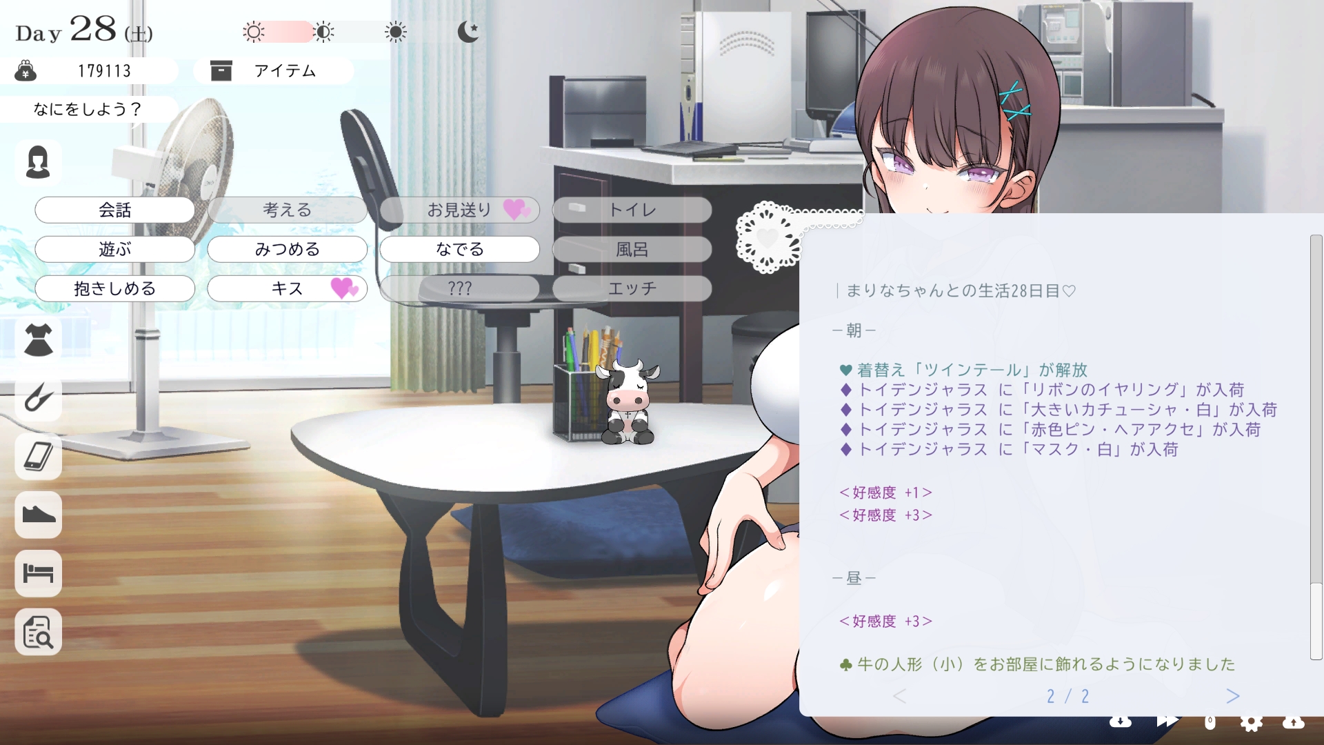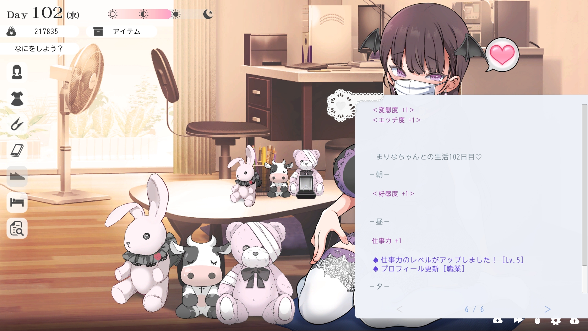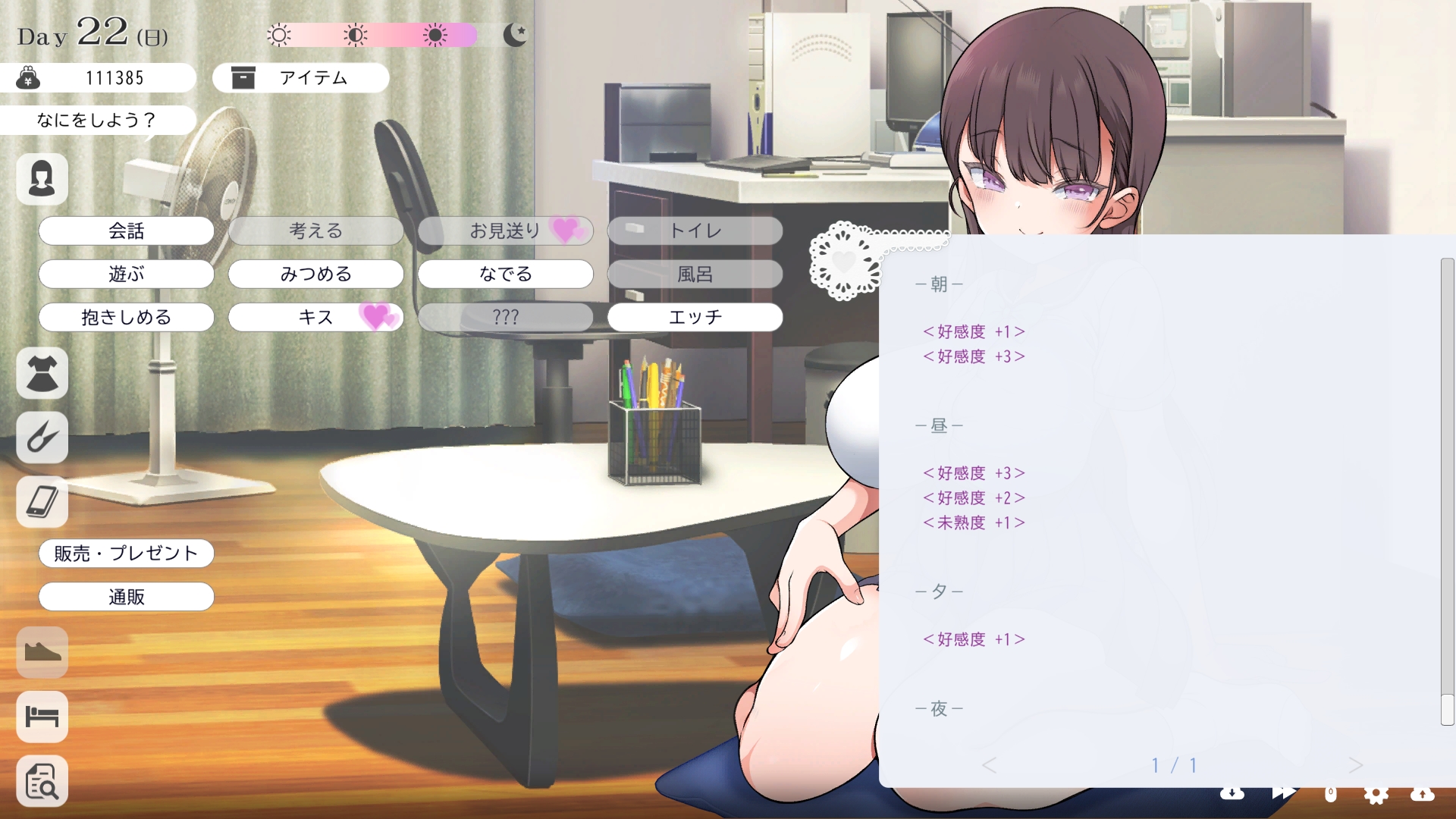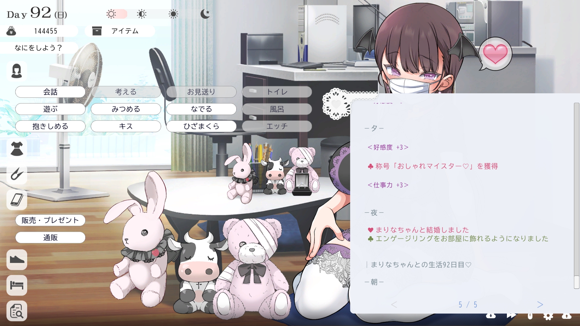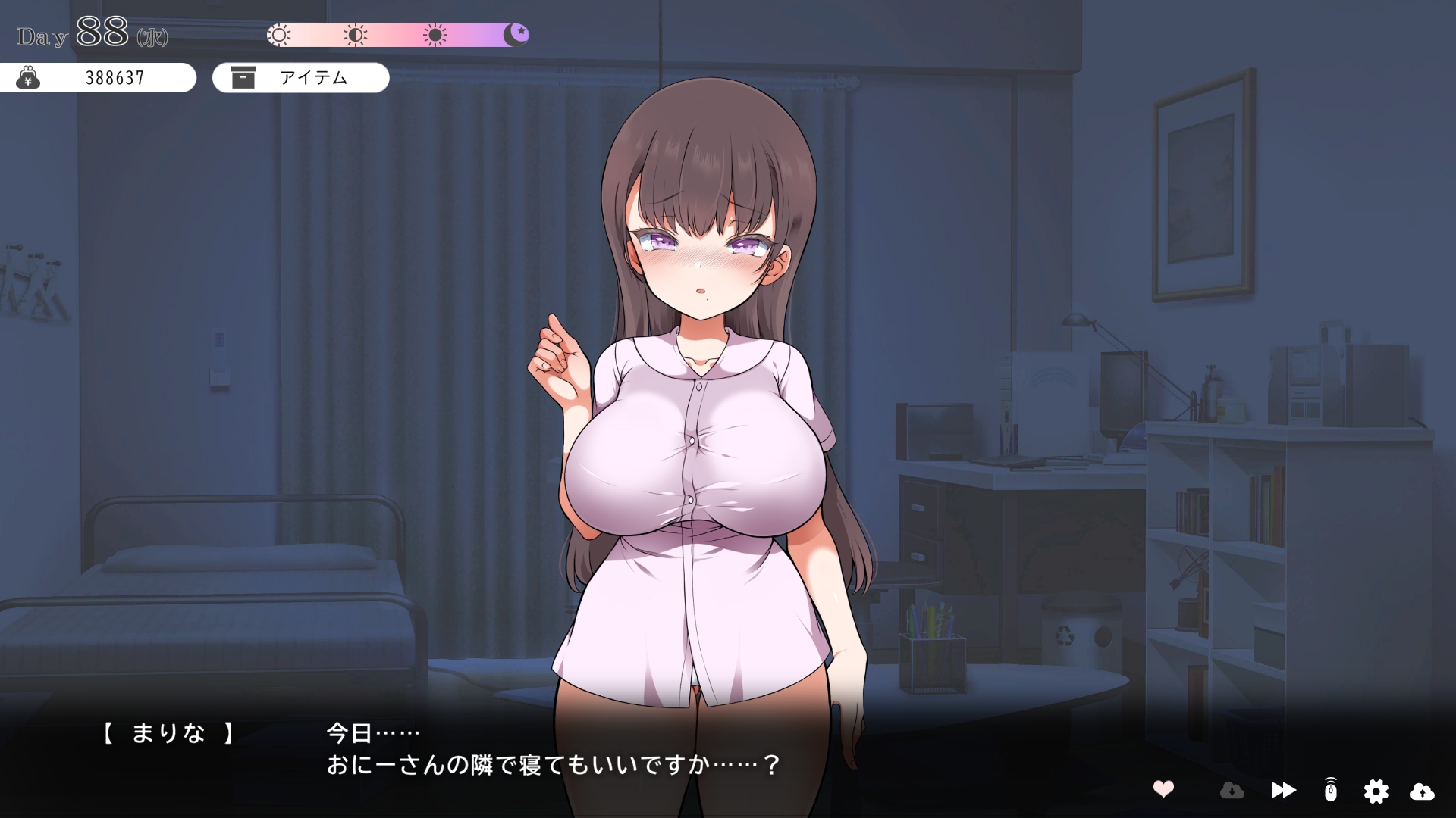 따지고 보면 주인공이 프러포즈를 한거니 책임을 지라는 마리나이때부턴 평정심도 깨집니다이제부터 새로운 생활이 시작됩니다궁금해서 다른 엔딩도 몇개 맛만 봤습니다바로 손대면 악녀도라는 히든 스테이터스가 오르네요바로 ATM으로 전락합니다엔딩을 보면 이전 마리나가 말한대로 모든 친척과 연을 끊고 혼자 살아가려고 하는데 솔직히 제대로된 생활을 할진 모르겠네요이것 저것 봤는데 크게 변하는건 없더군요다시 돌아오니 이것 저것 많이 생겼네요배웅도 해주고통판이 생겨있는데아마존이네요또한 이때부터 선물도 가능한가봅니다사랑하는 사람으로 변하고 이 후 호감도가 오르면 하트도 점점 늘어납니다다른 이야기들도 더 들을 수 있습니다밥은 더 근사해졌습니다주말의 외출도 마리나와 같이 갈 수 있습니다와이키키비치로도 갈 수 있네요책방은 별거 없었습니다 일정도는 책으로 좀 올리는게 낫더군요 100까지 깡으로 올리기 힘들었습니다이 뒤엔 카페도 갈 수 있습니다책같은건 여기서 써야하는데쓰면 한턴도 지납니다 영 좋진 않네요의사놀이도 해주고악세도 열심히 모아줍시다선택지가 나오긴하는데 그냥 이벤트로 보면 커피랑 피자를 잘 시켜먹더군요동거 초기 히든스텟으로 미열도가 있는데 저 하트이벤트를 죽 보면서 올려주면 됩니다옷갈도 가능한데 당장은 선물로 준 옷이 없어서 불가능하네요악세라도 입혀줍시다생일이 8월 31일이였군요일등급이 오르면 옷등급이 오르고 판매가가 훅 오릅니다 열심히 일을 해줍시다프로필도 잘 채워주고선물도 열심히 사줍시다집에 실제로 장식도 해줍니다공원도 갈 수있는데 오후에만 갈 수 있네요해안가도 가보고공원에도 놀러도 갑니다그렇게 죽 지내다보면 마리나도 준비가 됩니다이제 남자도 익숙해졌나보네요이제부터 더욱 본격적으로 즐길 수 있습니다여기서도 많은 옷들이 기다리니 열심히 사줍시다 다만 초기에는 오래 즐기진 못하더군요생각보다 개방되는 요소가 많습니다엣찌도를 올려야 밤일이 편해집니다열심히 감도도 올려주고오후때 마리나를 생각하면 이렇게 마중도 나갈 수 있습니다일도 3레벨이 되고드디어 다른 옷감소재를 살 수 있었습니다죽죽 개방을 해줍시다2레벨은 되어야 좀 할만합니다옷도 만들어서 선물을 해줬습니다와 인상이 바로 바뀌네요중간에 주인공의 옷을 선물해주는 이벤트도 있더군요요즘 지뢰계에 왜 이렇게 꽃히는지 모르겠습니다마지막은 특수인데속옷같긴한데 없이도 만들 수 있더군요 대체 무슨 옷인거지 참고로 옷감도 많이 안들어서 ㄹㅇ 무에서 유를 창조합니다온천도 놀러갈 수 있게 되네요이때까지 왜 따로자는진 모르겠지만 드디어 같이 잡니다유원지로도 놀러갈 수 있고호감도가 오르면 제쿠스이가 뭔 말인진 모르곘지만 이걸 사면 결혼을 할 수 있습니다결혼반지도 잊지 말고 사줍시다밤에만 선물가능합니다밤이 되어서 선물을 하면프로포즈가 가능합니다이건 왜 의상에 추가안되는지 모르겠는데 웨딩드레스도 나옵니다그렇게 결혼도 합니다욕구불만 스텟도 있네요열심히 일도 하고질투이벤트도 봅시다 몇몇 이벤트는 확률로 나오는거 같더군요칭호도 하나둘 챙기면서 이벤트를 봐줍시다음란도까지 최대한 올리면 아이도 만들 수 있습니다근데 생각보다 많이 비싸네요이거도 밤에 써주면 됩니다이 전 생활로 돌아갈 수 없으니 주의해주세요 참고로 쓰면 바로 임신됩니다 무슨 기적출산까지 무려 120일이나 되기 때문에 상점에서 10일을 건너뛰는 템을 팝니다 하나하나 사서쓰는거라 좀 귀찮더군요당장은 별 달라지는게 없습니다러브호텔도 생기네요죽 하다보면 프로필도 한번 더 바뀝니다 깨알같이 가슴이랑 엉덩이가 1씩 오릅니다마지막 ???은 뭔가 했더니 산부복이였군요 100일이 남으면 보테배 표현도 있습니다참고로 이걸로 입혀봤는데 어우 진짜 사고친 지뢰계같아서 엄청 좋았습니다10일을 열심히 노가다 해서 넘기면아이도 낳습니다 해피엔딩이네요