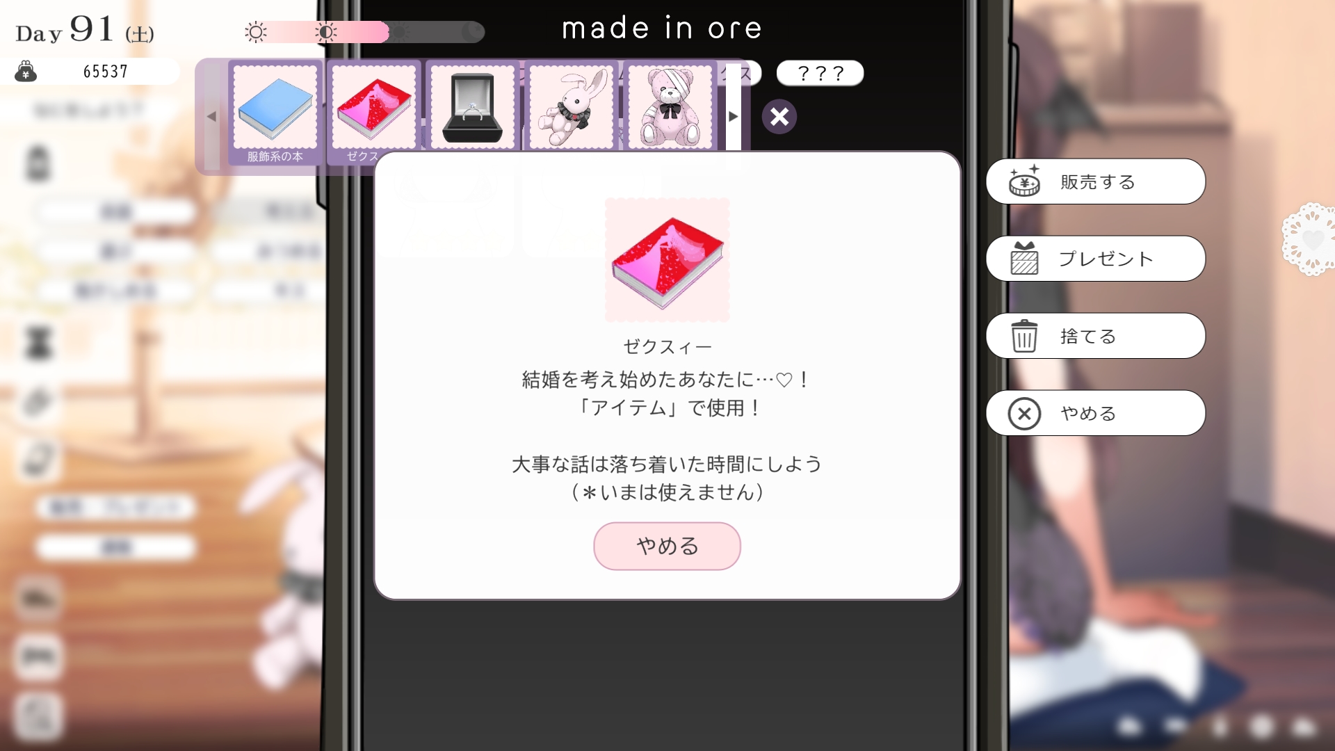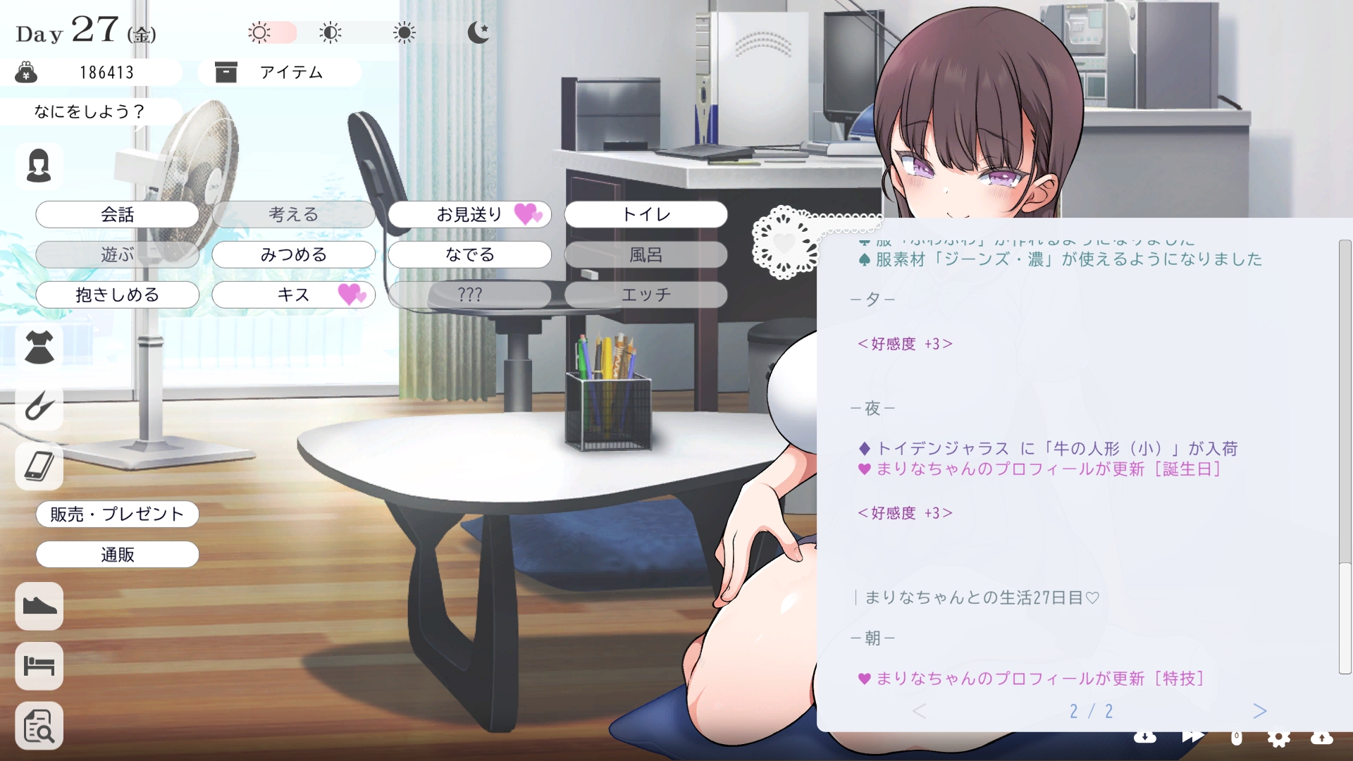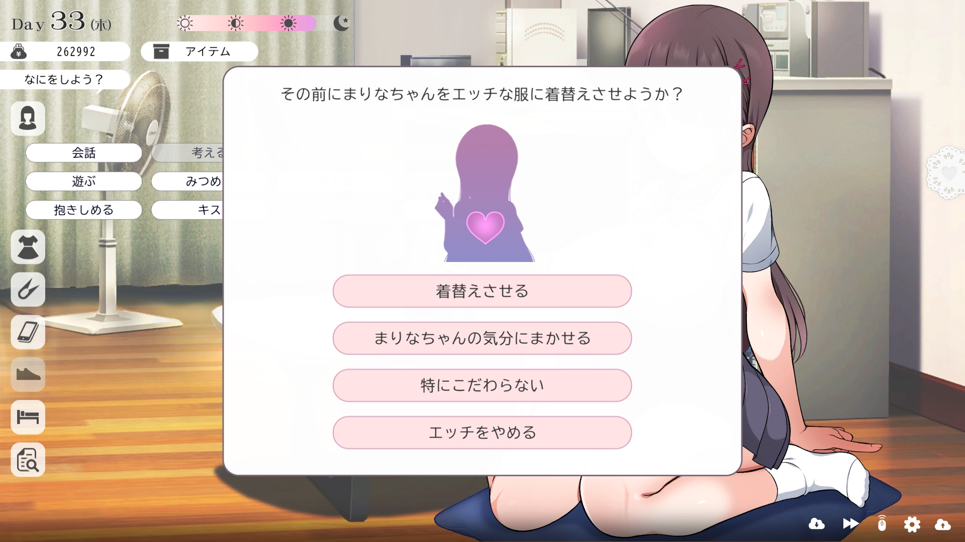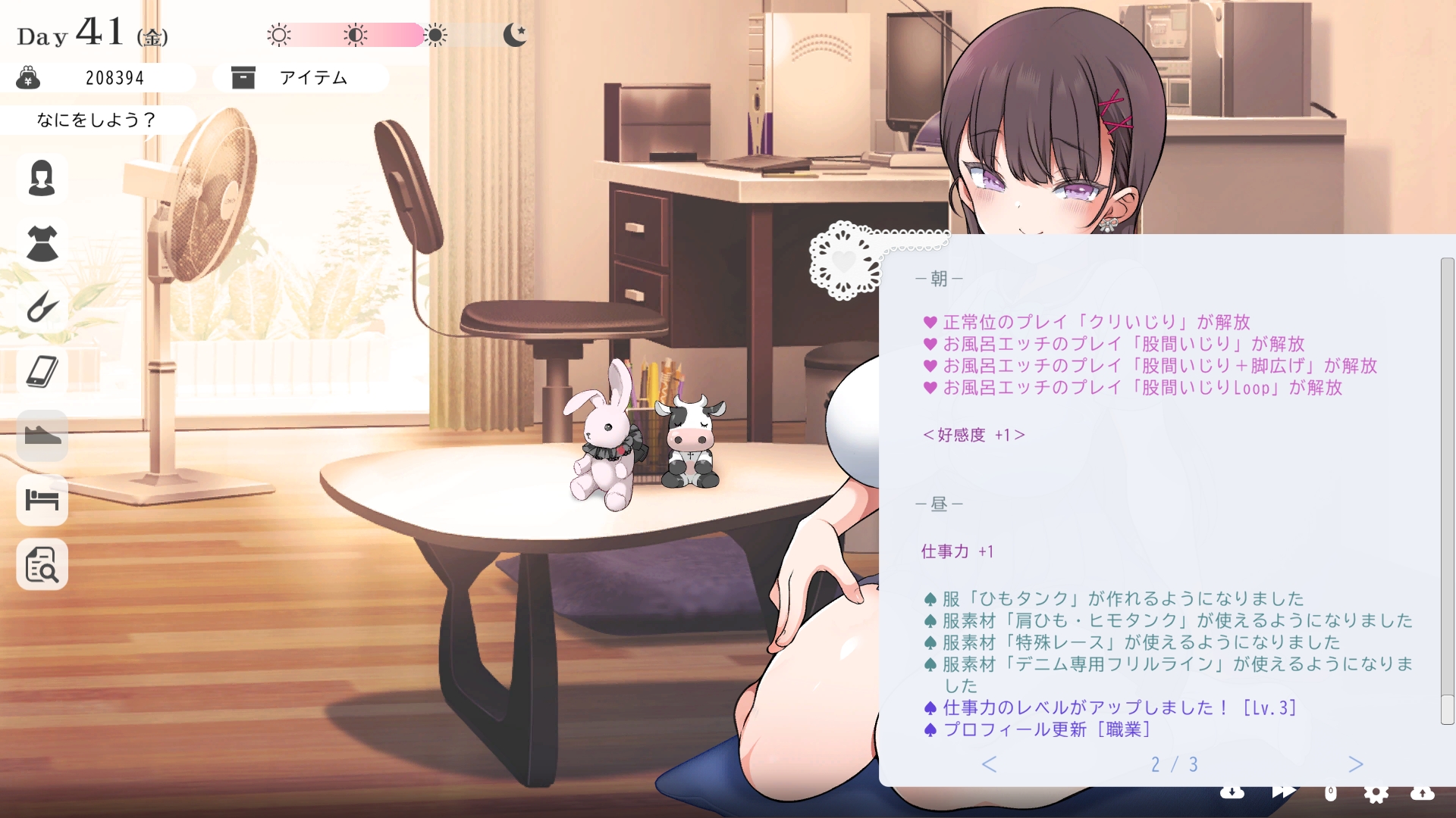 따지고 보면 주인공이 프러포즈를 한거니 책임을 지라는 마리나이때부턴 평정심도 깨집니다이제부터 새로운 생활이 시작됩니다궁금해서 다른 엔딩도 몇개 맛만 봤습니다바로 손대면 악녀도라는 히든 스테이터스가 오르네요바로 ATM으로 전락합니다엔딩을 보면 이전 마리나가 말한대로 모든 친척과 연을 끊고 혼자 살아가려고 하는데 솔직히 제대로된 생활을 할진 모르겠네요이것 저것 봤는데 크게 변하는건 없더군요다시 돌아오니 이것 저것 많이 생겼네요배웅도 해주고통판이 생겨있는데아마존이네요또한 이때부터 선물도 가능한가봅니다사랑하는 사람으로 변하고 이 후 호감도가 오르면 하트도 점점 늘어납니다다른 이야기들도 더 들을 수 있습니다밥은 더 근사해졌습니다주말의 외출도 마리나와 같이 갈 수 있습니다와이키키비치로도 갈 수 있네요책방은 별거 없었습니다 일정도는 책으로 좀 올리는게 낫더군요 100까지 깡으로 올리기 힘들었습니다이 뒤엔 카페도 갈 수 있습니다책같은건 여기서 써야하는데쓰면 한턴도 지납니다 영 좋진 않네요의사놀이도 해주고악세도 열심히 모아줍시다선택지가 나오긴하는데 그냥 이벤트로 보면 커피랑 피자를 잘 시켜먹더군요동거 초기 히든스텟으로 미열도가 있는데 저 하트이벤트를 죽 보면서 올려주면 됩니다옷갈도 가능한데 당장은 선물로 준 옷이 없어서 불가능하네요악세라도 입혀줍시다생일이 8월 31일이였군요일등급이 오르면 옷등급이 오르고 판매가가 훅 오릅니다 열심히 일을 해줍시다프로필도 잘 채워주고선물도 열심히 사줍시다집에 실제로 장식도 해줍니다공원도 갈 수있는데 오후에만 갈 수 있네요해안가도 가보고공원에도 놀러도 갑니다그렇게 죽 지내다보면 마리나도 준비가 됩니다이제 남자도 익숙해졌나보네요이제부터 더욱 본격적으로 즐길 수 있습니다여기서도 많은 옷들이 기다리니 열심히 사줍시다 다만 초기에는 오래 즐기진 못하더군요생각보다 개방되는 요소가 많습니다엣찌도를 올려야 밤일이 편해집니다열심히 감도도 올려주고오후때 마리나를 생각하면 이렇게 마중도 나갈 수 있습니다일도 3레벨이 되고드디어 다른 옷감소재를 살 수 있었습니다죽죽 개방을 해줍시다2레벨은 되어야 좀 할만합니다옷도 만들어서 선물을 해줬습니다와 인상이 바로 바뀌네요중간에 주인공의 옷을 선물해주는 이벤트도 있더군요요즘 지뢰계에 왜 이렇게 꽃히는지 모르겠습니다마지막은 특수인데속옷같긴한데 없이도 만들 수 있더군요 대체 무슨 옷인거지 참고로 옷감도 많이 안들어서 ㄹㅇ 무에서 유를 창조합니다온천도 놀러갈 수 있게 되네요이때까지 왜 따로자는진 모르겠지만 드디어 같이 잡니다유원지로도 놀러갈 수 있고호감도가 오르면 제쿠스이가 뭔 말인진 모르곘지만 이걸 사면 결혼을 할 수 있습니다결혼반지도 잊지 말고 사줍시다밤에만 선물가능합니다밤이 되어서 선물을 하면프로포즈가 가능합니다이건 왜 의상에 추가안되는지 모르겠는데 웨딩드레스도 나옵니다그렇게 결혼도 합니다욕구불만 스텟도 있네요열심히 일도 하고질투이벤트도 봅시다 몇몇 이벤트는 확률로 나오는거 같더군요칭호도 하나둘 챙기면서 이벤트를 봐줍시다음란도까지 최대한 올리면 아이도 만들 수 있습니다근데 생각보다 많이 비싸네요이거도 밤에 써주면 됩니다이 전 생활로 돌아갈 수 없으니 주의해주세요 참고로 쓰면 바로 임신됩니다 무슨 기적출산까지 무려 120일이나 되기 때문에 상점에서 10일을 건너뛰는 템을 팝니다 하나하나 사서쓰는거라 좀 귀찮더군요당장은 별 달라지는게 없습니다러브호텔도 생기네요죽 하다보면 프로필도 한번 더 바뀝니다 깨알같이 가슴이랑 엉덩이가 1씩 오릅니다마지막 ???은 뭔가 했더니 산부복이였군요 100일이 남으면 보테배 표현도 있습니다참고로 이걸로 입혀봤는데 어우 진짜 사고친 지뢰계같아서 엄청 좋았습니다10일을 열심히 노가다 해서 넘기면아이도 낳습니다 해피엔딩이네요