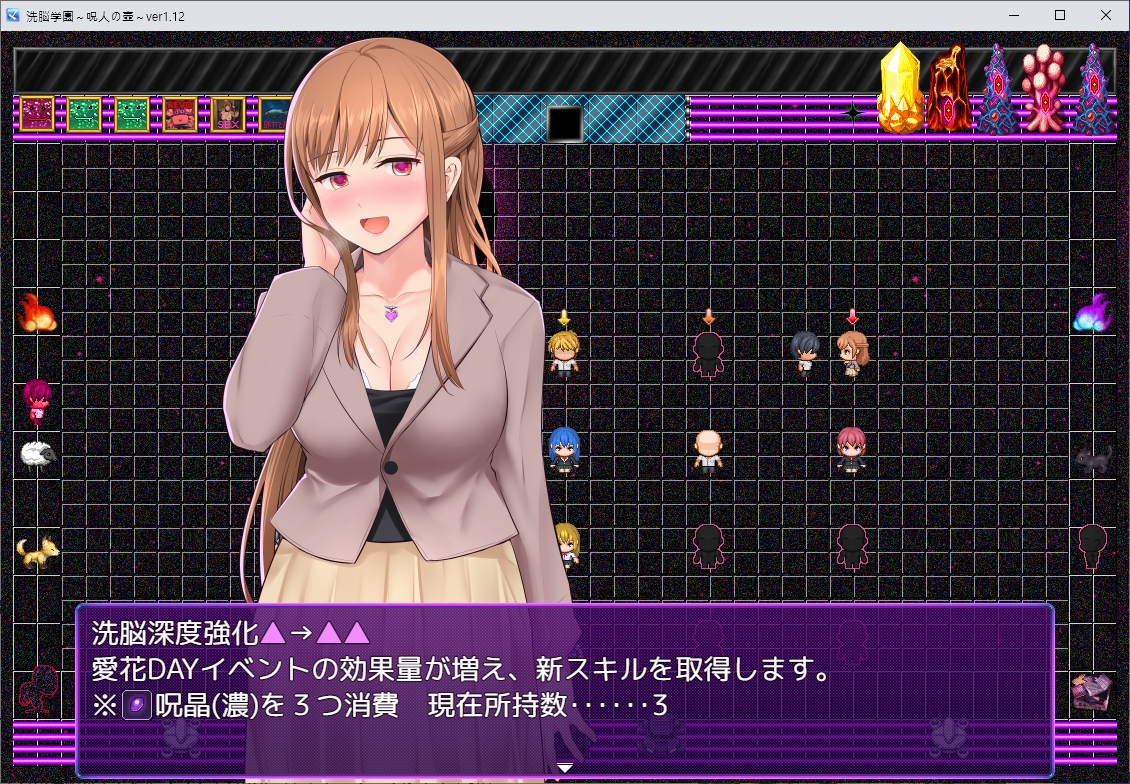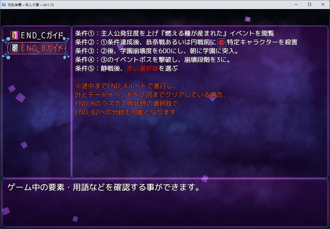 바로 무시해주고정확한 B엔딩 조건은 이렇네요스킬도 찍어둔건 유지됩니다파워라던가 이런건 다 초기화되었네요세뇌 대상들도 다 유지가 되나 봅니다석판은 보스를 다시 잡아야 깰 수 있네요세뇌로 컨텐츠도 다 날먹이 가능합니다그렇게 놀다보면 광기도가 쌓이고몇몇 요소들은 작동을 안합니다얘는 죽이면 바로 나락인가보네요도서관도 앞쪽이 아닌 바로 뒤쪽으로 갈 수 있습니다이쪽에서 친구를 죽이면 바로 몸안의 씨앗이 태어납니다이거도 지금보니 네타투성이네요꿈은 동일하게 꾸는거 같습니다할건 딱히 없으니 죽 스킵합시다시간이 되면 바로 잡으러 가면예전 기억을 보는 파트도 사라지네요내면의 자신이 자꾸 이야기를 합니다보스전도 그냥 주인공이 다른 힘을 깨우쳐서 그걸로 싸우게 됩니다아직 이용가치가 있으니 살려는 둡니다소라를 생각하려고 하면 불쾌감이 맴돈다고 하네요카나에도 무시합니다파괴파괴여기도 놀아주고저기도 놀아줍시다데이트는그딴 놀이를 할 필요는 없다고 합니다그렇게 놀다가 정보를 캐러 갑니다슬슬 레벨 약한 적은 순살하는 스킬도 찍어줬습니다한번 물어주고저주의 힘으로 바로 이야기를 들어줍시다스킬도 거의 마지막까지 찍네요이건 어느새 가까이 왔네요이거도 찍어주면 어느장소에서 륜을 만들 수 있다고 합니다대충 준비가 되면 진행을 해봅시다이전과 다르게 강제로 이야기를 들어보면죽습니다동물적인 욕망과 인간적인 과도한 욕망에 차이가 있는걸까모든게 저주다육편에 저주를 걸고바로 보스전도 치룹니다 적이 좀 다르네요그렇게 폭의 주인도 장악을 완료했습니다귀찮으니 바로 갈 수도 있는데바로 가는게 좋습니다 안누르면 돈을 다시 모아야 하더군요현시점에는 3단계로 올라가진 않네요스킬도 찍어줍시다꽤 세긴 하네요전에 대충 넘겼던 주인들도 회수를 해줍시다던전 보스도 그냥 남는 파워로 죽이고 끝냅시다결정도 넉넉히 모이기 때문에 보스급들도 강화를 해줍시다성능이 좋아지네요륜은 어디서 만드나 했더니 그냥 어둠에서 만드는 거였습니다성능은 꽤 괜찮더군요