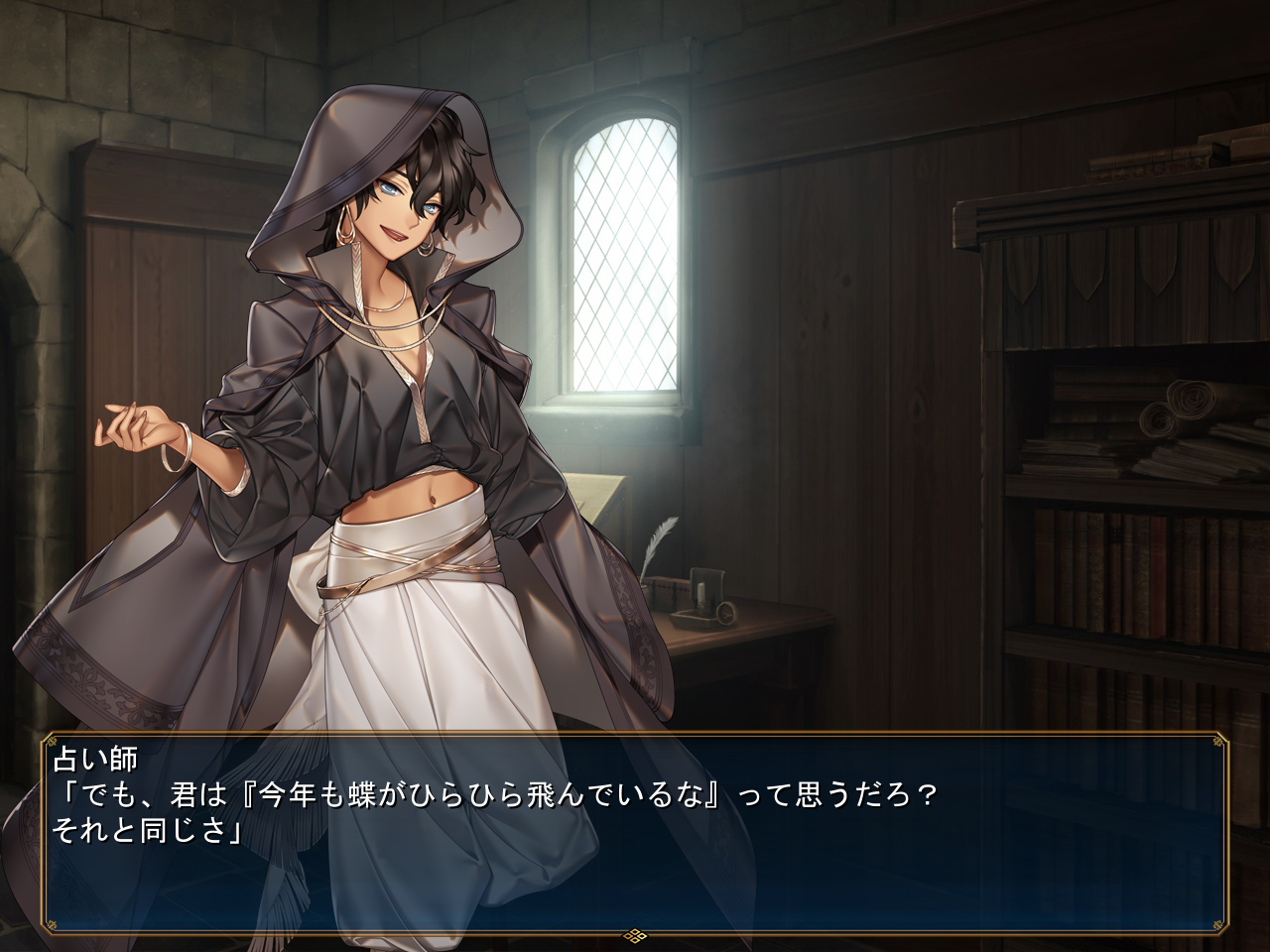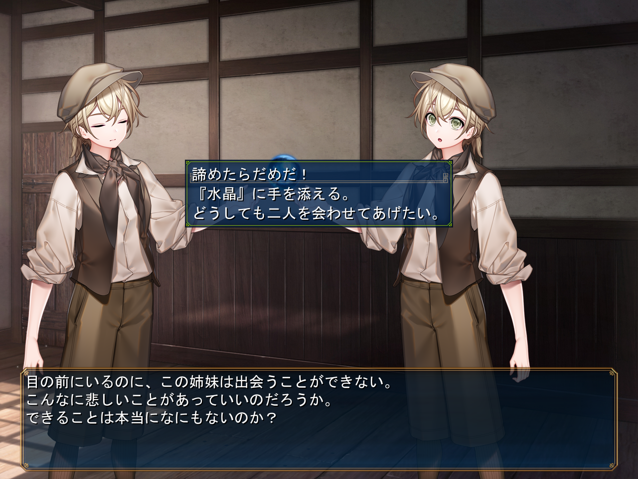 상담을 받아봅시다수정에 비젼이 나타났어요비젼은 보여주지 말라고 하는데그 미래는 확정하지 않는 이상 망상이나 거짓으로 치부할 수 있다고 합니다수정에 예지의 능력이 있는거 같은데 수정에 여러개의 능력이 있는건 부자연스럽다고 합니다확실한건 평범한 물건은 아니라는 것그리고 예지를 피할 방법이 없는건 아니라고 합니다작년에 본 나비가 이번년도에도 날아다닌다고 인식하는거 처럼운명은 사람 하나하나를 그렇게 세세히 구별하지 않는다고 합니다즉 대충 이녀석인가 같은 느낌요약하면 운명은 속일 수 있다고 합니다꽤 중요한 요소였습니다예를 들면 죽은 척 해도 속일 수 있을지도 모릅니다상담을 받고 돌아오면 감독이 돌아와 있습니다하필 엇갈렸나보네요살인귀가 있나보네요감독에게 수정의 능력에 대해 알려줍시다수정을 조사해보면 무언가 비칩니다동쪽의 거리가 비치고 있다고 하네요여기도 하나 생겨있습니다수정 이때 받은건데 이상하게 기억하고 있네요피아나와도 이야기를 해봅시다비전을 계속 찍다보면 찍혀있는 자신이 뭔가 다르다고 느낍니다쥬모쿠교의 사람과 비슷하게 보인다고 하네요그러는 중 그림자에서 자신이 튀어나옵니다 말싸움에서 이겨준 뒤목표는 다르지만 정열은 다르지 않다고 인정해줍니다라이벌이라고 인정해주네요이렇게 한건 또 해결한거 같네요여기도 한번 가봤습니다허락을 받았기 때문에 지나갈 수 있습니다마리아가 있습니다초입에 있기 때문에 그냥 말걸면 바로 배우로 섭외할 수 있습니다안쪽으로 가도 별거 없네요열쇠는 있습니다안쪽에 가봐도 별거 없습니다아래쪽은 숲인데 여기도 별거 없네요근데 이상하게 들어가는건괜찮은데 나가는게 막힙니다 뭐지열쇠도 있긴 합니다거점으로 귀환해서 마리아와 이야기를 해봅시다한명 더 보내고마을로 가보면 누군가 있는데전작의 고고학자군요수정에 대해 물어봅시다협력도 구합니다뭔가의 목적을 가지고 만들어진 물건같다고 하네요뭔가 이거말고 다른 사용법이 있을거라 합니다비젼이 나오는 조건도 궁금해하네요위험을 회피하기 위한 예지라던가생각해보면 소유자가 비치는 일은 없었네요특이한 물건이긴 합니다도움을 원하는 누군가가 비치는 것일려나요망상의 구현화쪽은 우연의 부산물일지도 모른다고 생각합니다지나는 여기 있습니다전작의 이후인게 확실하네요저주받은 땅이라고 불리는건 적어도 누군가가 거기에 갔다가 돌아온 사람이 있다고 합니다다른데 가려니 뭔가 낯익은 캐릭터가 보이는데피나아군요 가운데를 고릅시다뭔가 상황이 안좋은거 같은데전 두번째를 골라봤습니다뭔가 사신의 이름을 가진 동명의 사람과 헷갈려하네요 여튼 오너는 도망칩니다다행히 문제는 해결된거 같네요진짜 뜬금없어서 놓칠뻔 했습니다생각해보니 극단은 여기였군요생각해보니 아래쪽도 한번도 안가봤습니다 그냥 슬럼가 인거 같네요여기도 사람이 어느샌가 서있는데그때 구두닦이가 말했던 그 장소네요돈을 받는데다이스를 굴려 성공하면오히려 돈을 받습니다꼽주지 말라고비젼을 찍을 수 있습니다불가능할때까지 찍어줍시다그리고 어느새 이녀석도 생겨있는데자기 동생이 위험하다고 합니다바로 쫓아가보면 위험에 빠져있습니다바로 구해줍시다형이 알려줬다고 하면 형은 2년전에 이미 죽었다고 합니다 아니 유령이 얘였어?사실 둘다 여자인데다가 가명은 그때 지은거라 마이티라는 가명을 알 수가 없다고 합니다가명을 쓴 이유는 부모가 병으로 떠나면서 이 세상에 여자 둘이서 살기엔 위험하니 남자인 척을 하고 있으라고 했다네요어쨌든 여동생을 구했습니다수정이라면 비출 수 있을지도 모릅니다하지만 생각대로 잘 되지 않는데그럼에도 포기하지 않고 도전하자 드디어 서로 만날 수 있었습니다 마지막 인사를 나누고감동적이네요레나도 거점에 와있습니다지나도 와있네요나중에 뭘 할건지 물어봅시다당장 할거도 없으니 촬영을 도와주기로 합니다
