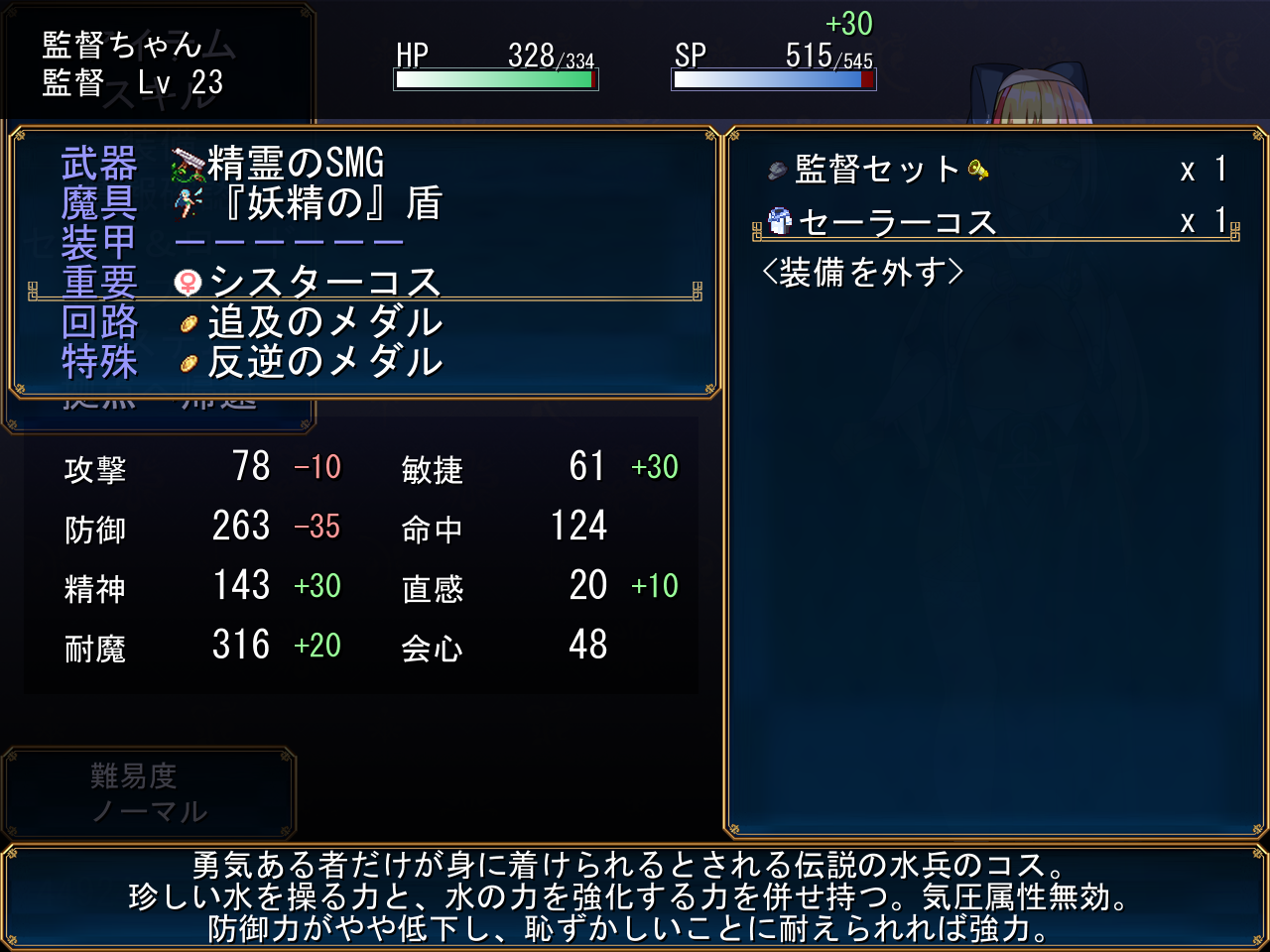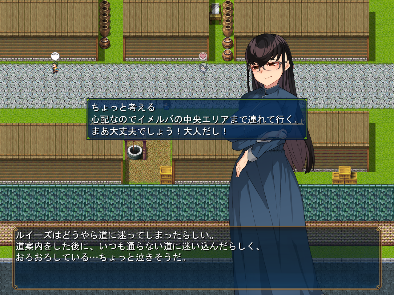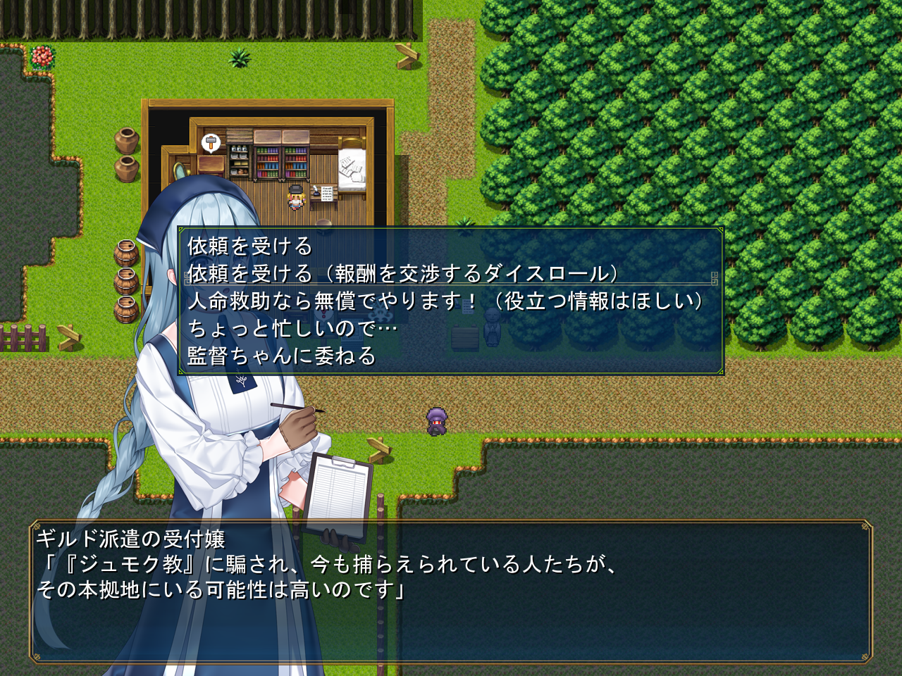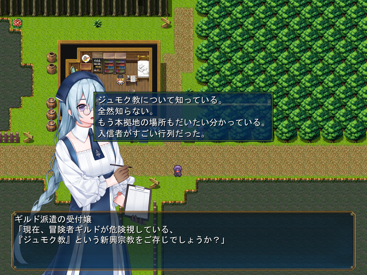 거점으로 돌아오니 누군가 있는데전작의 그 길드원이네요신흥종교에 대해 묻습니다진짜 사이비잖아모험가길드의 관계자가 쥬모크교와 연관되어 있어서 내부정보가 다 빠져나갔다고 합니다그래서 능력있는 신입모험가에게 이 사건을 부탁합니다일단은 인명구조에 더 집중해 달라고 하네요보상 더 받을까 싶었는데 크게 의미도 없는거 같고사람을 구하는거 정돈 공짜로 해주겠다고 했습니다뭐 의뢰니 공짜로는 안된다고 합니다본거지가 어딘지 모르겠다면 점쟁이에게 가보라고 하네요애초에 어딘지 그냥 알려줍니다일단 탑으로 다시 돌아와서 템을 회수했습니다거기의 열쇠도 얻어주고안쪽에 미궁도 있군요안쪽으로 와서 상자도 열어주고비밀길은 여긴가 봅니다열심히 헤매다보면안쪽에서 템을 얻을 수 있습니다왼쪽으로 더 가면동굴이 있습니다안쪽에서 보스전을 치룰 수 있습니다보스와 이기면 안쪽에 세라복이 있습니다왠진 모르지만 아저씨가 몸자이크를 해주네요이건 생각보다 잘나오네요마법소녀가 있습니다이쪽을 수상하게 여겨서 다이스도 굴리는데사기나 칩시다아군입니다감독에게 부탁합시다무사히 합류할 수 있게 되었습니다이 옷이 있으면 드디어 물을 건너갈 수 있습니다파문으로 건너가는거였네요막 중요한건 안나옵니다교단으로 가는 길에 생각해보니 여기 의사가 있었죠말을 걸어봅시다마을로 돌아와서 그냥 이거도 샀습니다바보에겐 보이지 않는 옷이라고 하는데 당연히 보이지 않는 옷입니다돈도 있겠다 권리서를 사려니 사라졌네요 시간제한이 있나봅니다온 김에 점술사에게도 물어보니여기로 텔레포트 시켜줍니다다시 돌아와서 아까의 의사를 소개시켜줍시다꽤 유능한데?보상도 안받습니다옆에 구두닦이도 말을 걸어줍시다종이를 보면수상한 의뢰인거 같다고 합니다이상한 일이니 안하는게 좋을거라고 해줍시다거점으로 돌아와보면 아까 구출한 소녀가 있고비젼도 열심히 찍어줍시다사실 서큐버스라고 합니다식물의 정기도 빨아먹을 수 있군요비젼도 열심히 찍어줍시다원래 서큐버스의 힘을 잘 못썻는데 비젼 덕분에 연습이 가능했다고 하네요욀케 허접해보이는지 모르겠네요아직 부족해서 날개라던가 이것저것 안나온다고 합니다끝까지 비젼을 찍어보면 이전과 다르게 자신감이 넘치는 모습으로 떠나갑니다이쪽은 딱히 별거 없네요생각해보면 건너편 마을도 가본적이 없습니다라모루가 아마 전작의 그 마을이였나 기억이 잘 안나네요생각보다 별거 없었습니다여관의 바니걸에게 말을 걸면 메이드복을 살 수 있습니다2만골드네요템들을 파는데 다 쓸모는 없습니다열쇠도 주을 수 있고거울만 있으면 이녀석이 비치네요아래는 좀 수상한 가게가 있습니다안쪽으로는 못갑니다이야기를 들어보니 정체불명의 마물이 나타나서 그렇다고 하네요생명의 보석 이야기는 계속 나옵니다전작광고였습니다여기 위는 뭘까요뭔 집이 있고누구세요?그냥 사라집니다안쪽에는 선인이 있고열쇠가 하나 있습니다여기는 말을 걸어 감옥으로 갈 수 있습니다크게 중요한건 없어보입니다이녀석은 왜 갇혀있는걸까요열쇠 하나가 있긴 하네요마법소녀 이벤트 후 환상이 나타나는데 이건 말을 안거는게 좋아보입니다뒷골목에 또 이녀석이 있네요걱정되니 중앙로까지 데려다줍시다 참 손이 많이 가네요상자도 어느새 거의 다 열었네요