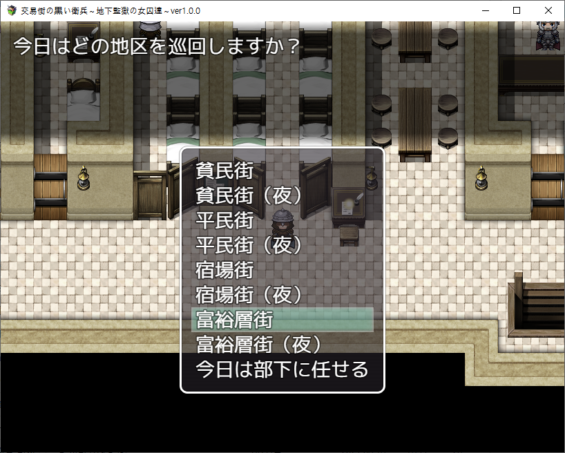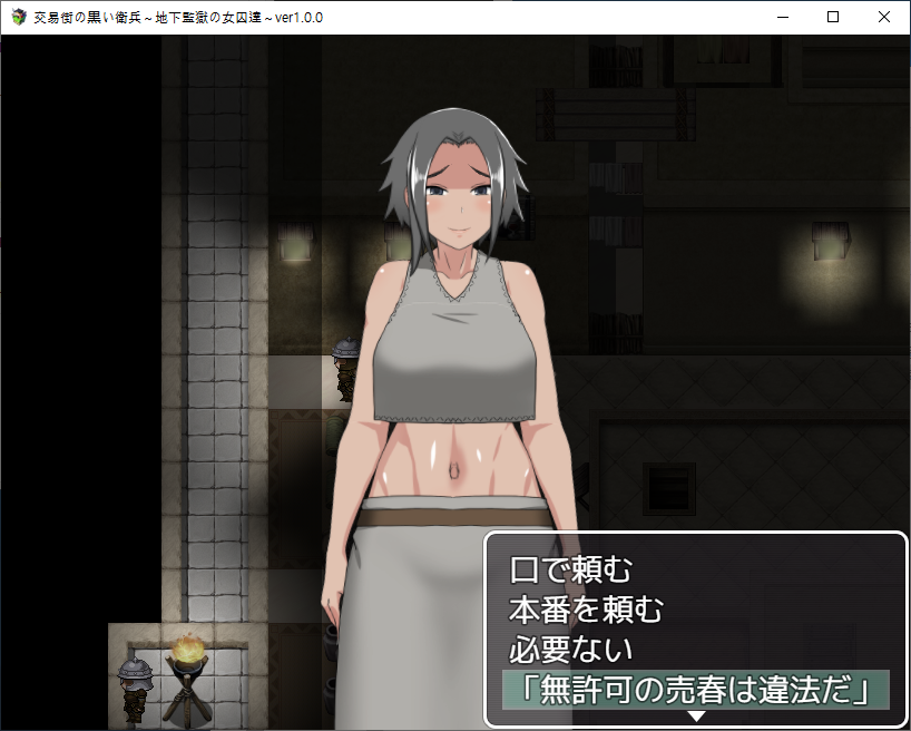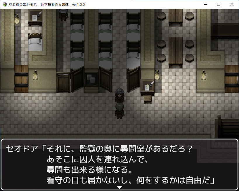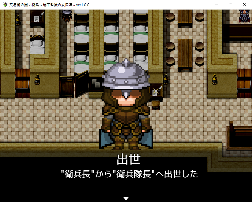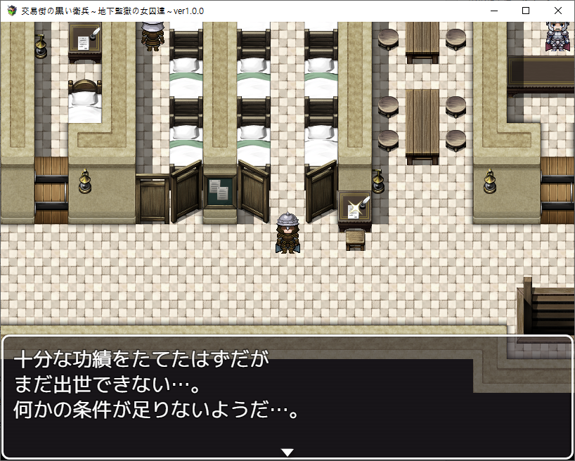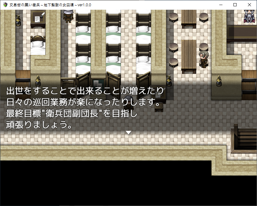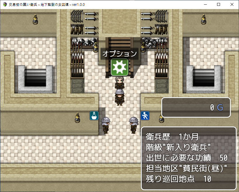 그냥 노말로 게임합시다주인공은 신참근위병신병이 빠져가지고 일안하냐?세이브는 보고서로 할 수 있습니다이름은 퍼거슼ㅋㅋㅋㅋ 어떻게 사람이름이 퍼거슼ㅋㅋㅋ출세가 다른게임의 경험치라고 보면 됩니다이런저런 설정을 만지고일하러 갑시다일은 제대로 하는 부패한 공무원아래로 가면 됩니다반짝이는 곳으로 순찰을 돌면 됩니다개시이동뭐래저렇게 생긴 사람은 조사할 수 있습니다범죄의 증가를 찾으면 붙잡을 수 있습니다 증거찾기는 랜덤입니다아무거나 선택해도 될듯응 걸렸어경범죄의 경우 판결은 범인을 붙잡은 위병에게 일임감옥에 처넣어서 출세를 빨리 하는게 게임진행에 좋습니다특히 여자의 경우 즐길 수 있습니다각 구역마다 특색이 있습니다현행범도 있습니다도망치는걸 붙잡으면 되고 보통 이곳저곳 왔다갔다 거려서 판단하기 쉽습니다현행범이라서 증거확인은 안합니다잘가고가끔은이렇게 무기를 들고 덤빕니다전투진힙스태미너도 있어서 좀 귀찮습니다딴건몰라도 하드면진짜 죙일 팼는데 안죽습니다이쪽은 창이라 범위가 2취급인지 여기서 때려도 맞습니다너무 안죽어서 그냥 노말로 바꿨습니다클리어하면비번과 동시에 월급을 받습니다환락가에서 놀자고 하는데입장료를 지불하고놀 수 있지만그냥 돈을 차곡차곡 모아서 출세하는게 좋습니다튜토리얼 종료위병단부단장을 목표로 합시다일을 계속 합시다앞으로는 뭐 반복작업입니다경험치가 차면 출세야간근무도 뛰고급료도 오릅니다이제 감옥에서 신체검사도 할 수 있게 됩니다밤이되면내려가서신체검사를 즐깁시다취향껏감금은 10인까지고 다 차면 갈아치워야 합니다고문실도 있습니다죽 일을 합시다어두워서 구역이 잘 안보입니다뭐 이벤트가 있는거 같은데 시간없어서 넘어갔더니 다신 못보더군요죽죽 출세하면 짬이 차서 달리면서 순찰한다고 뭐라 할 녀석도 없습니다고문실도 이용가능약물을 쓸 수도 있습니다무허가도 잡아주면서 돈을 벌어봅시다소문같은걸 들을 수 있는데지금보면 뭔가 이벤트의 힌트였을지도부하들이 열심히 일을 해주고 있습니다 공적은 제가 먹죠고문실은 돈을 주거나 나중에 강해지면 공짜로 쓸 수 있습니다이제 단장이 되었습니다업무도 이젠 맘대로 합니다부하에게 짬처리도 가능돈은 또 꼬박꼬박들어옵니다독방도 사용가능해졌습니다이런저런 즐길거리 추가이제 부단장이 되어봅시다경험치를 다 모아도 출세를 못하는데뒷돈을 찔러넣어줍시다내일부터 부단장입니다감옥열쇠의 예비를 관리할 수 있는 권한도 얻습니다지명수배도 작성할 수 있고 부하들이 취향에 맞는 여자를 잡아옵니다클리어이후는 직접 만들면서 노는 게임입니다